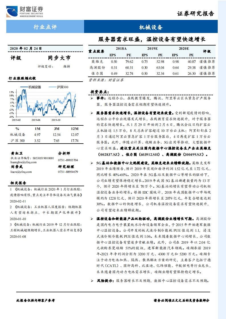 机械设备:服务器需求旺盛,温控设备有望快速增长