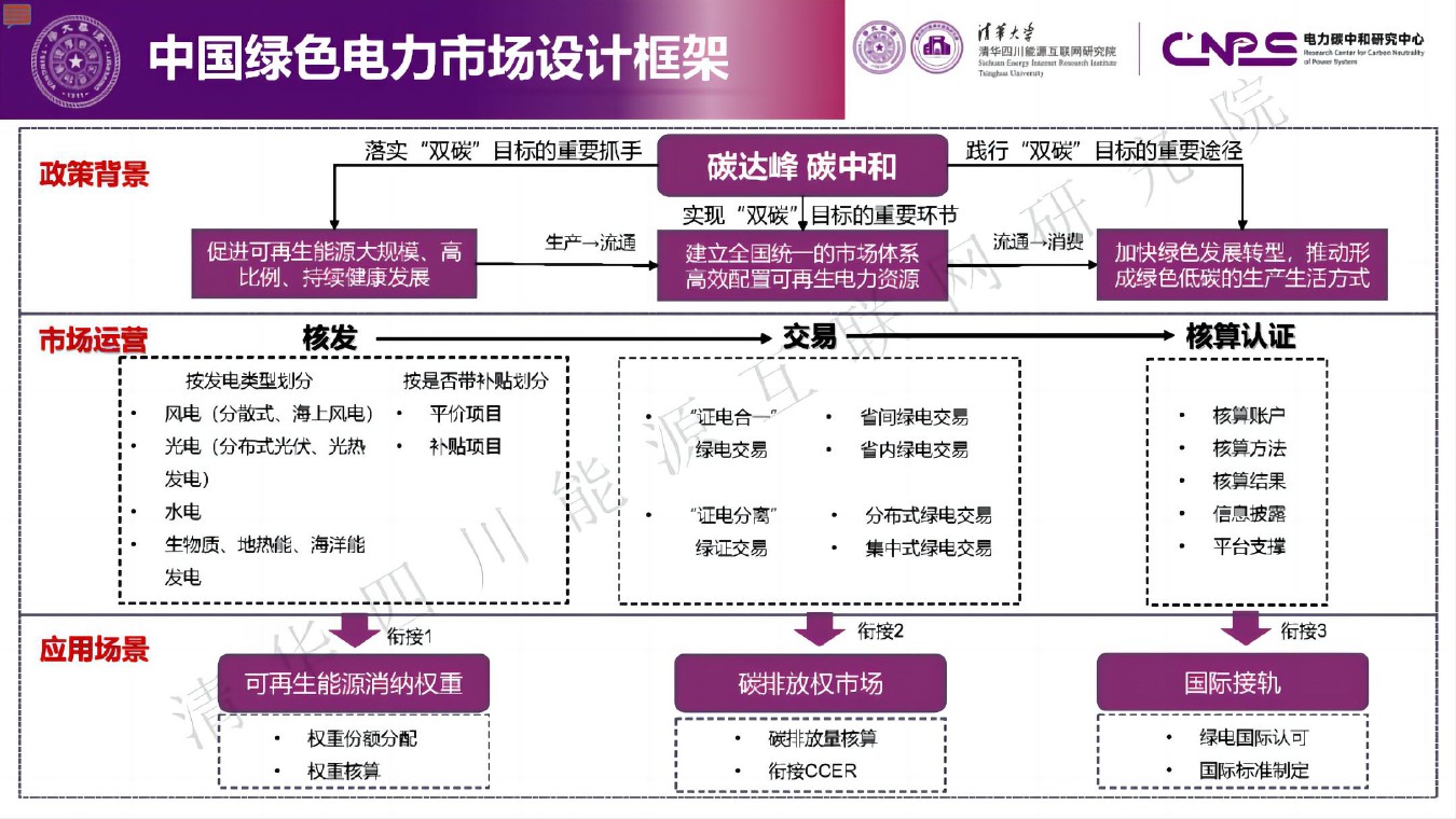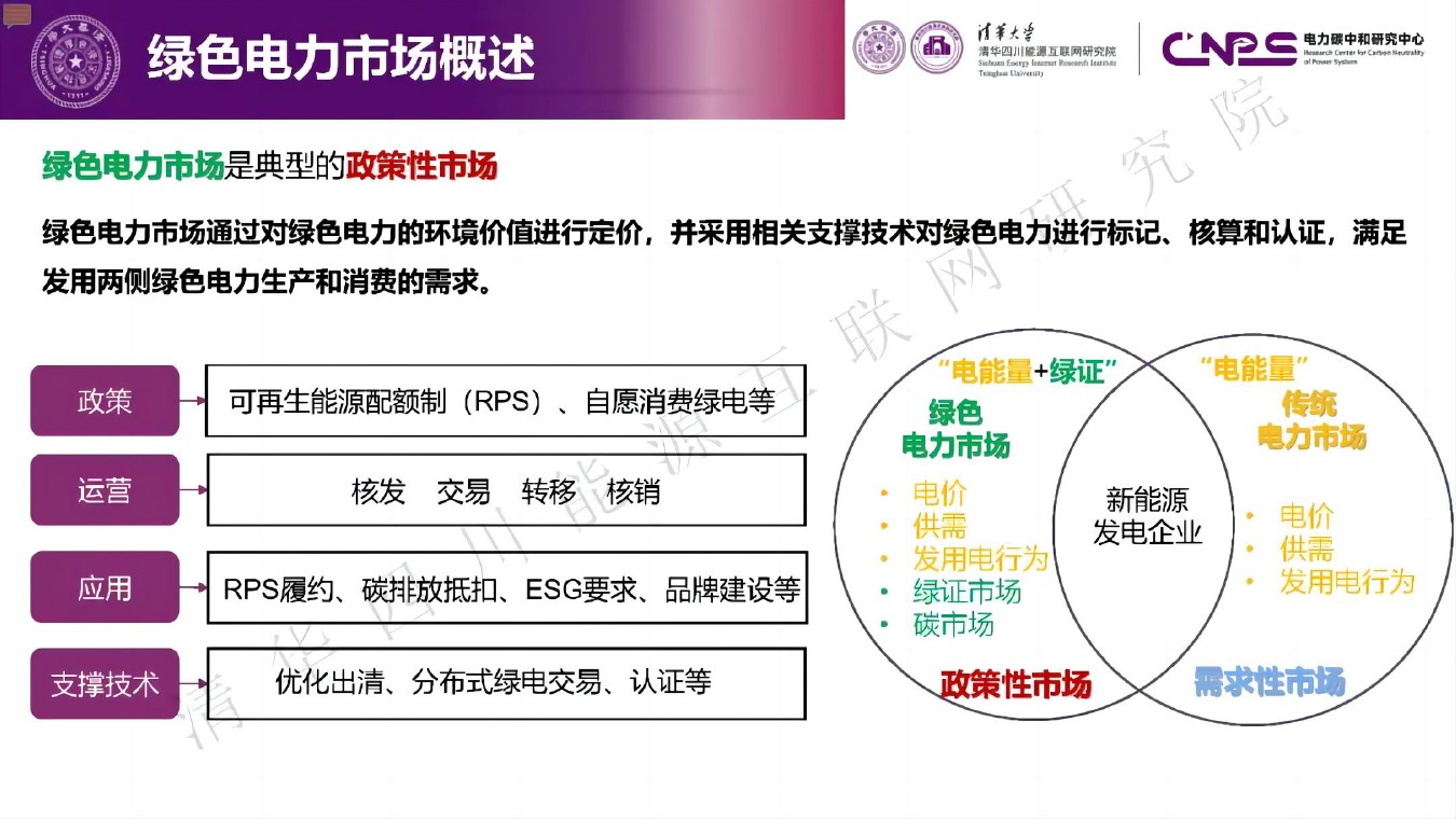 绿色电力市场是典型的政策性市场绿色电力市场通过对绿色电力的环境价值进行定价,并采用相关支撑技术对绿色电力进行标记、核算和认证,满足发用两侧绿色电力生产和消费的需求。