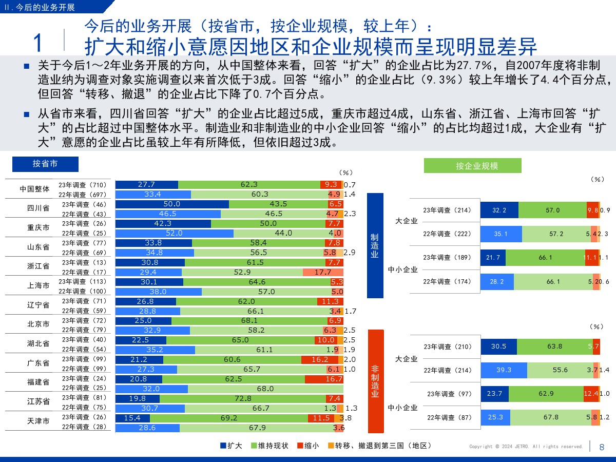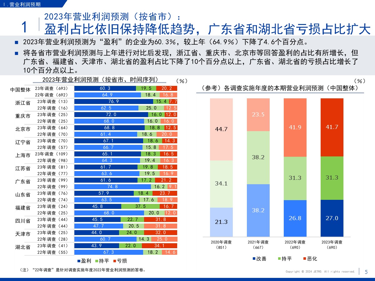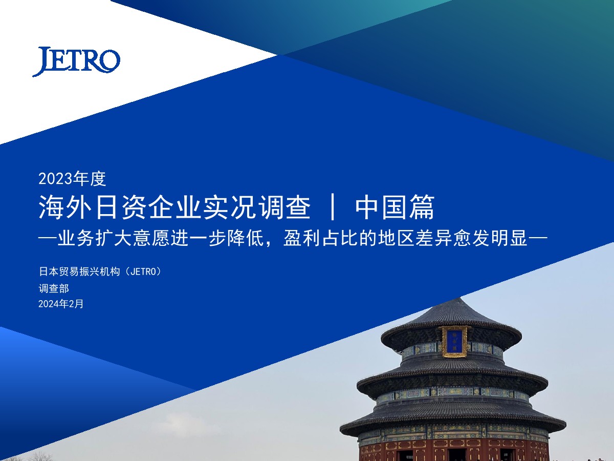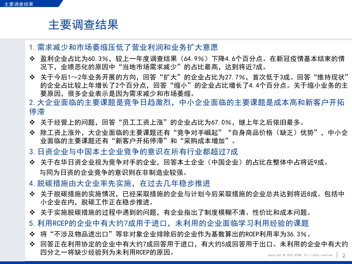 | 1.需求减少和市场萎缩压低了营业利润和业务扩大意愿盈利企业占比为60.3%,较上一年度调查结果(64.9%)下降4.6个百分点。 在新冠疫情基本结束的情况下,业绩恶化的原因中“当地市场需求减少”的占比最高,达到将近7成。 关于今后1~2年业务开展的方向,回答“扩大”的企业占比为27.7%,首次低于3成。 回答“维持现状”的企业占比较上年增长了2个百分点,回答“缩小”的企业占比增长了4.4个百分点。 关于缩小业务的主要原因,很多企业表示是因为需求减少和市场萎缩。 2.大企业面临的主要课题是竞争日趋激烈,中小企业面临的主要课题是成本高和新客户开拓停滞关于经营上的问题,回答“员工工资上涨”的企业占比为67.0%,继上年之后依旧最多。 除工资上涨外,大企业面临的主要课题还有“竞争对手崛起”“自身商品价格(缺乏)优势”,中小企业面临的主要课题还有“新客户开拓停滞”和“采购成本增加”。 3.日资企业与中国本土企业竞争的意识在所有行业都超过7成关于在华日资企业视为竞争对手的企业,回答本土企业(中国企业)的占比在整体中占将近9成。 与同为日资的企业竞争的意识则在非制造业较强。 4.脱碳措施由大企业率先实施,在过去几年稳步推进关于脱碳措施的实施情况,已经采取措施的企业与计划今后采取措施的企业总共达到将近8成。 包括中小企业在内,脱碳工作正在稳步推进。 关于实施脱碳措施的过程中遇到的问题,有企业指出了制度模糊不清、性价比和成本问题。 5.利用RCEP的企业中有大约7成用于进口,未利用的企业面临学习利用经验的课题将“不涉及物品进出口”等非对象企业排除后的企业作为基数算出的RCEP利用率为36.3%。 回答正在利用协定的企业中有大约7成回答用于进口,有大约5成回答用于出口。 未利用的企业中有大约四分之一将缺少经验列为未利用RCEP的原因。