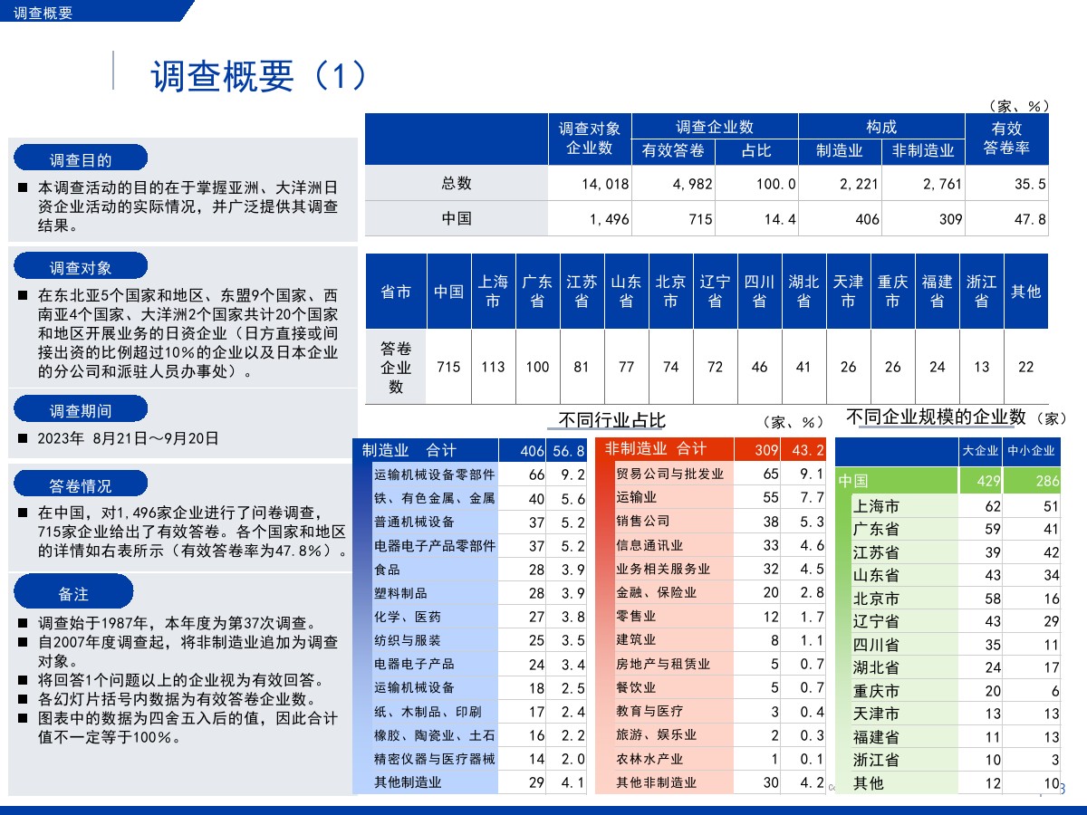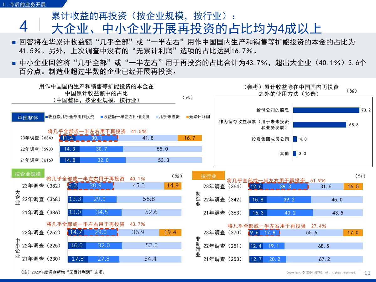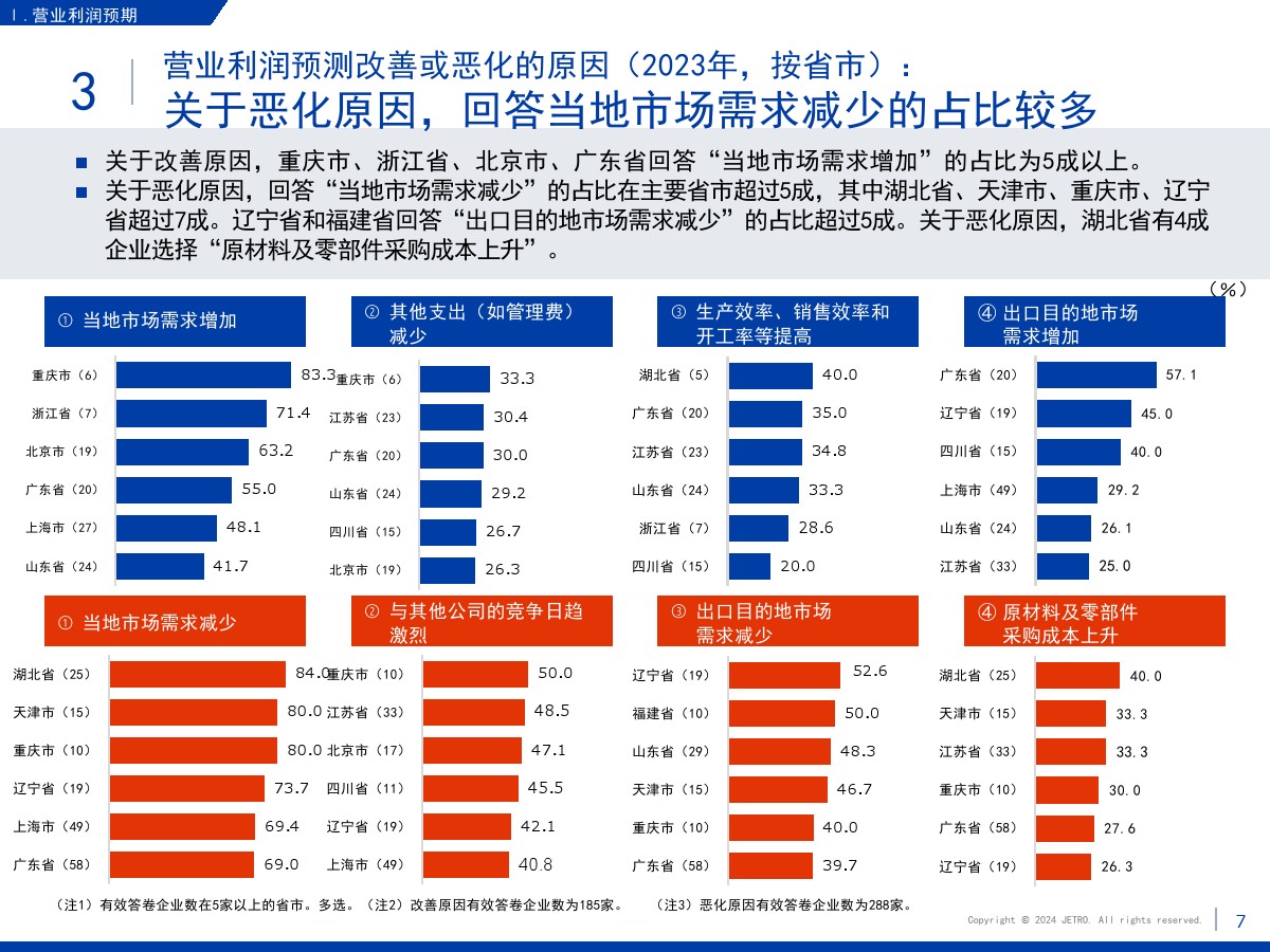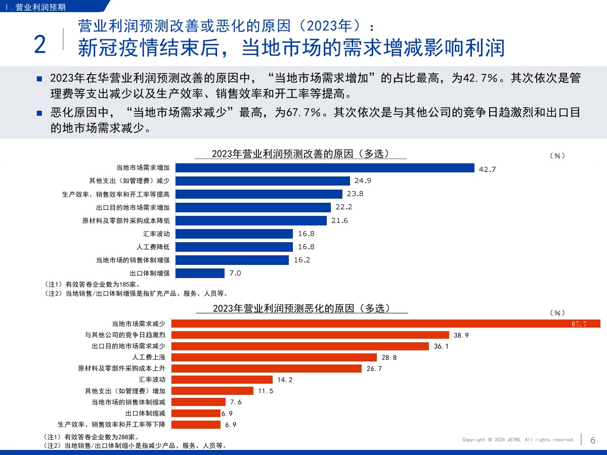| 1.需求减少和市场萎缩压低了营业利润和业务扩大意愿盈利企业占比为60.3%,较上一年度调查结果(64.9%)下降4.6个百分点。 在新冠疫情基本结束的情况下,业绩恶化的原因中“当地市场需求减少”的占比最高,达到将近7成。 关于今后1~2年业务开展的方向,回答“扩大”的企业占比为27.7%,首次低于3成。 回答“维持现状”的企业占比较上年增长了2个百分点,回答“缩小”的企业占比增长了4.4个百分点。 关于缩小业务的主要原因,很多企业表示是因为需求减少和市场萎缩。 2.大企业面临的主要课题是竞争日趋激烈,中小企业面临的主要课题是成本高和新客户开拓停滞关于经营上的问题,回答“员工工资上涨”的企业占比为67.0%,继上年之后依旧最多。 除工资上涨外,大企业面临的主要课题还有“竞争对手崛起”“自身商品价格(缺乏)优势”,中小企业面临的主要课题还有“新客户开拓停滞”和“采购成本增加”。 3.日资企业与中国本土企业竞争的意识在所有行业都超过7成关于在华日资企业视为竞争对手的企业,回答本土企业(中国企业)的占比在整体中占将近9成。 与同为日资的企业竞争的意识则在非制造业较强。 4.脱碳措施由大企业率先实施,在过去几年稳步推进关于脱碳措施的实施情况,已经采取措施的企业与计划今后采取措施的企业总共达到将近8成。 包括中小企业在内,脱碳工作正在稳步推进。 关于实施脱碳措施的过程中遇到的问题,有企业指出了制度模糊不清、性价比和成本问题。 5.利用RCEP的企业中有大约7成用于进口,未利用的企业面临学习利用经验的课题将“不涉及物品进出口”等非对象企业排除后的企业作为基数算出的RCEP利用率为36.3%。 回答正在利用协定的企业中有大约7成回答用于进口,有大约5成回答用于出口。 未利用的企业中有大约四分之一将缺少经验列为未利用RCEP的原因。
