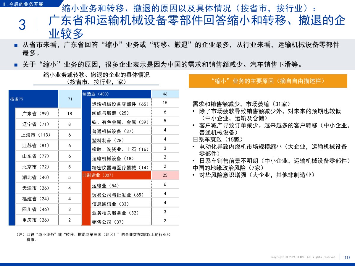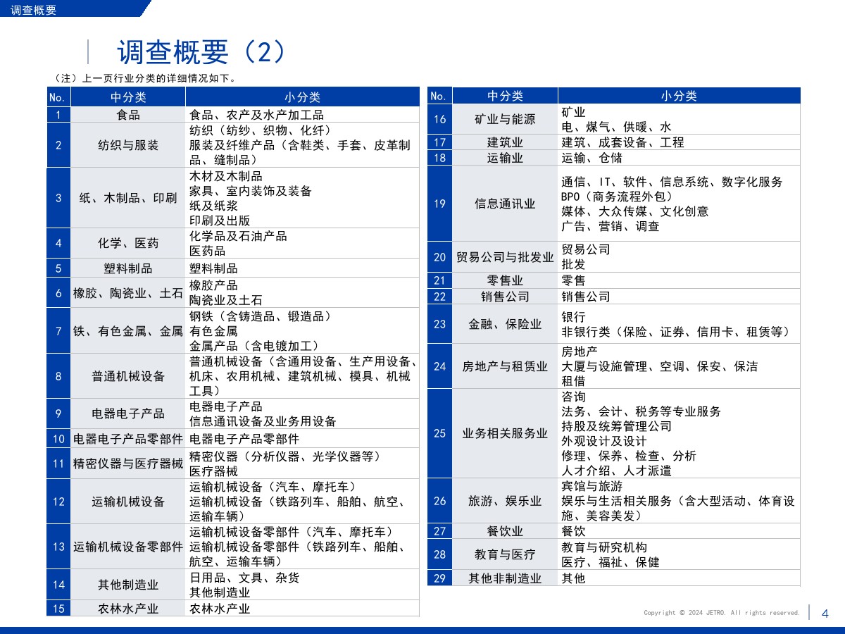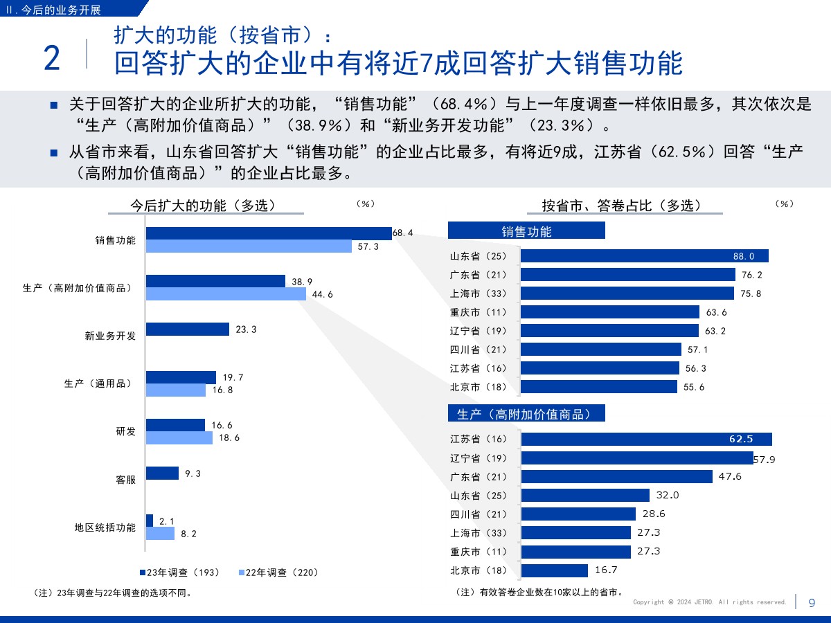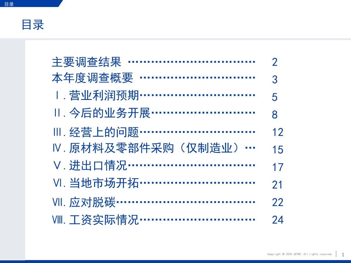 | 1.需求减少和市场萎缩压低了营业利润和业务扩大意愿盈利企业占比为60.3%,较上一年度调查结果(64.9%)下降4.6个百分点。 在新冠疫情基本结束的情况下,业绩恶化的原因中“当地市场需求减少”的占比最高,达到将近7成。 关于今后1~2年业务开展的方向,回答“扩大”的企业占比为27.7%,首次低于3成。 回答“维持现状”的企业占比较上年增长了2个百分点,回答“缩小”的企业占比增长了4.4个百分点。 关于缩小业务的主要原因,很多企业表示是因为需求减少和市场萎缩。 2.大企业面临的主要课题是竞争日趋激烈,中小企业面临的主要课题是成本高和新客户开拓停滞关于经营上的问题,回答“员工工资上涨”的企业占比为67.0%,继上年之后依旧最多。 除工资上涨外,大企业面临的主要课题还有“竞争对手崛起”“自身商品价格(缺乏)优势”,中小企业面临的主要课题还有“新客户开拓停滞”和“采购成本增加”。 3.日资企业与中国本土企业竞争的意识在所有行业都超过7成关于在华日资企业视为竞争对手的企业,回答本土企业(中国企业)的占比在整体中占将近9成。 与同为日资的企业竞争的意识则在非制造业较强。 4.脱碳措施由大企业率先实施,在过去几年稳步推进关于脱碳措施的实施情况,已经采取措施的企业与计划今后采取措施的企业总共达到将近8成。 包括中小企业在内,脱碳工作正在稳步推进。 关于实施脱碳措施的过程中遇到的问题,有企业指出了制度模糊不清、性价比和成本问题。 5.利用RCEP的企业中有大约7成用于进口,未利用的企业面临学习利用经验的课题将“不涉及物品进出口”等非对象企业排除后的企业作为基数算出的RCEP利用率为36.3%。 回答正在利用协定的企业中有大约7成回答用于进口,有大约5成回答用于出口。 未利用的企业中有大约四分之一将缺少经验列为未利用RCEP的原因。