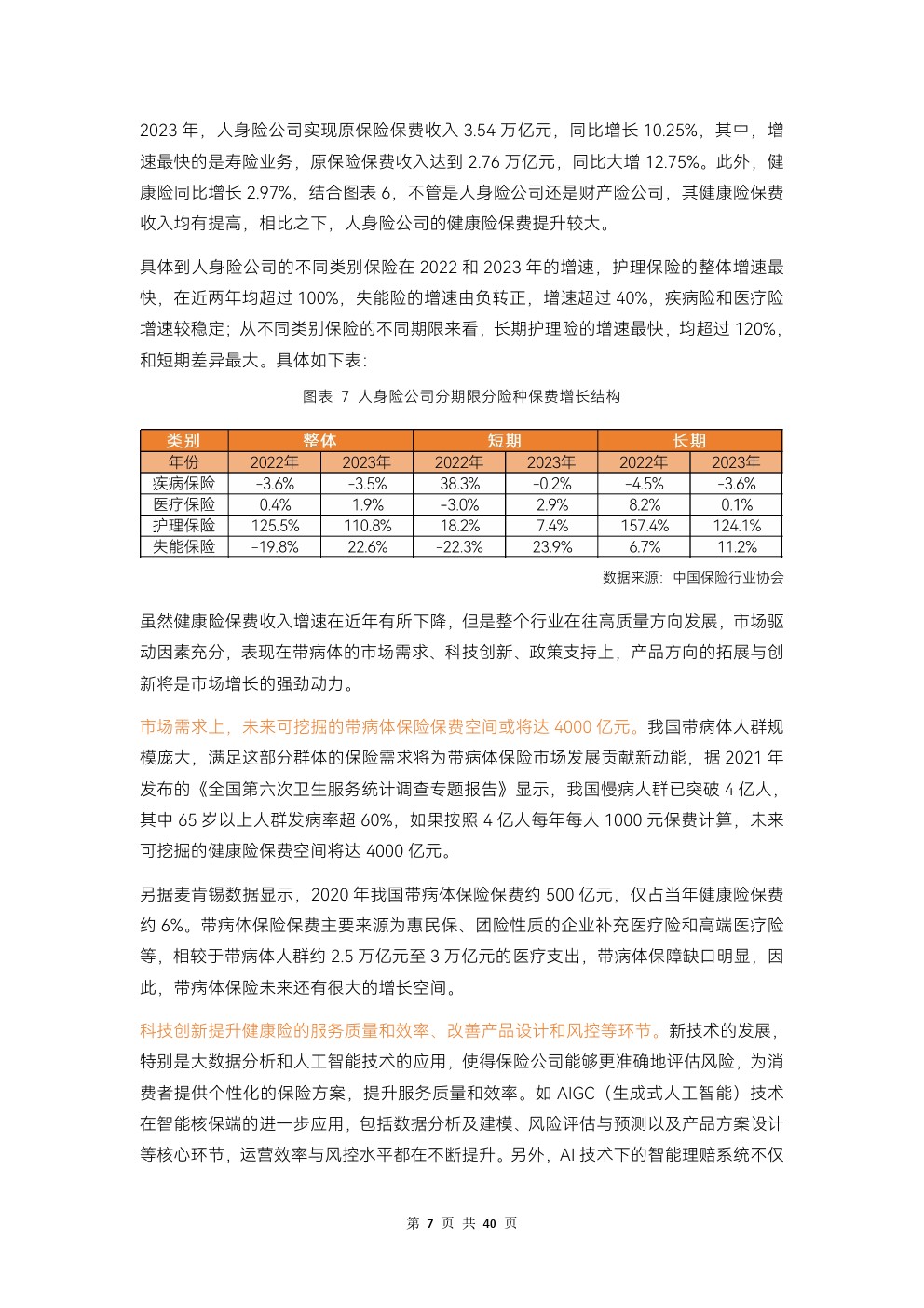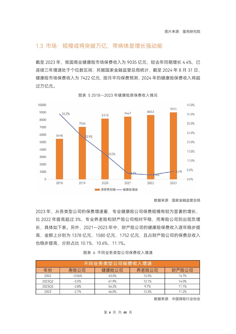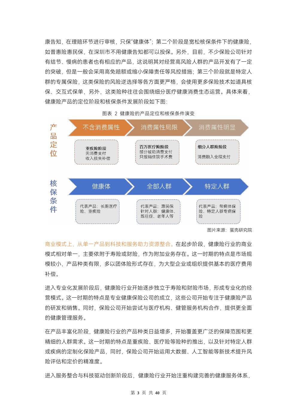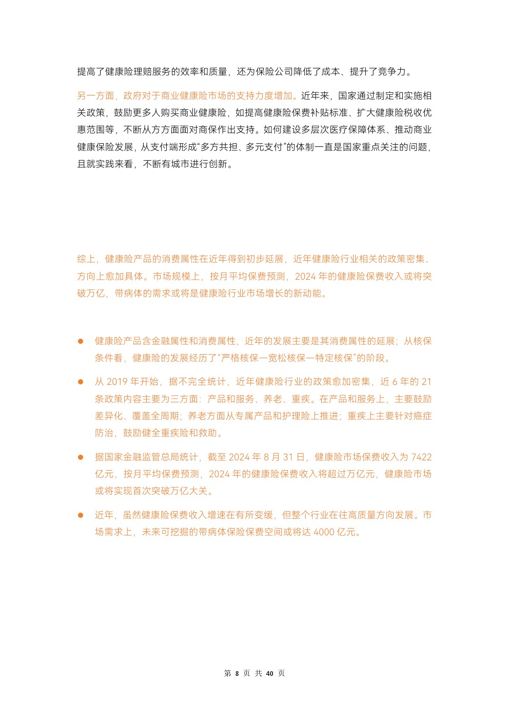 | 近年,健康险的渗透率有提升但增速变缓,而带病体的巨大需求却未被满足,据测算,这部分人群未来可挖掘的健康险保费空间将达4000亿元;另一方面,健康险产品同质化严重、中端医疗险种类不够、客户的理赔和健康管理服务等体验待改善。 供需之间的矛盾是健康险规模再增长的主要瓶颈,围绕带病体产品的开发和重体验的服务打造是供给侧改革的核心,创新亦有萌发,如综合保险产品、一站式服务、专病中心、服务智能化、服务责任化的尝试等。 而对保险公司而言,在产品、服务、科技、支付环节上分别存在哪些痛点,健康管理公司又在其中扮演怎样的角色?本报告通过调研12家企业、近20位专家,对健康险行业的挑战和创新解决方案展开分析,并得出以下结论:l 健康险产品含金融属性和消费属性,近年的发展主要是其消费属性的延展;从核保条件看,健康险的发展经历了“严格核保-宽松核保-特定核保”的阶段。 l 据国家金融监管总局统计,截至2024年8月31日,健康险市场保费收入为7422亿元,按月平均保费预测,2024年的健康险保费收入将超过万亿元,健康险市场或将实现首次突破万亿大关。 l 健康险供给正经历由销售驱动逐渐转向服务驱动的过程,业绩和客户价值感并重,“保险+健康管理服务+科技”已成标配,主动管理、专病管理、一站式服务、重体验成为保险公司新风尚。 l 社商融合的关键是数据共享,数据结构化是未来方向。 政府方面,除了对医保商保数据共享的支持外,对商保提供营销背书或研究支持也是必要的。 l 未来,保险产品趋向个性化,科技赋能作用愈加凸显;中端医疗险将逐步多元,并逐步惠及非标体;个性化保费牵涉到保险评估和销售流程,或暂不能实现。 l 服务责任化将经营风险的理念转变为经营消费,把赔付金额转变为赔付服务,让客户在住院期间体验更好、享受更及时,如此市场将得到极大扩容。