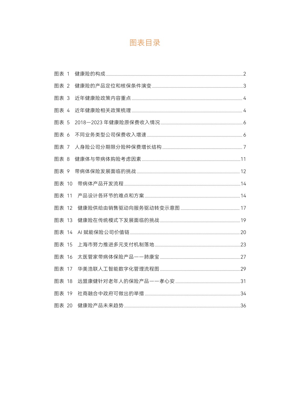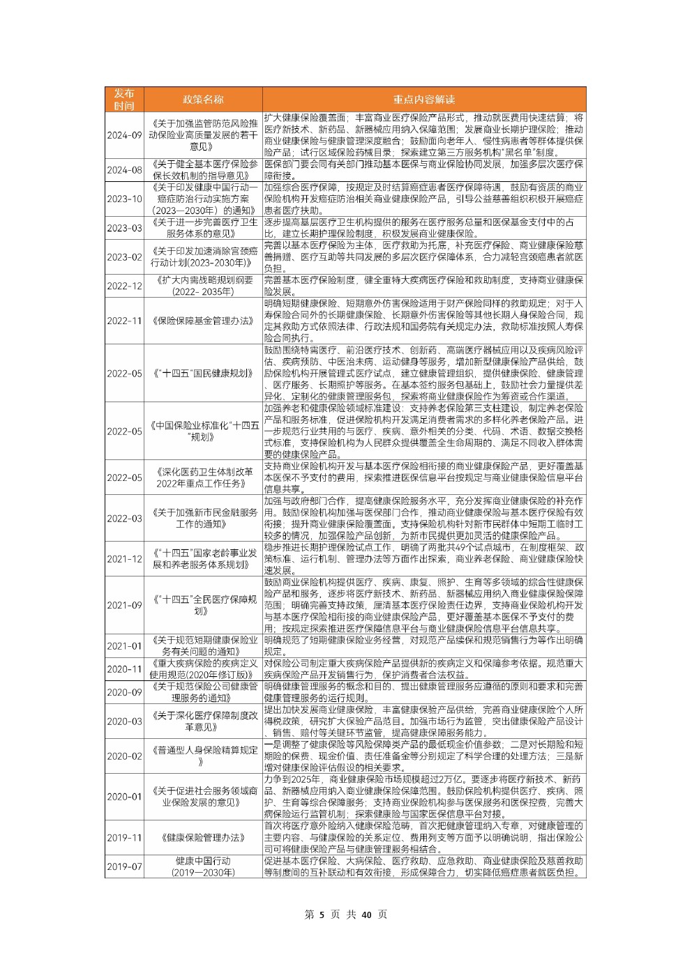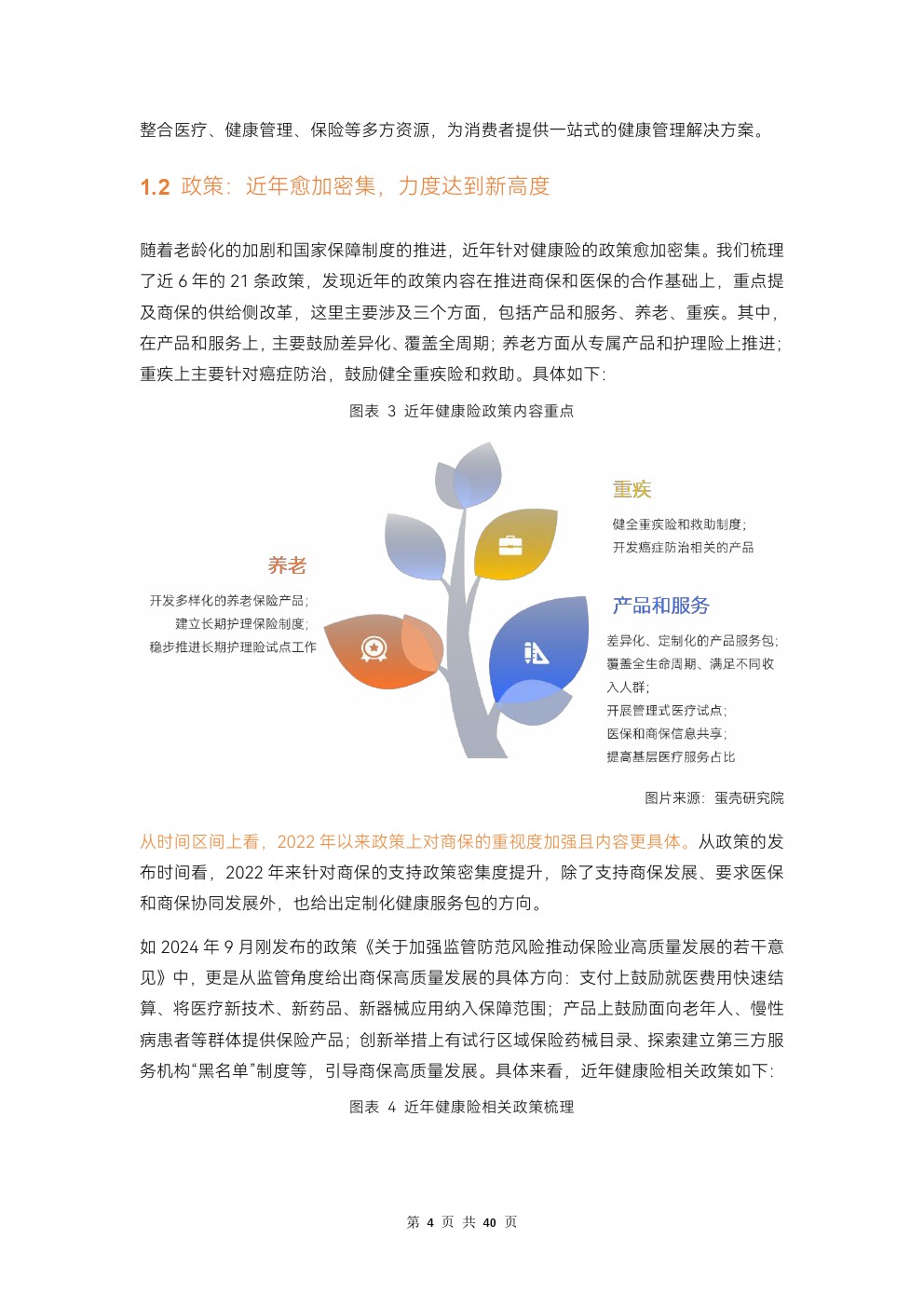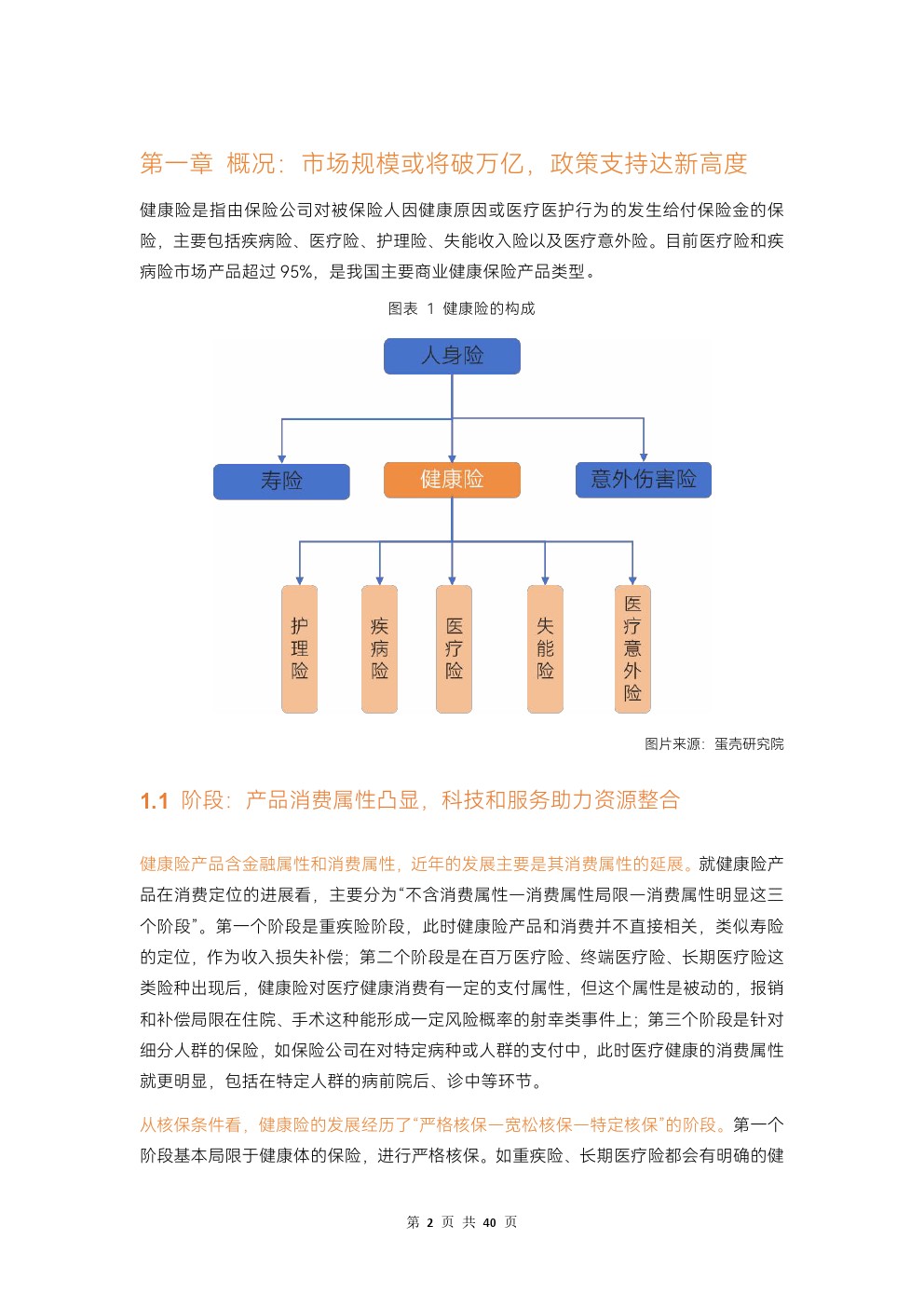 | 近年,健康险的渗透率有提升但增速变缓,而带病体的巨大需求却未被满足,据测算,这部分人群未来可挖掘的健康险保费空间将达4000亿元;另一方面,健康险产品同质化严重、中端医疗险种类不够、客户的理赔和健康管理服务等体验待改善。 供需之间的矛盾是健康险规模再增长的主要瓶颈,围绕带病体产品的开发和重体验的服务打造是供给侧改革的核心,创新亦有萌发,如综合保险产品、一站式服务、专病中心、服务智能化、服务责任化的尝试等。 而对保险公司而言,在产品、服务、科技、支付环节上分别存在哪些痛点,健康管理公司又在其中扮演怎样的角色?本报告通过调研12家企业、近20位专家,对健康险行业的挑战和创新解决方案展开分析,并得出以下结论:l 健康险产品含金融属性和消费属性,近年的发展主要是其消费属性的延展;从核保条件看,健康险的发展经历了“严格核保-宽松核保-特定核保”的阶段。 l 据国家金融监管总局统计,截至2024年8月31日,健康险市场保费收入为7422亿元,按月平均保费预测,2024年的健康险保费收入将超过万亿元,健康险市场或将实现首次突破万亿大关。 l 健康险供给正经历由销售驱动逐渐转向服务驱动的过程,业绩和客户价值感并重,“保险+健康管理服务+科技”已成标配,主动管理、专病管理、一站式服务、重体验成为保险公司新风尚。 l 社商融合的关键是数据共享,数据结构化是未来方向。 政府方面,除了对医保商保数据共享的支持外,对商保提供营销背书或研究支持也是必要的。 l 未来,保险产品趋向个性化,科技赋能作用愈加凸显;中端医疗险将逐步多元,并逐步惠及非标体;个性化保费牵涉到保险评估和销售流程,或暂不能实现。 l 服务责任化将经营风险的理念转变为经营消费,把赔付金额转变为赔付服务,让客户在住院期间体验更好、享受更及时,如此市场将得到极大扩容。