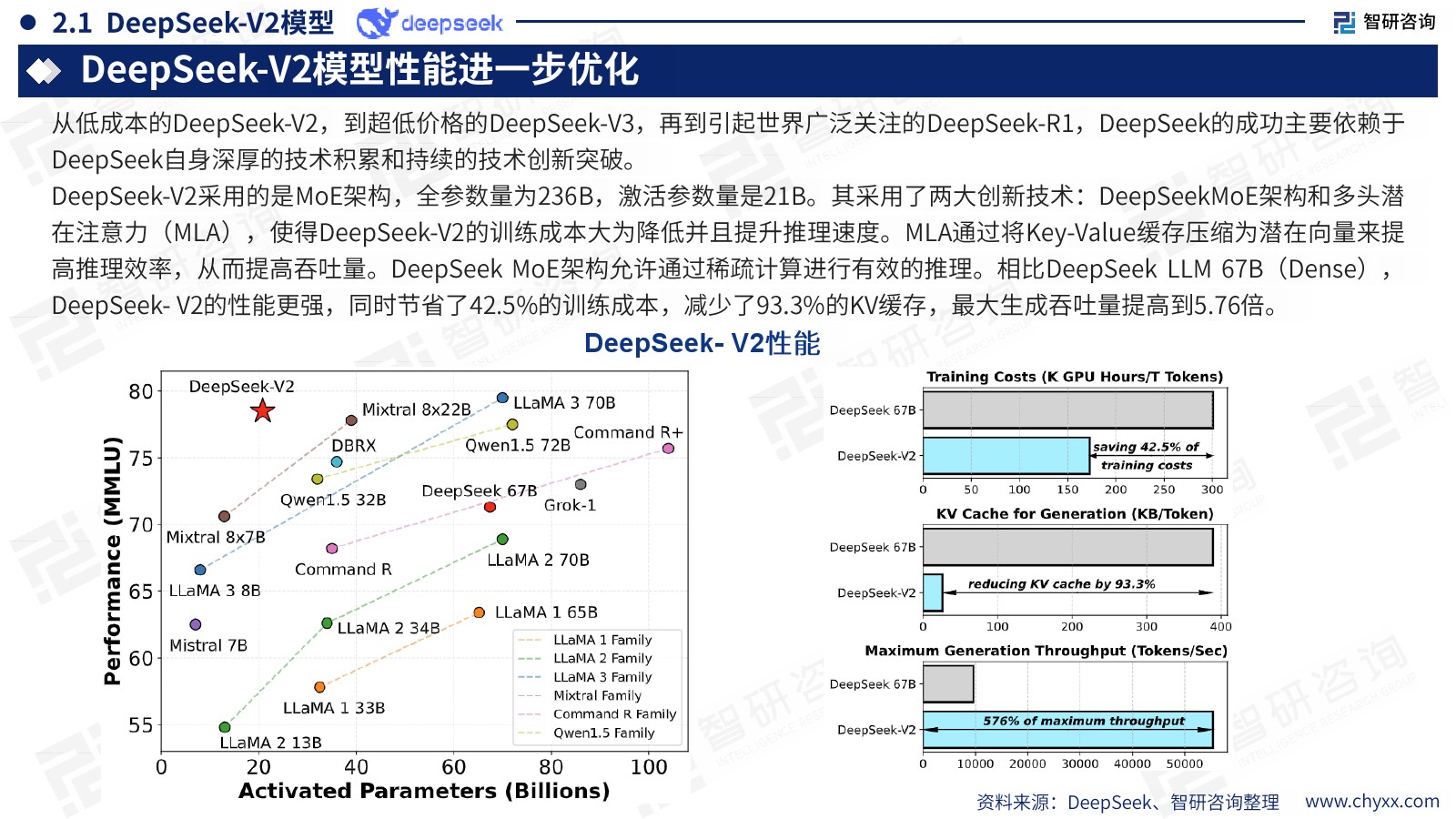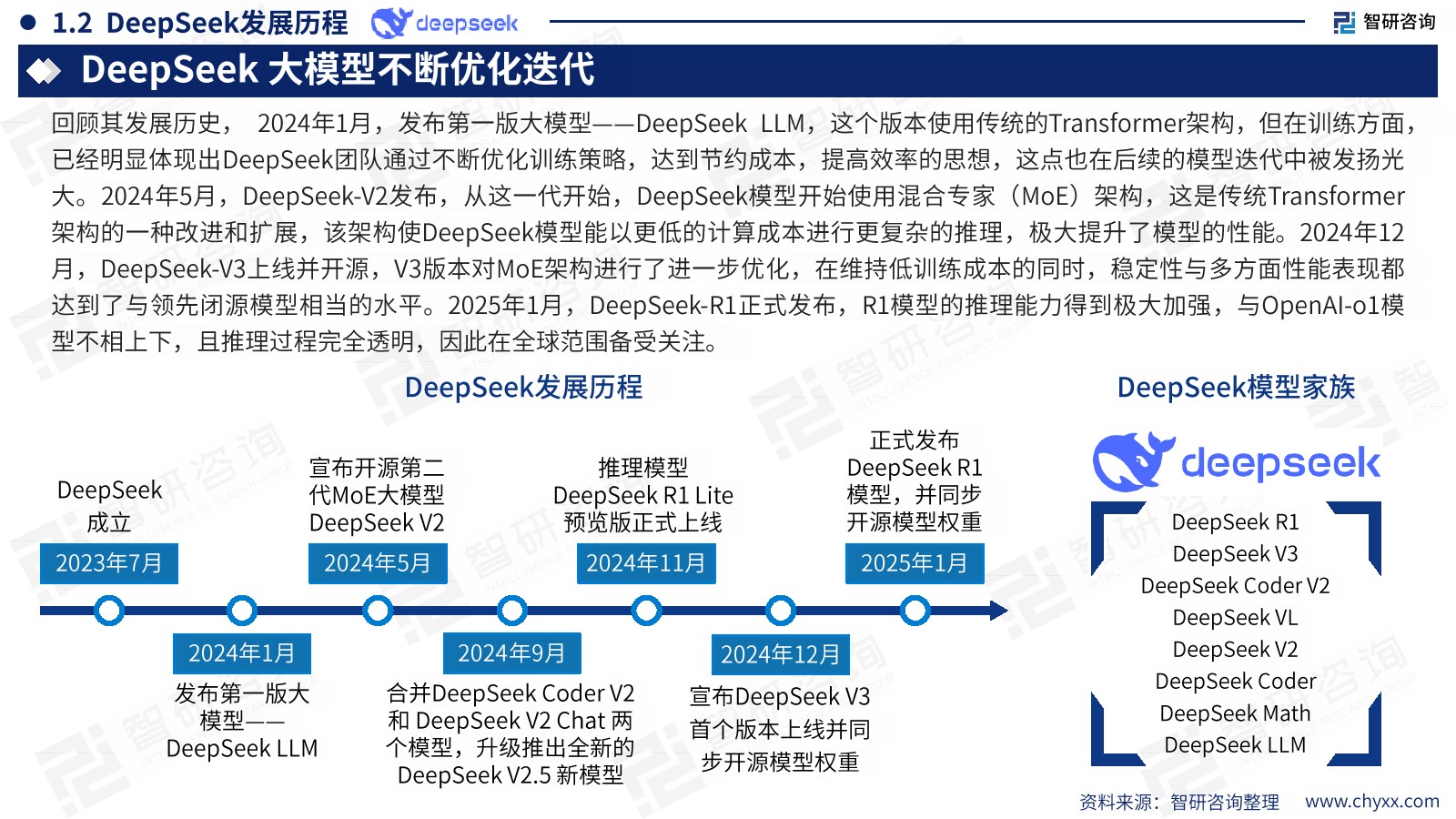 | DeepSeek背靠资金实力雄厚的幻方量化2025年1月,DeepSeek发布其最新开源模型DeepSeekR1,再度引发全球人工智能领域关注。 DeepSeek,全称杭州深度求索人工智能基础技术研究有限公司,成立于2023年7月17日,一家创新型科技公司,专注于开发先进的大语言模型(LLM)和相关技术。 DeepSeek背靠资金实力雄厚的幻方量化,DeepSeek创始人为梁文锋,梁文锋同时也是幻方量化的创始人,幻方量化是国内头部量化私募管理人,旗下有两家百亿量化私募,分别是2015年6月成立的浙江九章资产和2016年2月成立的宁波幻方量化。 Deepseek大模型不断优化选代回顾其发展历史, 2024年1月,发布第一版大模型--DeenSeek1LM,这个版本使用传统的Transformer架构,但在训练方面已经明显体现出DeepSeek团队通过不断优化训练策略,达到节约成本,提高效率的思想,这点也在后续的模型迭代中被发扬光大。 2024年5月,DeepSeek-V2发布,从这一代开始,DeepSeek模型开始使用混合专家(MOE)架构,这是传统Transformel架构的一种改进和扩展,该架构使DeepSeek模型能以更低的计算成本进行更复杂的推理,极大提升了模型的性能。 2024年12月,DeepSeek-V3上线并开源,V3版本对MOE架构进行了进一步优化,在维持低训练成本的同时,稳定性与多方面性能表现都达到了与领先闭源模型相当的水平。 2025年1月,DeepSeek-R1正式发布,R1模型的推理能力得到极大加强,与OpenA1-01模型不相上下,且推理过程完全透明,因此在全球范围备受关注。