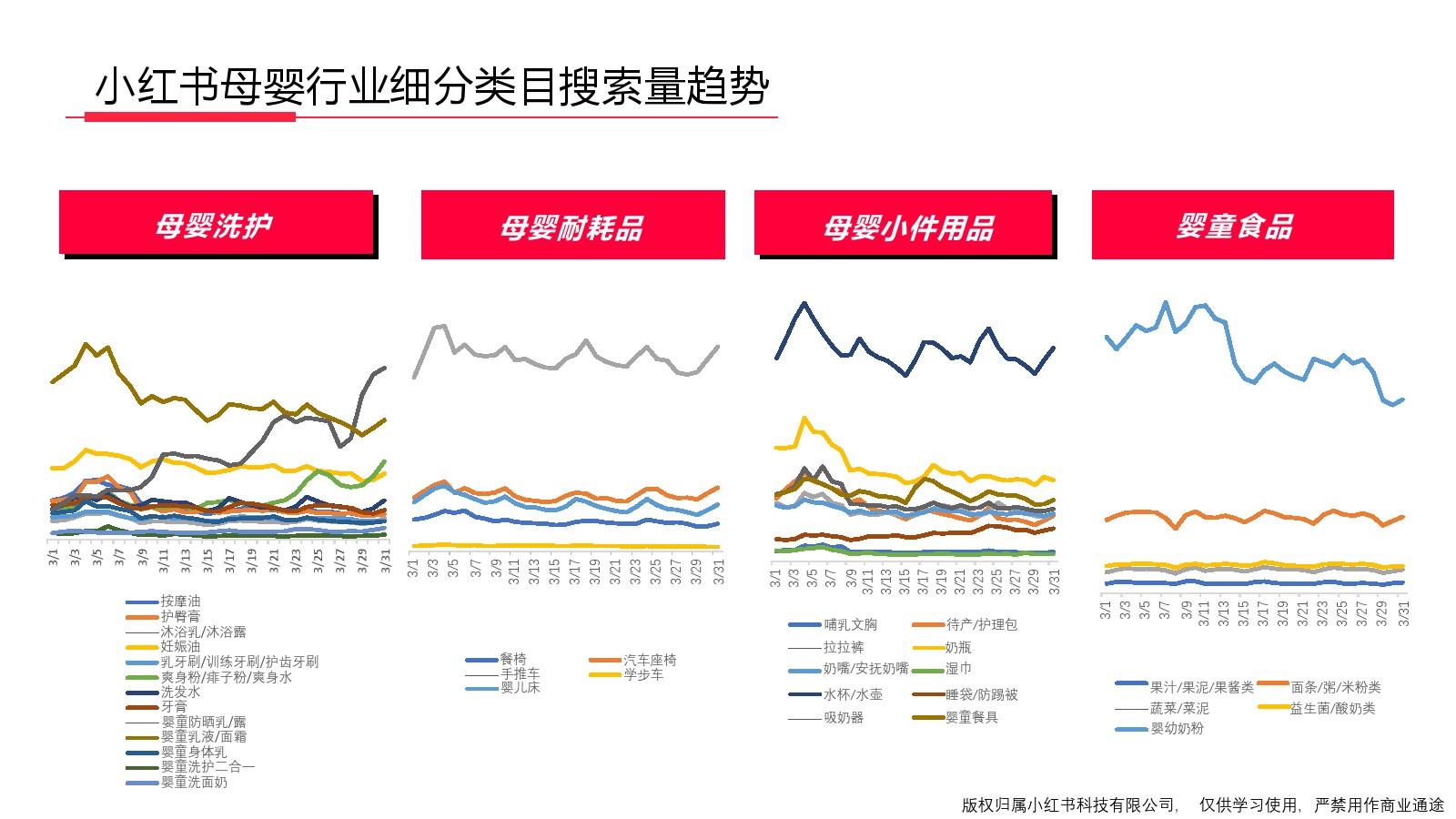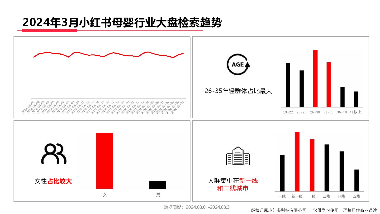 : 2024年3月小红书母婴行业大盘检索趋势26-35年轻群体占比最大女性占比较大人群集中在新一线和二线城市小红书母婴二级行业搜索量占比-3月小红书母婴细分类目搜索量占比-3月小红书母婴行业细分类目搜索量趋势母婴洗护母 ...