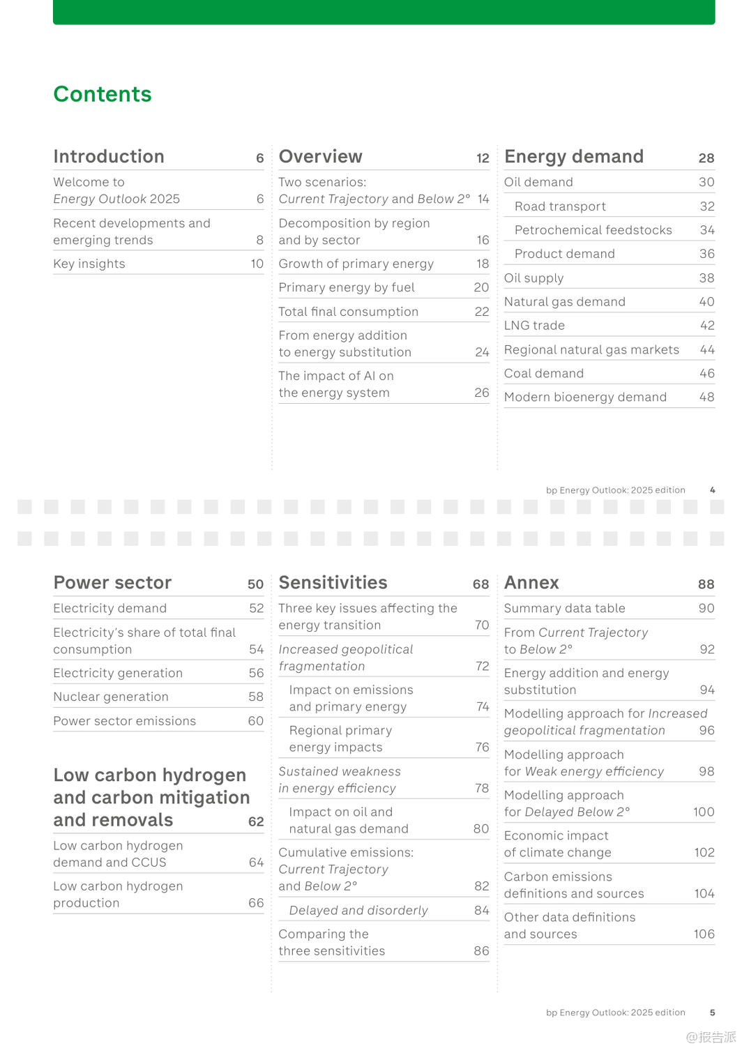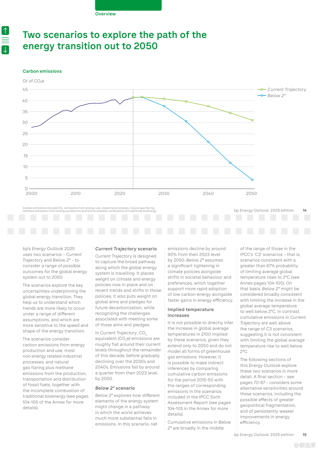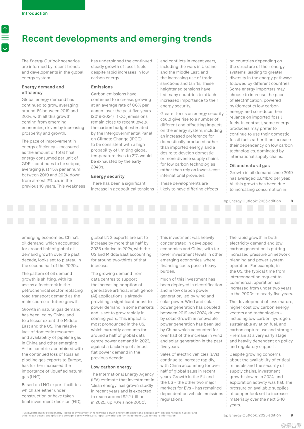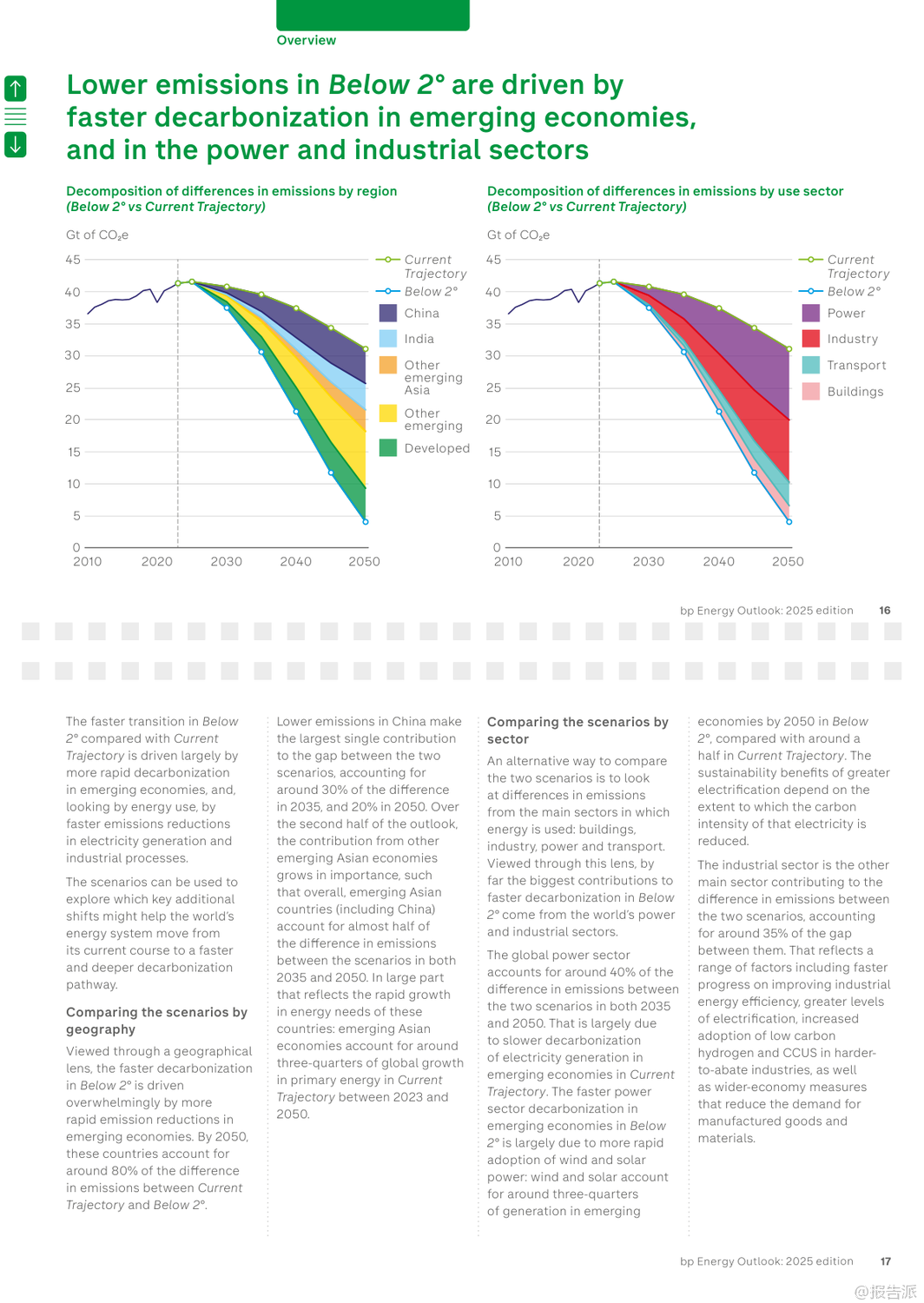 | bp最新发布的《2025年世界能源展望报告》通过两大核心情景——“当前路径”(Current Trajectory)与“低于2℃”(Below 2°),深入探讨了全球能源系统至2050年的可能演变趋势。 该报告并非对未来的确切预测,而是基于现有技术条件和政策趋势,揭示能源转型过程中的关键不确定性与潜在路径。 在“当前路径”情景下,全球碳排放将在本世纪20年代末趋于平稳,随后缓慢下降,到2050年较2023年水平减少约四分之一。 然而,这一路径下的累计碳排放将远超《巴黎协定》设定的2℃温控目标预算,意味着全球平均气温升幅很可能突破安全阈值。 相比之下,“低于2℃”情景则描绘了一个更激进的脱碳蓝图:通过强有力的气候政策、社会行为转变以及能效的快速提升,全球净排放到2050年将比2023年下降约90%,其累计排放量与IPCC评估中实现2℃目标的概率路径基本一致。 报告指出,无论在哪种情景下,新兴经济体(不含中国)都将是未来几十年全球能源需求增长的主要驱动力,这源于其持续提升的生活水平和人口增长。 与此同时,一个显著的结构性转变是,全球正从“能源叠加”阶段(即低碳能源与化石能源同时增长)逐步迈入“能源替代”阶段(即低碳能源的增长足以抵消化石能源的消耗)。 中国、美国和欧盟等主要经济体已率先进入这一替代阶段。 电力部门的变革尤为突出。 报告预测,到2050年,全球电力需求将翻倍。 风能和太阳能将成为主导的发电来源,在“低于2℃”情景下,二者合计将占全球发电量的70%。 核能也将稳步增长,尤其是在中国,其核电装机容量有望超越美国成为世界第一。 值得注意的是,人工智能(AI)的兴起正成为新的电力需求中心,数据中心的能耗在美国等地已占到电力需求增长的相当大比例。 在化石燃料方面,石油需求预计将在本世纪20年代末达到峰值后逐渐下降,其主要增长动力从交通燃料转向石化原料,特别是塑料生产。 天然气需求的命运则高度依赖于转型速度:在“当前路径”下,其消费量将持续增长,而在“低于2℃”路径下,则会大幅削减。 煤炭的衰落趋势最为明显,其在全球一次能源结构中的占比将从2023年的近30%降至2050年的15%以下。 报告还特别强调了三大敏感性因素的影响:地缘政治碎片化可能导致贸易萎缩,抑制经济与能源需求增长,但对能源转型的整体节奏影响有限;能效提升的持续疲软是过去五年能源需求保持刚性的关键原因,若此趋势延续,将严重阻碍减排进程;而延迟采取行动的风险极高,若世界在2030年代初之前未能启动加速转型,后续将不得不采取成本高昂且混乱的“无序调整”,以勉强满足气候目标。 出品方:bp 发布时间:2025年 文档页数:109页