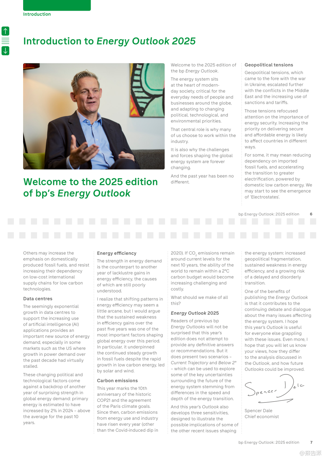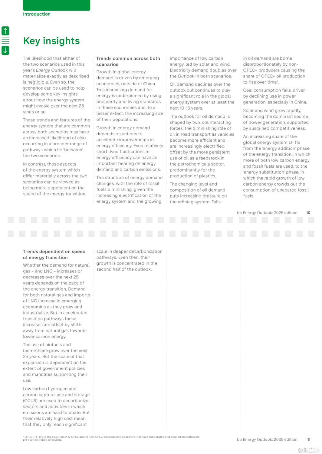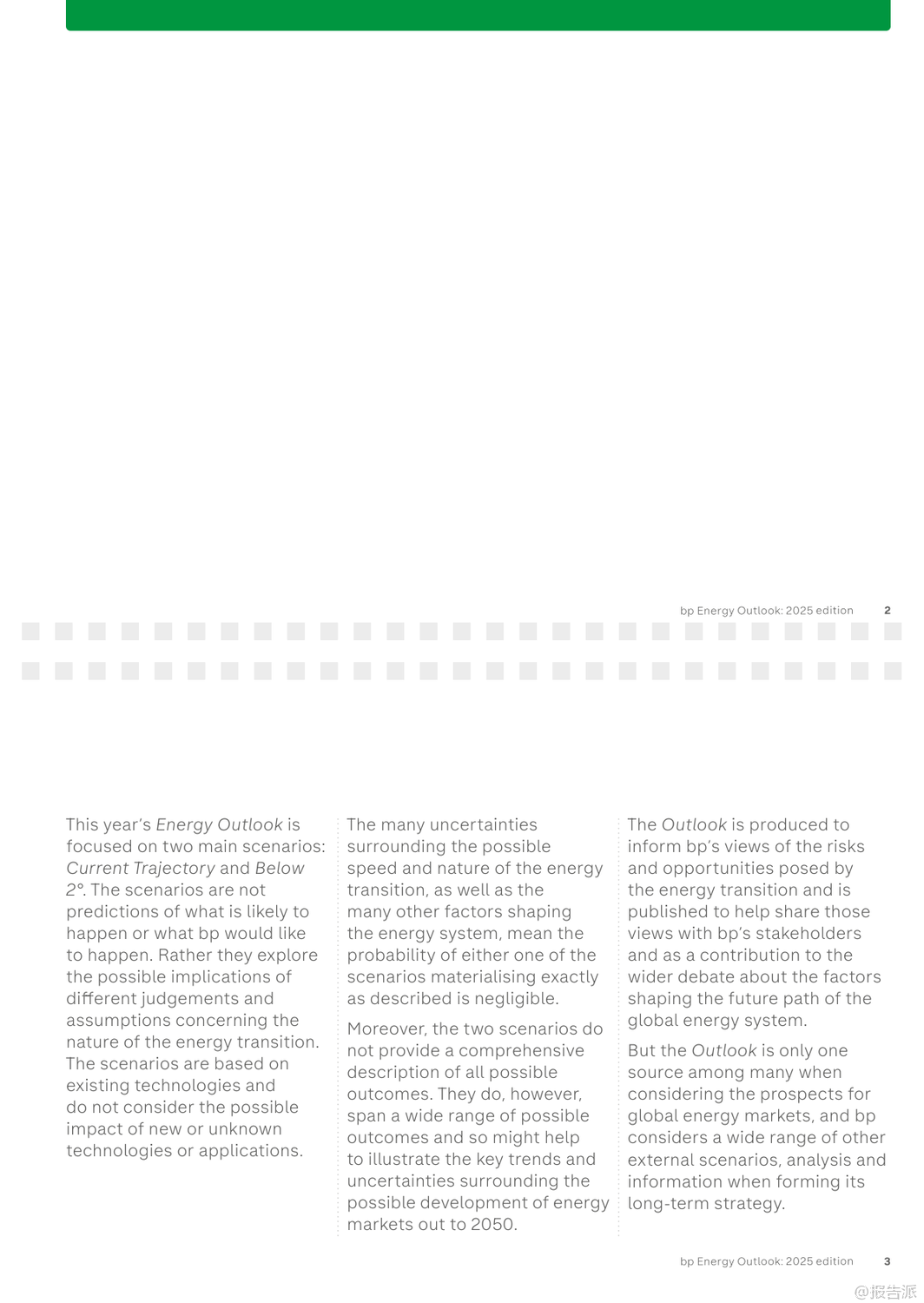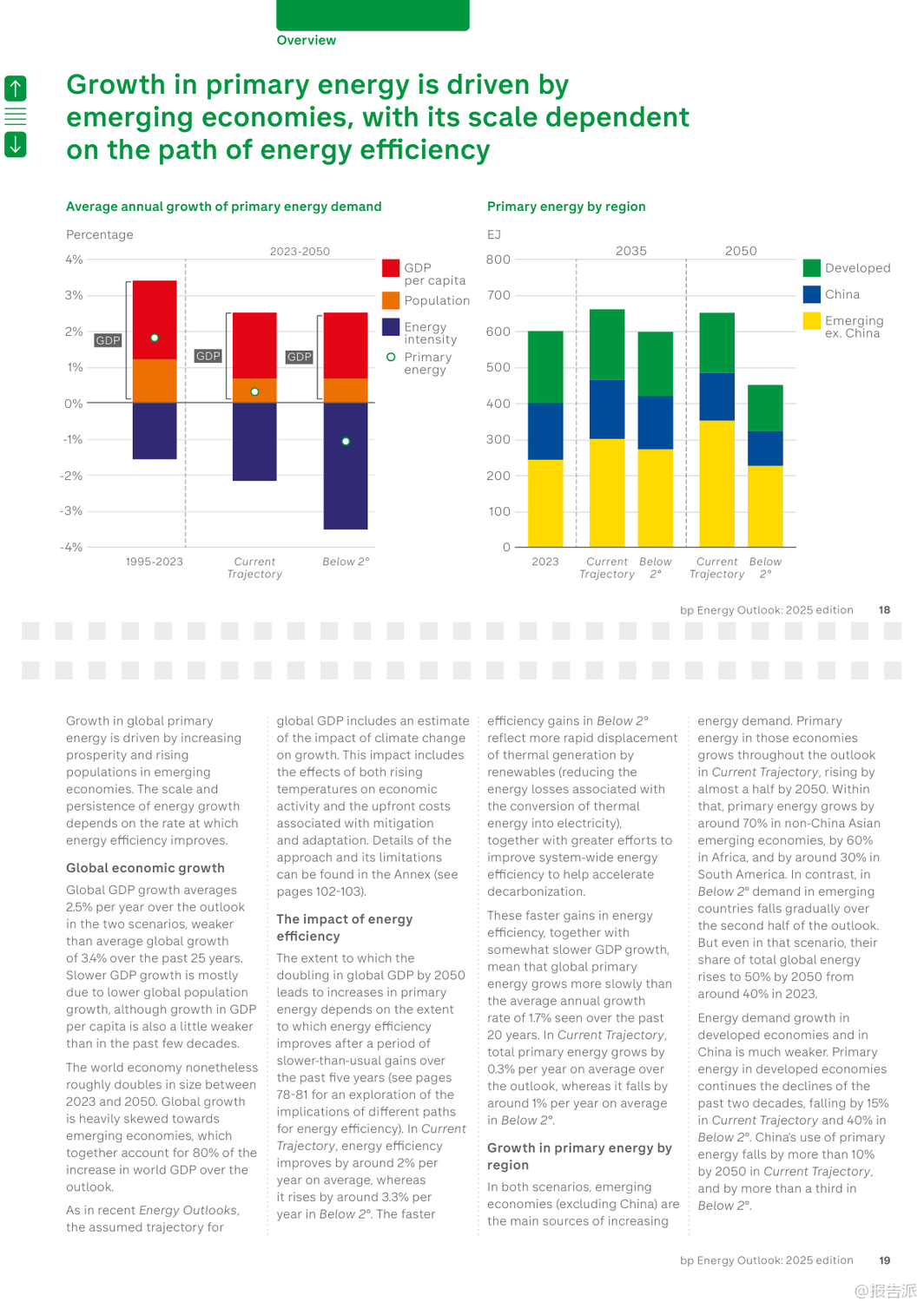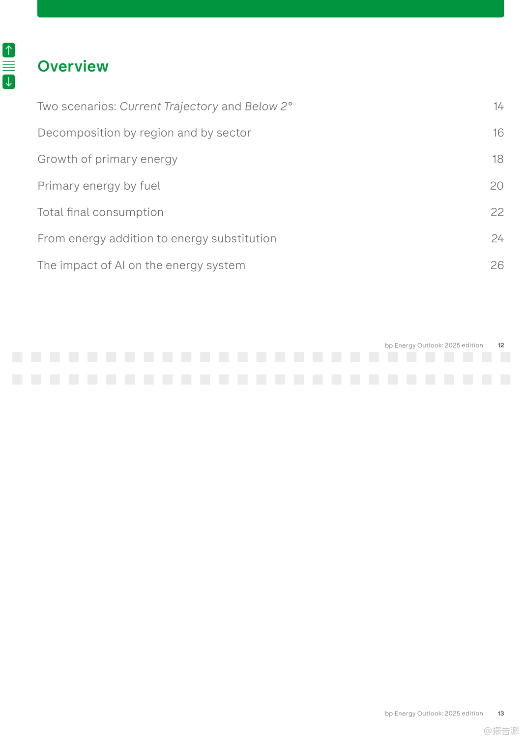 | bp最新发布的《2025年世界能源展望报告》通过两大核心情景——“当前路径”(Current Trajectory)与“低于2℃”(Below 2°),深入探讨了全球能源系统至2050年的可能演变趋势。 该报告并非对未来的确切预测,而是基于现有技术条件和政策趋势,揭示能源转型过程中的关键不确定性与潜在路径。 在“当前路径”情景下,全球碳排放将在本世纪20年代末趋于平稳,随后缓慢下降,到2050年较2023年水平减少约四分之一。 然而,这一路径下的累计碳排放将远超《巴黎协定》设定的2℃温控目标预算,意味着全球平均气温升幅很可能突破安全阈值。 相比之下,“低于2℃”情景则描绘了一个更激进的脱碳蓝图:通过强有力的气候政策、社会行为转变以及能效的快速提升,全球净排放到2050年将比2023年下降约90%,其累计排放量与IPCC评估中实现2℃目标的概率路径基本一致。 报告指出,无论在哪种情景下,新兴经济体(不含中国)都将是未来几十年全球能源需求增长的主要驱动力,这源于其持续提升的生活水平和人口增长。 与此同时,一个显著的结构性转变是,全球正从“能源叠加”阶段(即低碳能源与化石能源同时增长)逐步迈入“能源替代”阶段(即低碳能源的增长足以抵消化石能源的消耗)。 中国、美国和欧盟等主要经济体已率先进入这一替代阶段。 电力部门的变革尤为突出。 报告预测,到2050年,全球电力需求将翻倍。 风能和太阳能将成为主导的发电来源,在“低于2℃”情景下,二者合计将占全球发电量的70%。 核能也将稳步增长,尤其是在中国,其核电装机容量有望超越美国成为世界第一。 值得注意的是,人工智能(AI)的兴起正成为新的电力需求中心,数据中心的能耗在美国等地已占到电力需求增长的相当大比例。 在化石燃料方面,石油需求预计将在本世纪20年代末达到峰值后逐渐下降,其主要增长动力从交通燃料转向石化原料,特别是塑料生产。 天然气需求的命运则高度依赖于转型速度:在“当前路径”下,其消费量将持续增长,而在“低于2℃”路径下,则会大幅削减。 煤炭的衰落趋势最为明显,其在全球一次能源结构中的占比将从2023年的近30%降至2050年的15%以下。 报告还特别强调了三大敏感性因素的影响:地缘政治碎片化可能导致贸易萎缩,抑制经济与能源需求增长,但对能源转型的整体节奏影响有限;能效提升的持续疲软是过去五年能源需求保持刚性的关键原因,若此趋势延续,将严重阻碍减排进程;而延迟采取行动的风险极高,若世界在2030年代初之前未能启动加速转型,后续将不得不采取成本高昂且混乱的“无序调整”,以勉强满足气候目标。 出品方:bp 发布时间:2025年 文档页数:109页