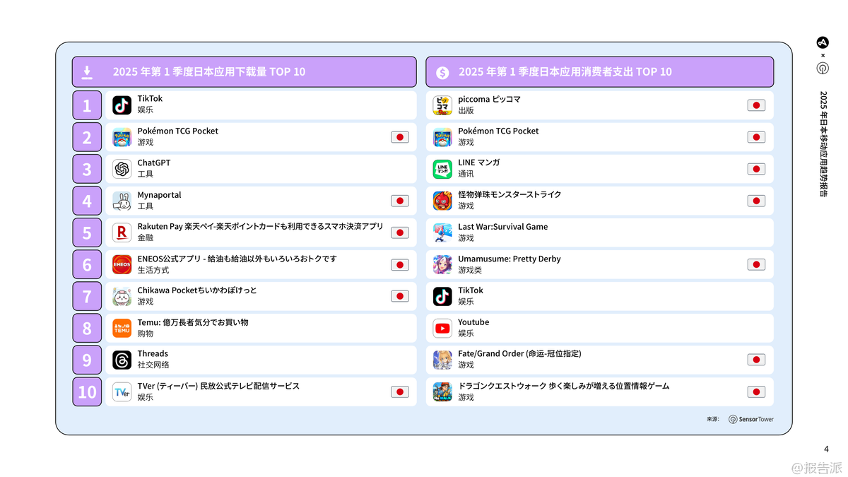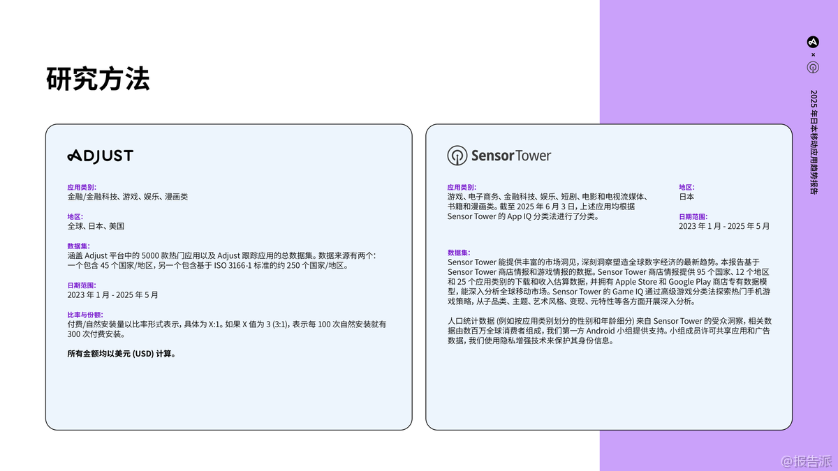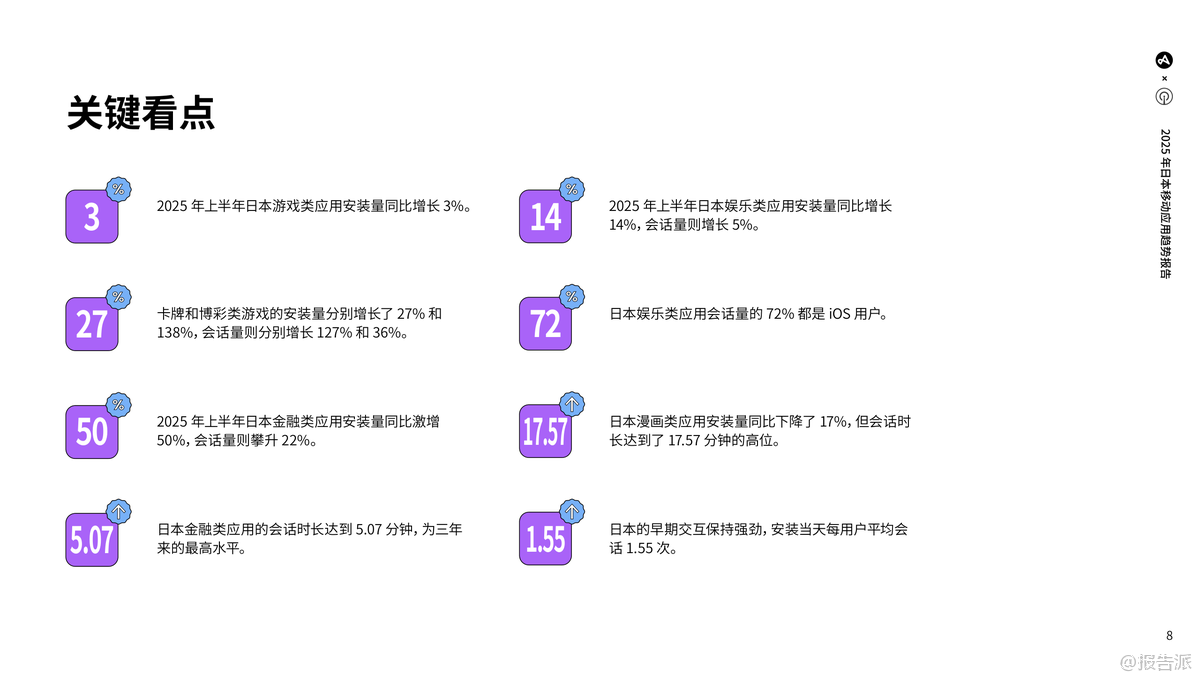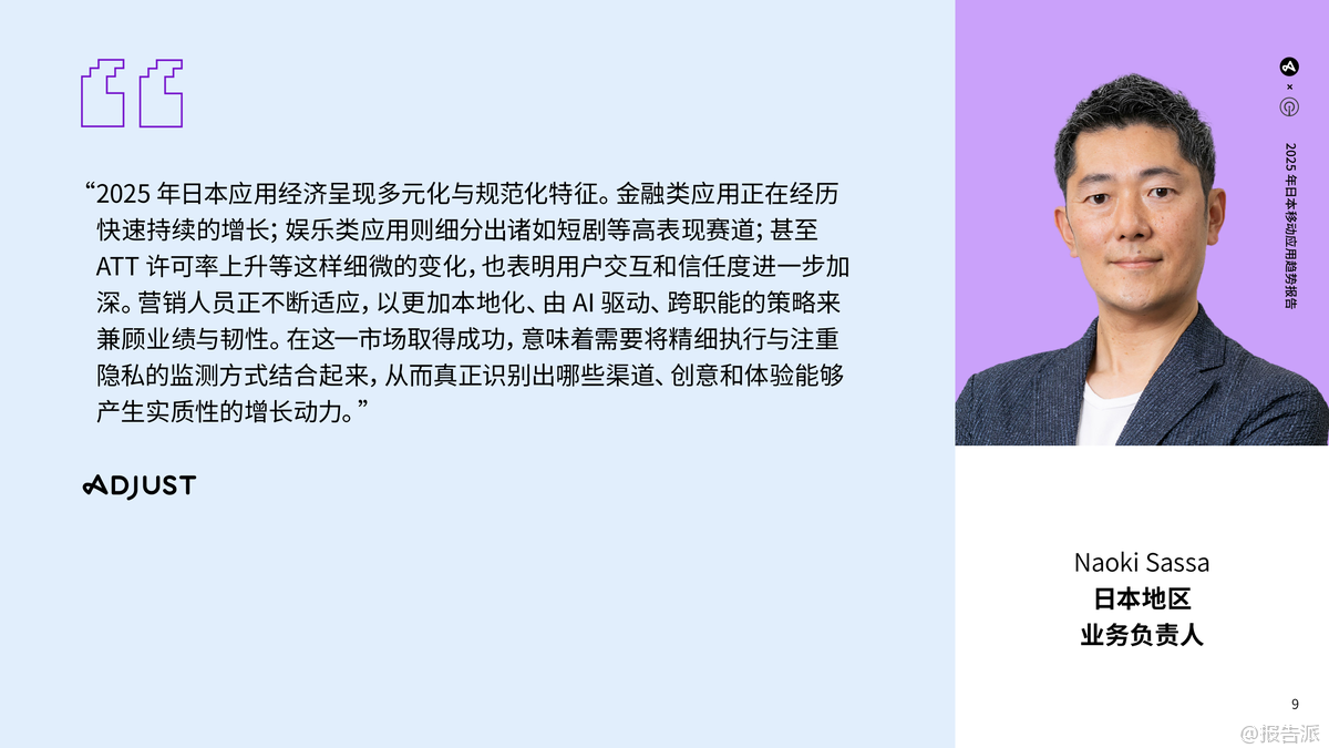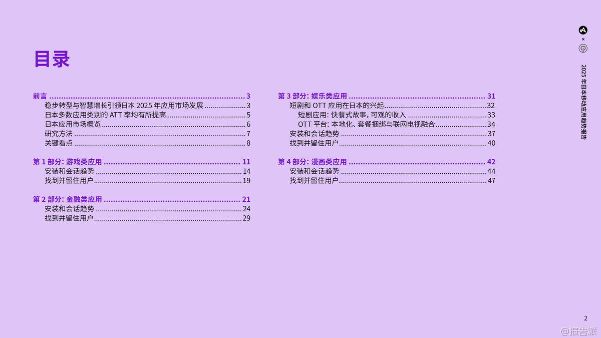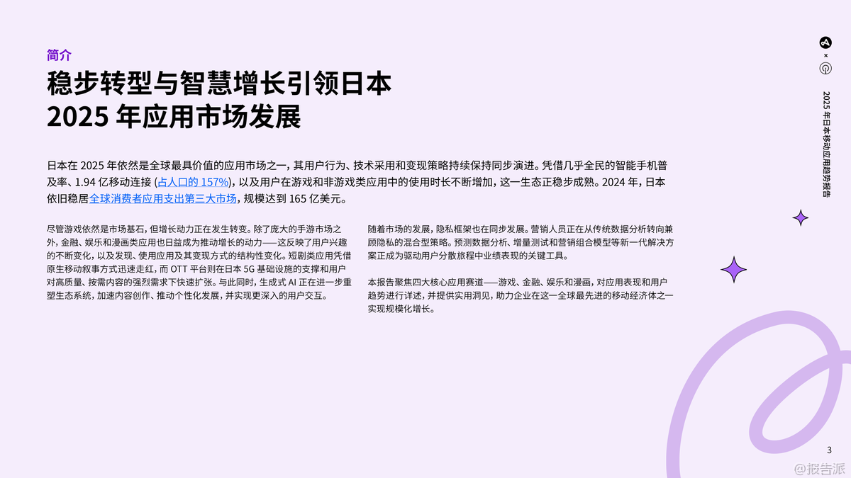 | 2025年,日本移动应用市场展现出稳健转型与智慧增长的鲜明特征,持续巩固其全球最具价值应用市场之一的地位。 凭借接近全民普及的智能手机覆盖率、1.94亿移动连接(占人口157%),以及用户在各类应用中不断延长的使用时长,日本应用生态已进入成熟发展阶段。 2024年,日本以165亿美元的消费者应用支出稳居全球第三大市场,游戏虽仍是基石,但金融、娱乐、漫画等非游戏类应用正成为新的增长引擎。 游戏市场整体保持稳定,2025年上半年安装量同比增长3%,会话量基本持平。 细分品类中,卡牌游戏(安装+27%,会话+127%)和博彩游戏(安装+138%)表现极为亮眼,超休闲和休闲类游戏也实现高速增长。 值得注意的是,超休闲游戏安装量占比高达20%,但会话量占比不足1%,凸显其高流失率;而解谜类游戏安装量仅占1%,会话量却高达21%,反映用户粘性极强。 平台方面,iOS用户贡献了65%的会话量,尤其在策略、冒险等重度游戏中优势显著。 用户获取日益依赖付费渠道,整体付费/自然安装比升至2.97:1,同时ARPMAU从1.03美元降至0.82美元,显示变现压力加大。 金融类应用迎来爆发式增长,2025年上半年安装量同比激增50%,会话量增长22%,会话时长达到5.07分钟的三年新高。 银行和支付类应用占据主导地位,iOS用户同样在安装和会话中占优(分别56%和62%)。 尽管ARPMAU从10.25美元大幅下滑至3.80美元,但用户留存稳定在7%(第30天),付费获取投入持续增加。 娱乐领域两大趋势引人注目:一是短剧应用异军突起,日本已成为全球第二大收入市场,RPD达4.13美元,用户以25-44岁女性为主,通过AI赋能和本地化内容实现高留存;二是OTT平台持续进化,依托5G和宽带普及,通过内容本地化、套餐捆绑和跨终端融合提升竞争力。 2025年上半年娱乐类应用安装量同比增长14%,iOS用户贡献了72%的会话量。 漫画类应用市场出现调整,2025年上半年安装量同比下降17%,但用户交互深度加强,会话时长达到17.57分钟的历史高位。 Android安装量占比(60%)超过iOS,但iOS用户更活跃,贡献69%的会话量。 用户留存率有所下滑,同时ARPMAU从0.52美元降至0.43美元,反映出用户支出趋于谨慎。 整体来看,日本市场正迈向多元化、规范化与智能化,隐私保护意识提升(ATT许可率增至21.4%),AI驱动的精细化运营成为制胜关键。 出品方:Adjust 发布时间:2025年 文档页数:49页