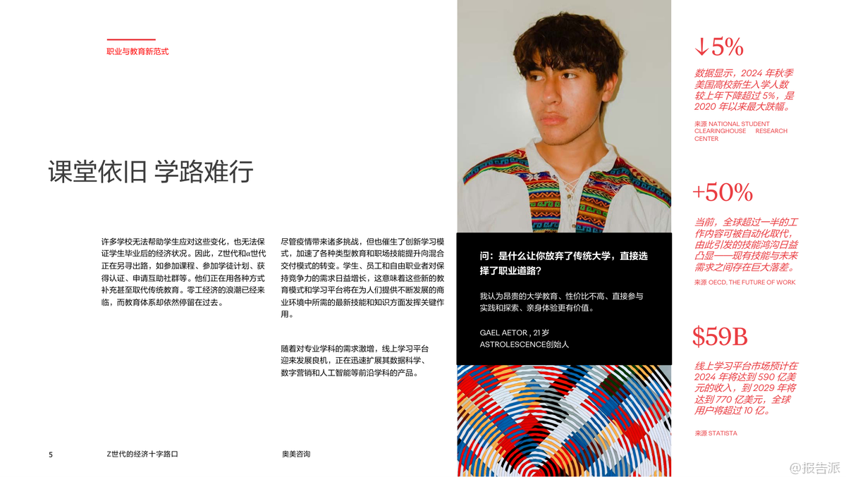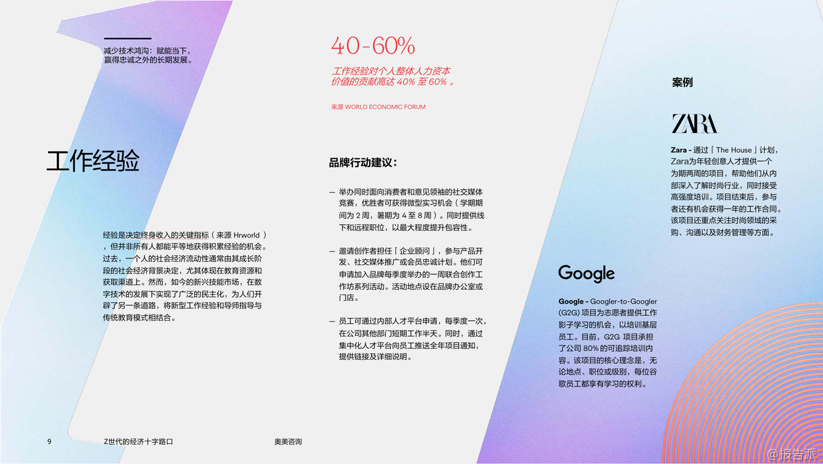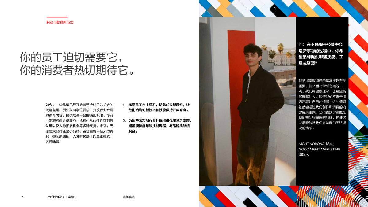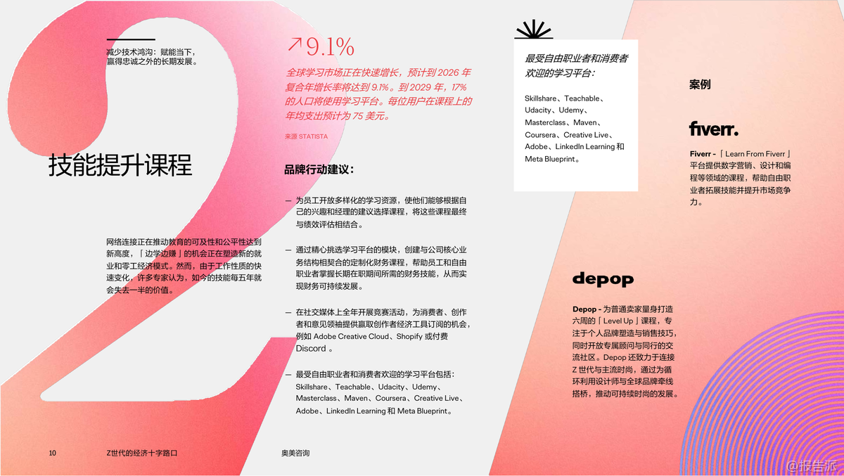 | Z世代正站在一个前所未有的经济十字路口,他们不仅是数字原住民,更是未来消费市场与劳动力结构的核心驱动力。 这份由奥美咨询发布的《2025年Z世代的经济十字路口:品牌发展的世代性机遇》报告深入剖析了这一代人在教育、就业、消费行为和价值观上的深刻转变,揭示了品牌如何抓住这一代人的心理与需求,实现可持续增长的关键路径。 报告显示,Z世代对高等教育的价值产生了广泛质疑。 自2020年以来,美国大学入学率下降了5%,而同期职业教育与技能培训平台如Skillshare、Udemy、Coursera等的注册量却激增近50%。 这表明Z世代更倾向于灵活、实用、可快速变现的学习方式,而非传统的学历路径。 他们追求的是能力认证而非文凭本身,这种趋势正在重塑教育生态,也为企业提供了通过技能共建参与人才孵化的新机会。 在职业发展方面,Z世代展现出强烈的自主意识与多元收入诉求。 高达70%的年轻人认为建立人脉比传统简历更重要,LinkedIn调研显示,85%的Z世代愿意为提升社交资本参与线下社群活动。 与此同时,“副业经济”成为常态——Fiverr平台上44%的新用户来自Z世代,他们通过设计、编程、内容创作等方式实现自我价值变现。 品牌若能提供真实的职业赋能,如Google的G2G(Googler-to-Googler)内部学习计划、Adobe Creative Cloud等工具型产品,将更容易赢得他们的信任与忠诚。 消费层面,Z世代呈现出理性与情感并存的复杂画像。 尽管整体可支配收入有限,但他们愿意为优质软件订阅(如Notion、Canva、ChatGPT Pro)、兴趣项目(如艺术、音乐、手作)和体验类服务(如ClassPass、Uber)支付溢价。 数据显示,2027年Z世代人均在数字订阅上的支出预计增长22.5%。 然而,他们拒绝被营销话术操控,更看重品牌的真诚度与社会担当。 例如Depop推出的“Level Up”计划帮助年轻创作者提升电商技能,The Macallan联合设计师Mai Atafo支持新兴创意人才,这些举措都赢得了强烈共鸣。 值得注意的是,Z世代对“成功”的定义已发生根本变化。 他们不再迷信大公司光环,而是追求意义感、灵活性与工作生活平衡。 企业必须重构雇佣关系,从“管理”转向“赋能”,从“雇佣”转向“共创”。 像Walmart Creator Program邀请年轻人参与品牌内容生产,IBM Skills Academy提供免费技术培训,都是成功的范例。 总而言之,面对Z世代,品牌不能再沿用旧有逻辑。 真正的机遇在于成为他们的成长伙伴——提供技能、资源、舞台与认同。 谁能在他们探索自我价值的路上给予实质性支持,谁就能赢得未来三十年的市场主导权。 出品方:奥美咨询 发布时间:2025年 文档页数:19页