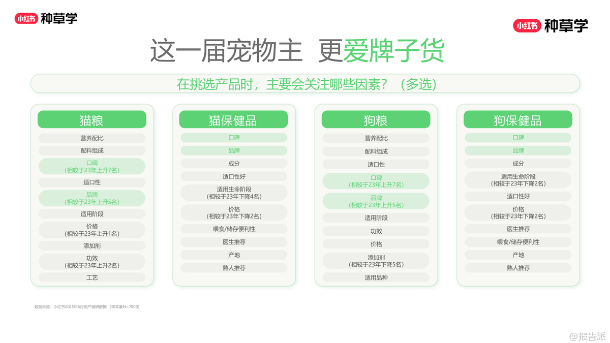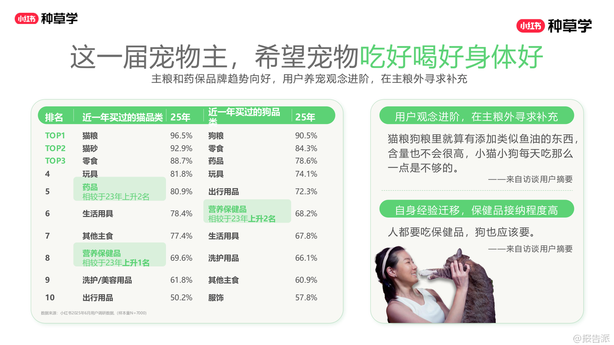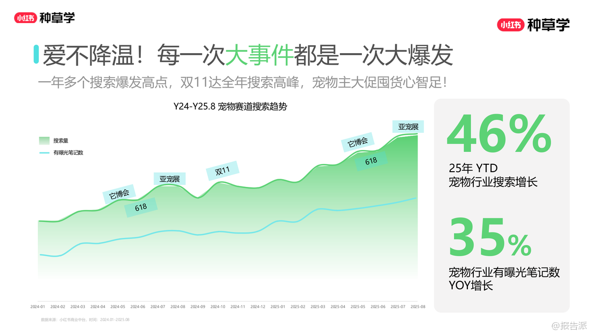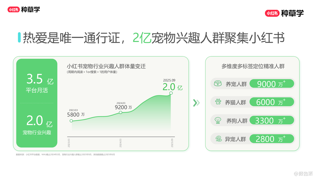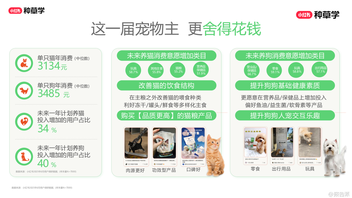 | 2025年,小红书平台宠物行业兴趣人群已达2亿,养猫人群超6000万,养狗人群突破3300万,宠物经济持续升温。 用户对宠物的投入不断加大,单只猫年消费中位数达3134元,单只狗达3485元,且未来一年分别有34%和40%的用户计划增加投入。 这一届宠物主不仅更舍得花钱,也更注重科学喂养与健康管理,呈现出“富养”趋势。 在消费偏好上,用户对主粮的关注从单一营养转向多样化补充。 猫粮、狗粮仍是大促核心品类,但冻干、罐头、鲜食等高端主食需求显著上升,尤其是“鲜蒸工艺”猫粮搜索量同比增长高达130000%,成为2025年黑马。 同时,宠物保健品市场快速增长,鱼油、软骨素、益生菌、维生素等品类搜索热度飙升,其中辅酶Q10因人宠映射效应成为高增长潜力品类。 驱虫、疫苗等刚性需求稳定,而老年犬健康、关节养护、免疫力提升等细分场景正成为新的增长点。 内容生态方面,小红书已成为宠物主获取信息的核心阵地。 用户偏好真实、反精致、有梗的UGC内容,评论区互动频繁,拟人化表达和情感投射盛行。 高点击笔记多围绕“新手攻略”“大促机制”“喂养手册”展开,而高进店率笔记则集中在“素猫实测”“自制猫饭”“知识科普”等可信度高的内容类型。 地域化内容如“沪上精致喵”“粤式鲜食喵”也引发强烈共鸣,品牌可通过本地化叙事增强用户认同。 营销层面,双11成为全年搜索最高峰,宠物主囤货心智强烈。 猫粮、狗粮、清洁用品、药保四大赛道呈现差异化竞争格局:猫粮赛道竞争激烈,品牌需强化口碑与攻略种草;狗粮赛道尚处蓝海,可借分体型、分犬种策略切入;药保品类增速迅猛,需结合季节与症状场景进行教育渗透;清洁用品中,木薯猫砂成顶流,智能猫砂盆心智提升但清洁痛点仍需解决。 投放策略上,品牌应遵循“蓄水—爆发—长尾”三阶段节奏,前置布局信息流与搜索场域。 猫粮用户决策周期长、阅读频次高,需多频次触达;狗粮用户更依赖兴趣激发与活动钩子;药保品类需专业背书与真实口碑;清洁用品则强调大促价格敏感与即时转化。 通过KFS内容模型(知识-兴趣-转化)、一方数据合作与CID闭环链路,品牌可实现种草直达转化,提升ROI。 总体来看,2025年宠物行业增长的关键在于“精细化运营”与“情感化连接”。 品牌不仅要满足功能需求,更要融入宠物主的生活方式与情感价值,通过真实、专业、有趣的内容构建信任,在激烈的市场竞争中实现“攻守兼备”的全域增长。 出品方:小红书 发布时间:2025年
