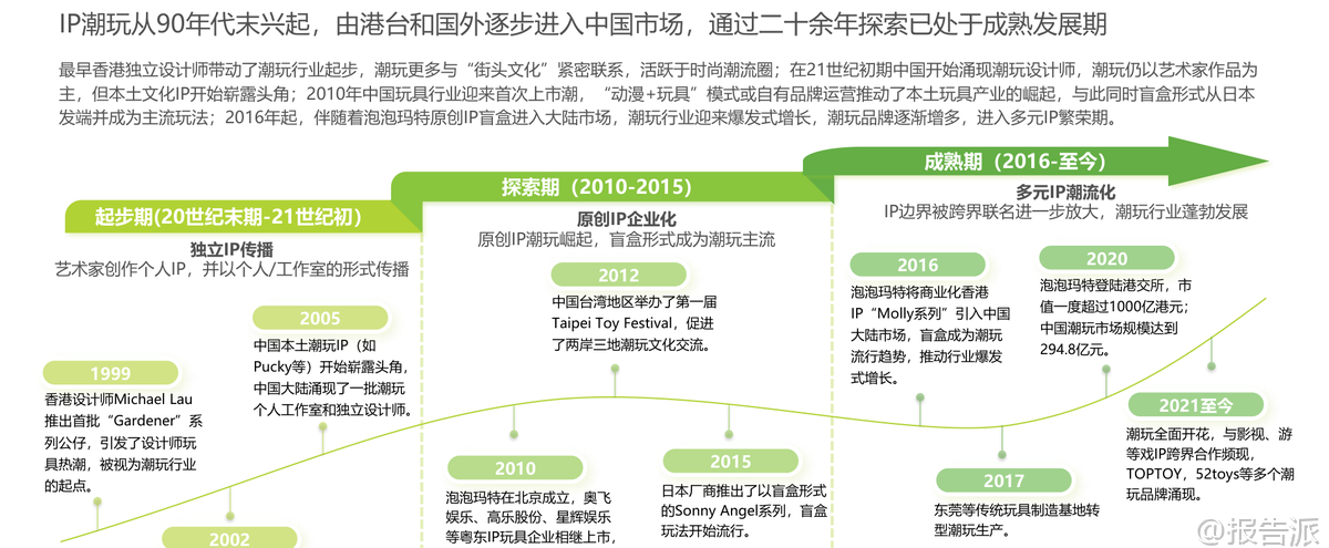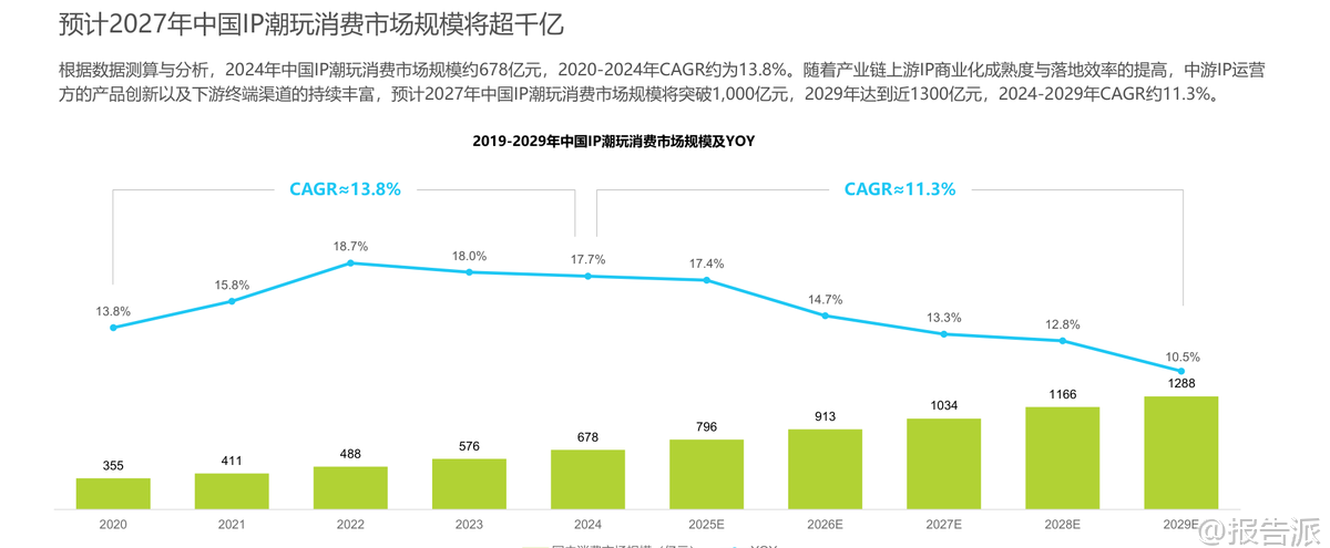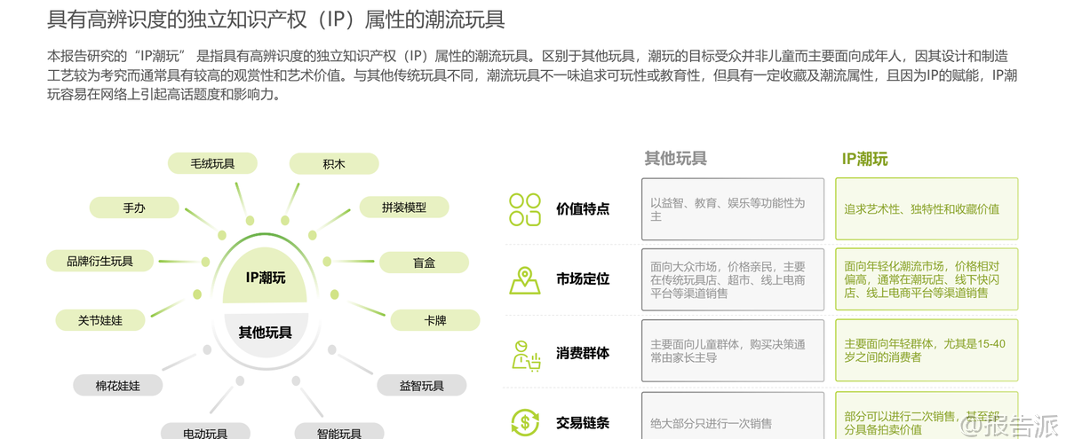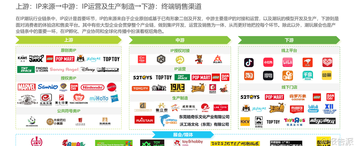 | 2025年,IP潮玩行业正从一个小众爱好市场演变为千亿级消费赛道。 艾瑞咨询最新发布的《2025年IP潮玩经济:解码让“大龄儿童”买单的商业密码》报告,深入剖析了这一现象背后的产业逻辑、消费变革与未来趋势。 报告显示,中国IP潮玩消费市场规模在2024年已达678亿元,预计2027年将突破千亿元大关,2029年接近1300亿元,展现出强劲的增长韧性。 所谓“IP潮玩”,指的是具有高辨识度知识产权属性的潮流玩具,其核心不再是儿童娱乐功能,而是面向15-40岁年轻群体的艺术性、收藏性与情绪价值。 与传统玩具不同,潮玩更强调设计美感、独特性和社交属性,且具备二次交易乃至拍卖的潜力。 其发展历程始于上世纪末的港台与海外,2016年泡泡玛特引入Molly盲盒系列后引爆市场,如今已进入多元IP繁荣与全产业链协同的成熟阶段。 产业链上,IP潮玩涵盖上游IP创作(原创、授权、公共符号)、中游运营与生产制造,以及下游多渠道销售。 头部企业如泡泡玛特已实现全链路布局,打通从IP孵化、产品设计、柔性供应链到线上线下全渠道销售的闭环。 其中,社交媒体成为消费者获取信息的第一入口,而“沉浸式开箱视频”和“品牌联名”是最能激发购买欲的内容形式。 购买渠道则呈现“双核心”特征:货架电商与品牌自营线下店并重,消费者最关注货源丰富度、即时拥有感与价格优势。 从消费端看,IP潮玩的核心用户为一线及新一线城市21-35岁的中青年中产,月收入集中在6000-10000元。 他们年均购买3-10次,单次消费超200元者占比超80%,消费动机以“系列收藏”和“情绪减压”为主。 盲盒与手办是最受欢迎的品类,而“展示陈列”“改娃”“换娃”等玩法日益流行,反映出用户从单纯购买转向深度参与和自我表达。 报告重点剖析了三大代表性企业:泡泡玛特、万代南梦宫与集卡社。 泡泡玛特凭借LABUBU等原创IP的“丑萌美学”设计、UGC生态激发与明星效应破圈,成功实现全球化,其“本土设计+标准运营”模式成为中国IP出海的典范。 万代南梦宫则通过“IP轴战略”,以高达、龙珠等经典IP为核心,实现动画、游戏、周边、线下体验的跨媒体协同,2025财年《龙珠》IP销售额高达1906亿日元。 集卡社作为卡牌新势力,通过前瞻性布局《哪吒2》等头部IP,结合“拆卡直播”等新玩法,迅速成长为产研销一体的综合文化娱乐企业。 展望未来,报告指出三大机遇与挑战并存。 一是“潮玩出海”:欧美、日本、东南亚市场潜力巨大,但面临文化适配、知识产权保护与供应链波动等挑战。 二是“数字潮玩”:NFT与元宇宙技术为虚拟藏品赋予稀缺性与社交属性,但需克服监管不确定性、技术门槛与价值泡沫等问题。 三是“多元化拓展”:品牌正从单一潮玩向珠宝、餐饮、主题乐园等生态延伸,但需警惕品牌稀释、供应链不适配与价格敏感等风险。 专家普遍认为,IP潮玩的未来在于“以IP为核,向新而生”。 消费者不再只是购买者,更是共创者。 品牌需深刻理解Z世代的情绪需求,深耕内容创作与文化塑造,通过差异化设计、社群运营与场景创新,将IP打造成可持续的长线资产。 正如集卡社创始人林俊所言,目标是打造“中国的万代”;而豆豆团队则致力于让用户从“购买者”变为“共创者”。 在这个情绪价值驱动的时代,谁能讲好故事、构建共鸣、激发参与,谁就能真正掌握让“大龄儿童”持续买单的商业密码。 本文由【报告派】研读,输出观点仅作为行业分析! 原文标题:2025年IP潮玩经济 解码让“大龄儿童”买单的商业密码 发布时间:2025年 出品方:艾瑞咨询 文档页数:40页