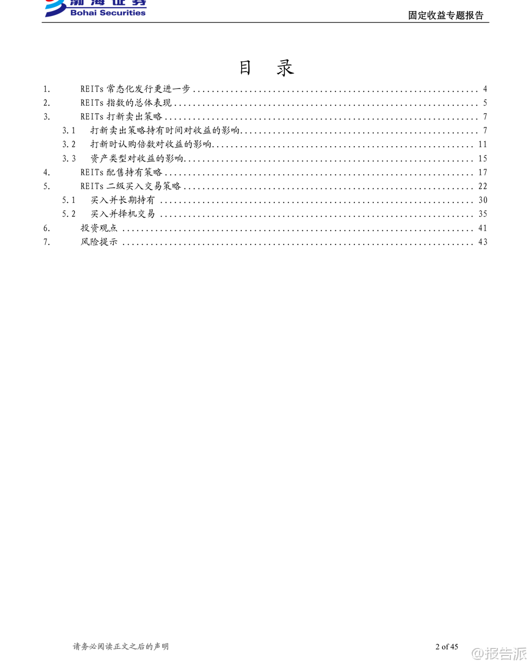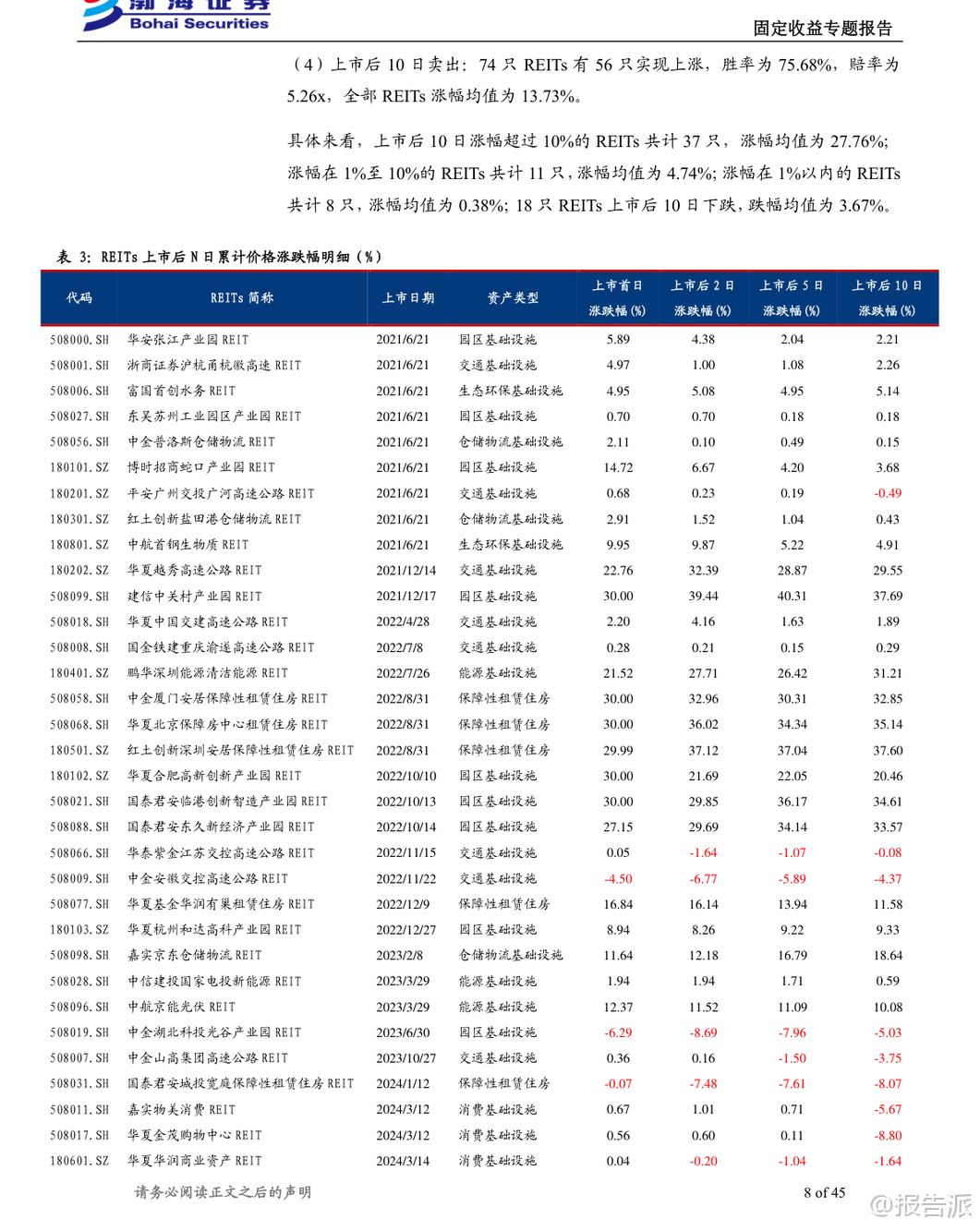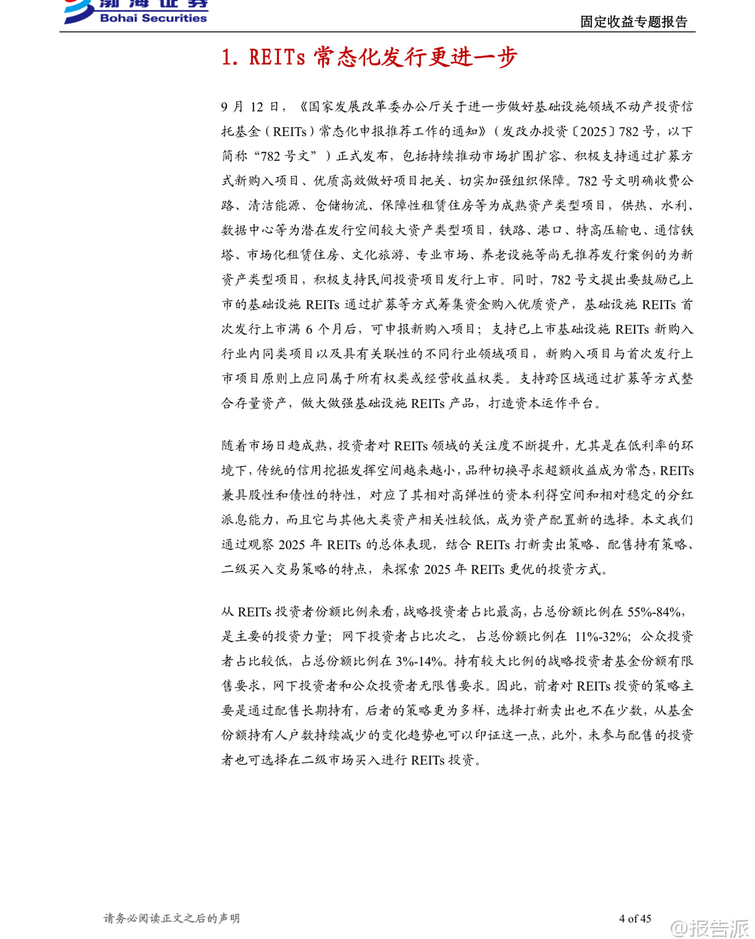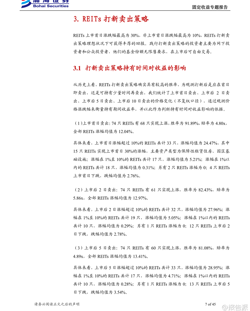 | 在当前低利率环境下,传统信用类资产的收益空间日益压缩,投资者纷纷寻求更具弹性的品种以获取超额收益。 REITs(不动产投资信托基金)因其兼具股性与债性的双重特征,既能提供相对稳定的分红派息,又具备一定的资本增值潜力,且与其他大类资产相关性较低,正逐步成为资产配置中的重要选项。 本文基于渤海证券发布的《初看REITs的投资机会(系列四):收益视角》报告,深入解析2025年REITs市场的三大主流投资策略——打新卖出、配售持有与二级买入交易,帮助投资者厘清不同策略的收益逻辑与适用场景。 首先,从投资者结构来看,REITs市场以战略投资者为主导,占比高达55%-84%,其份额具有限售要求,因此主要采取长期持有的策略。 相比之下,网下投资者和公众投资者占比虽小,但因无锁定期限制,策略更加灵活,打新后择机卖出是常见操作。 这一趋势也体现在基金份额持有人户数持续减少的现象中,反映出部分投资者在二级市场集中持仓的倾向。 在各类投资策略中,打新卖出策略近年来表现出较高的胜率与可观的回报。 数据显示,自2021年以来,REITs上市首日平均涨幅达12.04%,其中2025年更是达到26.86%。 从持有时间维度看,上市首日卖出的胜率最高,为91.89%,但若某只REIT在首日涨停(涨幅30%),则继续持有至第二个交易日卖出的赔率更高,平均涨幅可达43.01%。 而对于首日涨幅低于10%甚至破发的产品,继续持有的胜率明显下降,且存在短期内价格回落的风险。 因此,报告建议多数情况下应优先选择上市首日即卖出,仅对表现强势的标的适度延长持有时间。 进一步分析发现,打新收益与市场热度高度相关,而认购倍数是衡量热度的关键指标。 数据显示,网下认购倍数超过100倍的REITs,上市首日平均涨幅高达24.68%,远高于低热度产品的表现。 因此,优选高热度、高认购倍数的REITs进行打新,并执行首日卖出策略,是提升收益效率的最优路径。 不过,这也意味着投资者面临申请确认比例极低的问题,需提前做好资金安排。 从资产类型看,不同底层资产的表现差异显著。 2025年,新型基础设施REITs(如数据中心)和保障性租赁住房REITs整体表现最佳,上市首日平均涨幅分别达30.00%和21.74%。 园区、仓储物流、消费类REITs次之,而交通基础设施REITs整体表现最弱,平均涨幅仅2.55%,部分产品甚至出现破发。 因此,在打新产品选择上,应优先聚焦政策支持明确、市场需求稳定的新兴资产类别。 对于长期投资者而言,配售持有策略同样具备吸引力。 得益于REITs强制分红机制(分红比例不低于可供分配金额的90%),长期持有可同时获取分红收益与资本利得。 截至2025年9月22日,74只REITs中有65只实现正收益,整体平均收益率为31.00%,其中资本利得贡献约20.58%,分红贡献约10.42%,两者比例约为2:1。 值得注意的是,部分产品即便上市初期表现平平,长期收益依然可观。 例如嘉实物美消费REIT上市首日仅涨0.67%,但因后续价格大幅上涨,总收益率高达89.05%。 二级市场买入策略则更考验择时能力。 数据显示,2025年1月、3月、5月、6月整体上涨数量多,适合布局;而2月、4月、7月、8月、9月下跌居多。 若在每月最低价买入并持有至今,1月至4月的平均收益率普遍较高,而6月、7月买入的胜率和收益均偏低。 此外,波段操作需关注振幅与换手率。 2025年REITs平均月振幅为28.33%,其中部分消费、产业园类REITs振幅超50%,具备较强交易属性,但同时也需警惕流动性不足的风险。 综上所述,2025年REITs市场呈现多元化投资机会。 打新策略适合追求短期高回报的投资者,重点在于精选高热度、高成长性的资产类型;配售持有策略适合长期稳健型资金,享受分红与资产增值双重收益;二级交易则更适合具备较强择时能力的专业投资者。 无论何种策略,均需密切关注政策动向、资产质量与市场情绪变化,理性决策,规避风险。 本文由【报告派】研读,输出观点仅作为行业分析! 原文标题:原文标题:初看REITs的投资机会(系列四):收益视角 发布时间:2025年 报告出品方:渤海证券 文档页数:45页