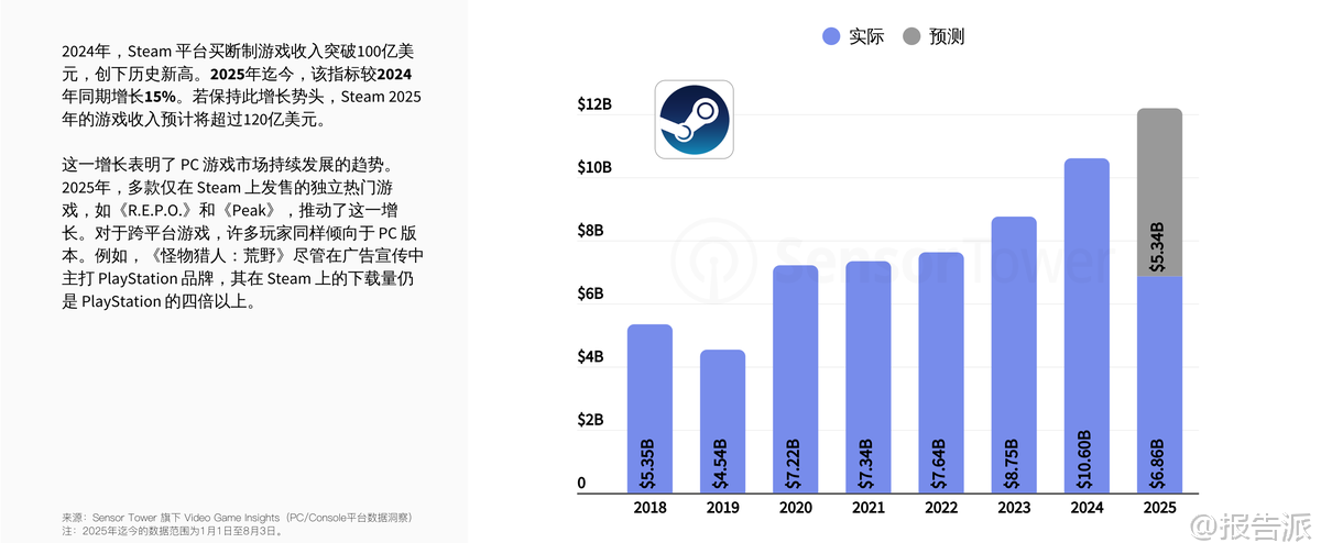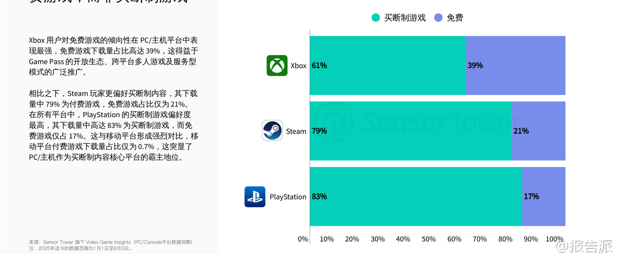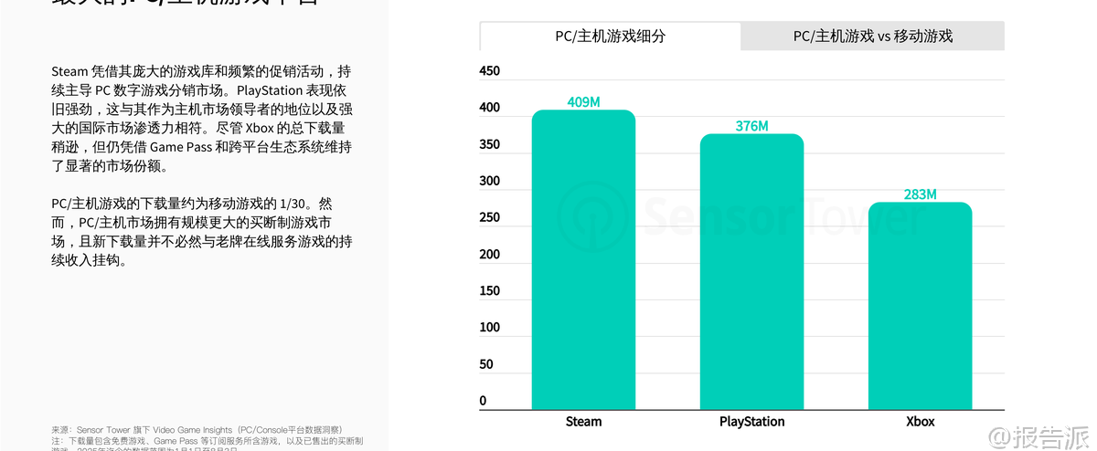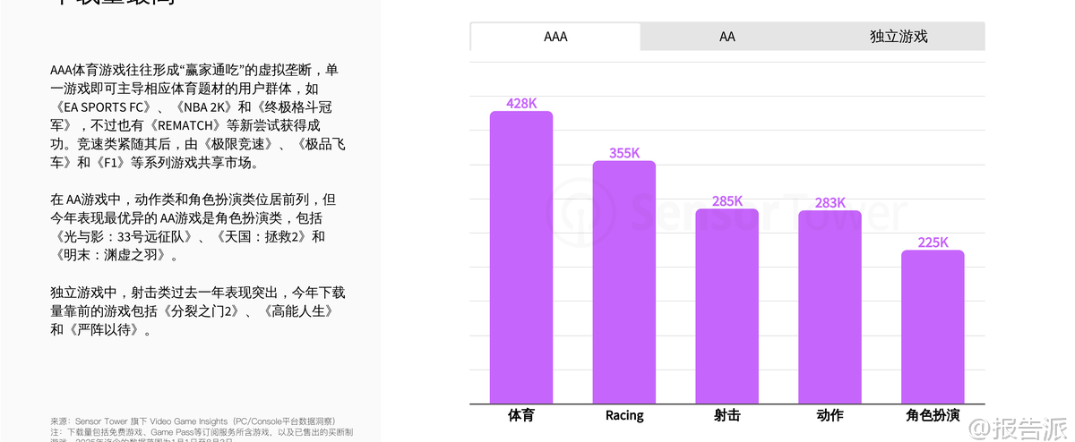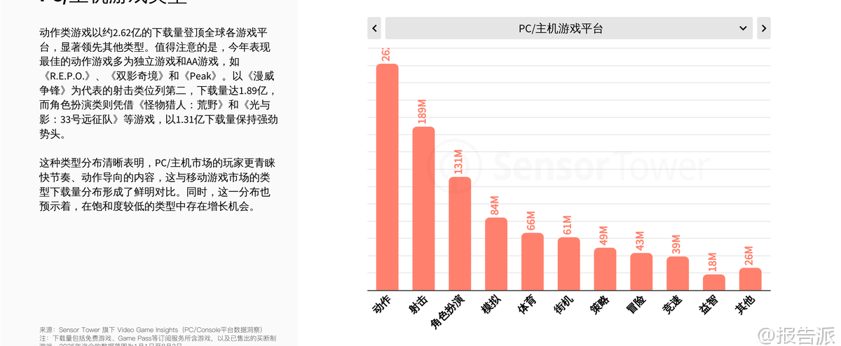 | 2025年全球PC/主机游戏市场呈现出买断制与服务型模式并行发展的格局,玩家在时间和消费上的持续投入推动行业稳步增长。 根据Sensor Tower发布的《2025年全球PC/主机游戏行业报告》,截至2025年8月3日,Steam以4.09亿次下载量稳居全球最大PC/主机游戏平台,领先于PlayStation的3.76亿和Xbox的2.83亿。 尽管PC/主机游戏总下载量仅为移动游戏的约1/30,但其在买断制内容和高价值游戏消费方面展现出更强的变现能力。 动作类游戏成为2025年最受欢迎的游戏类型,累计下载量达2.62亿次,显著领先其他品类。 这一增长主要由《R.E.P.O.》《Split Fiction》《Peak》等独立及AA级热门游戏带动,显示出中小开发者在快节奏、高沉浸感内容上的创作活力。 射击类和角色扮演类紧随其后,分别以1.89亿和1.31亿次下载量位列第二、第三。 值得注意的是,AAA级体育游戏在平均下载量上遥遥领先,形成“赢家通吃”局面,代表作如《EA SPORTS FC》《NBA 2K》《UFC》等长期占据用户心智。 从发行商维度看,艺电(EA)以8280万次下载量位居全球第一,凭借其在体育游戏领域的绝对统治力、知名IP系列以及成功的合作游戏策略(如《Split Fiction》《双人成行》)持续领跑。 微软以7540万次紧随其后,依托Xbox生态系统与Game Pass订阅服务实现稳定增长;索尼以5540万次位列第三,依靠第一方工作室如顽皮狗、圣莫尼卡和失眠组打造高质量3A大作。 网易凭借《漫威争锋》的强势首发,进入头部阵营,展现中国厂商在主机市场的突破潜力。 平台策略差异显著影响游戏成功路径。 Steam作为独立游戏首选平台,60%的下载量来自独立发行商,且79%为买断制游戏,体现其用户对高质量单机内容的偏好。 PlayStation用户则表现出最强的买断制倾向(83%),偏好电影级叙事作品,日本发行商在此平台占比达22%,反映出其深厚的日系游戏生态。 Xbox平台免费游戏下载占比高达39%,受益于Game Pass的开放生态和跨平台多人游戏布局,更偏向服务型和在线竞技类内容。 在具体游戏表现方面,《EA SPORTS FC 25》以1200万份销量成为2025年迄今最畅销的PC/主机游戏,彰显体育IP的强大号召力。 卡普空的《怪物猎人:荒野》以1170万份销量紧随其后,成为唯一进入销量前十的非体育类AAA游戏,其在Steam平台的下载量更是PlayStation的四倍以上,显示PC玩家对主机大作的高度接纳。 AA级游戏中,《光与影:33号远征队》和《天国:拯救2》表现亮眼,开普勒互动凭借前者跻身发行商前列。 独立游戏领域,《R.E.P.O.》成为销量冠军,其成功源于精准定位内容创作者和朋友组队玩家,通过主播传播形成“病毒式”热度,复刻了《致命公司》的爆款路径。 广告营销方面,微软是2025年迄今美国市场PC/主机游戏广告支出最高的发行商,主要用于《使命召唤》《魔兽世界》《上古卷轴IV:湮灭重制版》等核心IP推广。 Epic Games则几乎将全部预算投入《堡垒之夜》,后者也成为美国市场广告投入最多的PC/主机游戏。 值得注意的是,《EA SPORTS FC 25》虽销量第一,却未出现在广告支出榜单中,说明成熟IP可通过品牌效应实现低营销成本的高效转化。 用户行为层面,《反恐精英2》以3920万月活用户位居榜首,全部通过Steam运行,凸显其平台粘性。 《堡垒之夜》《我的世界》《罗布乐思》等跨平台游戏也在主机端保持高活跃度。 网易《漫威争锋》作为2025年新游,月活达1460万,跻身前十,证明新兴IP在激烈竞争中仍有机会突围。 此外,《使命召唤》系列移动端DAU占比高达64%,显示其全球化用户基础,而Steam平台中国玩家数量最多,反映区域市场差异。 展望未来,随着《GTA6》延期至2026年,2025年市场迎来窗口期。 《空洞骑士:丝之歌》《无主之地4》《使命召唤:黑色行动7》《战地风云6》《EA SPORTS FC 26》等重量级作品有望填补空白。 其中,《空洞骑士:丝之歌》在Steam愿望单中高居第一,文化影响力和主播吸引力兼具,极有可能成为年度现象级作品。 总体来看,2025年不仅是EA等传统巨头的丰收年,更是AA与独立游戏集体爆发的关键节点,平台差异化策略、内容创新与社区运营将成为决定成败的核心要素。 本文由【报告派】研读,输出观点仅作为行业分析! 原文标题:25-10-01-Sensor Tower-2025年全球PC/主机游戏行业报告:洞察2025年迄今为止头部游戏、发行商与平台,以及推动其成功的核心策略 发布时间:2025年 出品方:Sensor Tower 文档页数:38页