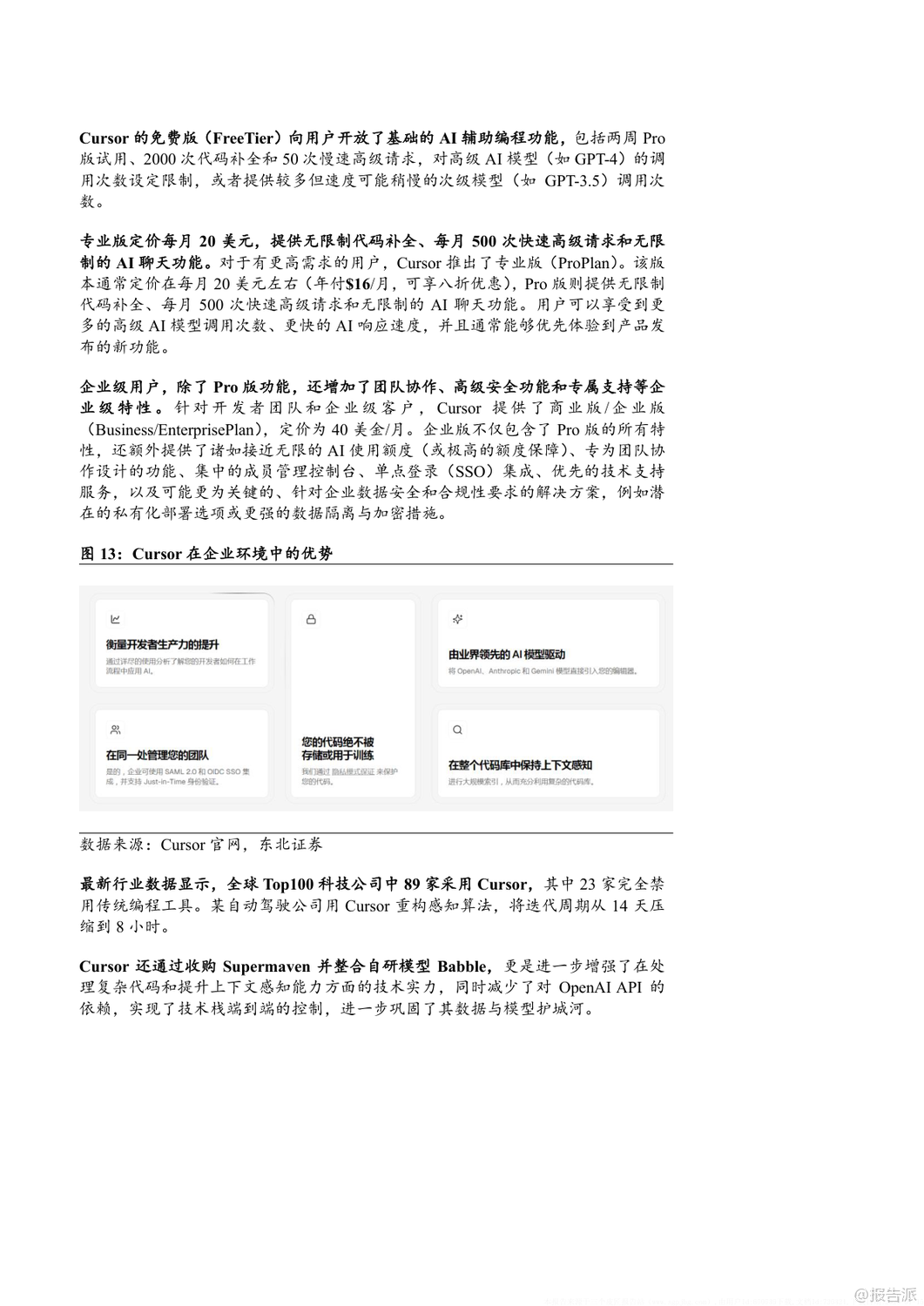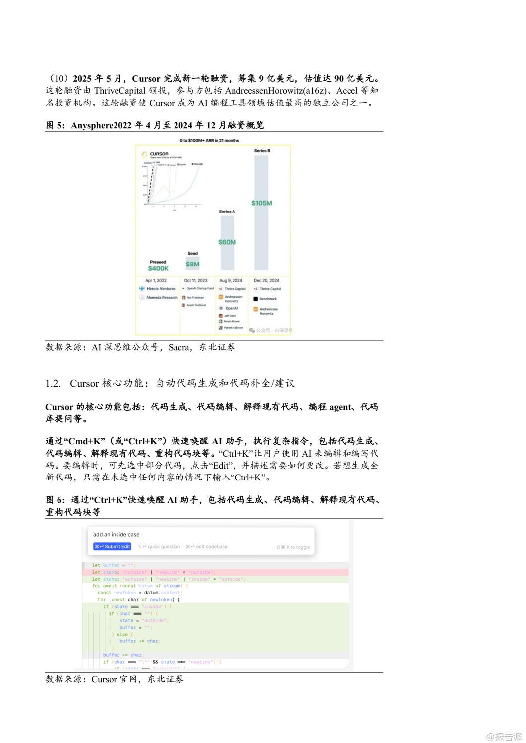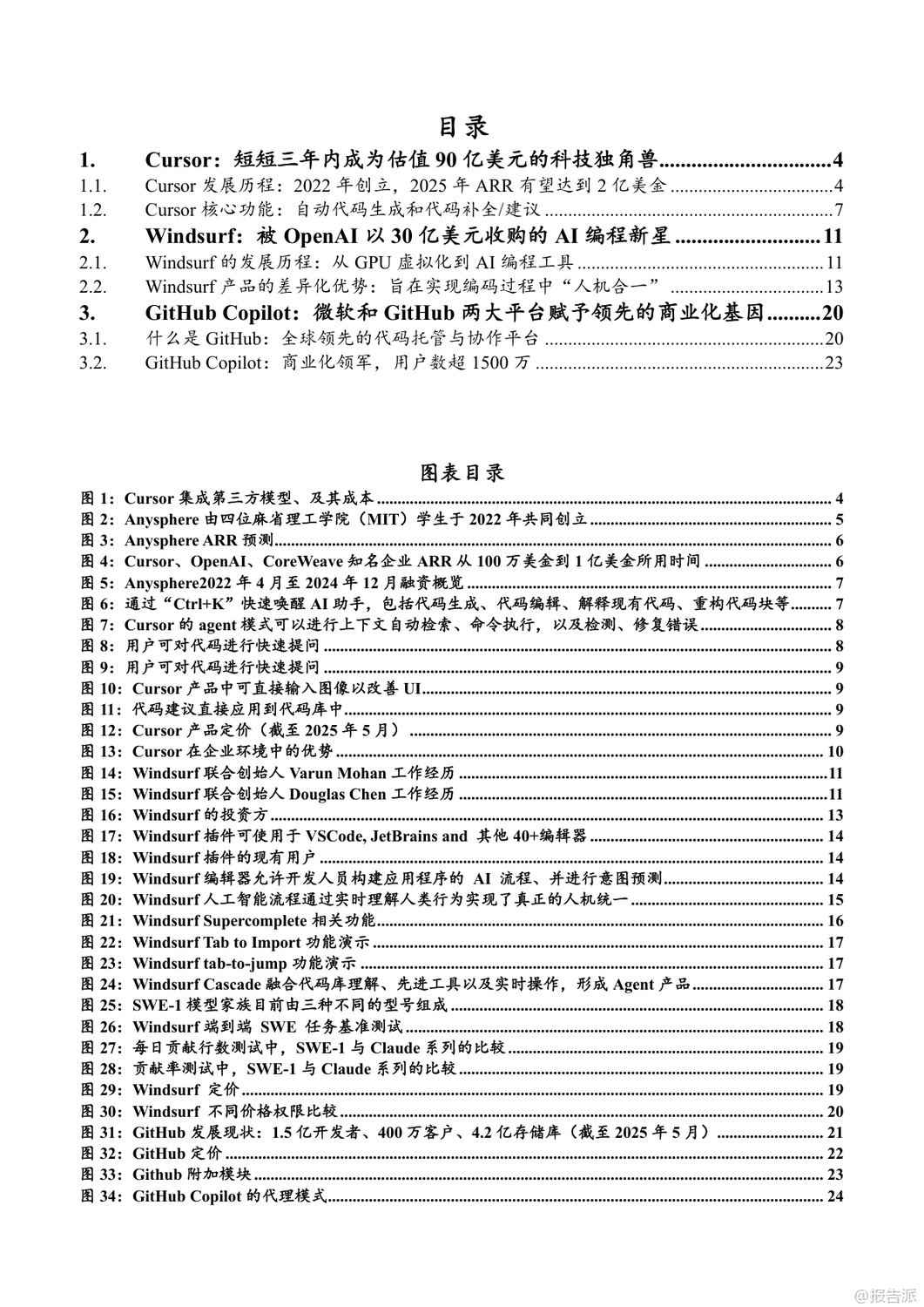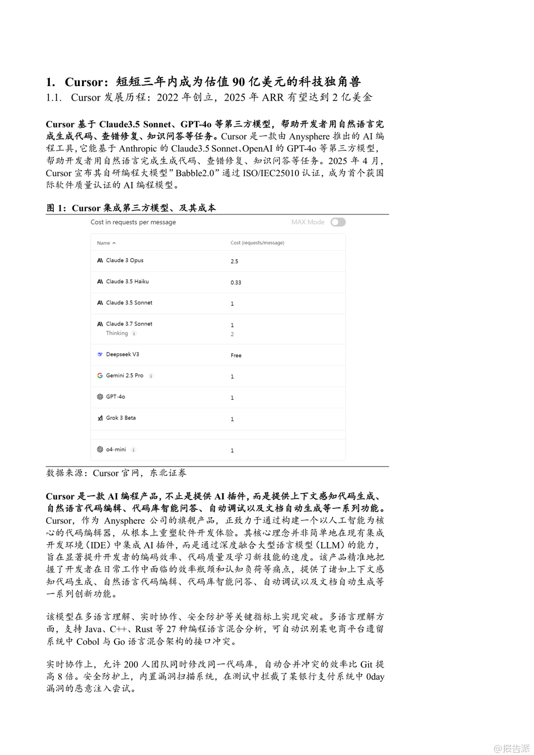 | 2025年,AI编程工具迎来爆发式增长,Cursor、Windsurf和GitHub Copilot三大平台引领行业发展。 Cursor由四位MIT学生于2022年创立,短短三年内估值飙升至90亿美元,成为全球AI编程领域估值最高的独立公司之一。 其核心产品Cursor集成Claude3.5 Sonnet、GPT-4o等大模型,提供代码生成、自然语言编辑、自动调试、代码库问答等功能,并通过“Ctrl+K”快捷指令实现高效交互。 2025年4月,Cursor自研模型Babble2.0获ISO/IEC25010国际认证,成为首个通过软件质量认证的AI编程模型。 截至2025年5月,Cursor年化经常性收入(ARR)已达2亿美元,用户覆盖全球Top100科技公司中的89家,其中23家已全面替代传统开发工具。 Windsurf原名Exafunction,2021年由Varun Mohan与Douglas Chen创立,初期聚焦GPU虚拟化,后转型为AI编程助手Codeium,2024年推出专属AI原生IDE并更名为Windsurf。 2025年5月,OpenAI以30亿美元收购该公司,创下其历史上最大规模并购。 Windsurf的核心优势在于“人机合一”的设计理念,通过Supercomplete、Tab-to-Import、tab-to-jump等智能功能实现意图预测与无缝协作。 其AI Agent产品Cascade支持多文件编辑、终端集成与自动化调试,大幅提升开发效率。 2025年发布的SWE-1模型家族在端到端SWE任务测试中表现媲美顶级实验室模型,每日代码贡献率显著优于Claude系列。 Windsurf采用分层订阅制,免费版吸引用户,Pro与企业版实现商业化闭环。 GitHub Copilot背靠微软与GitHub庞大生态,已成为商业化最成功的AI编程工具。 截至2025年4月,总用户数突破1500万,付费订阅用户超180万,企业客户达7.7万家。 其代理模式可执行多步骤编码任务,自动处理编译错误并迭代优化;“下次编辑建议”功能能预测用户下一步操作,提升编码连贯性。 Copilot支持Claude、GPT、Gemini等多模型切换,并为企业客户提供私有代码知识库接入能力。 GitHub Copilot Enterprise自2024年全面上线后,推动GitHub年化收入达20亿美元,贡献其收入增长的40%以上。 三者竞争格局清晰:Cursor以极致AI-first编辑器体验赢得开发者青睐;Windsurf凭借深度人机协同与OpenAI加持迈向全栈智能开发;GitHub Copilot则依托平台优势实现规模化落地。 未来,AI编程工具将从辅助编码向全流程自动化演进,重塑软件工程范式。 出品方:东北证券 发布时间:2025年