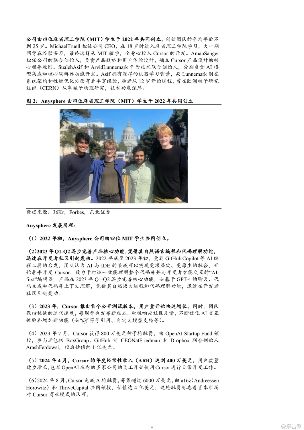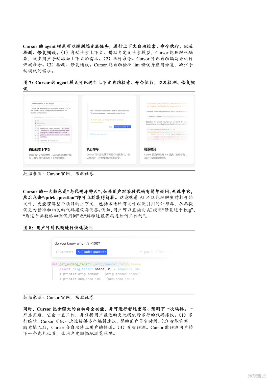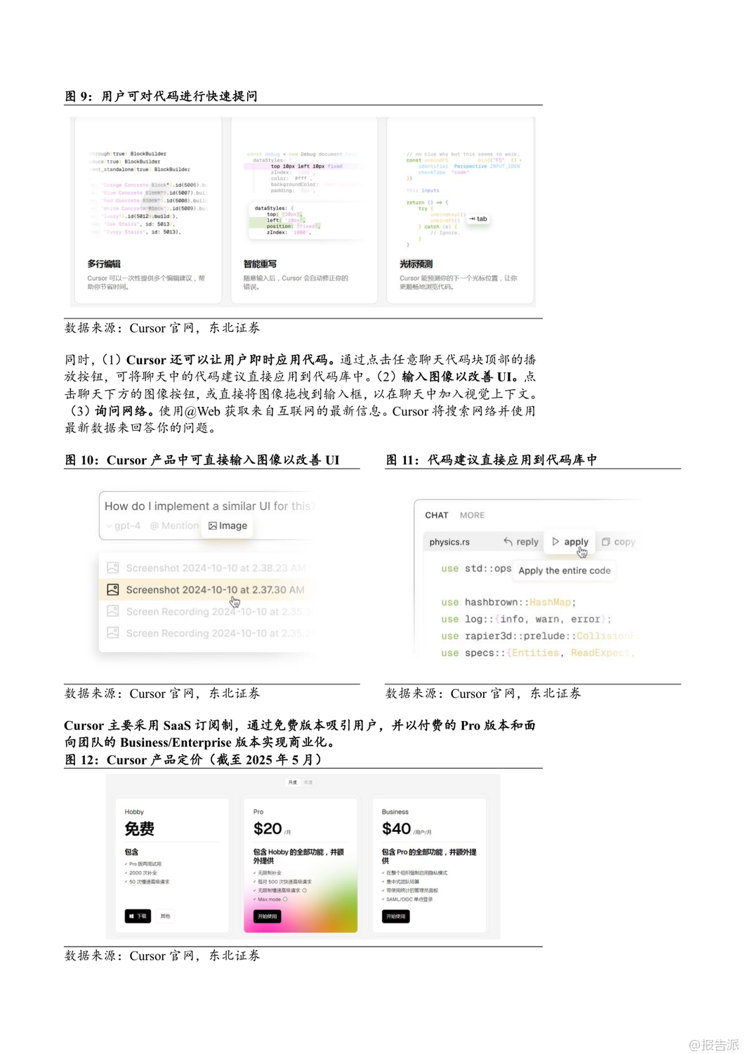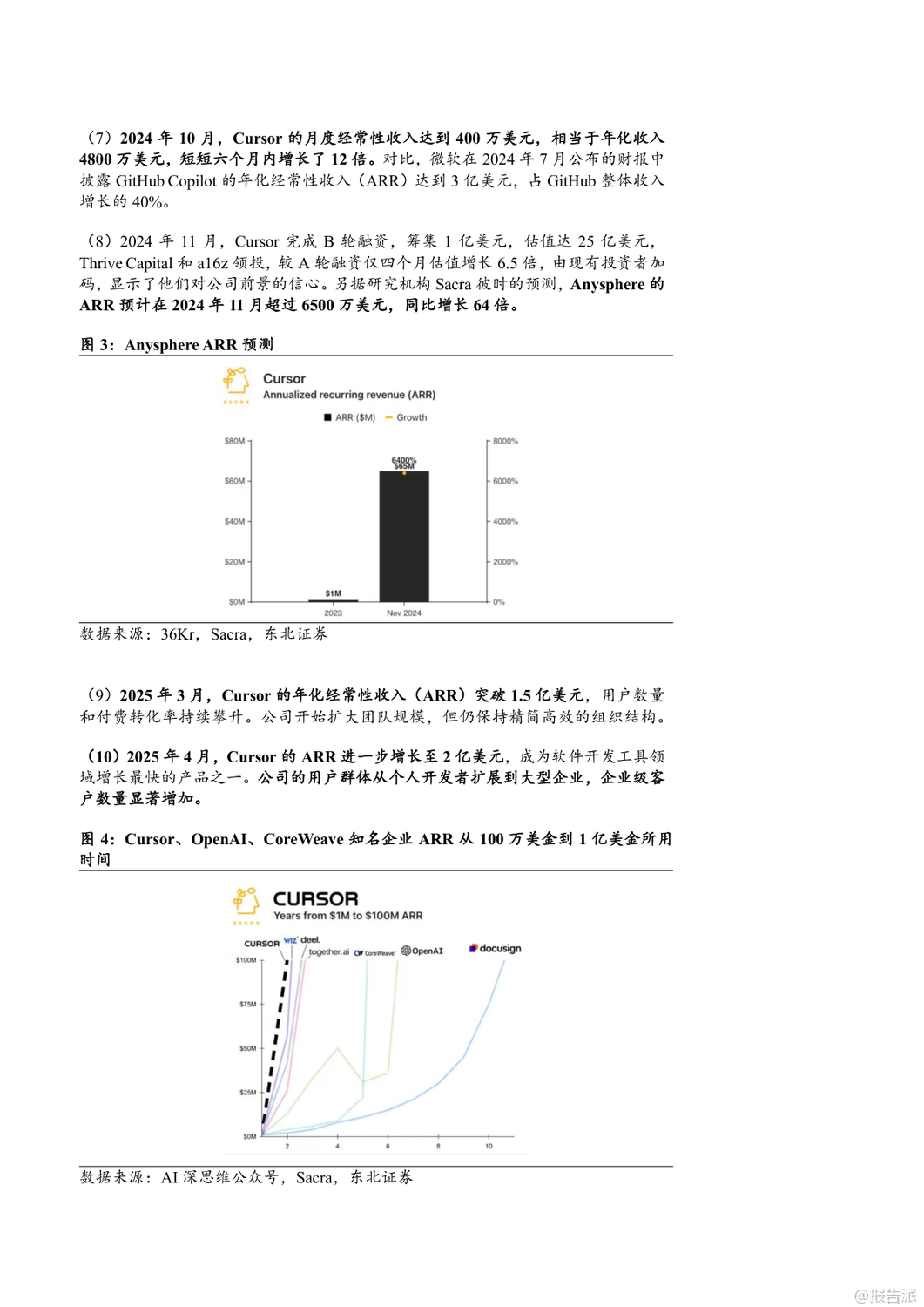 | 2025年,AI编程工具迎来爆发式增长,Cursor、Windsurf和GitHub Copilot三大平台引领行业发展。 Cursor由四位MIT学生于2022年创立,短短三年内估值飙升至90亿美元,成为全球AI编程领域估值最高的独立公司之一。 其核心产品Cursor集成Claude3.5 Sonnet、GPT-4o等大模型,提供代码生成、自然语言编辑、自动调试、代码库问答等功能,并通过“Ctrl+K”快捷指令实现高效交互。 2025年4月,Cursor自研模型Babble2.0获ISO/IEC25010国际认证,成为首个通过软件质量认证的AI编程模型。 截至2025年5月,Cursor年化经常性收入(ARR)已达2亿美元,用户覆盖全球Top100科技公司中的89家,其中23家已全面替代传统开发工具。 Windsurf原名Exafunction,2021年由Varun Mohan与Douglas Chen创立,初期聚焦GPU虚拟化,后转型为AI编程助手Codeium,2024年推出专属AI原生IDE并更名为Windsurf。 2025年5月,OpenAI以30亿美元收购该公司,创下其历史上最大规模并购。 Windsurf的核心优势在于“人机合一”的设计理念,通过Supercomplete、Tab-to-Import、tab-to-jump等智能功能实现意图预测与无缝协作。 其AI Agent产品Cascade支持多文件编辑、终端集成与自动化调试,大幅提升开发效率。 2025年发布的SWE-1模型家族在端到端SWE任务测试中表现媲美顶级实验室模型,每日代码贡献率显著优于Claude系列。 Windsurf采用分层订阅制,免费版吸引用户,Pro与企业版实现商业化闭环。 GitHub Copilot背靠微软与GitHub庞大生态,已成为商业化最成功的AI编程工具。 截至2025年4月,总用户数突破1500万,付费订阅用户超180万,企业客户达7.7万家。 其代理模式可执行多步骤编码任务,自动处理编译错误并迭代优化;“下次编辑建议”功能能预测用户下一步操作,提升编码连贯性。 Copilot支持Claude、GPT、Gemini等多模型切换,并为企业客户提供私有代码知识库接入能力。 GitHub Copilot Enterprise自2024年全面上线后,推动GitHub年化收入达20亿美元,贡献其收入增长的40%以上。 三者竞争格局清晰:Cursor以极致AI-first编辑器体验赢得开发者青睐;Windsurf凭借深度人机协同与OpenAI加持迈向全栈智能开发;GitHub Copilot则依托平台优势实现规模化落地。 未来,AI编程工具将从辅助编码向全流程自动化演进,重塑软件工程范式。 出品方:东北证券 发布时间:2025年