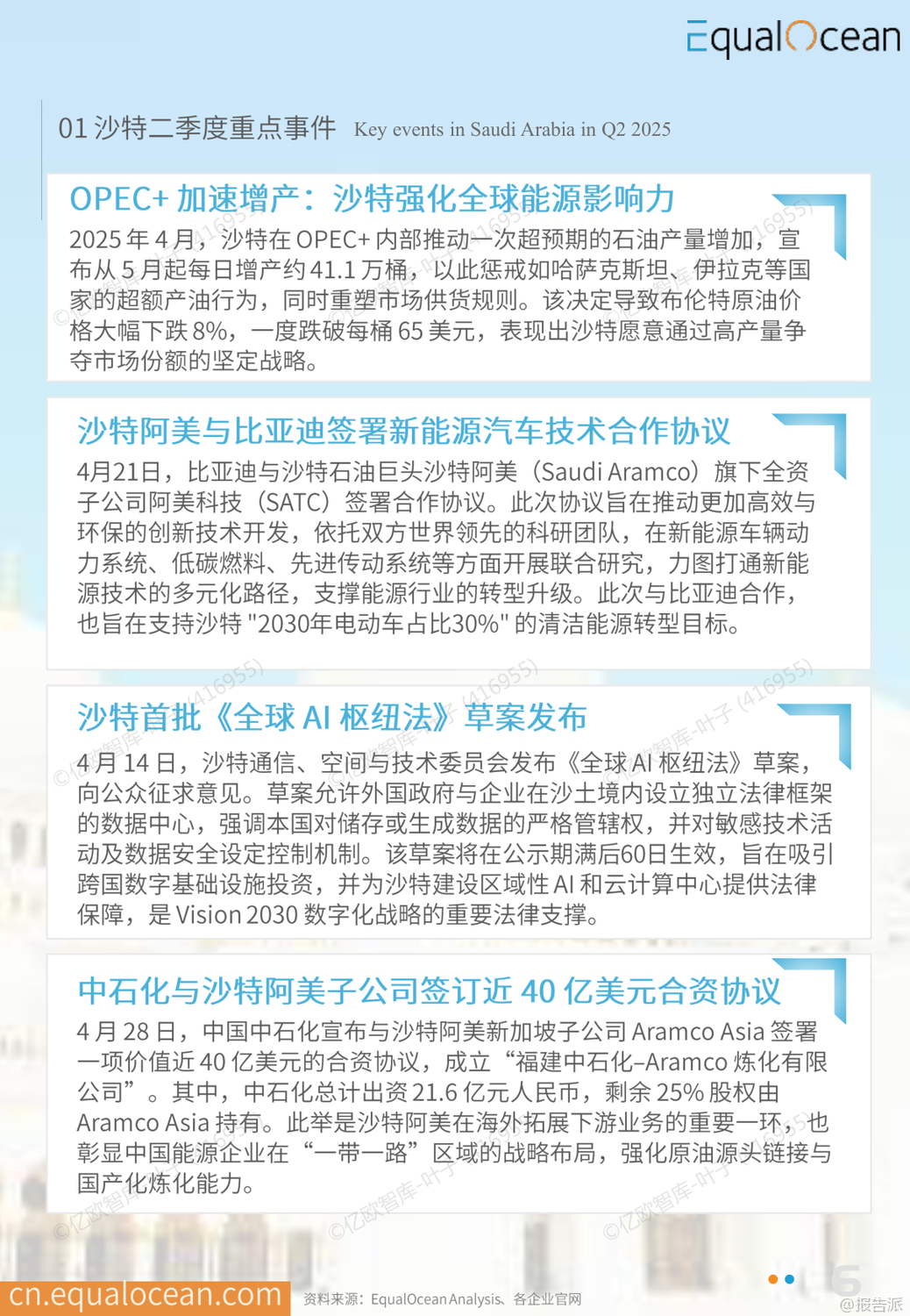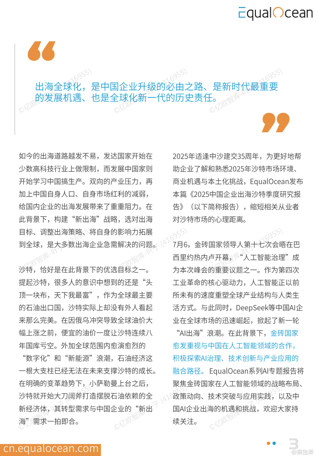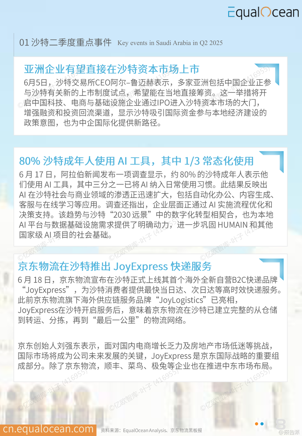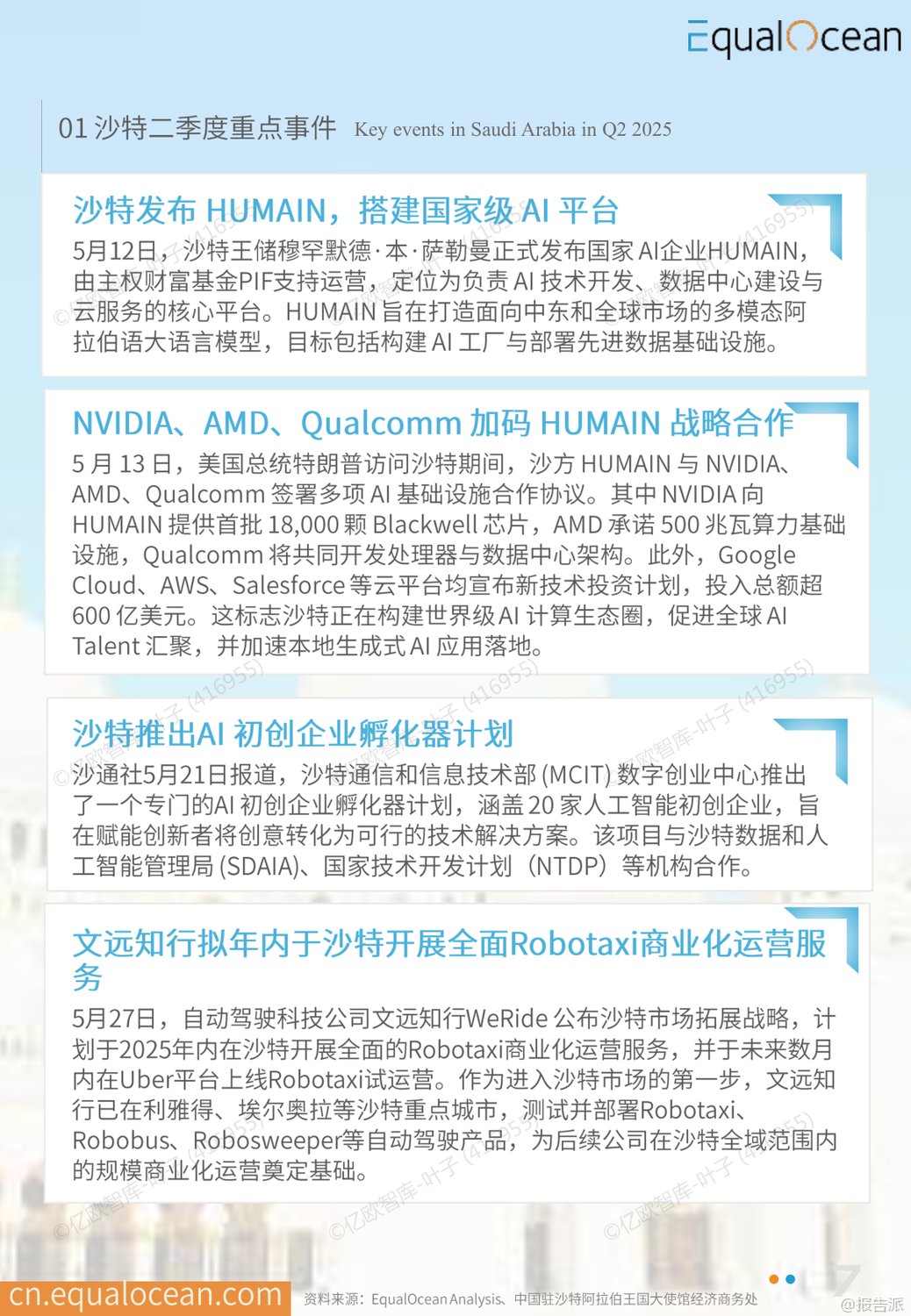 | 2025年第二季度,沙特在人工智能领域的战略布局全面提速,成为中国科技企业出海的重要目的地。 本报告由亿欧EqualOcean发布,深入剖析了沙特在AI基础设施、政策法规、市场需求及中企落地案例等方面的最新动态,揭示了中国企业在沙特AI赛道的机遇与挑战。 沙特正依托“2030愿景”推动经济多元化,AI成为其数字化转型的核心引擎。 2025年4月,沙特发布《全球AI枢纽法》草案,允许外国企业在境内设立独立法律框架的数据中心,并强调对数据的主权管辖,为跨国数字基础设施投资提供法律保障。 5月,沙特王储正式发布国家级AI企业HUMAIN,由主权财富基金PIF支持,目标是打造面向中东和全球市场的阿拉伯语大语言模型与AI云服务平台。 同期,HUMAIN与NVIDIA、AMD、Qualcomm等全球科技巨头达成战略合作,获得超18000颗Blackwell芯片、500兆瓦算力支持及处理器联合开发协议,谷歌云、AWS、Salesforce等也宣布合计超600亿美元的技术投资计划,标志着沙特正快速构建世界级AI计算生态圈。 在政策与资本双轮驱动下,沙特AI市场呈现“国家主导+全球协作”的格局。 政府通过SDAIA(沙特数据与人工智能管理局)、PIF等机构统筹资源,推动AI在金融、医疗、交通、政务等领域的落地。 调查显示,80%的沙特成年人已使用AI工具,其中三分之一常态化使用,反映出AI在社会层面的快速渗透。 与此同时,沙特对数据本地化、宗教文化适配和合规要求极为严格。 企业需遵守《个人数据保护法》(PDPL),敏感数据必须本地存储,跨境传输受限;产品需支持阿拉伯语右向左排版、符合伊斯兰价值观,并通过NCA安全认证。 中国科技企业正积极抢占沙特AI市场先机。 文远知行计划2025年内在沙特开展Robotaxi全面商业化运营,并已在利雅得、埃尔奥拉等地测试自动驾驶产品,未来将接入Uber平台。 森亿智能联合本地医疗集团启动全球首个全流程AI诊所“Doctor Hua”,覆盖33种呼吸科常见病,通过四大智能体实现问诊、诊断、处方与质控闭环,显著提升基层医疗效率。 京东物流则推出JoyExpress自营快递服务,构建覆盖仓储、分拣到末端的完整物流网络。 综合来看,沙特AI市场潜力巨大,政府支持力度空前,但合规门槛高、文化差异显著。 对中国企业而言,成功出海的关键在于:深度本地化——包括语言、数据、团队和文化;与主权基金和本地龙头企业合作,借力政策资源;聚焦高价值场景如智慧城市、智能交通与数字医疗,打造可复制的商业模式。 沙特不仅是能源大国,更正在成为中东AI新高地,值得中国科技企业长期战略布局。 出品方:亿欧 发布时间:2025年 文档页数:49页