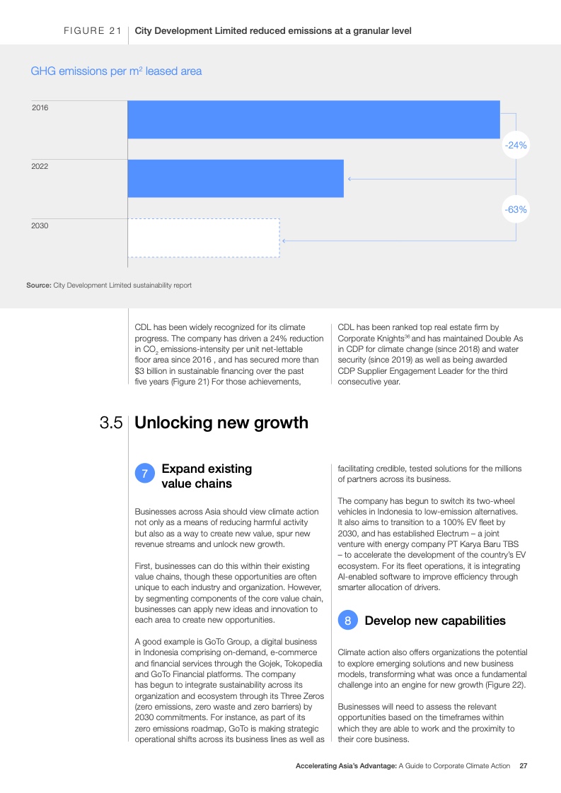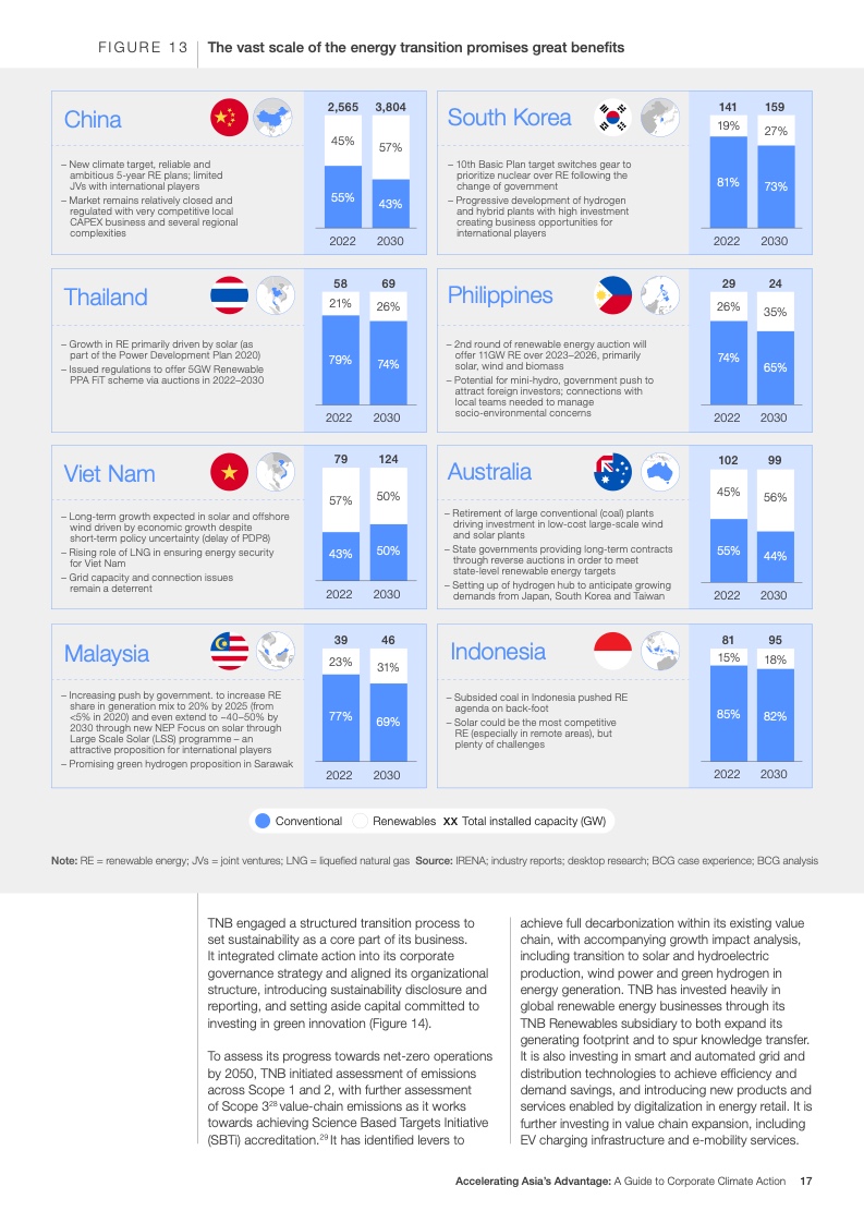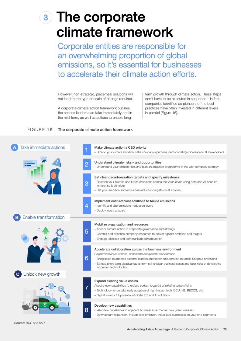 世界经济论坛与波士顿咨询公司(BCG)和思爱普公司(SAP)合作编写的白皮书《加速亚洲优势:企业气候行动指南》就探讨了这一关键的变革需求以及亚洲整个地区可以释放的巨大商业利益。 亚洲人口现在占世界一半以上,其一次能源消耗也占全球一半以上。在过去的三十年间,这种人口变化非常重要,因为亚洲已经将经济雄心催化为加速增长。然而,亚洲富有活力的增长环境里并非没有挑战,因为其排放负担已经随着经济动能的增长而飙升。亚洲现在是温室气体排放的主要贡献者,占全球碳排放的51%。 亚洲在全球供应链中有着举足轻重的作用,这也反映了亚洲所面临的复杂经济平衡,这是一个错综复杂的区域间嵌入式排放网络。亚洲处于气候危机的中心。它既是全球经济增长最重要的引擎,也是最容易受到无节制排放增长影响的地区。 政府间气候变化专门委员会第六次评估报告明确指出,世界在达到至关重要的《巴黎协定》1.5°C升温目标上仍在艰难前行。如果不能实现该目标,将对亚洲产生十分极端的影响。研究显示,如果全球温度严重上升3.2°C,将使亚洲的国内生产总值(GDP)下降26%。东南亚的情况则更糟糕,预计国内生产总值将受到37%的打击。在经济因素之外,还将有深远的社会和健康影响。 解决这一气候挑战给亚洲带来了一个特别复杂的问题。亚洲是一个极其多样化的地区,这意味着要想实现平衡安全、可负担的和可持续的公正能源转型,就不会有一个放之四海而皆准的解决方案可以在所有国家推广。 国际能源署到2050年实现净零排放的可持续发展情景中,一半以上的减排量都将由亚洲来承担,但其中的机遇与挑战是相称的。 预计到2030年,扩大可再生能源,提高建筑、交通和农业的能效以及提高生产行业的循环性等活动将能释放10.1万亿美元的收入机会,其中亚洲将占43%(4.3万亿美元)。就业增长的前景同样引人注目。这些机会需要3.95亿个相应的工作岗位,而其中一半以上(58%)都将在亚洲。 风向已经愈发明晰。科学碳目标倡议(SBTi)指出,2019年时做出净零承诺的企业仅涵盖全球经济的16%,而今天这一数字已经达到了90%,反映出全球对解决气候变化的态度发生了强有力的转变。 亚洲每个国家所面临的气候挑战都有细微且重要的差别。与此同时,企业所面临的复杂挑战也没有一个对策足以全面解决。企业必须根据最佳实践经验和对企业气候行动的深刻理解来确定和实施适应和减缓战略。 在亚洲,实施这些战略的挑战将更为艰巨,因为在有效实施的同时还须确保公正的能源转型,其中就包括公平和包容性行动,让当地的所有社区都参与进来。 这份白皮书认识到了这些复杂的挑战,并提出了一个新的“企业行动框架”,概述了在短期、中期乃至长期的最佳做法,以指导企业的战略旅程,无论其行业或规模如何。 该框架考虑到了企业立即采取行动的必要性,将全组织范围内的气候行动列为优先事项。另外,框架指出需要通过动员全组织上下并支持从生态系统到行动的变化来实现转型。最后,需要着眼于在现有的和新兴的价值链中释放新的增长动力,使全亚洲的企业都有能力在这一重要转型所能释放的数十亿美元价值中获得属于自己的份额。 这份新报告还提供了明确的案例研究,介绍有哪些亚洲企业正在关键行业中推动切实的气候成果,包括房地产、能源、交通和农业等。 报告已将证据列举清楚:气候变化如果不能缓解将是我们这一代人对企业、社区和国家所造成的最大威胁。企业在气候问题上的不作为会产生负面的商业影响,而及时的企业气候行动将产生巨大的增长机会。亚洲企业领导人是时候为了企业和地区的利益做出大胆改变了。 ┃ 免责声明:本文版权归原发布机构及作者,如涉及侵权请联系删除。本文仅供参考,如需使用相关信息请参阅报告原文。 ┃ 获取PDF完整版报告下载方式请关注:报告派 |