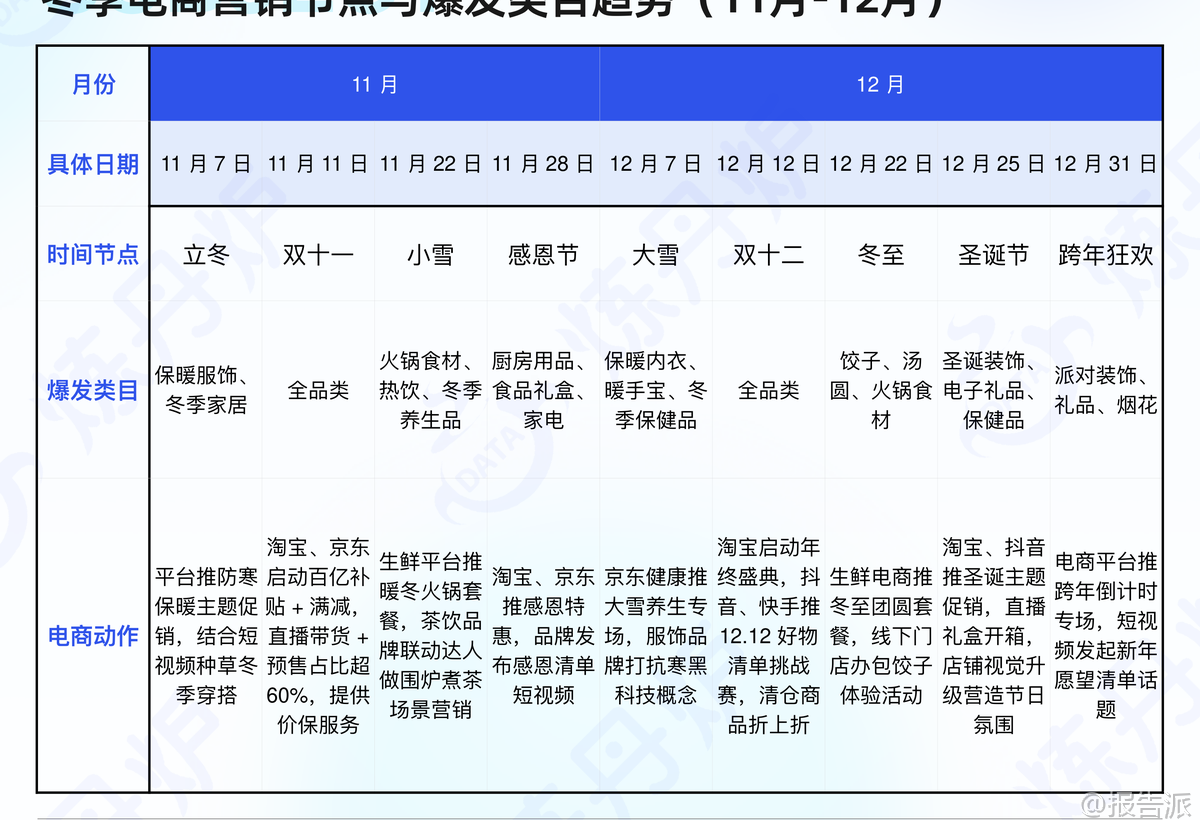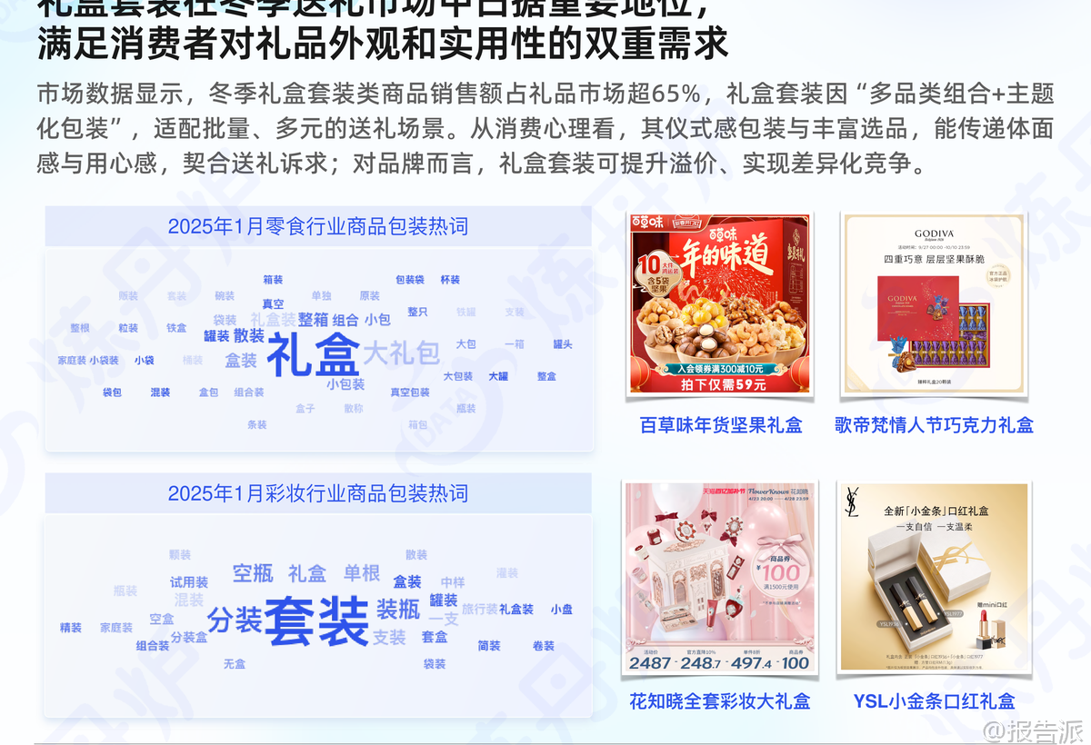 | 随着冬季来临,气温下降叠加节庆密集,消费市场迎来一年一度的“暖冬经济”高峰。 据炼丹炉大数据分析,2025年冬季(2024年11月至2025年2月)消费趋势呈现出节庆、暖冬、滋补、悦己等多维度协同发展的格局,多个消费场景交织共振,催生新一轮消费热潮。 从整体消费结构来看,冬季核心消费品类涵盖保暖服饰、家居用品、节庆礼品、滋补养生品及冬季护理产品等。 其中,宠物食品、床上用品、居家日用、零食坚果、女装、男装、童装及服饰配件等均呈现显著季节性增长。 尤其是在双十一、双十二、圣诞节、元旦、春节等多个电商大促与传统节日叠加背景下,礼赠经济成为冬季消费的重要驱动力。 节庆送礼需求旺盛,礼盒经济强势崛起。 数据显示,2025年冬季礼品市场销售额中,礼盒套装类商品占比超过65%。 消费者在选购礼品时,不仅关注实用性,更重视外观包装的精致度与仪式感。 “包装精美”“好看”“大气”等评价高频出现,反映出外观设计已成为影响购买决策的关键因素。 美容护肤礼盒、年货坚果礼盒、酒类礼盒、巧克力礼盒等成为热门选择,尤其是带有节日限定元素的产品备受青睐。 品牌纷纷推出新春限定款、圣诞盲盒、明星联名款、限量IP款等创新形式,借助“节日+流量+互动+稀缺性”的营销策略,强化情感连接与收藏价值,精准满足消费者对仪式感和惊喜感的需求。 与此同时,“暖冬经济”持续升温,取暖类家电与保暖用品迎来销售高峰。 生活电器行业在冬季达到全年销售额峰值,取暖器、暖手宝、电热毯、取暖桌等产品销量激增。 其中,桌面取暖器环比增长高达805.3%,油汀取暖器环比增长294.1%,水暖毯环比增长158.6%,显示出消费者对高效、便捷、全屋取暖解决方案的强烈需求。 消费者在选购取暖设备时,更加注重产品的实用性、操作便捷性以及节能性能,“加热快”“省电”“温度可调”等成为高频评价关键词。 市场也呈现多元化发展趋势,石墨烯加热、PTC陶瓷加热等新技术应用推动产品升级,取暖桌、电热饭盒、暖手杯等功能集成类产品受到欢迎,反映出消费需求正从单一取暖向多功能、场景化延伸。 冬季也是传统滋补养生的黄金期,养生消费呈现常态化与季节性叠加的特点。 阿胶膏方、石斛、驼奶、电子艾灸仪等传统与科技结合的滋补品同步增长,冲饮品、鲜食饮品等即食型养生产品热销,体现了“轻养生”“即食即补”的消费趋势。 不同年龄段人群展现出差异化的滋补偏好:18-23岁年轻群体偏好即食药膳零食和速溶养生茶,复购率高;24-30岁群体成为增长新引擎,男性关注体质调理,女性青睐“养生女孩”相关产品;31-40岁中青年主导家庭采购,注重科学背书与智能设备;41岁以上人群则聚焦慢性病管理和传统滋补品。 值得关注的是,“轻养生”概念在年轻群体中爆发式增长,小红书平台上“办公室养生”“日常养生”话题热度居高不下,五谷磨房八珍粉、江中猴姑米稀、宁之春枸杞原浆等产品广受欢迎,反映出碎片化、场景化的健康管理方式正在兴起。 护肤作为冬季刚需,同样迎来销售旺季。 受气候干燥影响,面部护理套装、面霜、精华等保湿修护类产品成为市场主导,身体护理品类增速显著提升,颈部护理、T区护理等细分领域也逐步受到关注。 干皮与敏感肌是秋冬护肤的核心人群,推动薇诺娜、可复美、珂润、科颜氏等主打舒缓保湿的品牌热销。 消费者对成分功效的关注度持续上升,“玻尿酸”“凡士林”“烟酰胺”等滋润修护成分备受青睐,成分党趋势明显。 在品牌竞争方面,雅诗兰黛凭借高端定位与强功效产品领跑市场,玉兰油、适乐肤、丝塔芙等品牌紧随其后,市场竞争呈现差异化、多元化格局。 此外,冰雪经济在政策支持与大众热情双重推动下快速发展。 继2022年北京冬奥会后,2024年滑雪运动再度“翻红”,线上销量与销售额创下新高。 滑雪服饰与装备仍是主流品类,但护脸头套、防冻贴等细分防护产品增速亮眼,反映出行者对精细化防护的需求提升。 滑雪客群以26-30岁高学历、高收入的年轻人为主,年参与冰雪旅游1-2次的比例高达57%,装备投入普遍较高。 值得注意的是,儿童滑雪市场潜力巨大,销售额增速远超均值,亲子滑雪盛行、素质教育重视及适龄产品增多共同推动该赛道成为未来增长亮点。 消费者对滑雪装备的需求已从基础功能满足转向“体验+理性价值”的综合考量,强调保暖、透气、轻便、实用的平衡,同时对性价比与品质匹配度提出更高要求。 综上所述,2025年冬季消费市场呈现出多场景融合、多层次升级的特征。 节庆驱动礼赠经济,气候催生暖冬需求,健康意识推动滋补养生,自我关怀带动悦己消费,政策与兴趣激活冰雪经济。 企业需把握时间节点,围绕“仪式感”“实用性”“科技感”“情感价值”等核心要素,优化产品设计、包装体验与营销策略,才能在激烈的冬季消费竞争中脱颖而出。 本文由【报告派】研读,输出观点仅作为行业分析! 原文标题:2025-10-17-炼丹炉-消费行业:冬季消费爆点预测 发布时间:2025年 出品方:炼丹炉
