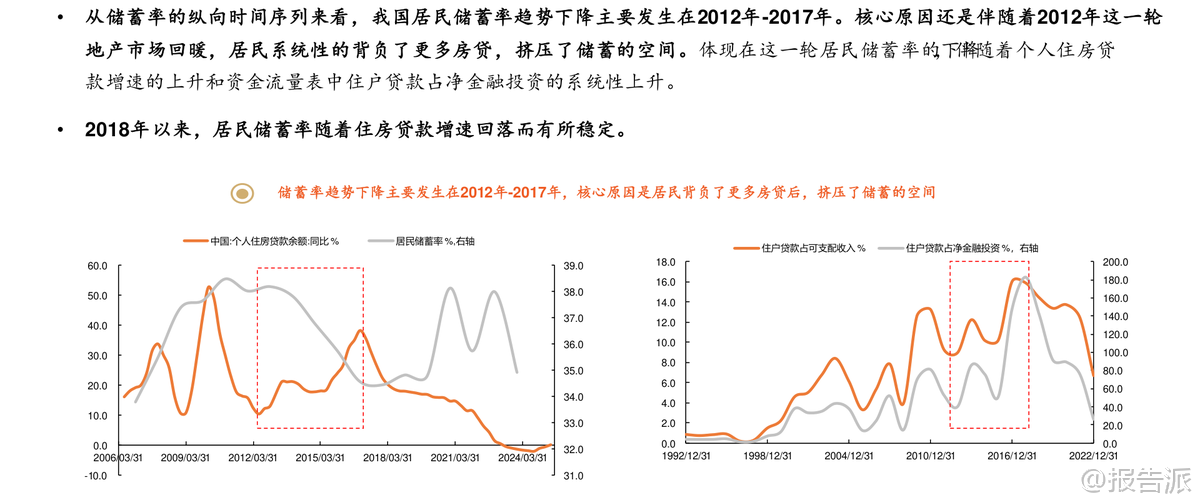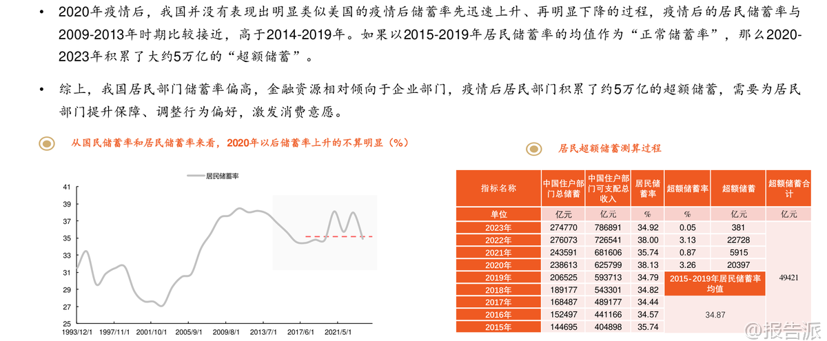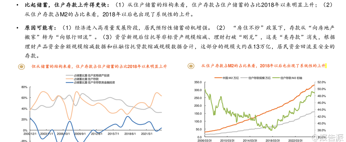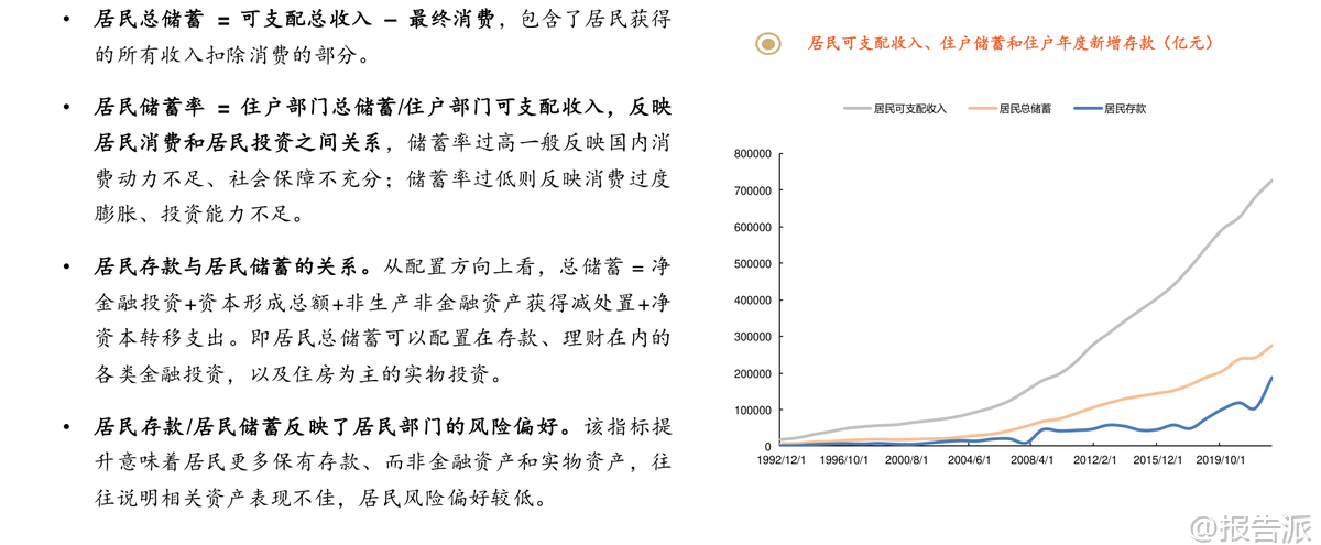 | 这篇由平安证券发布的《详解居民“超额储蓄”、“超额存款”和“存款搬家”》深度报告,系统梳理了我国居民储蓄行为的结构性变化及其潜在影响。 报告首先厘清了三个关键概念:居民总储蓄是指可支配收入减去最终消费,涵盖存款、理财、房产等各类资产配置;居民储蓄率则是储蓄占可支配收入的比例,反映消费与投资的平衡关系;而“超额储蓄”并非官方统计口径,而是经济学上的一个概念,指特殊时期(如疫情)实际储蓄超出正常预期的部分。 从横向对比看,中国的储蓄率在全球处于较高水平。 纵向来看,居民储蓄率在2012年至2017年间出现明显下滑,主因是房地产升温导致居民房贷负担加重,挤压了储蓄空间。 2018年后储蓄率趋于稳定,而2020年疫情以来虽未出现剧烈波动,但整体储蓄倾向略有上升。 若以2015-2019年储蓄率均值为基准,测算显示2020-2023年我国累计形成约5万亿元的“超额储蓄”。 更值得关注的是,“超额存款”的规模远大于“超额储蓄”。 数据显示,自2018年起,住户存款占居民总储蓄的比重以及住户存款占M2的比重均呈现系统性上升。 这背后有多重动因:一是经济进入高质量发展阶段,居民预防性储蓄动机增强;二是“房住不炒”政策下,资金从房地产转向银行存款;三是资管新规落地后,信托、非标等“类存款”资产萎缩,约13万亿元资金回流至安全性更高的银行存款。 综合两种测算方法——基于增量存款/GDP偏离历史均值、以及存量存款/M2占比偏离2018年基准——扣除“类存款”转移因素后,当前我国居民“超额存款”规模约为17-20万亿元,显著高于5万亿元的超额储蓄,说明居民风险偏好明显下降,资金更多沉淀于银行体系。 报告进一步复盘了2008年以来五轮可能的“存款搬家”现象,即居民存款从银行流向股市或理财市场。 典型阶段包括2009年、2012年末至2016年初、2017年下半年至2018年初、2019年下半年至2020年4月,以及2024年9月至今。 其中,多数存款搬家都伴随资本市场回暖,尤其是股市上涨或理财收益率显著高于存款利率时。 例如2012-2015年理财爆发式增长,以及2017年货币基金利率上行,均吸引大量存款转移。 值得注意的是,2024年9月以来住户存款增速与M2增速之差收窄,并非源于居民存款减少,而是企业存款回升带动M2反弹所致,因此尚不构成典型的“存款搬家”。 当前是否已开启新一轮存款搬家?报告认为尚未实质性启动。 一方面,住户存款增速保持平稳,城镇储户调查显示储蓄意愿仍处高位;另一方面,居民存款正呈现“活化”趋势——2024年以来活期存款增速回升,定期化趋势放缓,叠加大型银行多次下调存款利率,居民配置更高收益资产的动力正在积累。 然而,当前理财与三年期存款的利差仅约80BP,权益市场虽有回暖但个人投资者新开户数未破年内高点,参与热情有限。 展望未来,报告指出存款搬家能否持续的关键在于可替代资产收益的可持续性。 建议关注四大信号:一是住户存款增速与M2增速的剪刀差变化;二是居民活期与定期存款增速之差,反映资金灵活化程度;三是股指上涨的延续性及上交所A股新增开户数,体现居民入市意愿;四是理财收益率与存款利率的利差及理财规模季节性变化。 若这些指标持续改善,叠加资本市场信心恢复,巨额超额存款有望逐步释放,为股市、债市及理财市场带来可观增量资金。 总体来看,我国居民部门积累了庞大的超额存款,反映出较强的防御性储蓄倾向。 虽然当前存款搬家尚未真正启动,但利率下行与资产荒背景下,资金活化趋势已现。 未来一旦风险资产回报稳定显现,或将触发新一轮温和而持久的资金再配置浪潮,对金融市场形成积极支撑。 本文由【报告派】研读,输出观点仅作为行业分析! 原文标题:2025-10-17-平安证券-平安证券-债券深度报告:详解居民“超额储蓄”、“超额存款”和“存款搬家” 发布时间:2025年 报告出品方:平安证券 文档页数:21页