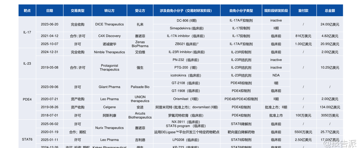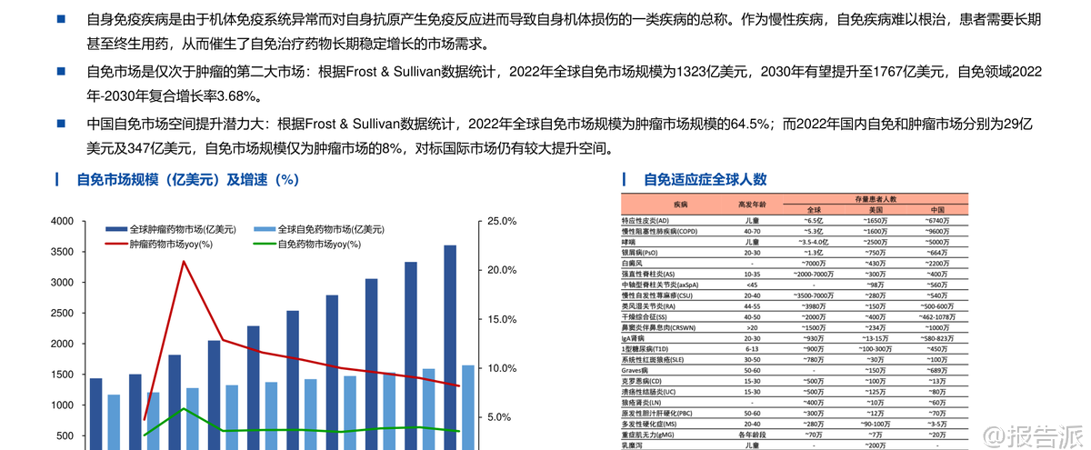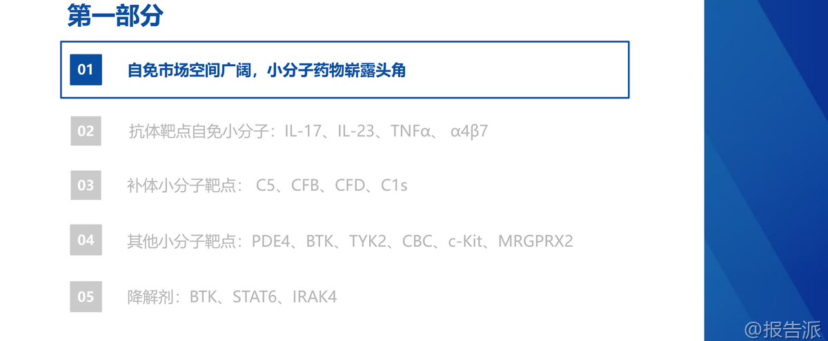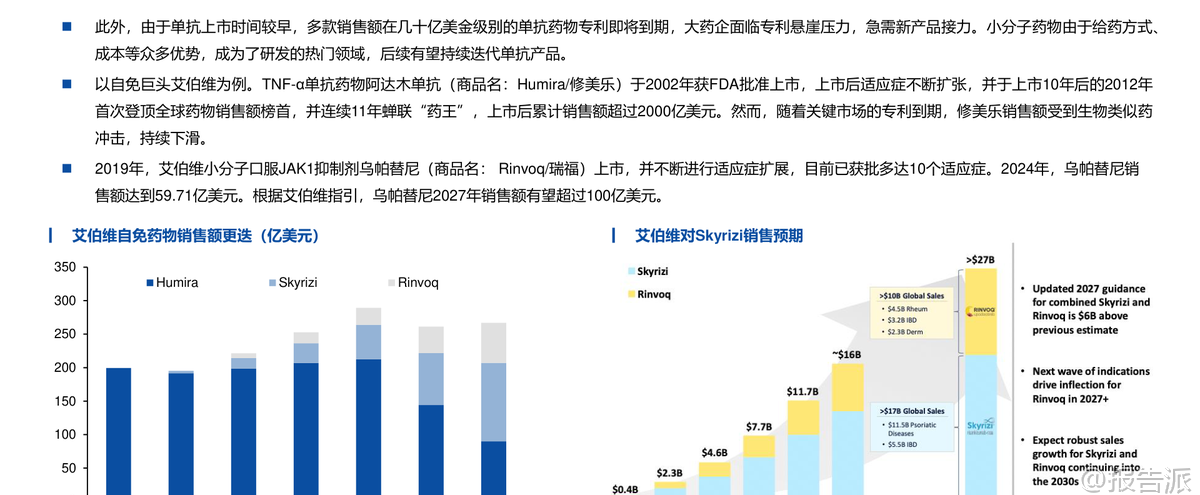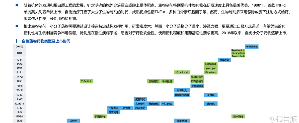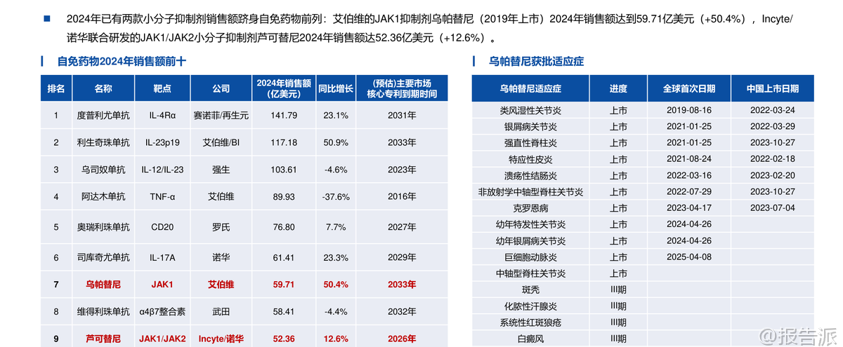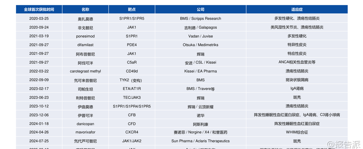 | 自身免疫疾病(简称“自免”)是一类因免疫系统异常攻击自身组织而导致慢性损伤的疾病,患者需长期甚至终身用药,形成了稳定且持续增长的药物市场。 根据Frost & Sullivan数据,2022年全球自免市场规模达1323亿美元,预计2030年将增至1767亿美元,复合增长率3.68%,仅次于肿瘤市场,成为全球第二大治疗领域。 相比之下,中国自免市场仅为29亿美元,仅占同期肿瘤市场的8%,远低于国际水平的64.5%,显示出巨大的增长潜力和市场空间。 长期以来,自免治疗以生物制剂为主导,尤其是靶向TNF-α、IL-17、IL-23等细胞因子的单克隆抗体药物。 这类药物疗效显著,但多依赖皮下或静脉注射,给药不便、依从性差、长期治疗负担重。 随着专利到期带来的“专利悬崖”,如艾伯维的“药王”修美乐(阿达木单抗)销售额持续下滑,大药企亟需新产品接棒。 在此背景下,**小分子口服药凭借其给药便利、生产成本低、易于联合用药等优势,正迅速崛起,重塑自免市场格局**。 近年来,小分子药物在自免领域的研发取得突破性进展。 2018年以来,多款小分子抑制剂陆续上市。 艾伯维的JAK1抑制剂乌帕替尼(Rinvoq)自2019年上市后,适应症不断扩展至类风湿关节炎、特应性皮炎、溃疡性结肠炎等10种以上,2024年销售额高达59.71亿美元,有望在2027年突破百亿美元,成为接替修美乐的核心产品。 另一款JAK抑制剂芦可替尼2024年销售额也达到52.36亿美元。 这两款药物已进入2024年自免药物销售额前十,标志着小分子口服药正式与传统单抗分庭抗礼。 小分子的研发热点主要集中在几大方向。 首先是针对传统抗体靶点开发口服替代品,如强生/Protagonist合作开发的口服IL-23R多肽抑制剂icotrokinra(JNJ-2113),已在银屑病III期临床中展现出媲美甚至优于现有口服药的疗效,并已向FDA提交NDA。 在补体系统领域,诺华的B因子抑制剂伊普可泮(Iptacopan)作为全球首款口服补体B因子抑制剂,已获批用于阵发性睡眠性血红蛋白尿症(PNH)、IgA肾病和C3肾小球病,2024年销售额达1.29亿美元,开辟了新的治疗路径。 此外,PDE4抑制剂阿普米司特年销售额超20亿美元,证明了口服小分子的巨大商业潜力。 更前沿的技术是**蛋白降解剂**(PROTAC),它能彻底降解靶蛋白而非简单抑制,理论上可作用于“不可成药”靶点。 Kymera与赛诺菲合作的IRAK4降解剂KT-485、STAT6降解剂KT-621,以及百济神州自主研发的IRAK4降解剂BGB-45035均已进入临床阶段,其中BGB-45035是全球首个进入II期的IRAK4降解剂,展现了中国企业在该领域的领先布局。 值得注意的是,尽管小分子前景广阔,但研发挑战依然巨大。 例如,赛诺菲的TNF-α小分子balinatunfib在银屑病单药治疗中失败;礼来的IL-17抑制剂DC-806因肝毒性被终止;Morphic的α4β7抑制剂MORF-057在UC IIb期试验中未达统计学显著性。 这些挫折凸显了小分子药物在安全性、选择性和疗效上的高门槛。 综合来看,自免口服药正处于快速发展期,正从JAK抑制剂的单一赛道,向IL-23、补体、TYK2、降解剂等多靶点、多层次发展。 未来,口服药有望凭借其便捷性和不断优化的疗效,在多个自免适应症中逐步替代或补充注射用生物制剂。 报告预测,若口服药市场份额在未来几年提升至15%-35%,其市场规模将达到265亿至618亿美元,潜力巨大。 国内企业如翰森制药、诺诚健华、歌礼制药、和美药业等在TYK2、IL-17、PDE4等靶点均有布局,值得关注。 本文由【报告派】研读,输出观点仅作为行业分析! 原文标题:原文标题:华创证券-医药行业创新药系列研究:自免口服药正重塑市场格局 发布时间:2025年 报告出品方:华创证券 文档页数:79页