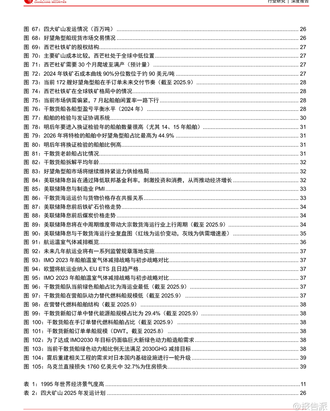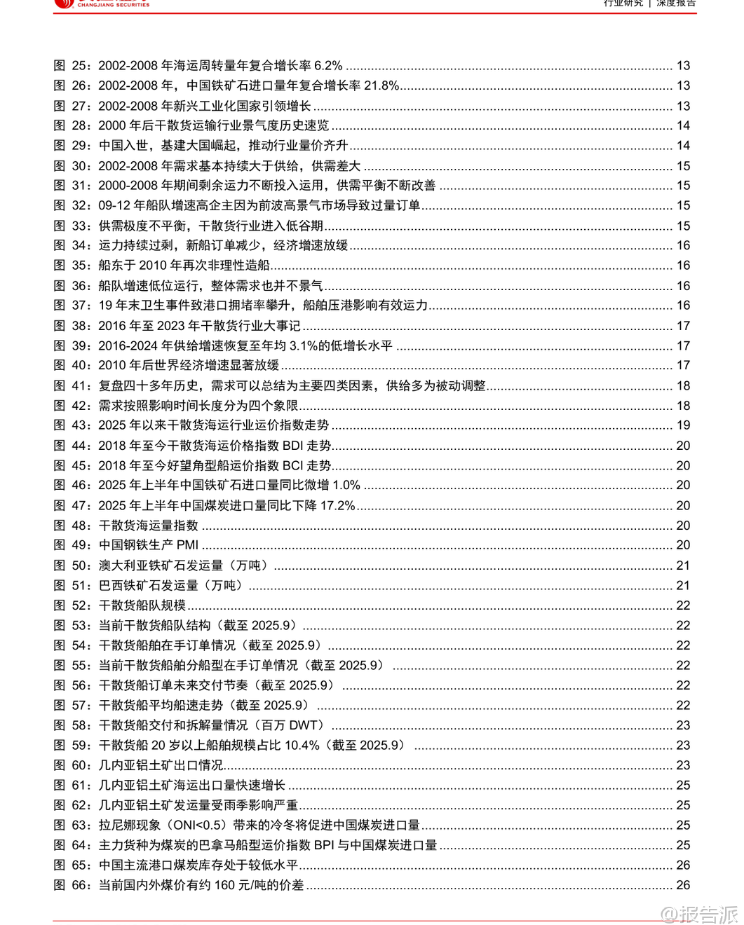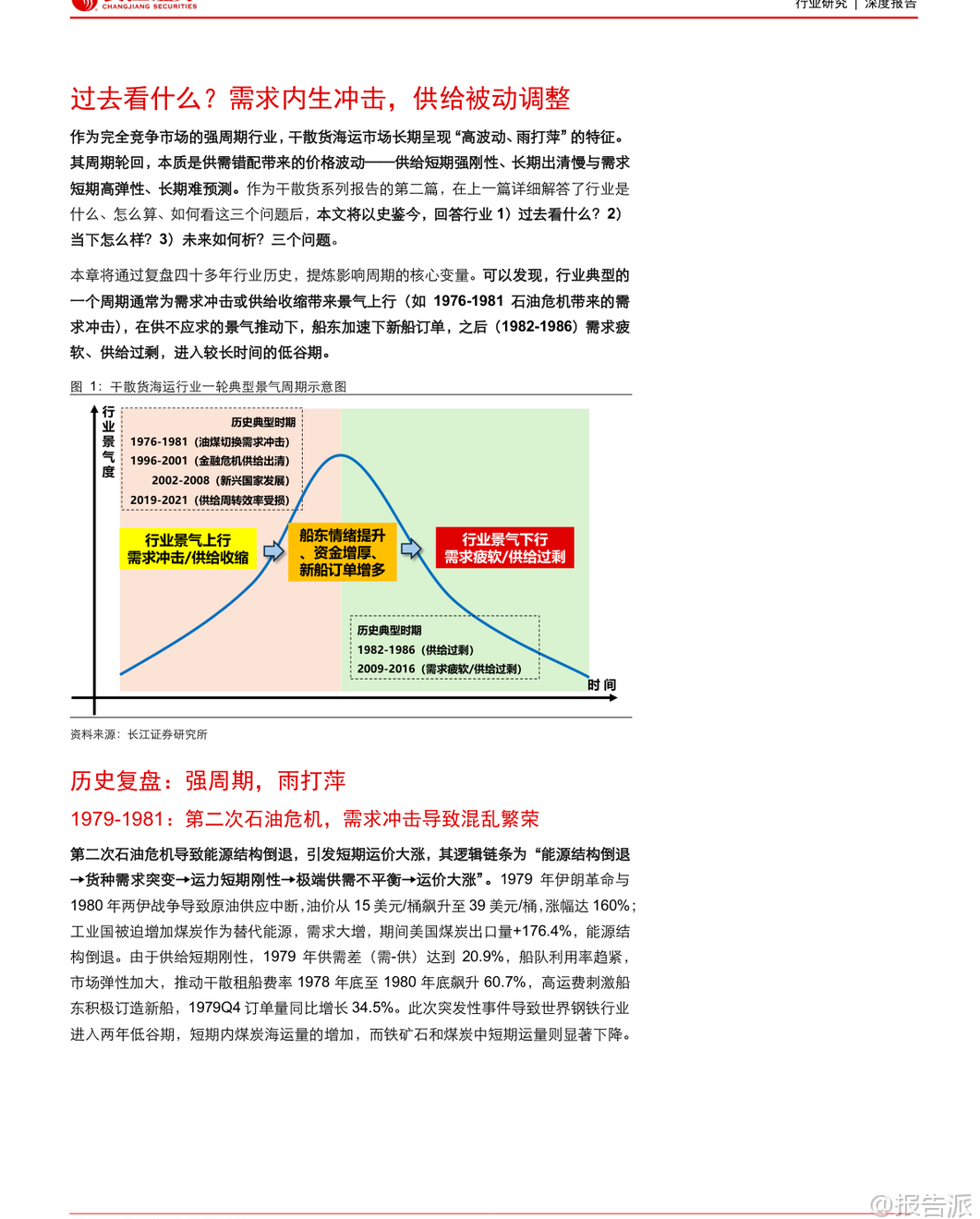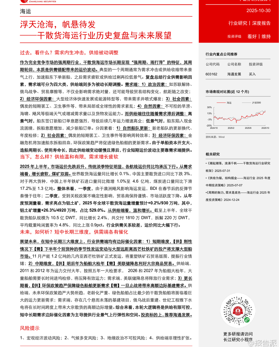 | 干散货海运行业作为全球大宗商品贸易的核心纽带,具有典型的强周期特征。 本报告通过历史复盘、现状分析与未来展望三个维度,系统梳理了行业运行逻辑,并指出当前正处于新一轮景气周期的酝酿期。 回顾过去四十多年的发展历程,干散货海运行业的周期本质是供需错配带来的运价波动。 典型周期往往由需求冲击或供给收缩启动,在高景气推动下船东积极下单新船,随后因需求疲软或供给过剩进入长期低谷。 历史上多次重大事件深刻影响了行业走势:1979年第二次石油危机引发能源替代,煤炭海运量激增带动运价短期暴涨;1997年亚洲金融危机导致船东现金流紧张,大量拆船形成供给收缩,助推2000年BDI指数大幅反弹;2002-2008年中国加入WTO后基建腾飞,铁矿石进口激增驱动长达六年的超级牛市;而2008年金融危机前的过度造船则埋下2009-2016年长期低迷的伏笔。 总结来看,需求端受政治、经济、社会和自然四大类因素驱动,具备短期高弹性;供给端则因造船周期长、船舶寿命久,调整缓慢且滞后,主要表现为被动响应。 进入2025年,行业整体呈现“供给温和、需求疲软”的格局。 上半年运价先跌后升,各航线同比承压下行。 需求方面,世界散货海运量仅同比增长0.1%,中国主要散货进口同比下降3%。 其中铁矿石进口微增1.0%,煤炭进口大幅下滑17.2%,煤矿双弱特征明显。 供给方面,全球干散货船队规模达10.5亿DWT,同比增长2.4%,交付1810万DWT,拆解220万DWT,平均载重吨闲置率4.8%,同比上升0.9个百分点。 整体供需关系偏弱,导致运价同比显著下行。 展望未来,行业将迎来短、中、长三个维度的边际催化,有望开启以需求为主导的上行周期。 短期看,季节性发运变动叠加西芒杜铁矿投产将提振市场情绪。 几内亚铝土矿出口持续增长,下半年铁矿石主流矿山加速出货,以及可能的拉尼娜现象带来的冷冬预期,均将支撑运力需求。 尤其值得关注的是,11月起产能达1.2亿吨/年的西芒杜铁矿正式发运,该矿品位高、成本低,且由中国资本主导开发,预计将重塑全球铁矿石贸易格局。 满产后每年可产生约150艘次好望角型船的运输需求,若全部替代澳洲进口,将为全球干散货海运量贡献近3%的增量。 中期维度,两大核心变量将发挥作用。 一是2026-2027年将迎来船舶大检年。 由于2011-2012年为运力交付高峰,按五年一次换证检验的要求,明后年将有大量船舶需进坞检修,每次耗时约1-2个月,预计将压降有效运力0.1%以上。 二是美联储开启降息周期。 历史数据显示,过去七轮降息中有五轮在1-2年内带动BDI指数反弹。 降息将降低融资成本、刺激投资消费,并通过美元贬值提升非美地区对大宗商品的进口意愿,从而释放大宗散货海运需求。 长期来看,供给端环保政策趋严将推动绿色船舶更新换代。 IMO设定2030年温室气体排放较2008年下降20%-30%的目标,欧盟已将航运纳入ETS碳交易体系,合规成本逐年上升。 目前干散货船队中绿色动力船舶占比不足5%,远低于达标要求,未来存在巨大的替换空间。 需求端则存在战后重建与世纪工程两大潜在增量。 乌克兰重建预计十年内拉动干散货海运需求年均增长2.7%;中国雅鲁藏布江下游水电站建设,总投资约1.2万亿元,预计将带来年均0.4%的海运需求增量。 综合判断,本轮周期的核心逻辑是“供给有限可控,需求提供上行弹性”。 在供给增速放缓、环保压力加大背景下,多重需求催化因素将共同推动行业景气度回升。 投资上推荐逐步向全干散货转型、具备业绩弹性的海通发展。 本文由【报告派】研读,输出观点仅作为行业分析! 原文标题:2025-10-30-长江证券-长江证券-干散货海运行业历史复盘与未来展望:浮天沧海,帆悬待发 发布时间:2025年 报告出品方:长江证券 文档页数:44页