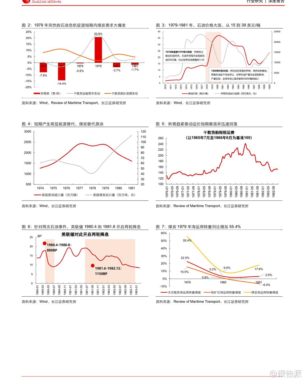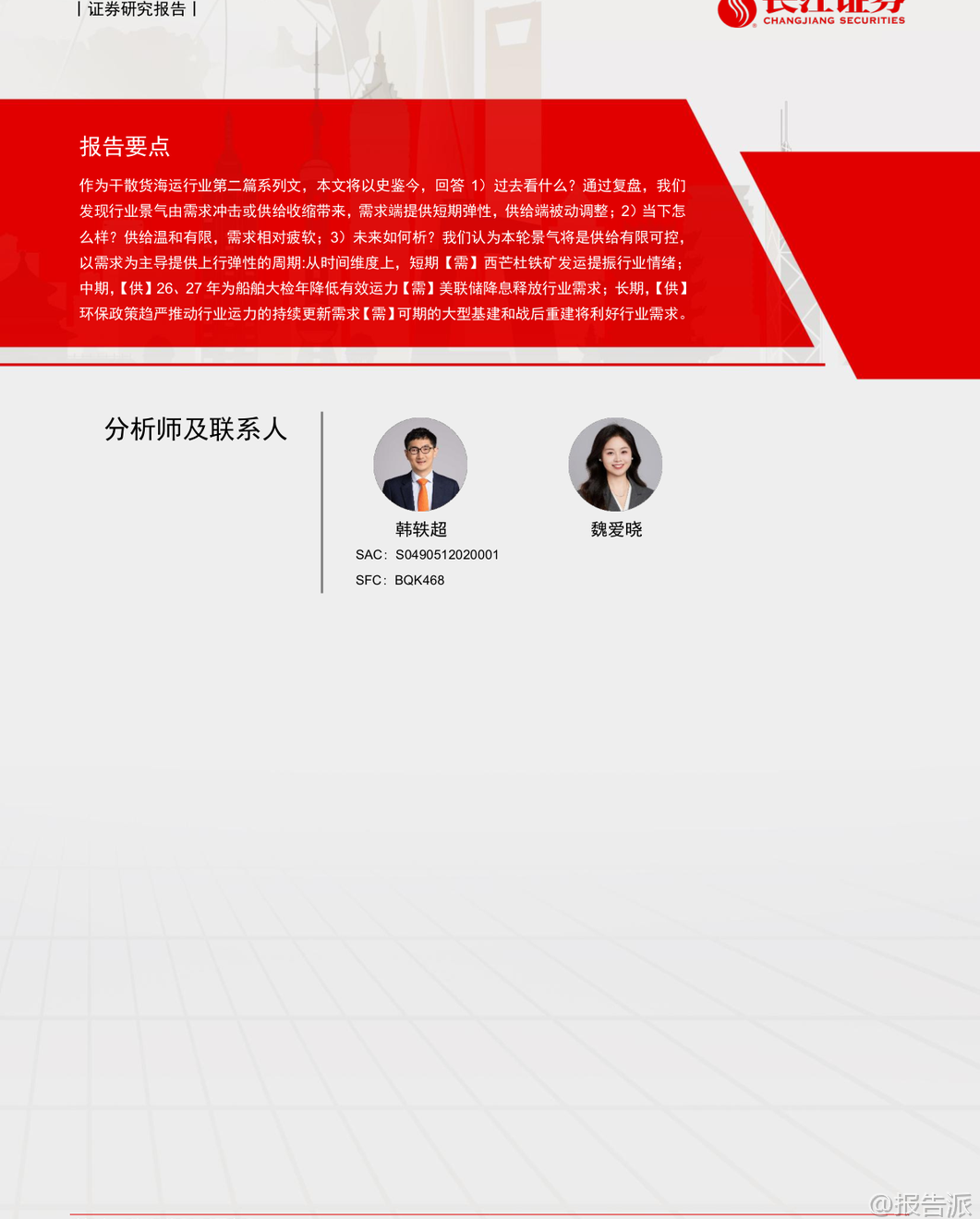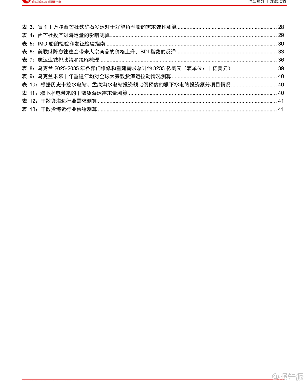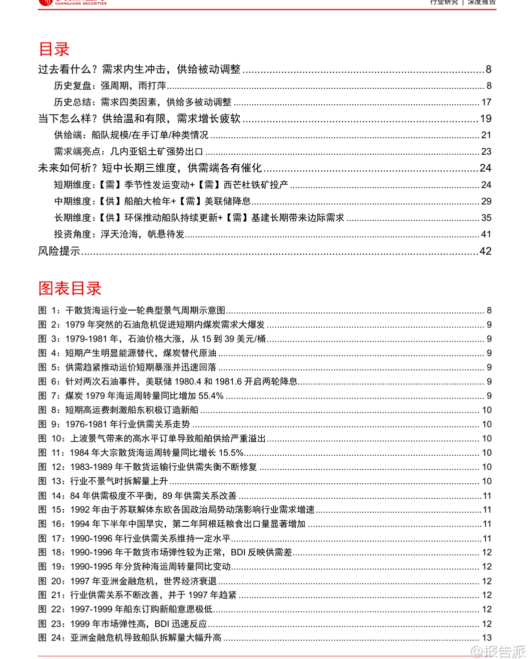 | 干散货海运行业作为全球大宗商品贸易的核心纽带,具有典型的强周期特征。 本报告通过历史复盘、现状分析与未来展望三个维度,系统梳理了行业运行逻辑,并指出当前正处于新一轮景气周期的酝酿期。 回顾过去四十多年的发展历程,干散货海运行业的周期本质是供需错配带来的运价波动。 典型周期往往由需求冲击或供给收缩启动,在高景气推动下船东积极下单新船,随后因需求疲软或供给过剩进入长期低谷。 历史上多次重大事件深刻影响了行业走势:1979年第二次石油危机引发能源替代,煤炭海运量激增带动运价短期暴涨;1997年亚洲金融危机导致船东现金流紧张,大量拆船形成供给收缩,助推2000年BDI指数大幅反弹;2002-2008年中国加入WTO后基建腾飞,铁矿石进口激增驱动长达六年的超级牛市;而2008年金融危机前的过度造船则埋下2009-2016年长期低迷的伏笔。 总结来看,需求端受政治、经济、社会和自然四大类因素驱动,具备短期高弹性;供给端则因造船周期长、船舶寿命久,调整缓慢且滞后,主要表现为被动响应。 进入2025年,行业整体呈现“供给温和、需求疲软”的格局。 上半年运价先跌后升,各航线同比承压下行。 需求方面,世界散货海运量仅同比增长0.1%,中国主要散货进口同比下降3%。 其中铁矿石进口微增1.0%,煤炭进口大幅下滑17.2%,煤矿双弱特征明显。 供给方面,全球干散货船队规模达10.5亿DWT,同比增长2.4%,交付1810万DWT,拆解220万DWT,平均载重吨闲置率4.8%,同比上升0.9个百分点。 整体供需关系偏弱,导致运价同比显著下行。 展望未来,行业将迎来短、中、长三个维度的边际催化,有望开启以需求为主导的上行周期。 短期看,季节性发运变动叠加西芒杜铁矿投产将提振市场情绪。 几内亚铝土矿出口持续增长,下半年铁矿石主流矿山加速出货,以及可能的拉尼娜现象带来的冷冬预期,均将支撑运力需求。 尤其值得关注的是,11月起产能达1.2亿吨/年的西芒杜铁矿正式发运,该矿品位高、成本低,且由中国资本主导开发,预计将重塑全球铁矿石贸易格局。 满产后每年可产生约150艘次好望角型船的运输需求,若全部替代澳洲进口,将为全球干散货海运量贡献近3%的增量。 中期维度,两大核心变量将发挥作用。 一是2026-2027年将迎来船舶大检年。 由于2011-2012年为运力交付高峰,按五年一次换证检验的要求,明后年将有大量船舶需进坞检修,每次耗时约1-2个月,预计将压降有效运力0.1%以上。 二是美联储开启降息周期。 历史数据显示,过去七轮降息中有五轮在1-2年内带动BDI指数反弹。 降息将降低融资成本、刺激投资消费,并通过美元贬值提升非美地区对大宗商品的进口意愿,从而释放大宗散货海运需求。 长期来看,供给端环保政策趋严将推动绿色船舶更新换代。 IMO设定2030年温室气体排放较2008年下降20%-30%的目标,欧盟已将航运纳入ETS碳交易体系,合规成本逐年上升。 目前干散货船队中绿色动力船舶占比不足5%,远低于达标要求,未来存在巨大的替换空间。 需求端则存在战后重建与世纪工程两大潜在增量。 乌克兰重建预计十年内拉动干散货海运需求年均增长2.7%;中国雅鲁藏布江下游水电站建设,总投资约1.2万亿元,预计将带来年均0.4%的海运需求增量。 综合判断,本轮周期的核心逻辑是“供给有限可控,需求提供上行弹性”。 在供给增速放缓、环保压力加大背景下,多重需求催化因素将共同推动行业景气度回升。 投资上推荐逐步向全干散货转型、具备业绩弹性的海通发展。 本文由【报告派】研读,输出观点仅作为行业分析! 原文标题:2025-10-30-长江证券-长江证券-干散货海运行业历史复盘与未来展望:浮天沧海,帆悬待发 发布时间:2025年 报告出品方:长江证券 文档页数:44页