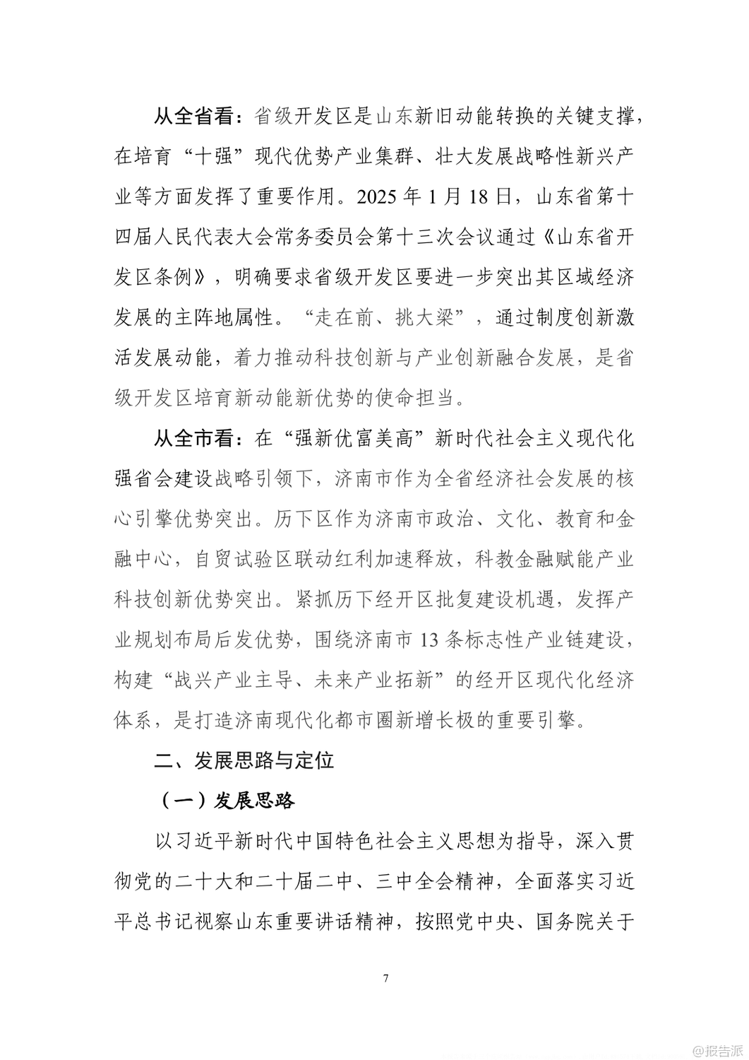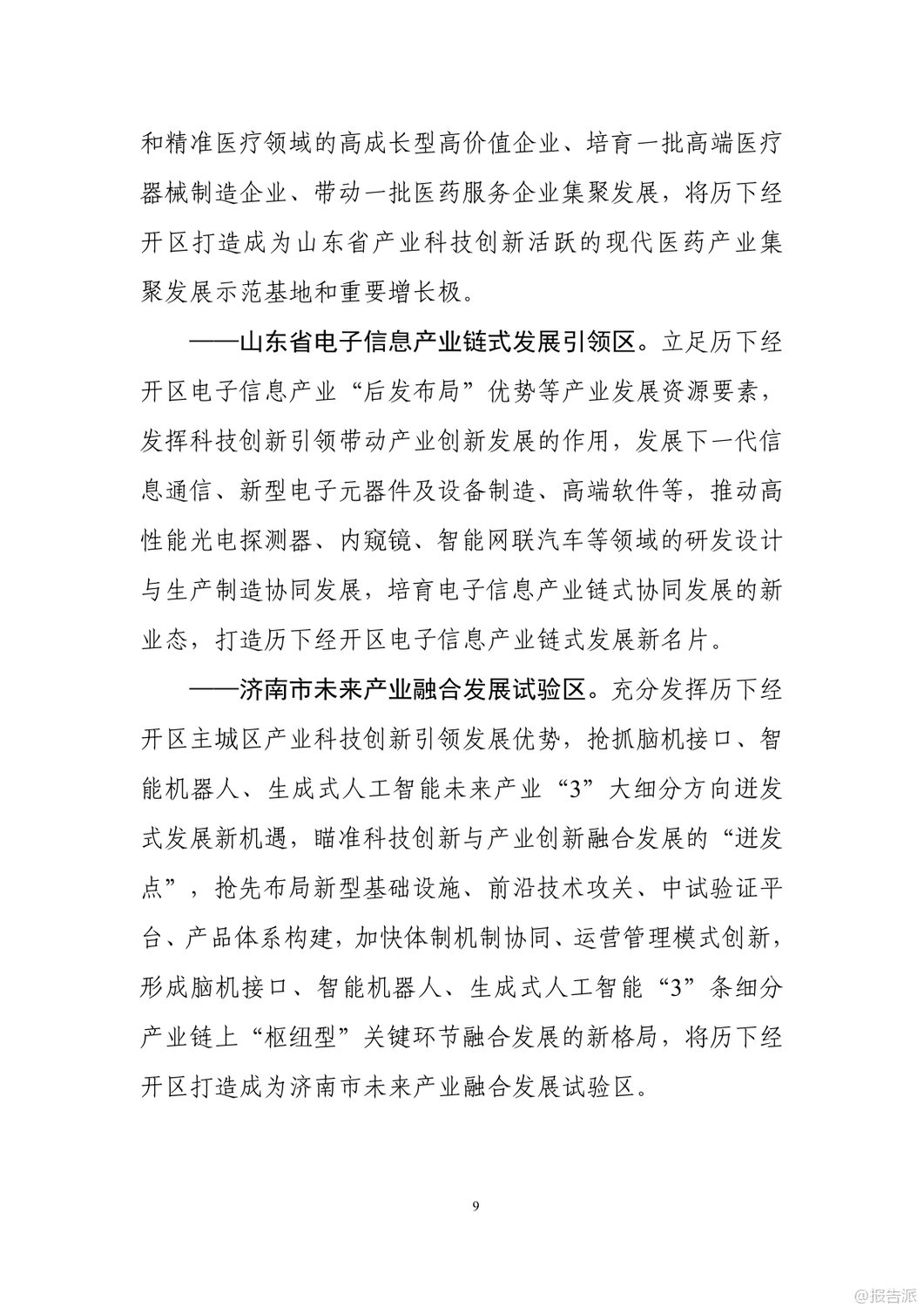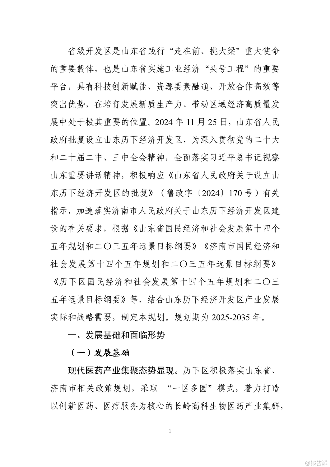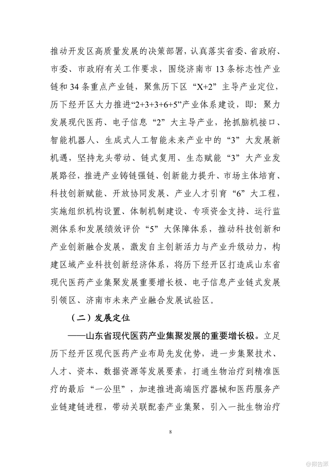 | 山东历下经济开发区最新发布的《产业发展规划(2025-2035年)》描绘了一幅以现代医药、电子信息为主导,未来产业为突破的高质量发展蓝图。 作为山东省新批复的省级开发区,历下经开区将肩负“走在前、挑大梁”的使命,聚焦培育新质生产力,打造区域经济增长极。 规划明确提出“2+3+3+6+5”产业体系,即聚力发展现代医药、电子信息两大主导产业,抢抓脑机接口、智能机器人、生成式人工智能三大未来产业机遇,坚持龙头带动、链式复用、生态赋能三大发展路径,推进六大重点工程,实施五大保障体系。 这一系统布局既体现了战略前瞻性,也具备清晰的实施路径。 在现代医药产业方面,历下经开区已具备坚实基础。 依托丽山国际细胞医学产业园、生物制药生产基地等载体,形成了覆盖研发、中试、生产、检测的全产业链生态。 目前已有58家细胞及制药企业聚集,中源协和、迈科珍、迪安诊断、华测检测等龙头企业纷纷入驻,涵盖细胞与基因治疗、医疗器械、医药服务等多个细分领域。 未来将重点突破双特异性抗体、ADC药物、免疫检查点抑制剂等前沿技术,发展高端医疗器械,并构建“AI+”医药研发平台和“5G+”智能工厂,打造山东省现代医药产业集聚发展的重要增长极。 电子信息产业则依托华为“三中心”、济南人工智能计算中心、“星火·链网”超级节点等重大项目,聚焦下一代信息通信终端、新型检验检测装备和高端软件。 尤其在光电探测器、云电脑、智能车载操作系统等领域发力,推动“连接-算力-控制”全链条发展,目标建设山东省电子信息产业链式发展引领区。 更值得关注的是对未来产业的战略布局。 在脑机接口领域,依托山东大学脑与类脑研究院和齐鲁医院的资源优势,聚焦非侵入式技术,发展柔性电极、可穿戴设备,并构建脑电大模型,应用于神经康复与疾病预警。 智能机器人方向,重点突破减速器、伺服系统等核心零部件,发展医疗专用机器人。 生成式人工智能则依托算力中心,构建生物医药多模态大模型,赋能药物研发与智慧诊疗。 为保障目标实现,规划提出设立百亿级产业引导母基金,构建“基金+产业园+创新生态”模式,并实施链长制、市场主体培育、人才引育等重点工程。 到2030年,力争两大主导产业规模破百亿;到2035年,整体发展水平达到国家级经开区标准。 这份规划不仅是一份产业指南,更是历下经开区迈向创新驱动、融合发展的宣言书,值得持续关注其落地进展。 出品方:历下区工信局 发布时间:2025年 文档页数:40页