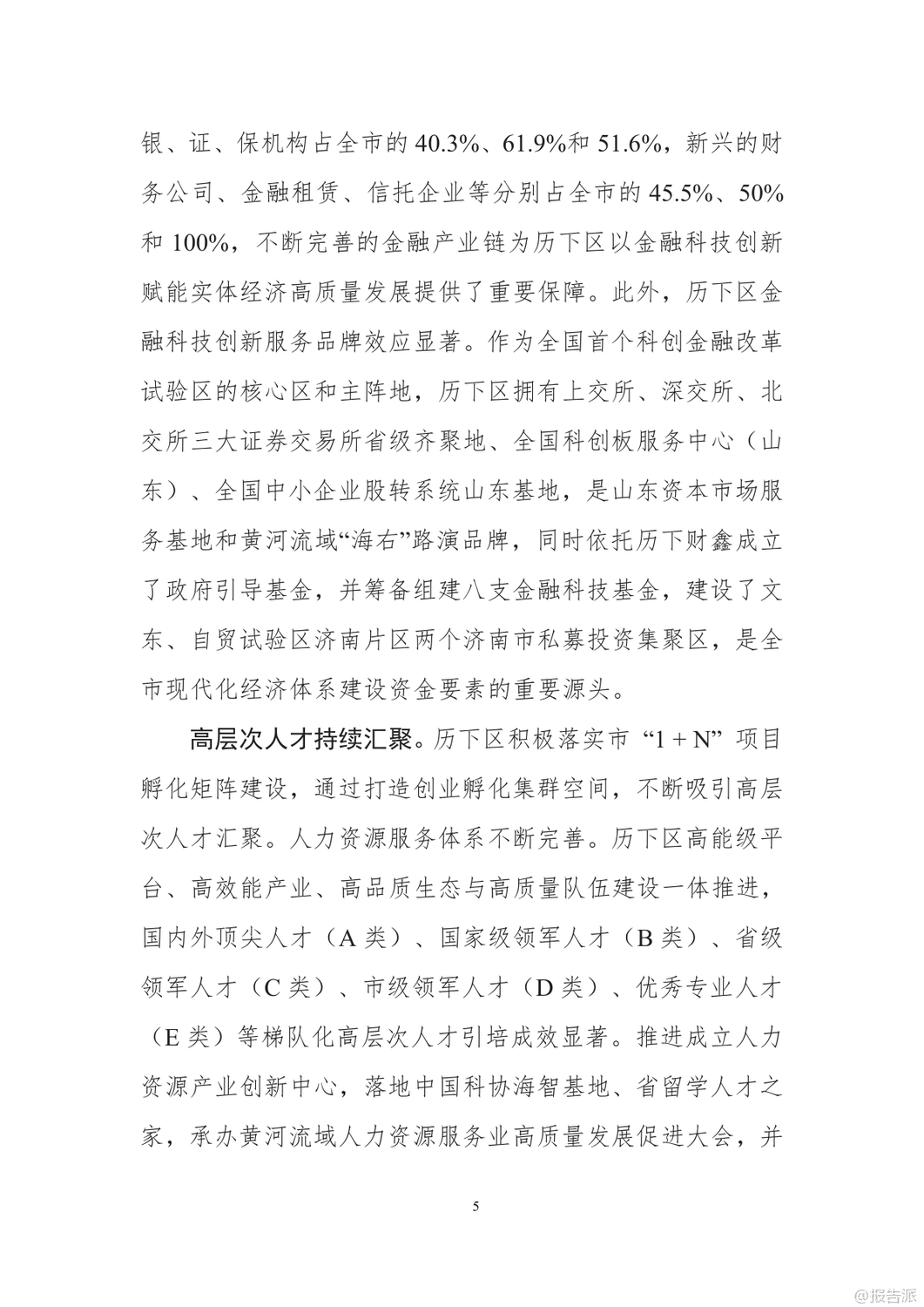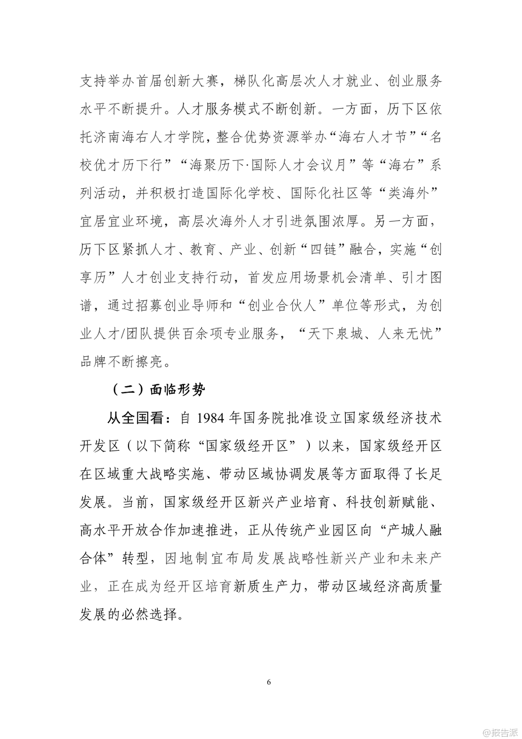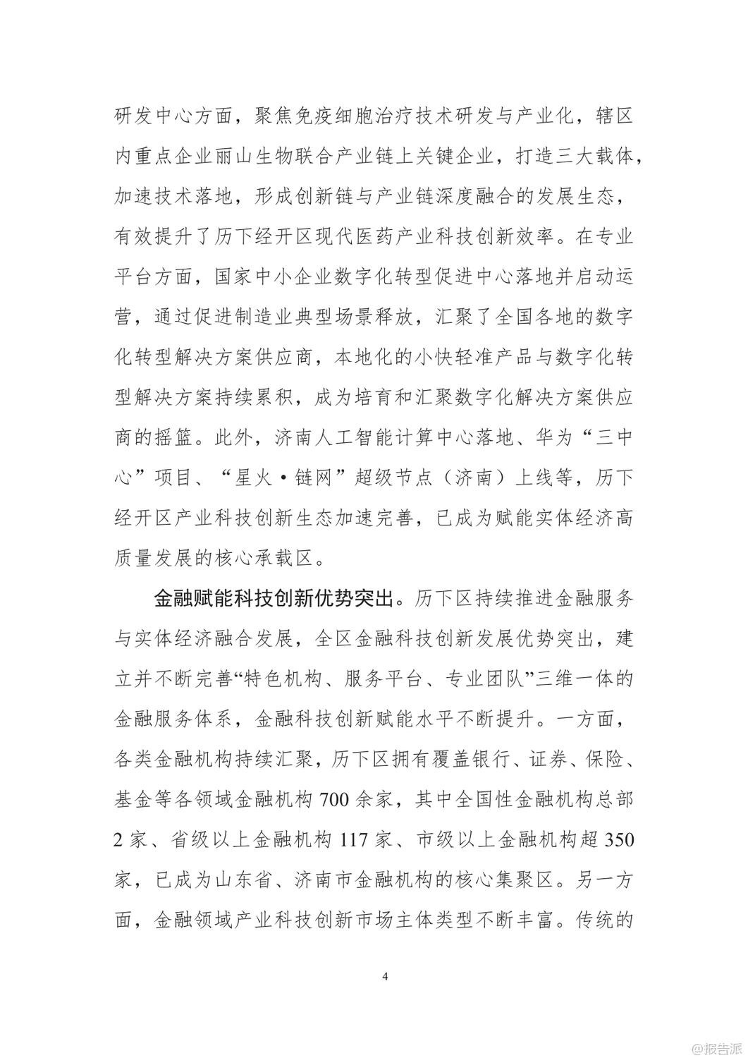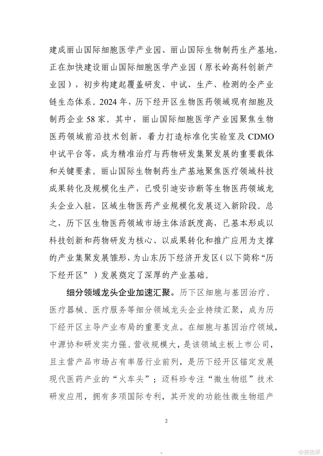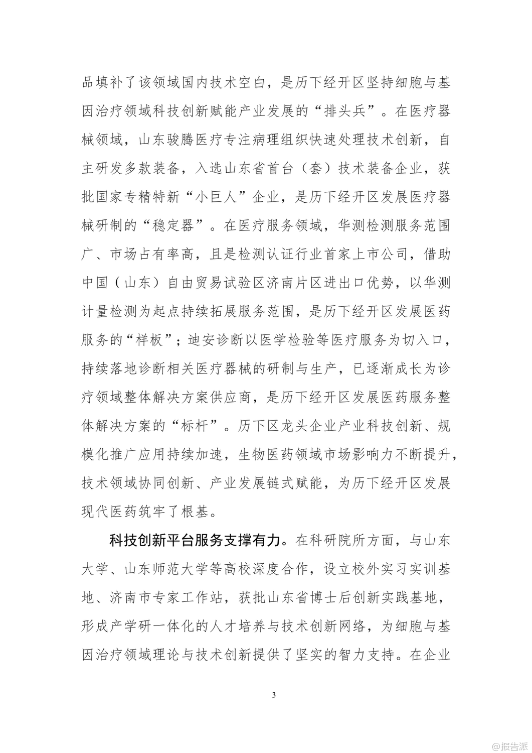 | 山东历下经济开发区最新发布的《产业发展规划(2025-2035年)》描绘了一幅以现代医药、电子信息为主导,未来产业为突破的高质量发展蓝图。 作为山东省新批复的省级开发区,历下经开区将肩负“走在前、挑大梁”的使命,聚焦培育新质生产力,打造区域经济增长极。 规划明确提出“2+3+3+6+5”产业体系,即聚力发展现代医药、电子信息两大主导产业,抢抓脑机接口、智能机器人、生成式人工智能三大未来产业机遇,坚持龙头带动、链式复用、生态赋能三大发展路径,推进六大重点工程,实施五大保障体系。 这一系统布局既体现了战略前瞻性,也具备清晰的实施路径。 在现代医药产业方面,历下经开区已具备坚实基础。 依托丽山国际细胞医学产业园、生物制药生产基地等载体,形成了覆盖研发、中试、生产、检测的全产业链生态。 目前已有58家细胞及制药企业聚集,中源协和、迈科珍、迪安诊断、华测检测等龙头企业纷纷入驻,涵盖细胞与基因治疗、医疗器械、医药服务等多个细分领域。 未来将重点突破双特异性抗体、ADC药物、免疫检查点抑制剂等前沿技术,发展高端医疗器械,并构建“AI+”医药研发平台和“5G+”智能工厂,打造山东省现代医药产业集聚发展的重要增长极。 电子信息产业则依托华为“三中心”、济南人工智能计算中心、“星火·链网”超级节点等重大项目,聚焦下一代信息通信终端、新型检验检测装备和高端软件。 尤其在光电探测器、云电脑、智能车载操作系统等领域发力,推动“连接-算力-控制”全链条发展,目标建设山东省电子信息产业链式发展引领区。 更值得关注的是对未来产业的战略布局。 在脑机接口领域,依托山东大学脑与类脑研究院和齐鲁医院的资源优势,聚焦非侵入式技术,发展柔性电极、可穿戴设备,并构建脑电大模型,应用于神经康复与疾病预警。 智能机器人方向,重点突破减速器、伺服系统等核心零部件,发展医疗专用机器人。 生成式人工智能则依托算力中心,构建生物医药多模态大模型,赋能药物研发与智慧诊疗。 为保障目标实现,规划提出设立百亿级产业引导母基金,构建“基金+产业园+创新生态”模式,并实施链长制、市场主体培育、人才引育等重点工程。 到2030年,力争两大主导产业规模破百亿;到2035年,整体发展水平达到国家级经开区标准。 这份规划不仅是一份产业指南,更是历下经开区迈向创新驱动、融合发展的宣言书,值得持续关注其落地进展。 出品方:历下区工信局 发布时间:2025年 文档页数:40页