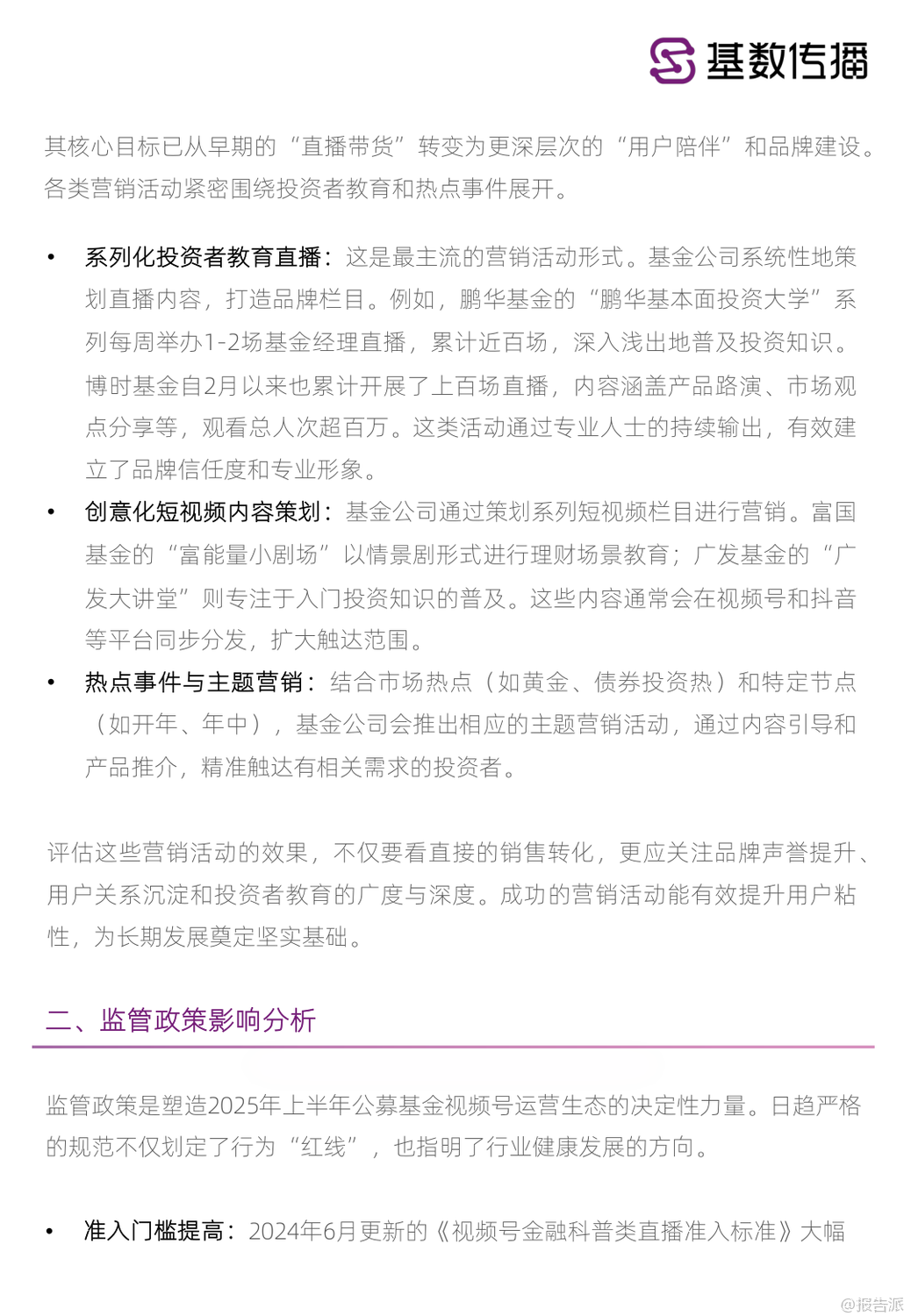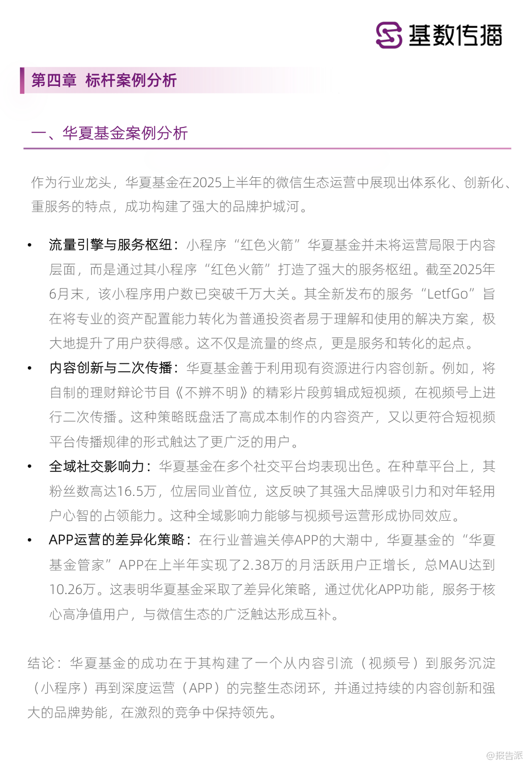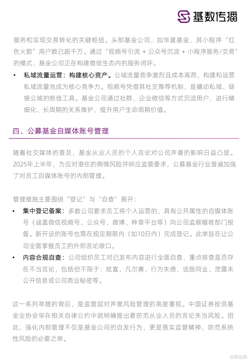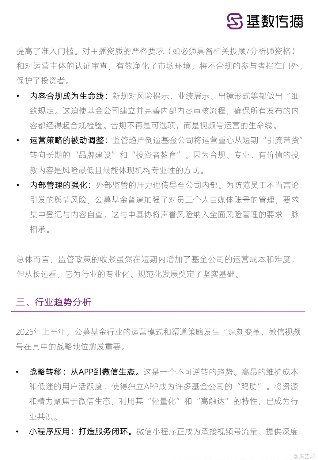 | 2025年上半年,公募基金行业在微信视频号的运营进入深度转型期,整体呈现出从“流量争夺”向“价值沉淀”、从“野蛮生长”向“合规深耕”的显著转变。 这一变化背后,是行业竞争加剧、运营成本高企与监管政策收紧三重压力共同作用的结果。 传统以独立APP为核心的直销模式正遭遇严峻挑战。 高昂的运维成本与低迷的用户活跃度形成鲜明反差,天弘基金APP月活用户已不足2022年末的三分之一,多数基金公司纷纷关停或缩减APP投入,转而将战略重心全面转向微信生态。 微信凭借其庞大的用户基数、轻量化的使用体验和强大的社交裂变能力,成为基金公司低成本、高效率触达用户的首选阵地。 尽管易方达“e钱包”、华夏基金“管家”等头部APP仍实现用户增长,但行业整体向微信生态迁移的趋势已不可逆转。 与此同时,监管政策的持续加码重塑了视频号内容生态。 2024年6月起实施的《视频号金融科普类直播准入标准》对主播资质、内容合规、运营主体提出了严格要求。 主播须具备投顾或分析师资格,直播画面必须显著标注风险提示,运营机构需提交业务许可证认证。 这标志着金融科普内容告别无序扩张,步入专业化、规范化时代。 合规不再是一道附加题,而是生存的底线。 在此背景下,基金公司的运营策略发生根本性转变。 内容主题上,从过去侧重产品推销转向以投资者教育为核心,华安基金“了如指掌”、诺德基金《头版投条》等系列内容通过短视频、情景剧等形式普及金融知识,兼顾专业性与趣味性。 形式上,直播与短视频并重,鹏华基金“基本面投资大学”累计开展近百场直播,富国基金“富能量小剧场”以创意剧情吸引用户,内容生产走向体系化、栏目化。 用户互动与情绪也呈现新特征。 上半年声量与互动量受政策驱动明显,1月因“中长期资金入市”等政策利好达到峰值,随后逐渐回落。 值得注意的是,高讨论度并未带来持续的正面情绪,净情感度(NSR)从2月的78%高位回落至6月的33%,反映出投资者从初期乐观逐步回归理性,更关注实际回报与长期价值。 标杆企业的实践揭示了多元化的成功路径。 华夏基金通过“视频号引流—公众号沉淀—小程序服务(红色火箭)—APP深度运营”的生态闭环,实现千万级用户沉淀与服务转化;易方达则坚持“内功驱动”,专注输出深度专业内容,巩固“稳健、可靠”的品牌形象;中欧基金凭借超高爆款率展现内容质量优势,鹏华、汇添富则以高频输出建立用户粘性。 展望未来,微信视频号已成为公募基金连接投资者的核心阵地。 成功的运营不再依赖短期流量红利,而在于能否构建专业内容IP、深化用户陪伴关系、筑牢合规风控防线,并通过数据洞察实现精准运营。 唯有坚持长期主义,方能在激烈的竞争中赢得用户信任,实现品牌价值的可持续增长。 出品方:基数传播 发布时间:2025年