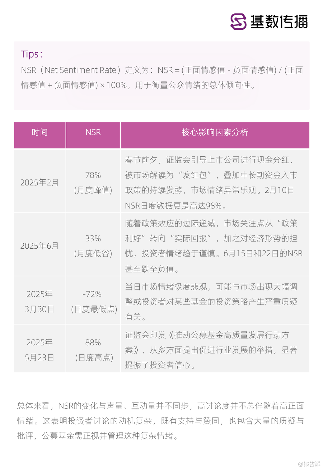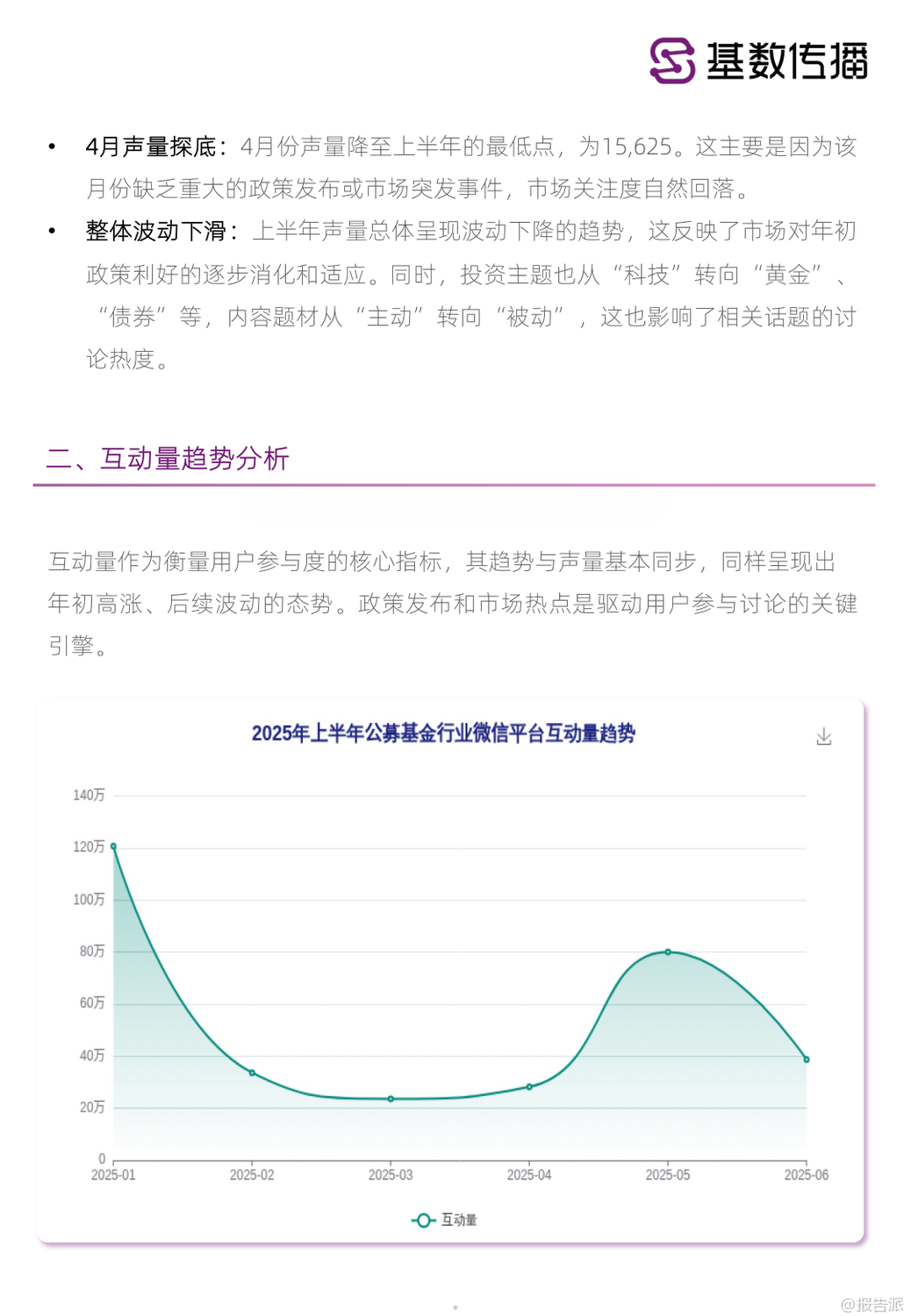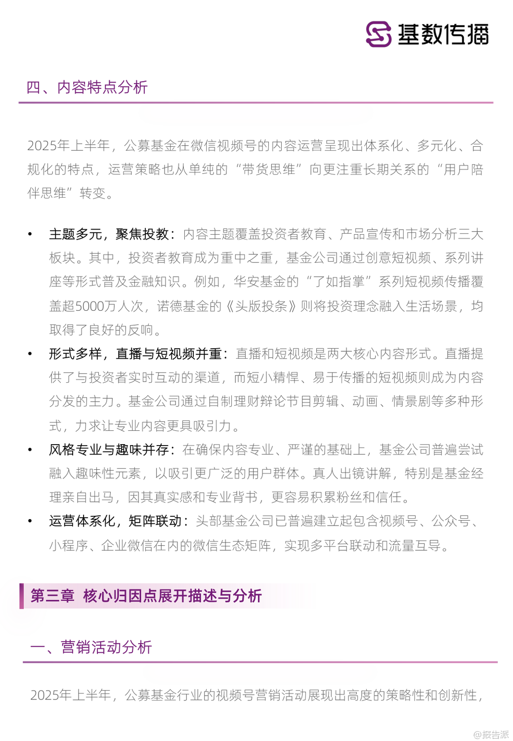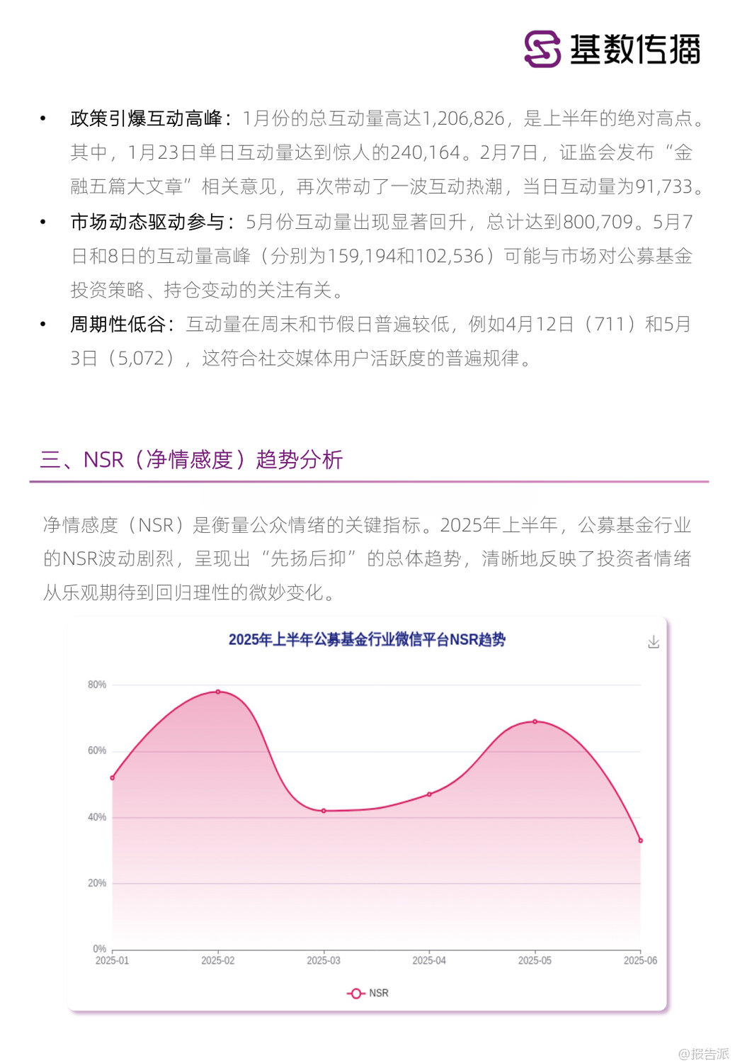 | 2025年上半年,公募基金行业在微信视频号的运营进入深度转型期,整体呈现出从“流量争夺”向“价值沉淀”、从“野蛮生长”向“合规深耕”的显著转变。 这一变化背后,是行业竞争加剧、运营成本高企与监管政策收紧三重压力共同作用的结果。 传统以独立APP为核心的直销模式正遭遇严峻挑战。 高昂的运维成本与低迷的用户活跃度形成鲜明反差,天弘基金APP月活用户已不足2022年末的三分之一,多数基金公司纷纷关停或缩减APP投入,转而将战略重心全面转向微信生态。 微信凭借其庞大的用户基数、轻量化的使用体验和强大的社交裂变能力,成为基金公司低成本、高效率触达用户的首选阵地。 尽管易方达“e钱包”、华夏基金“管家”等头部APP仍实现用户增长,但行业整体向微信生态迁移的趋势已不可逆转。 与此同时,监管政策的持续加码重塑了视频号内容生态。 2024年6月起实施的《视频号金融科普类直播准入标准》对主播资质、内容合规、运营主体提出了严格要求。 主播须具备投顾或分析师资格,直播画面必须显著标注风险提示,运营机构需提交业务许可证认证。 这标志着金融科普内容告别无序扩张,步入专业化、规范化时代。 合规不再是一道附加题,而是生存的底线。 在此背景下,基金公司的运营策略发生根本性转变。 内容主题上,从过去侧重产品推销转向以投资者教育为核心,华安基金“了如指掌”、诺德基金《头版投条》等系列内容通过短视频、情景剧等形式普及金融知识,兼顾专业性与趣味性。 形式上,直播与短视频并重,鹏华基金“基本面投资大学”累计开展近百场直播,富国基金“富能量小剧场”以创意剧情吸引用户,内容生产走向体系化、栏目化。 用户互动与情绪也呈现新特征。 上半年声量与互动量受政策驱动明显,1月因“中长期资金入市”等政策利好达到峰值,随后逐渐回落。 值得注意的是,高讨论度并未带来持续的正面情绪,净情感度(NSR)从2月的78%高位回落至6月的33%,反映出投资者从初期乐观逐步回归理性,更关注实际回报与长期价值。 标杆企业的实践揭示了多元化的成功路径。 华夏基金通过“视频号引流—公众号沉淀—小程序服务(红色火箭)—APP深度运营”的生态闭环,实现千万级用户沉淀与服务转化;易方达则坚持“内功驱动”,专注输出深度专业内容,巩固“稳健、可靠”的品牌形象;中欧基金凭借超高爆款率展现内容质量优势,鹏华、汇添富则以高频输出建立用户粘性。 展望未来,微信视频号已成为公募基金连接投资者的核心阵地。 成功的运营不再依赖短期流量红利,而在于能否构建专业内容IP、深化用户陪伴关系、筑牢合规风控防线,并通过数据洞察实现精准运营。 唯有坚持长期主义,方能在激烈的竞争中赢得用户信任,实现品牌价值的可持续增长。 出品方:基数传播 发布时间:2025年