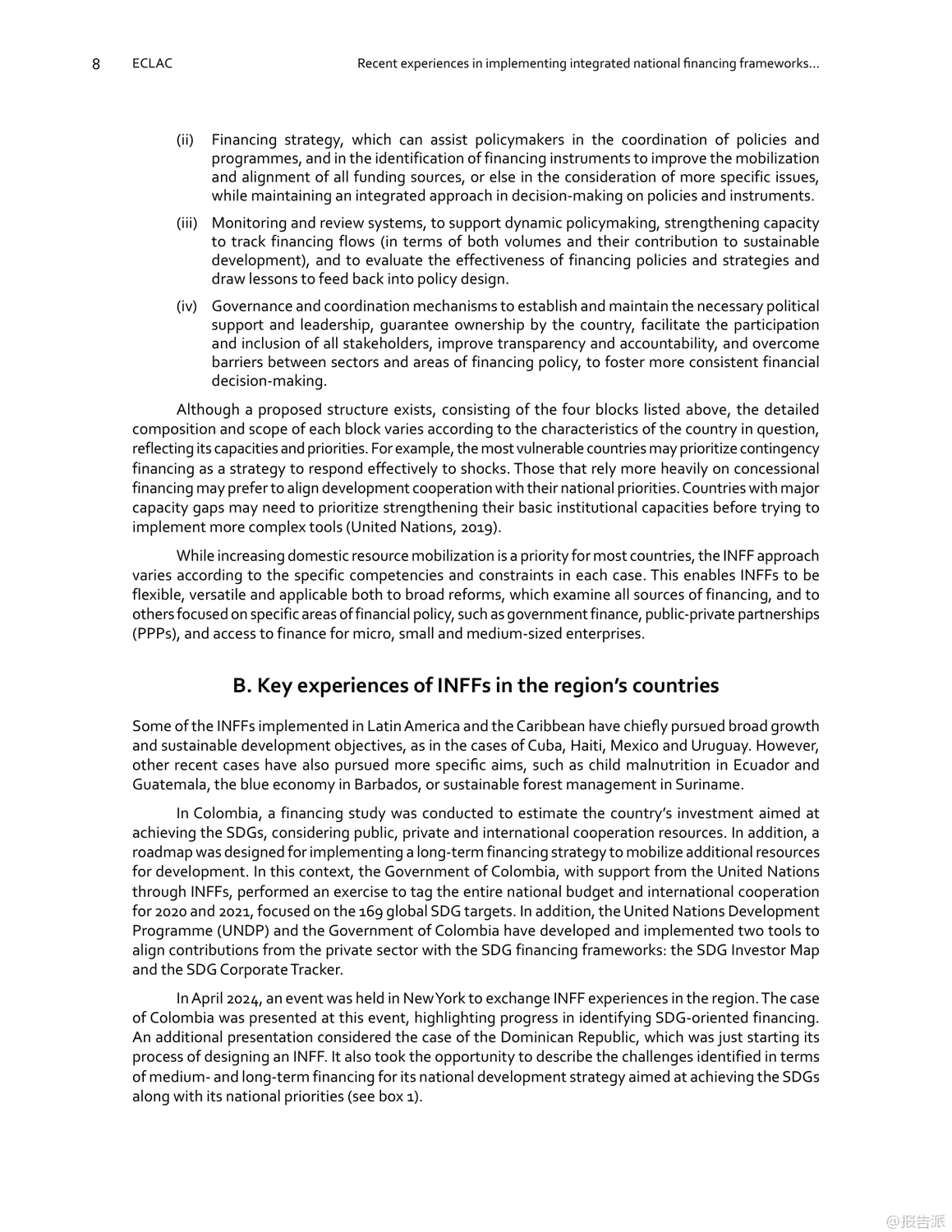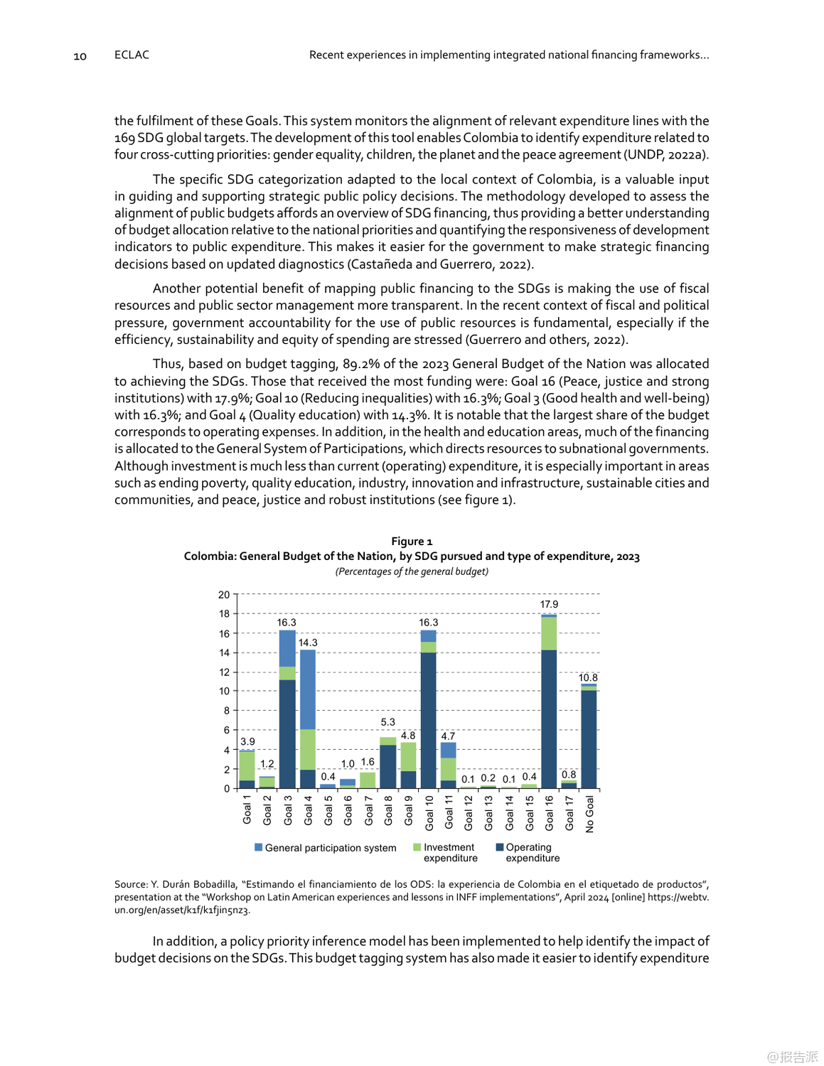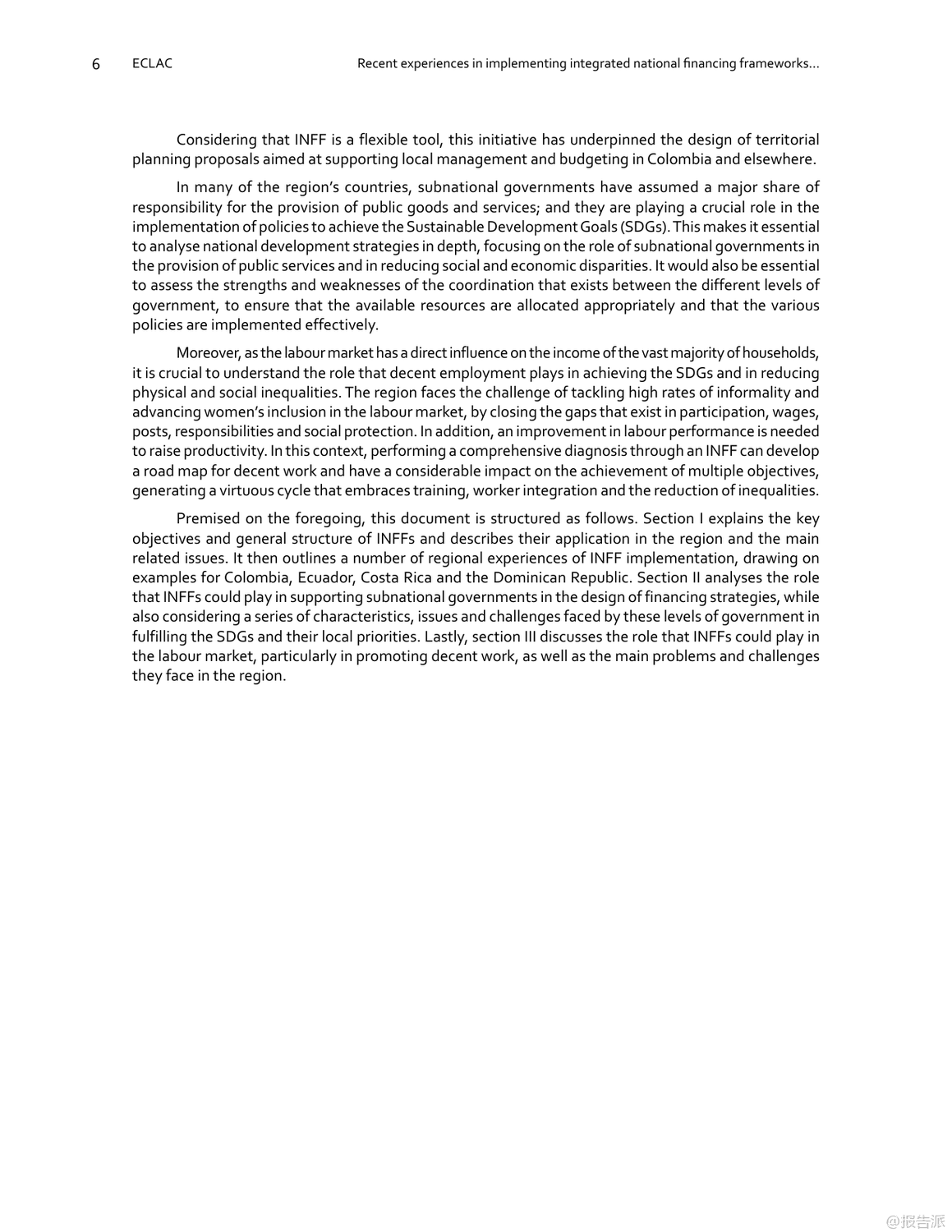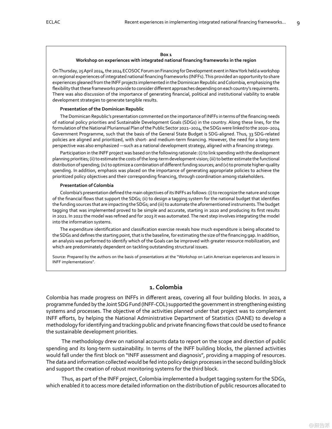 | 近期,联合国拉丁美洲和加勒比经济委员会(ECLAC)发布了一份关于区域国家实施综合国家融资框架(INFF)的最新经验报告。 该报告系统梳理了哥伦比亚、厄瓜多尔、多米尼加共和国和哥斯达黎加等国在推动可持续发展目标(SDGs)融资方面的实践,揭示了INFF作为政策工具在统筹财政资源、促进跨部门协作和提升发展透明度方面的关键作用。 INFF是一种由各国自主设计的融资战略框架,旨在整合公共与私人、国内与国际资金来源,确保财政政策与经济、社会和环境可持续性目标相一致。 其核心包括四大支柱:评估诊断、融资策略、监测审查机制以及治理协调体系。 这一框架不仅帮助识别发展指标与资金需求之间的差距,还强化了政策执行的系统性和前瞻性。 在具体实践中,哥伦比亚走在前列。 该国自2020年起推行预算标签制度,将国家预算与全部169项全球SDG目标对齐。 数据显示,2023年其总预算中高达89.2%的资金用于实现SDGs,其中和平正义、减少不平等、健康福祉和优质教育是重点投入领域。 此外,哥伦比亚还通过发行主权绿色债券筹集超19亿美元,并开发了“SDG投资者地图”和“企业追踪器”等工具,引导私营资本参与可持续投资。 多米尼加共和国则聚焦于国家发展战略的长期融资规划。 通过成本测算与缺口分析,该国识别出教育、医疗、水资源和气候韧性等优先领域的资金瓶颈,并探索绿色债券、债务换自然、 diaspora融资等创新工具。 2024年6月,该国成功发行7.5亿美元绿色主权债券,用于低碳交通和水资源管理项目,标志着其在可持续金融领域的实质性突破。 值得注意的是,次国家级政府在落实SDGs中扮演着关键角色。 拉美地区次级政府支出占总体公共支出约四分之一,尤其在教育、卫生等领域承担主要责任。 然而,普遍存在财权与事权不匹配、横向财政失衡及数据透明度不足等问题。 为此,报告建议加强地方税收能力建设、优化转移支付机制、拓展公私合作(PPP)与地方债务市场,并建立统一的信息监控系统以提升问责能力。 劳动市场方面,INFF也被视为推动体面就业的重要抓手。 拉美面临高非正规就业率(2024年一季度约46%)、性别参与差距(女性参与率低23个百分点)和青年失业等结构性挑战。 报告指出,通过INFF可系统整合就业政策、社会保障与技能培训资源,支持如“全球体面就业加速器”等多边倡议,构建从人力资本投资到生产率提升的良性循环。 综上所述,INFF不仅是融资工具,更是推动政策协同与制度变革的平台。 它要求各国强化顶层设计,打通中央与地方、政府与市场之间的壁垒,从而为实现2030议程提供坚实的资金保障与发展路径。 出品方:ECLAC 发布时间:2025年 文档页数:45页