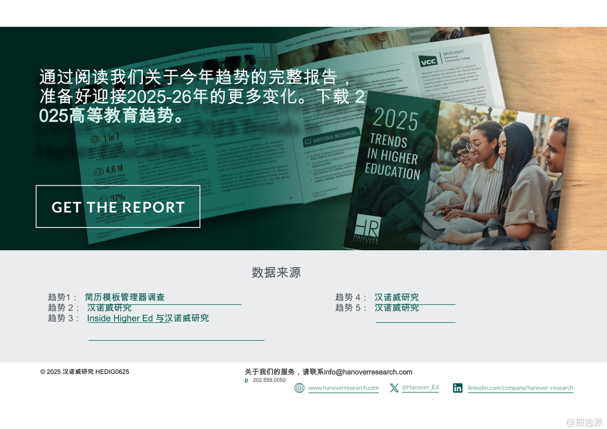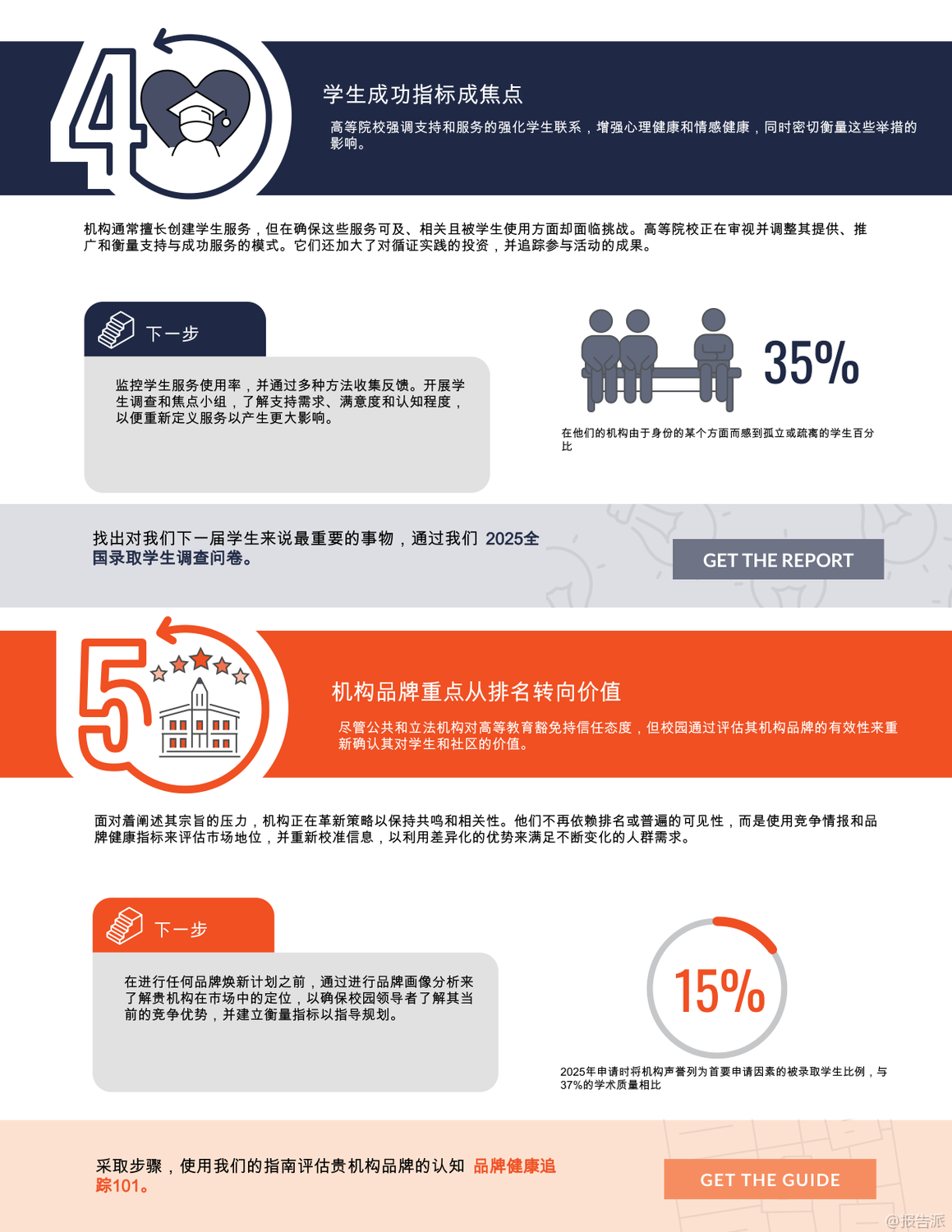 | 随着社会经济结构、技术发展和学生需求的深刻变化,高等教育正迎来一场系统性变革。 根据最新发布的《2025-09-05-高等教育正在改变中的5种方式2025》报告,未来两年内,美国高等教育将在五大关键方向上发生显著转型,这些趋势不仅影响院校的战略布局,也将重塑学生的学习路径与就业前景。 第一大趋势是学术项目的市场化增强。 越来越多的高校开始以市场需求为导向设计课程体系,推出更短周期、更具灵活性的学位与证书项目,尤其是微证书(micro-credentials)的兴起,正在打破传统四年制学位的垄断地位。 学校通过压缩学分要求、设置加速通道,让学生能在更短时间内完成学业并进入职场。 与此同时,高校加强对项目成本、投入产出比和毕业生就业成果的数据追踪,以应对潜在的绩效拨款机制,提升教育资源的使用效率。 第二大趋势是融资与财政压力倒逼战略重构。 报告显示,63%的美国高校预算官员认为联邦政策变动对其财务规划构成中等到严重影响。 招生波动、援助政策不确定性、贷款偿还负担加重等因素导致约40%的学生因经济原因放弃入学机会。 在此背景下,高校不得不重新审视传统的预算编制与长期债务安排,推动收入多元化,探索企业合作、基金会资助等新型筹资模式,并通过情景规划增强抗风险能力。 第三大趋势是学生成功指标成为核心关注点。 过去以毕业率和 retention rate 为主的评价体系,正在向更全面的学生支持服务演进。 高校不仅提供心理辅导、学业帮扶等服务,更重视服务的可达性、参与度与实际成效。 通过定期开展学生调查、焦点小组访谈等方式,学校深入了解学生痛点,优化服务设计。 数据显示,仍有15%的学生因身份认同问题感到孤立,这促使院校加强包容性建设,提升归属感。 第四大趋势是机构品牌从“排名崇拜”转向“价值主张”。 以往学生择校高度依赖US News等排名,但如今仅有35%的新生将机构声誉列为首要考量,相比之下,37%更看重学术质量。 这一转变意味着高校必须讲清楚“我能为你带来什么价值”。 越来越多院校通过品牌健康评估、竞争情报分析来明确自身定位,并围绕特定群体需求打造差异化优势,比如强化就业衔接、突出地域服务或技术融合特色。 第五大趋势是技能导向的教学改革全面提速。 为提升毕业生就业竞争力,高校正系统性地将关键技术能力(如人工智能、SQL、Excel)和软实力(如沟通、团队协作、批判性思维)嵌入各类课程之中。 据预测,到2025年,大量企业将取消学士学位硬性要求,转而关注实际技能掌握情况。 这一趋势进一步推动教育产品向模块化、能力认证化发展,形成与劳动力市场更紧密的对接闭环。 总体来看,2025年的高等教育正处于从“供给驱动”向“需求驱动”的深刻转型期。 面对政治、经济与技术多重冲击,高校唯有坚持数据驱动决策、聚焦学生价值创造、强化外部协同联动,才能在变革中赢得可持续发展的未来。 出品方:汉诺威研究 发布时间:2025年