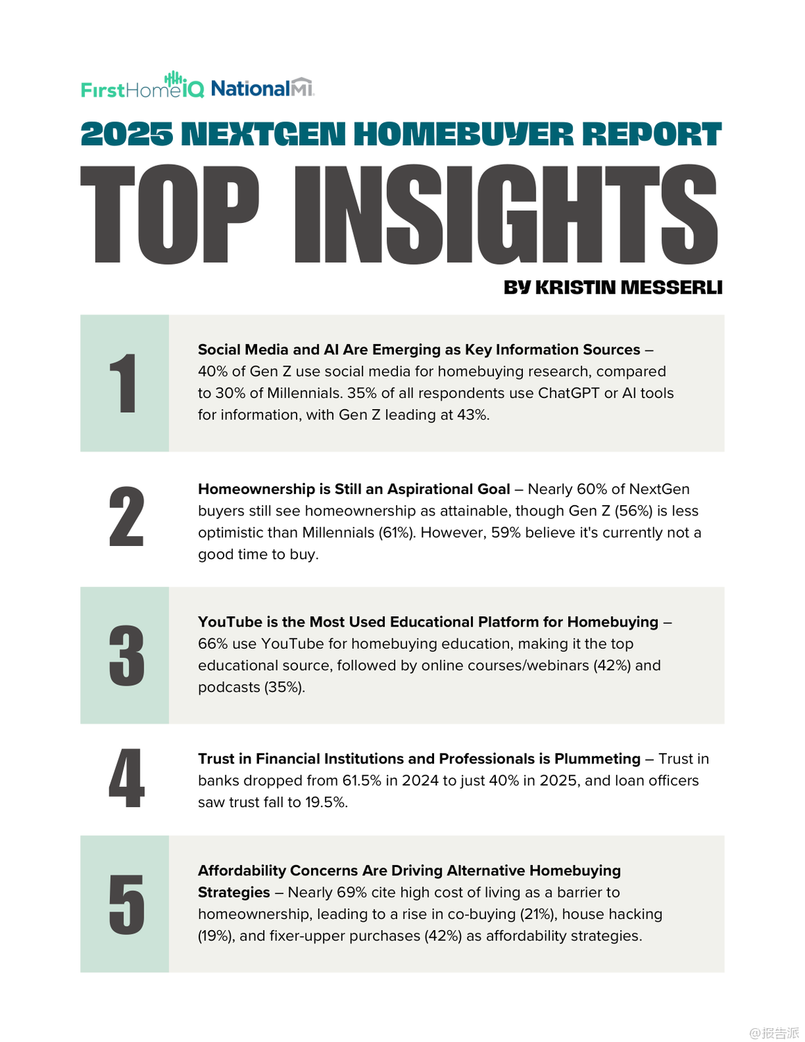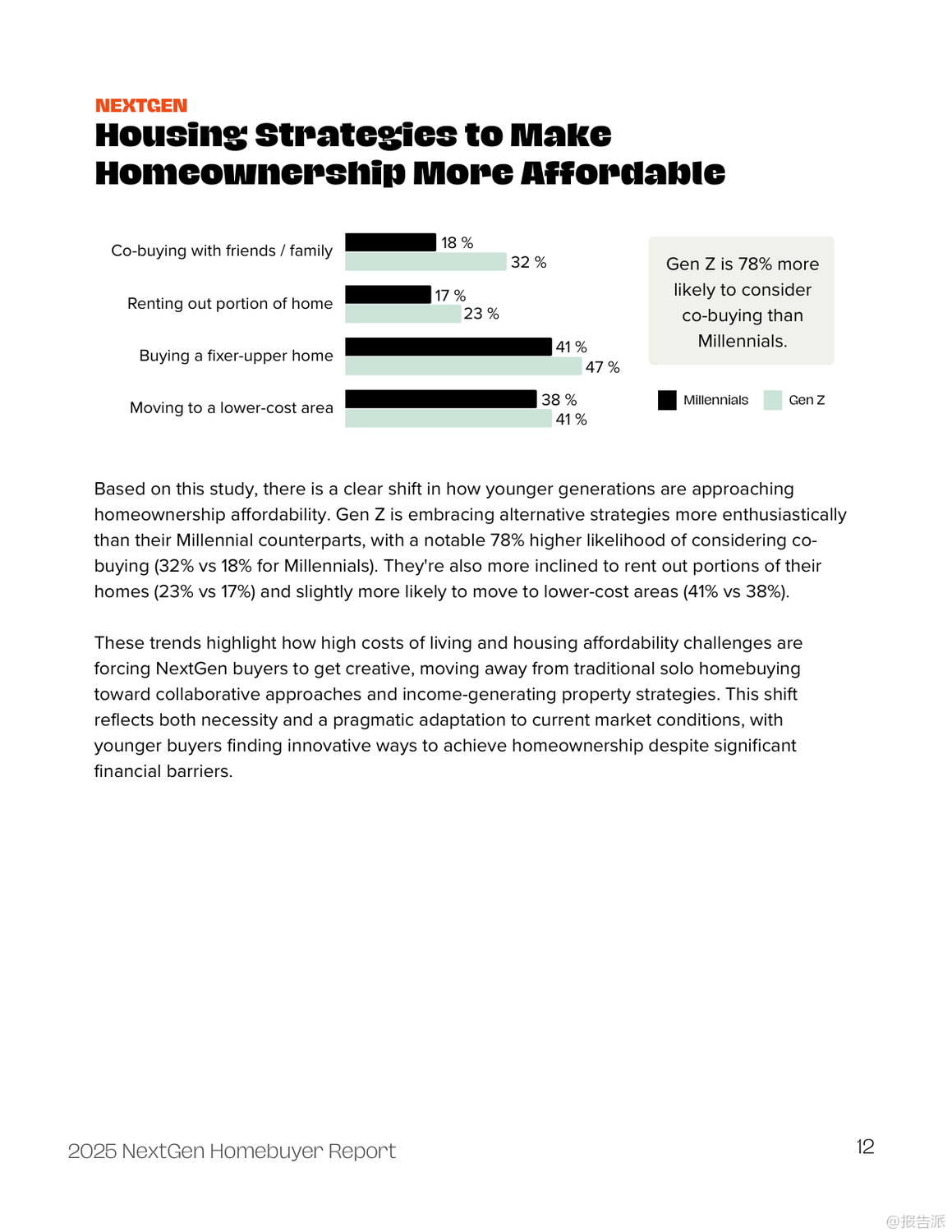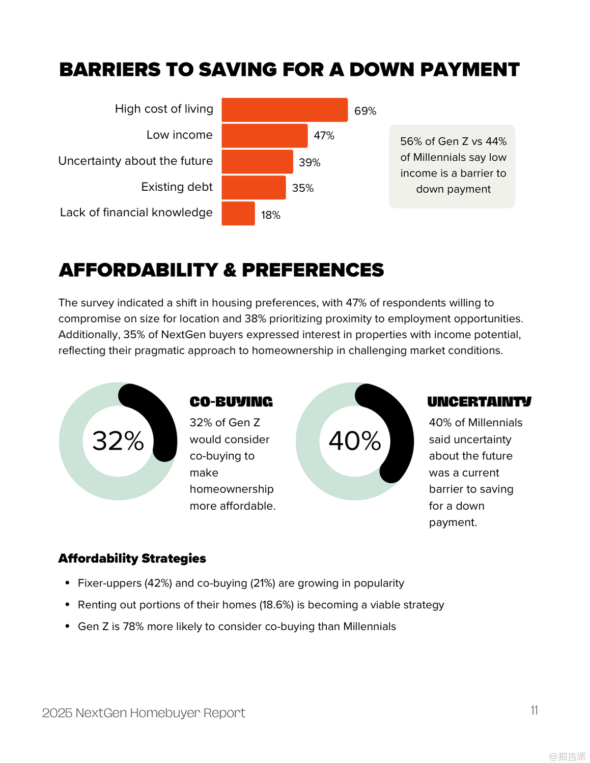 | 2025年新生代购房者报告揭示了当前Z世代与千禧一代在购房路上的真实图景。 这份由FirstHome IQ联合National MI发布的年度调研,基于对1000名18至44岁人群的深度调查,呈现了一个充满挑战、信任危机与创新应对策略的住房市场新生态。 报告显示,尽管高达95%的年轻人都将拥有自己的房子视为人生目标,但现实的压力让仅有约六成(59%)的人认为买房是可实现的,更有高达59%的受访者认为当前并非购房良机。 高企的生活成本成为最大拦路虎——69%的受访者将其列为阻碍购房的主要因素,紧随其后的是低收入(47%)、未来不确定性(39%)和现有债务负担(35%)。 财务压力虽有所缓解,但仍不容忽视。 2025年表示“非常焦虑”的年轻人比例从去年的33%降至26%,但仍有超过三分之二的人存在不同程度的财务困扰。 储蓄方面,应急基金仍是首要目标(52%),而为首付存钱的比例仅为29%。 值得注意的是,Z世代在财务规划上展现出前瞻性,33%的Z世代优先考虑首付储蓄,高于千禧一代的27%。 最令人警醒的趋势是信任体系的崩塌。 对银行的信任度从2024年的61.5%骤降至2025年的40%,而对贷款专员的信任更是跌至惊人的19.5%。 这种系统性不信任源于年轻一代成长过程中经历的多次经济动荡与机构失信事件。 他们不再盲目依赖传统专业人士,转而寻求更自主的信息渠道。 信息获取方式正经历革命性变化。 YouTube以66%的使用率成为最受欢迎的购房教育平台,其中Z世代使用率高达74%。 社交媒体也成为重要阵地,40%的Z世代通过社交平台获取购房信息,远超千禧一代的30%。 更具颠覆性的是AI工具的崛起——35%的受访者使用ChatGPT等AI进行信息查询,Z世代使用率高达43%。 这标志着年轻买家正利用技术主动掌控决策过程。 面对高昂房价,新一代购房者积极采用非传统策略。 42%考虑购买“老破小”翻新,21%探索共同购房,19%尝试“房屋套利”(house hacking)。 Z世代尤为激进,考虑合买的比例达32%,比千禧一代高出78%。 此外,35%的年轻人关注房产的创收潜力,如出租房间,显示其购房动机兼具居住与投资双重属性。 报告还揭示了显著的群体差异。 黑人和拉丁裔受访者对未来住房可及性表现出更高乐观度,但历史上系统性歧视导致的信息网络薄弱和专业指导获取障碍依然存在。 女性购房比例高,但金融自信明显低于男性(38% vs 47%),她们更依赖Zillow等平台和专业顾问,体现了一种“谨慎而周全”的决策风格。 综上所述,2025年的新生代购房者是一群理想未灭却深谙现实、渴望自主又缺乏信任的复杂群体。 他们用技术创新弥补知识鸿沟,以合作模式对抗高房价,用务实策略追求安居梦。 对于行业而言,重建信任、拥抱数字渠道、提供灵活产品并推动金融教育普及,是赢得这一代人的关键所在。 出品方:FirstHome IQ 发布时间:2025年 文档页数:26页