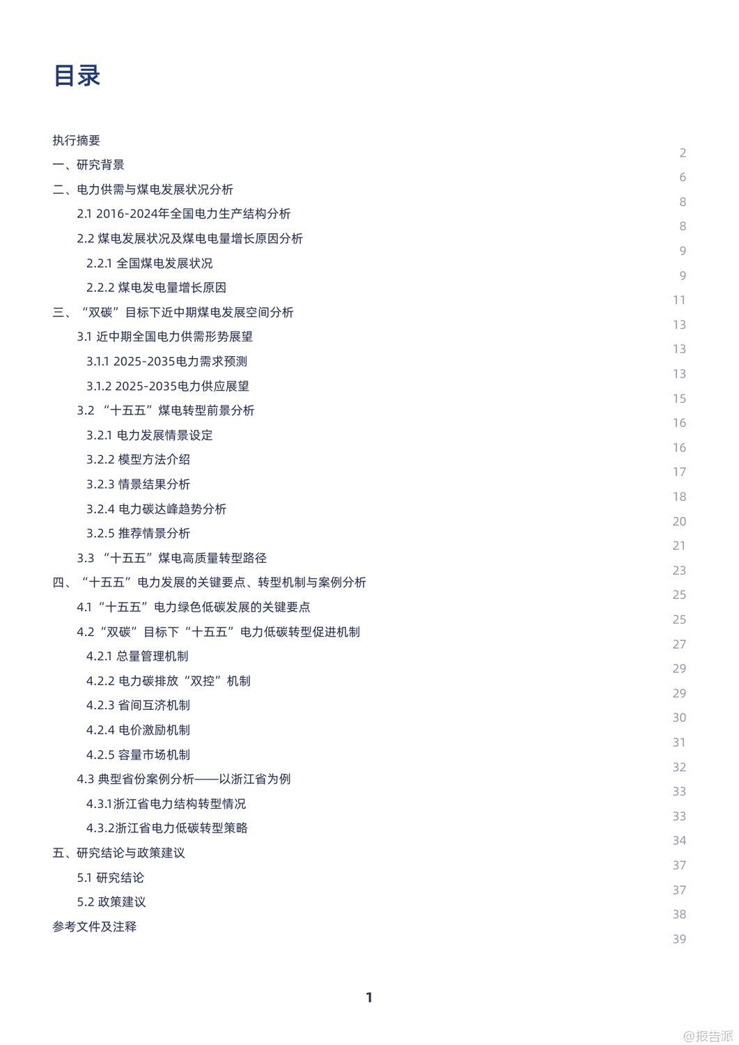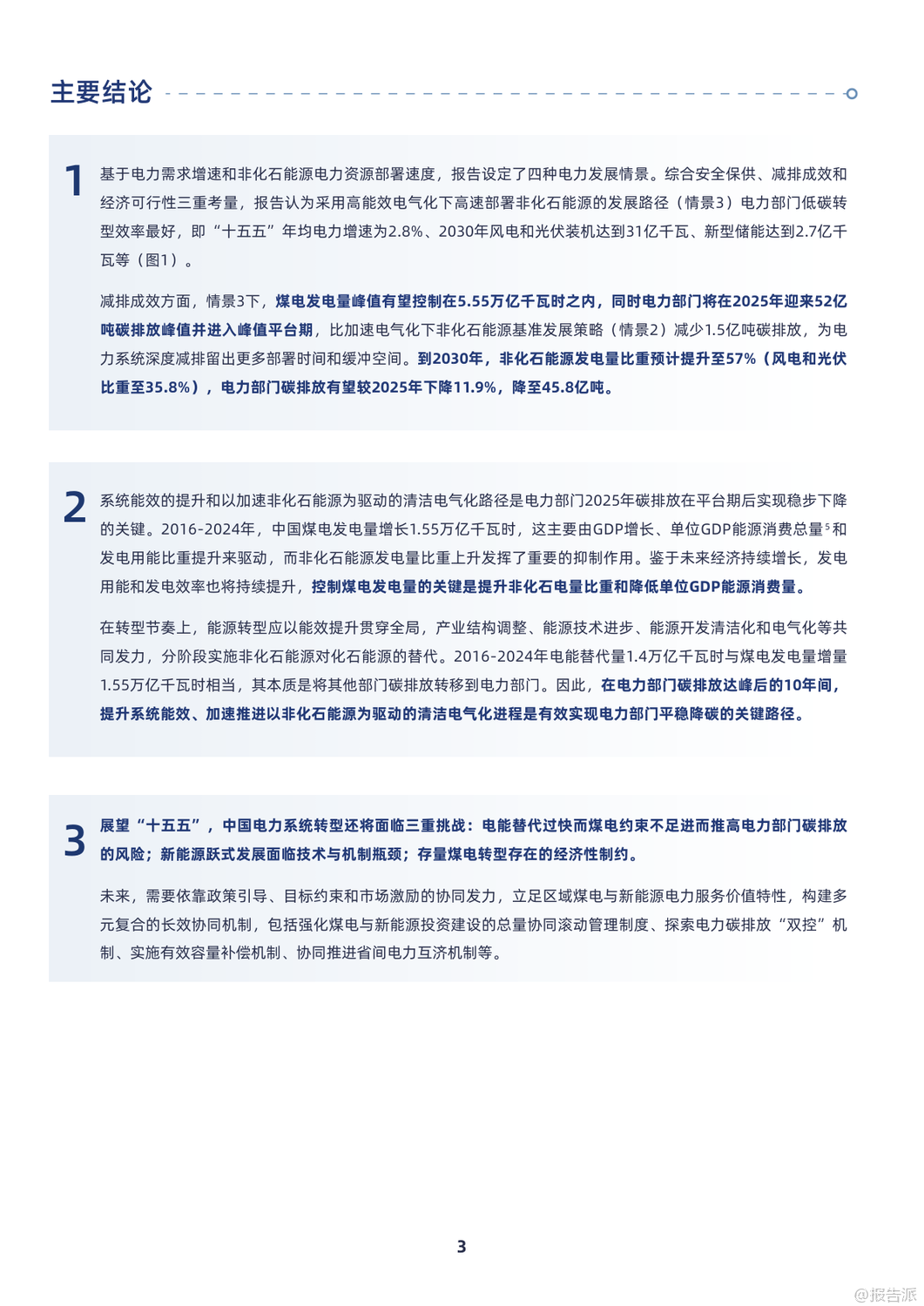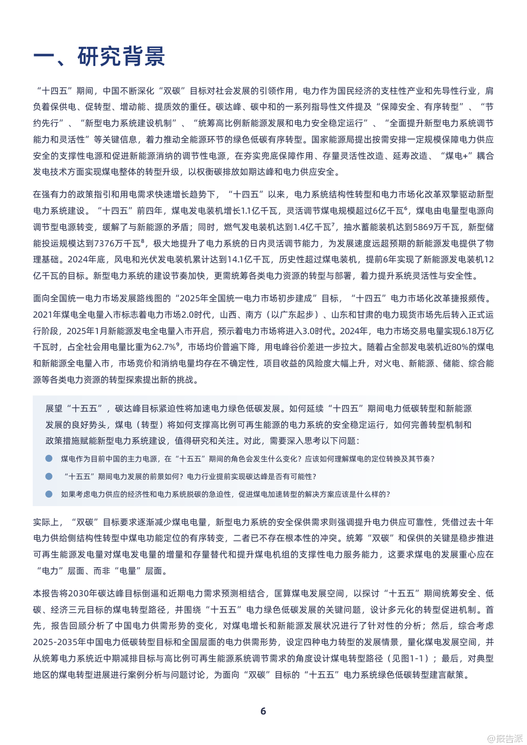 | 中国作为全球第一大煤炭消费国,煤电长期承担着电力系统“保供”与“调峰”的双重角色。 进入“十五五”关键期,如何在保障电力安全的前提下实现低碳转型,成为能源领域的核心议题。 近日,由绿色和平、华北电力大学(保定)等机构联合发布的《2025迈向“十五五”煤电何去何从:转型路径与多元机制研究报告》给出了系统性解答。 报告指出,“十四五”期间,尽管新能源装机迅猛增长,风电光伏累计装机已于2024年历史性超过煤电,但煤电发电量仍持续攀升,2024年达5.5万亿千瓦时,占总发电量超五成。 这背后既有经济增长、电能替代加速的驱动,也暴露出新能源消纳难、系统灵活性不足的深层矛盾。 更值得关注的是,煤电利用小时数回升至4500小时以上,部分省份甚至出现煤电建设“回潮”,新核准装机达2.78亿千瓦,为“十三五”时期的近两倍,这无疑加大了碳达峰目标的实现难度。 面向2025-2035年,报告通过构建四种发展情景,明确指出电力行业有望在2025年提前实现碳达峰。 其中,最优路径为“高能效电气化+高速部署非化石能源”(情景3)。 在此情景下,煤电发电量峰值可控制在5.55万亿千瓦时以内,电力碳排放将于2025年达峰于52亿吨,此后稳步下降。 到2030年,非化石能源发电量比重将提升至57%,风电光伏装机达31亿千瓦,新型储能达2.7亿千瓦。 报告强调,煤电的未来不在“电量”而在“电力”。 其角色必须从“电量型电源”向“基础保障型和系统调节型电源”加速转型。 这意味着煤电将更多承担顶峰保供、深度调峰、应急备用等功能,利用小时数将逐步走低。 为此,报告呼吁建立多元协同机制:一是强化煤电与新能源的总量协同滚动管理,避免无序扩张;二是探索电力碳排放“双控”机制,将碳强度作为约束性指标;三是完善省间互济机制,提升跨区域资源优化配置能力;四是深化电价激励与容量市场机制,让提供可靠容量和灵活调节服务的机组获得合理回报。 以浙江为典型案例,报告展示了转型的可行路径:通过严控煤电规模、大力发展海上风电与分布式光伏、强化省间电力互济(如与安徽开展电力置换)、并依托成熟的电力市场机制实现新能源100%消纳,浙江已实现新能源装机反超煤电,为全国提供了“受端电网”转型样板。 总而言之,煤电转型是一场“先立后破”的系统性工程。 唯有在需求侧坚持节能优先、提升能效,在供给侧加速清洁能源替代,并同步构建适应高比例新能源的新型电力系统与市场机制,才能真正实现安全、低碳、经济的“不可能三角”平衡,为中国碳中和目标奠定坚实的电力基石。 出品方:绿色和平 发布时间:2025年 文档页数:40页