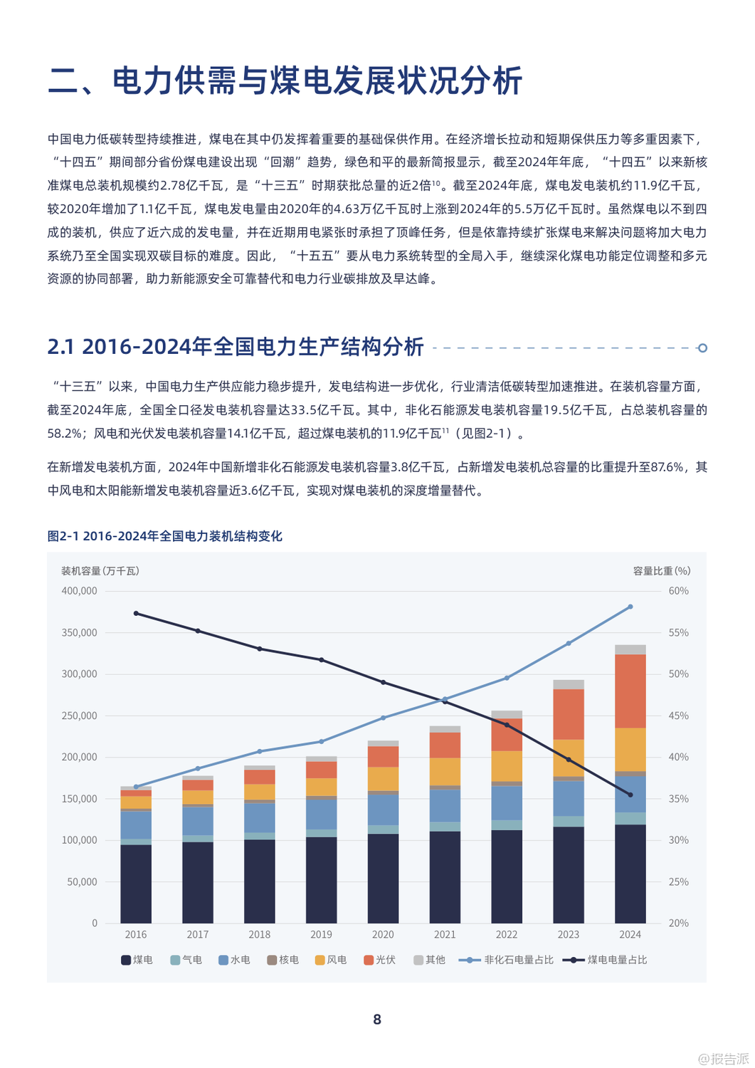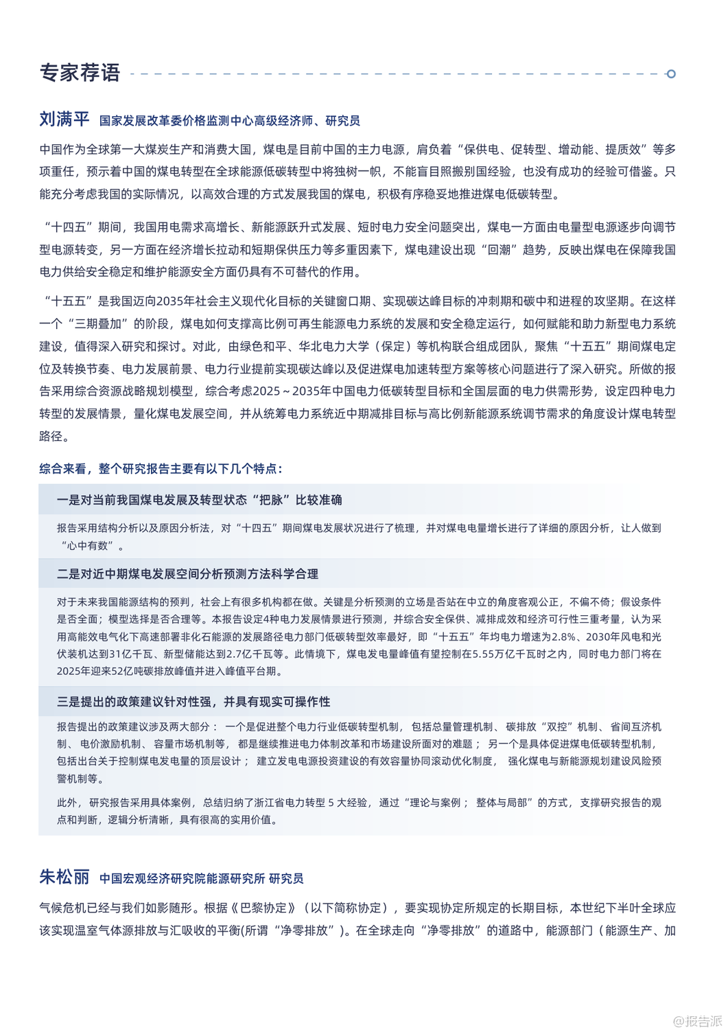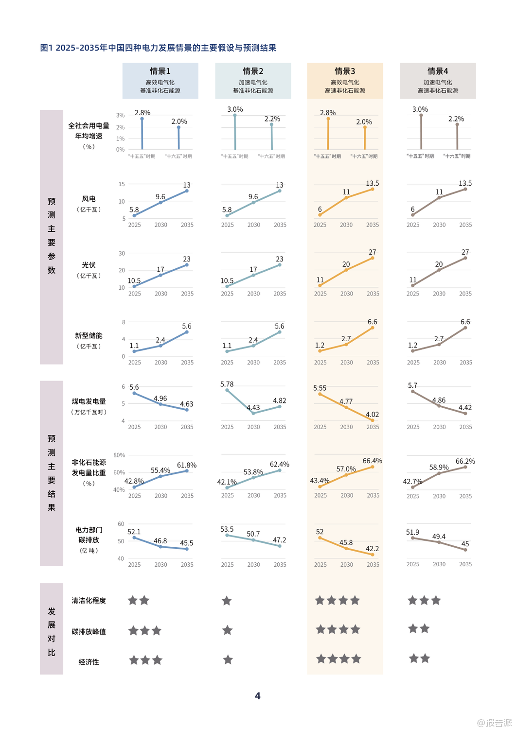 | 中国作为全球第一大煤炭消费国,煤电长期承担着电力系统“保供”与“调峰”的双重角色。 进入“十五五”关键期,如何在保障电力安全的前提下实现低碳转型,成为能源领域的核心议题。 近日,由绿色和平、华北电力大学(保定)等机构联合发布的《2025迈向“十五五”煤电何去何从:转型路径与多元机制研究报告》给出了系统性解答。 报告指出,“十四五”期间,尽管新能源装机迅猛增长,风电光伏累计装机已于2024年历史性超过煤电,但煤电发电量仍持续攀升,2024年达5.5万亿千瓦时,占总发电量超五成。 这背后既有经济增长、电能替代加速的驱动,也暴露出新能源消纳难、系统灵活性不足的深层矛盾。 更值得关注的是,煤电利用小时数回升至4500小时以上,部分省份甚至出现煤电建设“回潮”,新核准装机达2.78亿千瓦,为“十三五”时期的近两倍,这无疑加大了碳达峰目标的实现难度。 面向2025-2035年,报告通过构建四种发展情景,明确指出电力行业有望在2025年提前实现碳达峰。 其中,最优路径为“高能效电气化+高速部署非化石能源”(情景3)。 在此情景下,煤电发电量峰值可控制在5.55万亿千瓦时以内,电力碳排放将于2025年达峰于52亿吨,此后稳步下降。 到2030年,非化石能源发电量比重将提升至57%,风电光伏装机达31亿千瓦,新型储能达2.7亿千瓦。 报告强调,煤电的未来不在“电量”而在“电力”。 其角色必须从“电量型电源”向“基础保障型和系统调节型电源”加速转型。 这意味着煤电将更多承担顶峰保供、深度调峰、应急备用等功能,利用小时数将逐步走低。 为此,报告呼吁建立多元协同机制:一是强化煤电与新能源的总量协同滚动管理,避免无序扩张;二是探索电力碳排放“双控”机制,将碳强度作为约束性指标;三是完善省间互济机制,提升跨区域资源优化配置能力;四是深化电价激励与容量市场机制,让提供可靠容量和灵活调节服务的机组获得合理回报。 以浙江为典型案例,报告展示了转型的可行路径:通过严控煤电规模、大力发展海上风电与分布式光伏、强化省间电力互济(如与安徽开展电力置换)、并依托成熟的电力市场机制实现新能源100%消纳,浙江已实现新能源装机反超煤电,为全国提供了“受端电网”转型样板。 总而言之,煤电转型是一场“先立后破”的系统性工程。 唯有在需求侧坚持节能优先、提升能效,在供给侧加速清洁能源替代,并同步构建适应高比例新能源的新型电力系统与市场机制,才能真正实现安全、低碳、经济的“不可能三角”平衡,为中国碳中和目标奠定坚实的电力基石。 出品方:绿色和平 发布时间:2025年 文档页数:40页