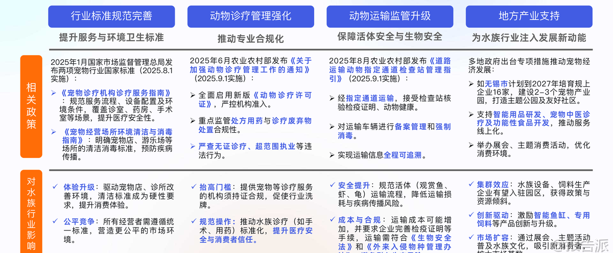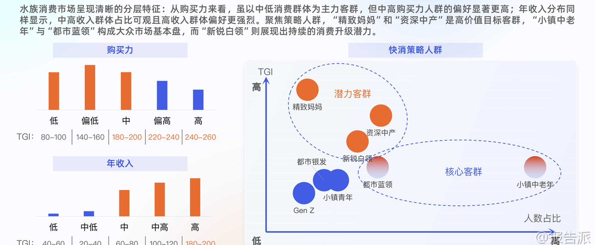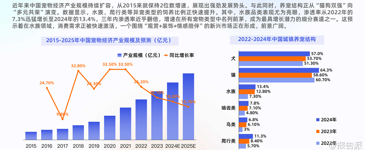 | 近年来,中国宠物经济持续高速增长,自2015年以来始终保持两位数增速,展现出强劲的发展势头。 在传统“猫狗双强”的养宠格局之外,异宠品类迅速崛起,其中水族宠物表现尤为亮眼。 数据显示,水族宠物的渗透率从2022年的7.3%跃升至2024年的13.4%,三年内近乎翻倍,成为增速最快的细分赛道之一。 这一增长不仅反映了消费者对观赏性、装饰性和情感陪伴需求的提升,也预示着一个融合美学与生活方式的新兴市场正在成型。 政策层面的持续规范为水族行业的健康发展注入新动能。 2025年,国家市场监管总局和农业农村部陆续出台多项标准与管理通知,涵盖宠物诊疗服务指南、经营场所清洁消毒、动物运输通道监管等方面,推动行业向规范化、专业化、高质量方向发展。 这些政策提升了服务标准与生物安全水平,强化了诊疗合规性,并通过地方产业支持措施,如无锡市规划建设宠物产业园区、鼓励智能用品研发等,进一步优化了消费环境与产业生态。 从消费者画像来看,水族消费仍以男性为主力,但女性群体、中老年用户及亲子家庭正成为增长新引擎。 35-49岁人群为核心消费群体,50岁以上银发族增速超20%,养育期家庭占比近50%,TGI高达160-180,显示出强烈的亲子陪伴与教育需求。 高净值人群如精致妈妈、资深中产、新锐白领展现出显著的消费升级潜力,推动市场向品质化、专业化演进。 消费行为上,水族用户普遍具备较强的专业知识和理性务实倾向。 饲养经验超过三年的资深爱好者占比超五成,他们更关注水质管理、存活率、疾病防治和日常维护四大核心痛点。 购买决策高度线上化,近六成用户首选淘宝、天猫等综合电商平台,售后保障(27.63%)和性价比(24.34%)是首要考量因素,凸显消费者对风险规避与成本控制的重视。 水族市场已形成覆盖“吃、住、用、医、护”全链路的成熟生态。 其中,活体作为产业链起点,呈现“量价齐升”态势,鱼类仍是主流,但蟹类、珊瑚/海葵等异宠增速领先,反映出养宠需求向个性化、多元化转变。 价格带方面,10-200元中低价位占据七成以上市场份额,但高端化趋势明显,尤其在海水缸、稀有品种等领域,消费升级动力强劲。 水族用品市场由用户规模扩大与忠诚度提升驱动,增长动能正从泛用品普及转向细分场景驱动。 过滤设备、温控系统、照明器材等生命维持类设备占据主导地位,而龟缸、桌面缸、智能一体化鱼缸等细分品类增速迅猛。 消费者在选购时注重性价比、品质可靠与服务省心,尤其偏好集成化、智能化、便捷化的产品设计。 例如,“三合一”过滤系统、支持手机远程控制的智能鱼缸、自动喂食器和换水器等产品广受欢迎,契合“懒人养宠”趋势。 造景及耗材类需求旺盛,自然风格、原生风格和生态功能主题成为主流。 消费者倾向于使用活体水草、天然石材、底砂等材料打造仿自然景观,追求美学表达与生态自净能力并重。 生态功能型造景强调系统稳定性,可实现低维护甚至无额外操作的自循环模式,深受都市忙碌人群青睐。 水族食品市场同样迎来结构性升级。 观赏鱼饲料仍占主导,但龟粮、虾蟹饲料增长迅猛。 消费者在确保饲料“不污染水、不混水”的基础上,越来越关注适口性、颗粒大小、专宠专用配方及营养成分透明度。 高蛋白、增色、益生菌等功能性饲料受到追捧,原料如螺旋藻、虾青素、鱼粉等被广泛应用于专业配方中。 冻干、膨化、低温熟化等工艺技术的应用,提升了营养价值与投喂体验。 总体来看,2025年水族市场正处于高速扩容与深度升级并行的关键阶段。 一方面,政策规范与产业支持为行业发展提供长期利好;另一方面,消费者需求日益多元、专业且精细化,推动产品创新向智能化、集成化、场景化方向演进。 未来,围绕“情感陪伴+家居美学+科学养护”的价值闭环,水族产业有望成长为宠物经济中最具潜力的增长极之一。 本文由【报告派】研读,输出观点仅作为行业分析! 原文标题:2025-11-14-炼丹炉&淘天集团&宠物-宠物行业:2025水族市场消费趋势洞察 发布时间:2025年 出品方:炼丹炉