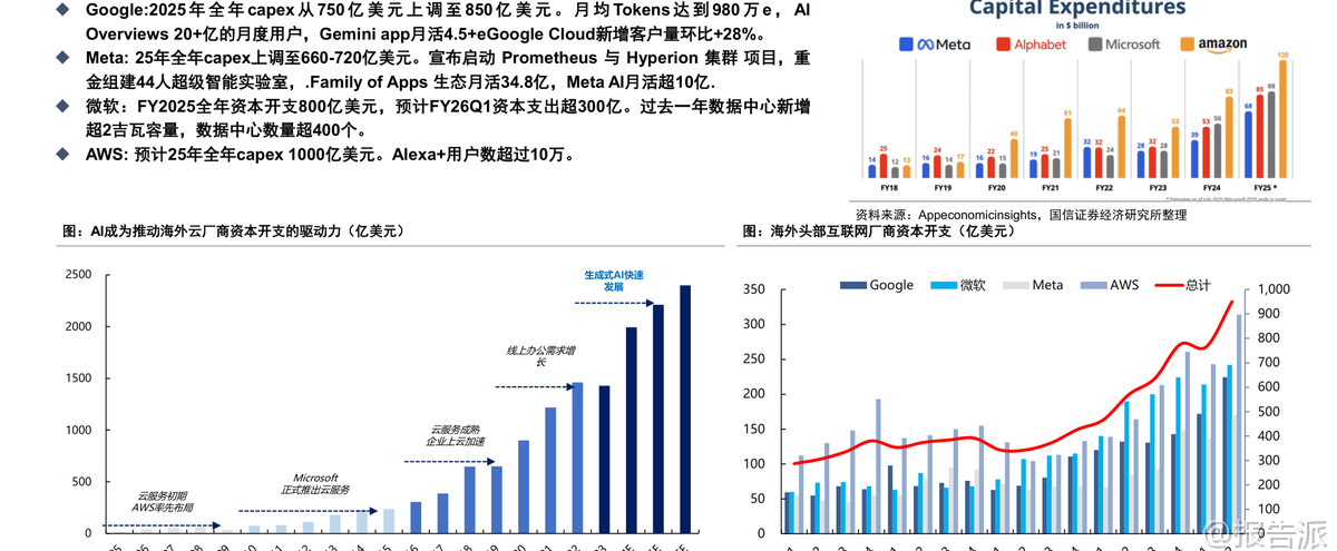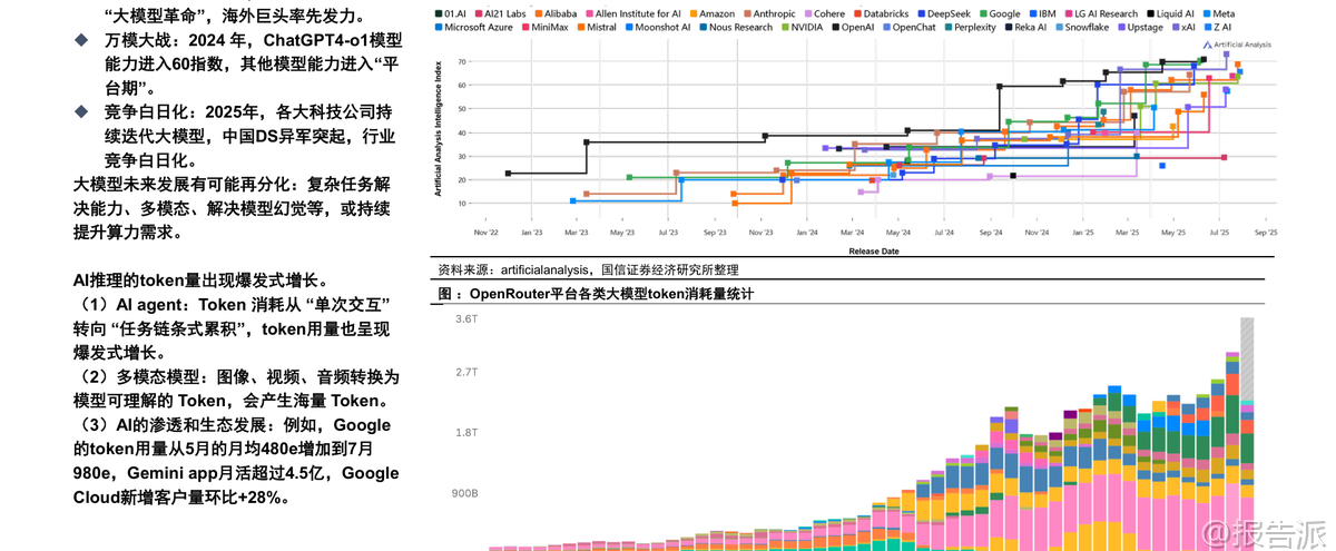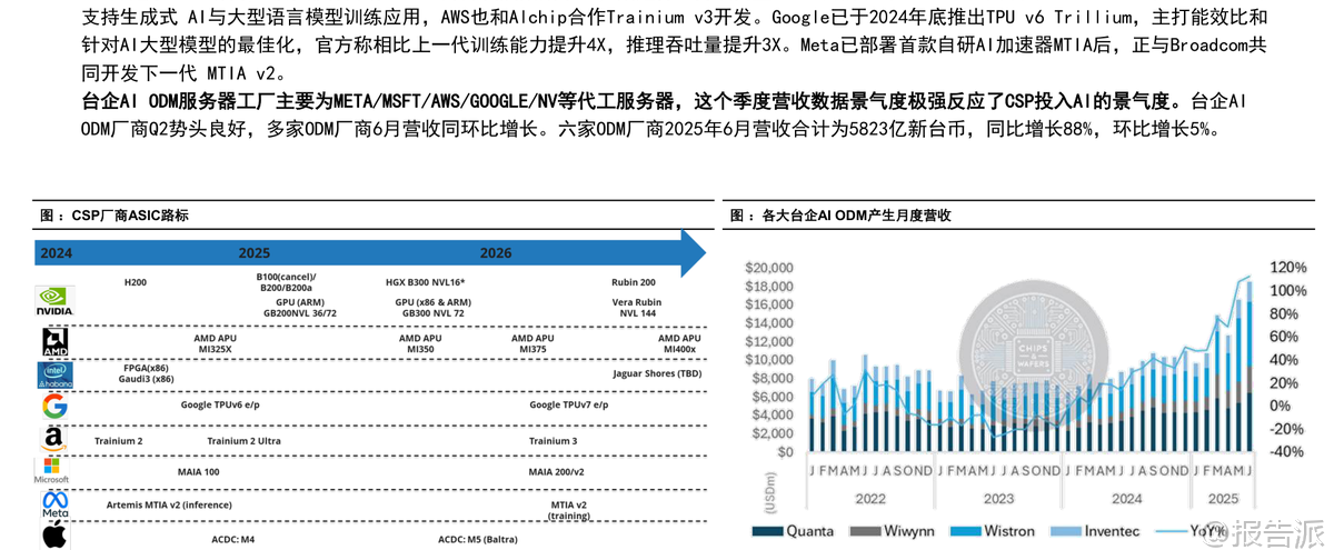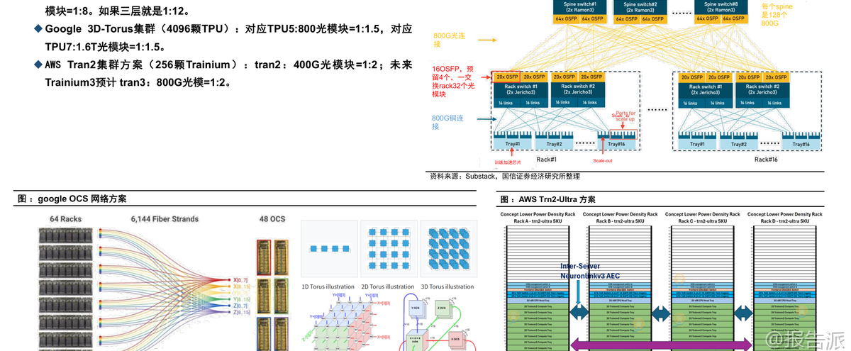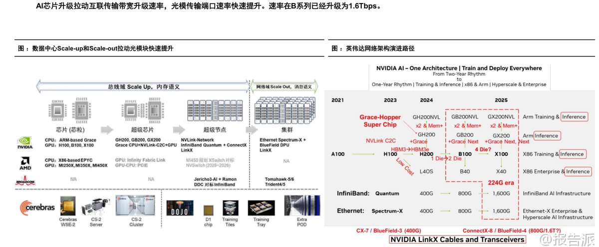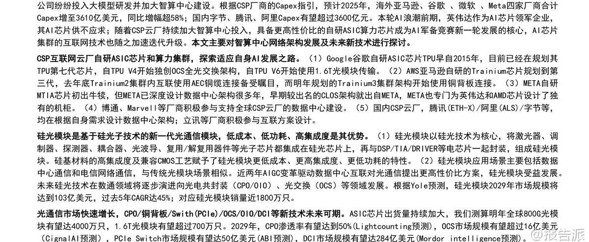 | 在人工智能(AI)技术迅猛发展的背景下,全球科技巨头正加速布局AI算力基础设施,推动数据中心网络架构的快速迭代升级。 根据国信证券发布的《【国信通信·2026年策略会发言】光通信持续高景气,为AI算力互联铺路》报告,当前AI已进入“军备竞赛2.0”时代,以谷歌、亚马逊、微软、Meta为代表的海外云厂商和以字节、腾讯、阿里为代表的国内CSP企业纷纷加大资本开支,构建自研AI芯片与算力集群体系,从而带动光通信产业链进入新一轮高速增长周期。 报告指出,2025年海外四大云厂商(AWS、Google、微软、Meta)合计资本支出预计达3610亿美元,同比增长超58%;而国内字节、腾讯、阿里Capex有望突破3600亿元。 这一轮AI浪潮不仅拉动了英伟达GPU的需求,更催生了各大云厂对高性价比自研ASIC芯片的强烈需求。 例如,谷歌已规划至第七代TPU,并从TPU V4起采用全光交换架构(OCS),TPU V6开始使用1.6T光模块;亚马逊Trainium系列芯片逐步向铜背板连接演进;Meta则设计了专属机柜支持多类型AI芯片。 这些技术创新背后,是对更高带宽、更低延迟、更优能效的数据中心互联方案的迫切需求。 在此背景下,光通信作为AI算力互联的核心支撑技术,展现出强劲增长动能。 其中,硅光模块凭借其低成本、低功耗、高集成度等优势,成为下一代光通信的关键方向。 硅光技术通过将激光器、调制器、探测器、波导等光学元件集成于单一硅基芯片上,兼容CMOS工艺,显著降低了封装复杂度与制造成本。 据测算,800G硅光模块相比传统方案可降低成本约20%,功耗降低近40%。 Lightcounting预测,到2029年硅光模块在全球光模块市场中的份额将从2023年的34%提升至52%,市场规模达到103亿美元,过去五年复合增长率高达45%。 与此同时,光通信前沿技术正朝着CPO(光电共封装)、OIO(光输入输出)、OCS(全光交换)、DCI(数据中心互联)等方向快速发展。 CPO技术通过将光学组件直接集成到交换机或ASIC芯片封装内,大幅缩短电互连距离,降低功耗与信号损耗,被视为1.6T及以后速率时代的确定性路径。 台积电已将其列为下一代AI平台核心技术之一,预计2026年起量。 OIO则进一步实现芯片间的光互联,Ayar Labs、博通、Intel等厂商已在推进相关产品落地。 谷歌引领的OCS全光交换架构已在TPU集群中应用,未来有望替代传统电交换成为主流。 此外,PCIe Switch作为服务器内部解耦利器,也在加速普及,ABI预测其市场规模2029年将达50亿美元。 在物理层连接方面,高密度光连接器正由MPO向MMC演进。 MMC连接器在相同空间下可提供三倍于MPO的光纤密度,更适合1.6T及以上高速场景部署。 而在短距互联中,铜缆与铜背板方案仍具成本优势,英伟达GB300 Kyber机柜即采用正交铜背板设计,立讯精密等厂商也推出了整机柜级铜连接解决方案。 国内市场同样呈现百花齐放态势。 腾讯ETH-X、阿里ALS、字节“大禹”液冷整机柜等定制化智算中心方案不断涌现,推动本土光模块厂商如中际旭创、新易盛、光迅科技、华工科技等全面布局硅光与CPO技术。 从全球格局看,中国光模块企业已占据TOP10中的7席,完成“东升西落”的产业转移。 这背后是每两年一次的技术迭代驱动下的格局重塑——从100G硅光导入,到400G PAM4普及,再到800G规模商用、1.6T即将起量,每一次变革都带来新的机会窗口。 展望未来,随着AI推理Token消耗爆发式增长、多模态模型普及以及Agent类应用兴起,算力需求将持续攀升。 光通信不仅是AI基础设施的“血管”,更是决定算力效率与成本的关键环节。 硅光、CPO、OIO、OCS等新技术的融合演进,将为超大规模智算中心提供更高效、绿色、可扩展的互联底座。 然而,报告也提示需关注AI投资不及预期、行业竞争加剧、地缘政治风险及技术路线变迁带来的不确定性。 总体来看,在AI长期趋势不可逆的大背景下,光通信行业正处于景气周期的上升通道,技术创新与产业链协同将成为决胜下一阶段的关键力量。 本文由【报告派】研读,输出观点仅作为行业分析! 原文标题:【国信通信·2026年策略会发言】光通信持续高景气,为AI算力互联铺路 发布时间:2025年 报告出品方:国信证券