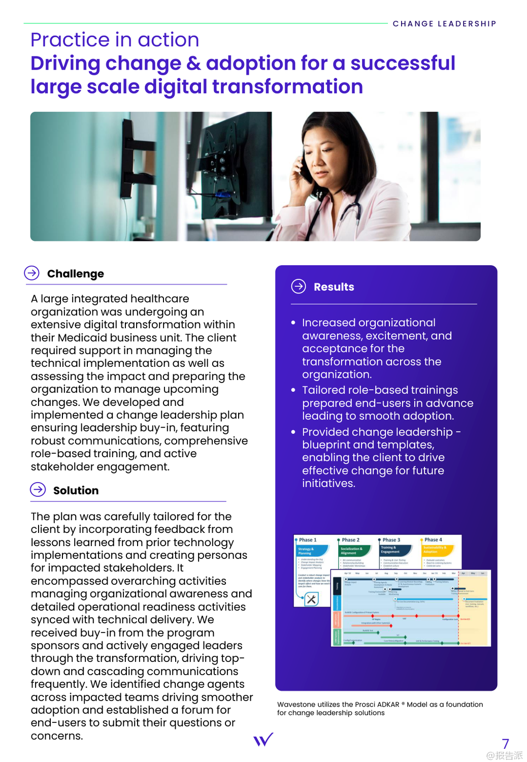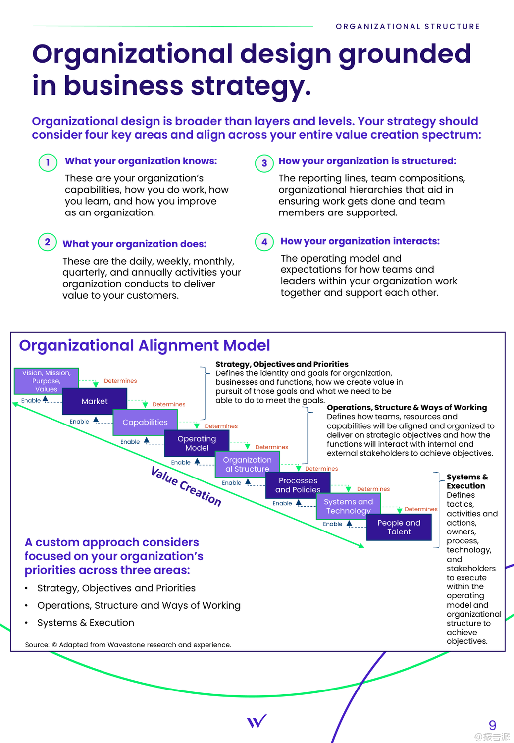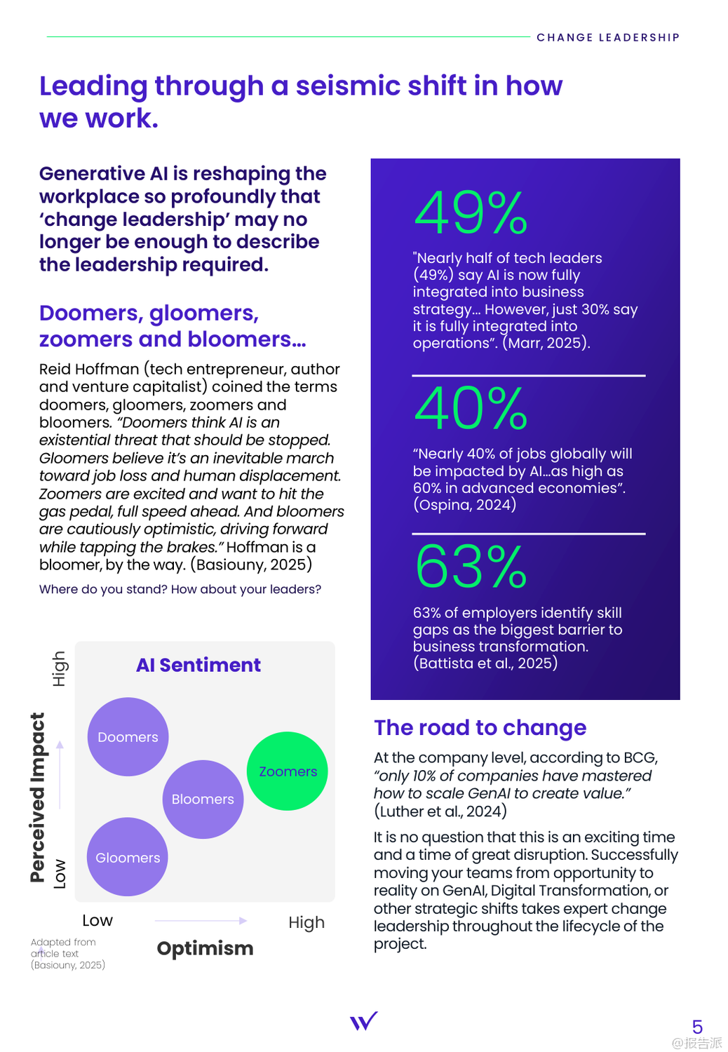 | 随着生成式人工智能(GenAI)技术加速融入企业战略,组织正面临前所未有的变革压力。 Wavestone发布的《2025-2030未来工作:人才、人工智能与变革领导力的执行策略》报告指出,企业要在未来十年保持竞争力,必须聚焦四大核心领域:变革领导力、组织结构重塑、人才韧性建设以及敏捷文化的打造。 首先,变革领导力已成为AI时代的核心能力。 报告强调,传统的“变更管理”已不足以应对当前的颠覆性变化。 引用科技企业家Reid Hoffman提出的分类,领导者可分为“末日论者(Doomers)”、“悲观者(Gloomers)”、“激进派(Zoomers)”和“乐观实践者(Bloomers)”。 企业需要更多“Bloomers”——即那些既积极拥抱AI又谨慎推进的领导者。 数据显示,尽管49%的技术领导者认为AI已完全融入业务战略,但仅有30%实现了运营层面的整合,凸显出战略与落地之间的巨大鸿沟。 成功的变革需贯穿员工情绪周期,从震惊、否认到实验、决策再到最终整合,领导者必须通过沟通、培训与支持,帮助团队平稳过渡。 其次,组织结构亟需为速度与协同而重新设计。 报告提出“组织对齐模型”,强调战略、运营、系统与人才四大要素的联动。 僵化的层级结构难以适应快速迭代的需求。 为此,Wavestone推出了为期12周的“组织加速器(Org Accelerator)”计划,帮助企业评估现状、重构运营模式、优化流程与角色配置。 案例显示,某医疗集团通过该方案实现3:1的投资回报率,显著提升了决策效率与跨部门协作能力。 第三,人才战略必须面向未来。 终身雇佣制逐渐被灵活发展路径取代,企业需思考如何在短期内培养关键人才并激励其留下。 报告建议通过高潜人才计划(HIPO)、导师制、技能再培训等方式构建内部人才供应链。 同时,要明确哪些能力需自建,哪些可通过外部引进。 领导力发展也正在演变——哈佛商学院研究指出,除了传统的自信与决断力,包容性、倾听能力与真实性已成为“高管风范”的重要组成部分。 转型型领导者应能激发团队创新,在持续变化中保持凝聚力。 最后,构建敏捷、数据驱动的文化至关重要。 企业需鼓励好奇心与“快速失败”的勇气,建立心理安全环境,让员工敢于尝试。 决策机制也应结构化,推动“小步快跑”的实验文化。 文化成熟度分为四个阶段:随机发生、依赖领导、普遍嵌入与自我维持。 理想状态是将敏捷思维融入日常运作,不依赖个别领导者推动。 一个全球制造企业的案例表明,通过简化战略传达、创建清晰术语表和加强新领导融合机制,成功激活了组织对变革的响应力。 总体而言,面对2030年的职场图景,企业不能仅依赖技术升级,更需系统性地重塑领导方式、组织形态与人才生态。 唯有如此,才能在AI驱动的变革浪潮中真正实现可持续增长。 出品方:Wavestone 发布时间:2025年 文档页数:21页