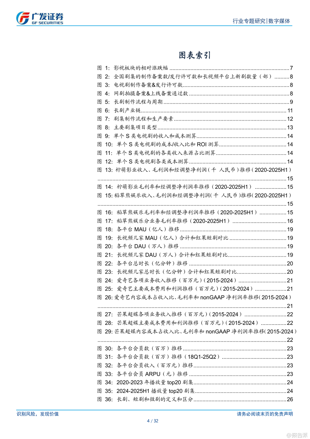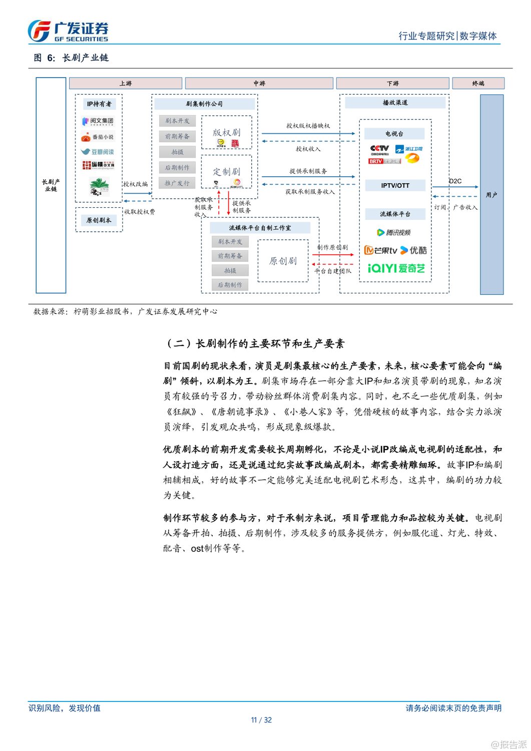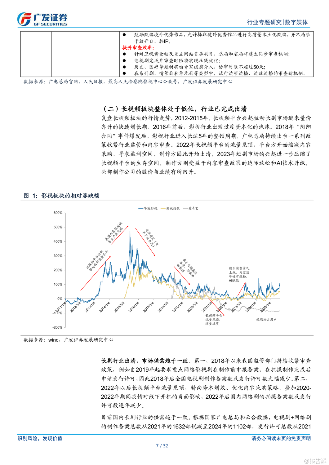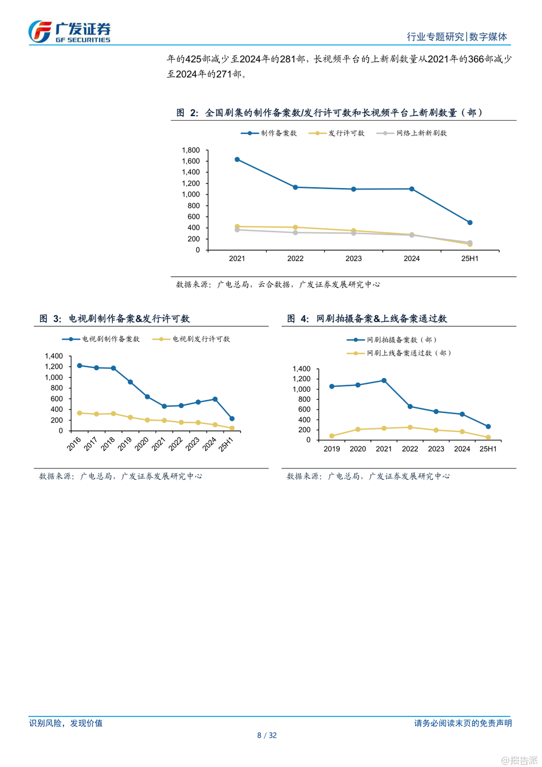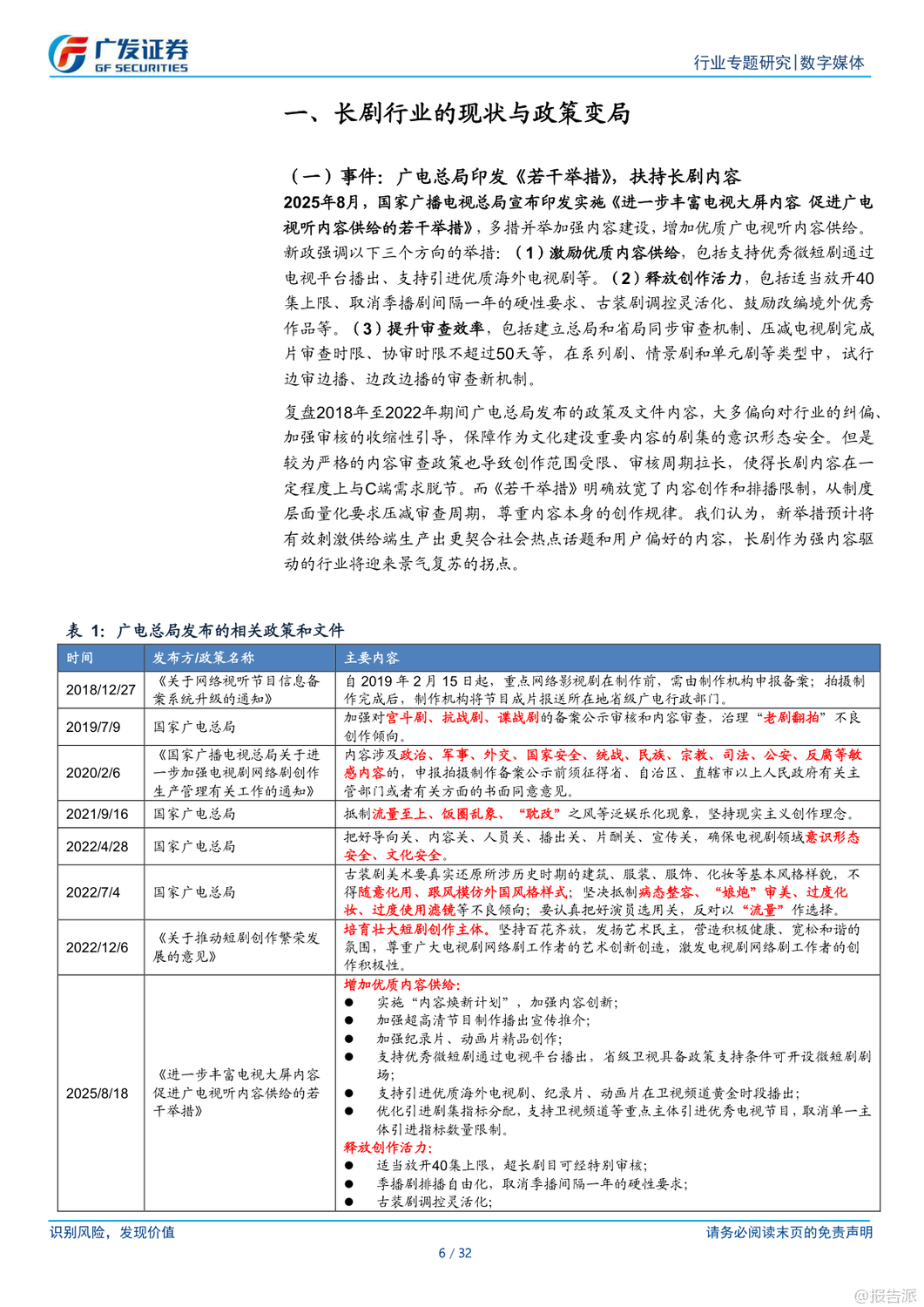 | 长视频行业正站在复苏的拐点。 近期,国家广播电视总局印发《进一步丰富电视大屏内容促进广电视听内容供给的若干举措》,释放出强烈政策利好信号,标志着长剧内容创作迎来新一轮发展机遇。 这份由广发证券发布的《2025年数字媒体行业文艺复兴系列报告之一》指出,历经多年监管收紧与市场出清,行业供需已趋于平衡,内容供给侧有望迎来繁荣。 政策层面的重大转变是本次复苏的核心驱动力。 新规在三个方面显著松绑:一是激励优质内容供给,支持优秀微短剧上星播出、引进优质海外剧集;二是释放创作活力,适当放开40集上限、取消季播剧一年间隔限制、推动古装剧调控灵活化,并鼓励改编境外优秀作品;三是提升审查效率,建立总局与省局同步审查机制,协审时限不超过50天,并试点“边审边播、边改边播”的新模式。 这些举措将有效缩短制作周期,提升内容时效性与创作自由度。 从产业链看,长剧制作链条长且复杂,视频平台深度参与已成为常态。 目前剧集主要分为版权剧、原创剧和分账剧三类。 头部平台如爱奇艺、腾讯视频等纷纷自建工作室,主导原创剧开发,强化内容控制力与IP衍生能力。 与此同时,上游制作公司格局洗牌完成,华策影视、柠萌影视、新丽传媒(阅文旗下)等一线厂牌持续输出精品,而欢瑞世纪、百纳千成等经历调整后也逐步进入产能恢复期。 尽管面临微短剧的冲击,长视频平台展现出较强韧性。 2025年上半年,爱优腾芒MAU合计达12.1亿,虽同比略有下滑,但用户基础依然稳固。 经营层面,会员收入仍是核心支柱,但增长遇瓶颈,关键在于提升内容吸引力与用户留存。 数据显示,爆款剧如《狂飙》《庆余年2》仍具强大拉新能力,证明优质内容的价值未减。 值得注意的是,S类头部剧集盈利能力更强,平台正将预算集中于高规格项目,压缩中小成本剧投入。 收入来源多元化趋势明显,除会员与广告外,版权分销、IP衍生品(如卡牌、手办)也为项目带来增量收益。 然而,制作方毛利率受平台成本管控影响有所压缩,版权剧毛利率高于定制剧。 展望未来,政策红利将加速内容供给侧回暖,推动平台用户回流与商业化修复。 建议关注爱奇艺、芒果超媒等平台方,以及具备稳定产能的制作公司如柠萌影业、阅文集团、华策影视等。 当然,行业仍面临新兴娱乐形态竞争、监管不确定性及艺人风险等挑战。 总体来看,长剧商业模式正在重构,一场以内容为核心的文艺复兴已然开启。 出品方:广发证券 发布时间:2025年 文档页数:32页