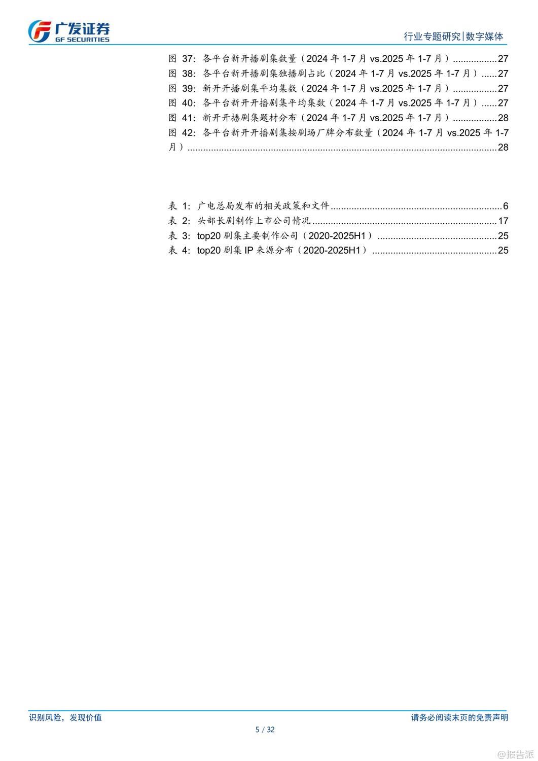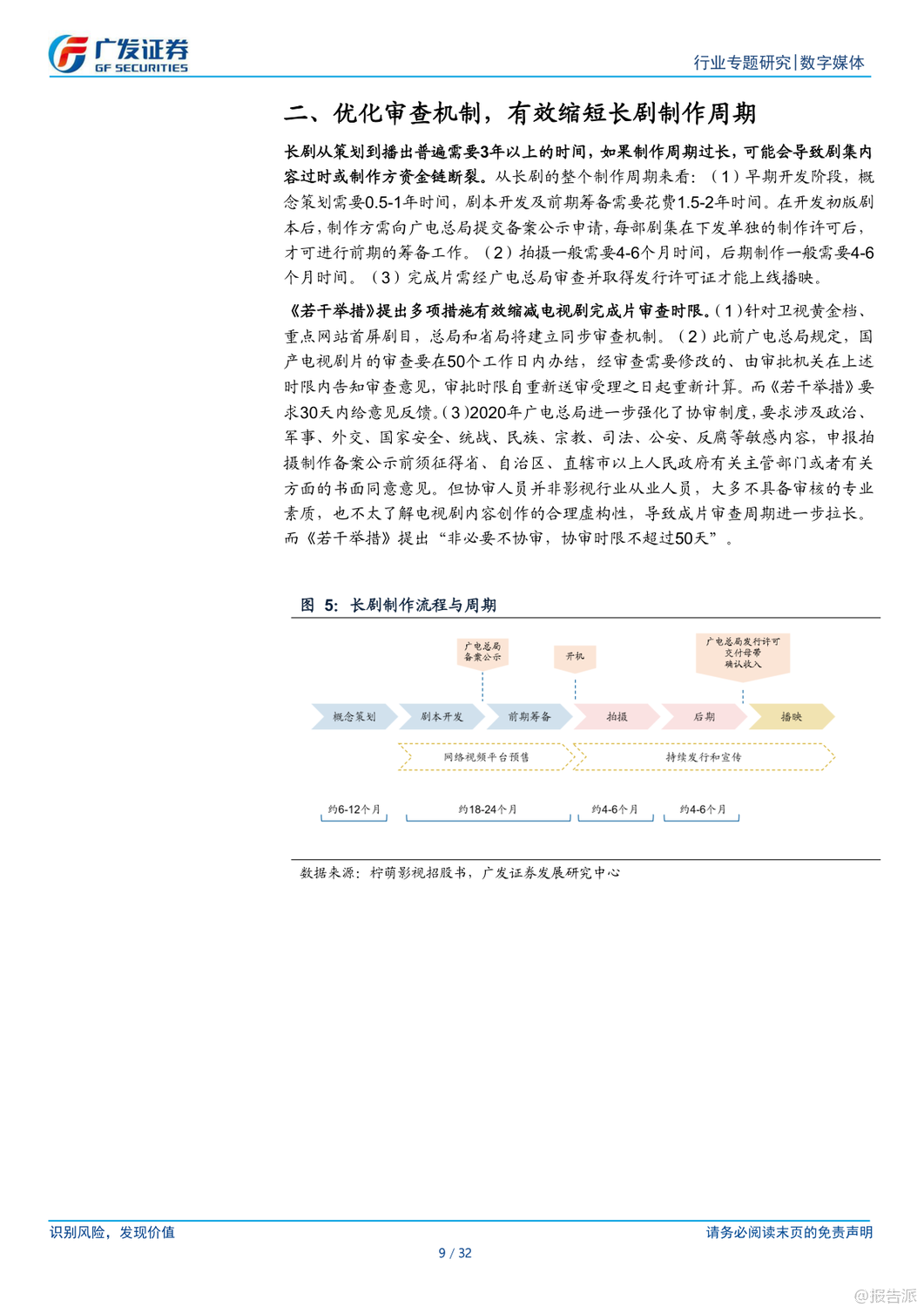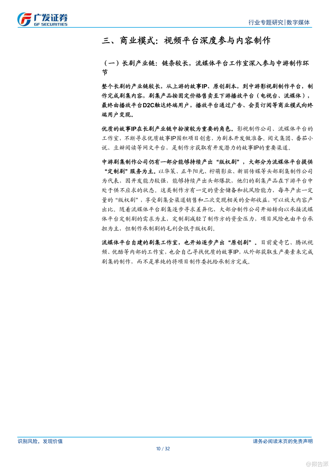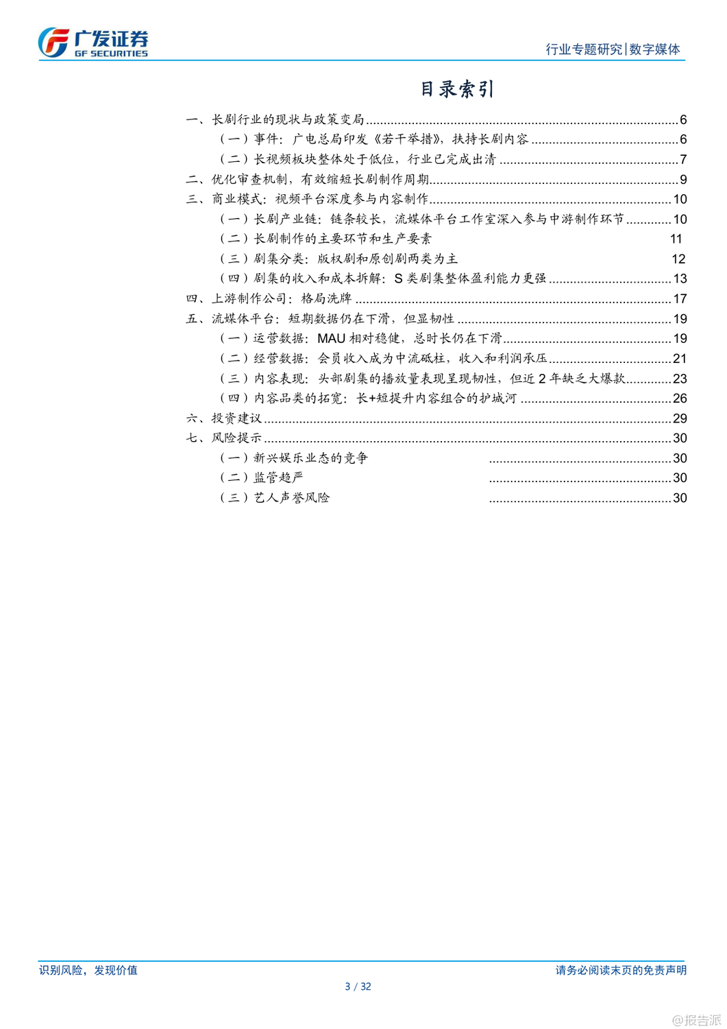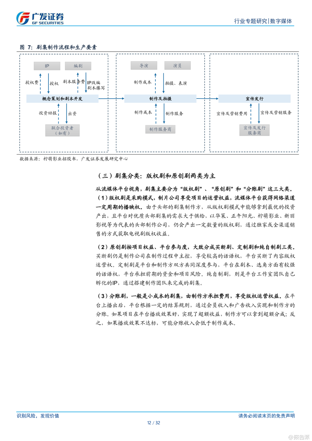 | 长视频行业正站在复苏的拐点。 近期,国家广播电视总局印发《进一步丰富电视大屏内容促进广电视听内容供给的若干举措》,释放出强烈政策利好信号,标志着长剧内容创作迎来新一轮发展机遇。 这份由广发证券发布的《2025年数字媒体行业文艺复兴系列报告之一》指出,历经多年监管收紧与市场出清,行业供需已趋于平衡,内容供给侧有望迎来繁荣。 政策层面的重大转变是本次复苏的核心驱动力。 新规在三个方面显著松绑:一是激励优质内容供给,支持优秀微短剧上星播出、引进优质海外剧集;二是释放创作活力,适当放开40集上限、取消季播剧一年间隔限制、推动古装剧调控灵活化,并鼓励改编境外优秀作品;三是提升审查效率,建立总局与省局同步审查机制,协审时限不超过50天,并试点“边审边播、边改边播”的新模式。 这些举措将有效缩短制作周期,提升内容时效性与创作自由度。 从产业链看,长剧制作链条长且复杂,视频平台深度参与已成为常态。 目前剧集主要分为版权剧、原创剧和分账剧三类。 头部平台如爱奇艺、腾讯视频等纷纷自建工作室,主导原创剧开发,强化内容控制力与IP衍生能力。 与此同时,上游制作公司格局洗牌完成,华策影视、柠萌影视、新丽传媒(阅文旗下)等一线厂牌持续输出精品,而欢瑞世纪、百纳千成等经历调整后也逐步进入产能恢复期。 尽管面临微短剧的冲击,长视频平台展现出较强韧性。 2025年上半年,爱优腾芒MAU合计达12.1亿,虽同比略有下滑,但用户基础依然稳固。 经营层面,会员收入仍是核心支柱,但增长遇瓶颈,关键在于提升内容吸引力与用户留存。 数据显示,爆款剧如《狂飙》《庆余年2》仍具强大拉新能力,证明优质内容的价值未减。 值得注意的是,S类头部剧集盈利能力更强,平台正将预算集中于高规格项目,压缩中小成本剧投入。 收入来源多元化趋势明显,除会员与广告外,版权分销、IP衍生品(如卡牌、手办)也为项目带来增量收益。 然而,制作方毛利率受平台成本管控影响有所压缩,版权剧毛利率高于定制剧。 展望未来,政策红利将加速内容供给侧回暖,推动平台用户回流与商业化修复。 建议关注爱奇艺、芒果超媒等平台方,以及具备稳定产能的制作公司如柠萌影业、阅文集团、华策影视等。 当然,行业仍面临新兴娱乐形态竞争、监管不确定性及艺人风险等挑战。 总体来看,长剧商业模式正在重构,一场以内容为核心的文艺复兴已然开启。 出品方:广发证券 发布时间:2025年 文档页数:32页