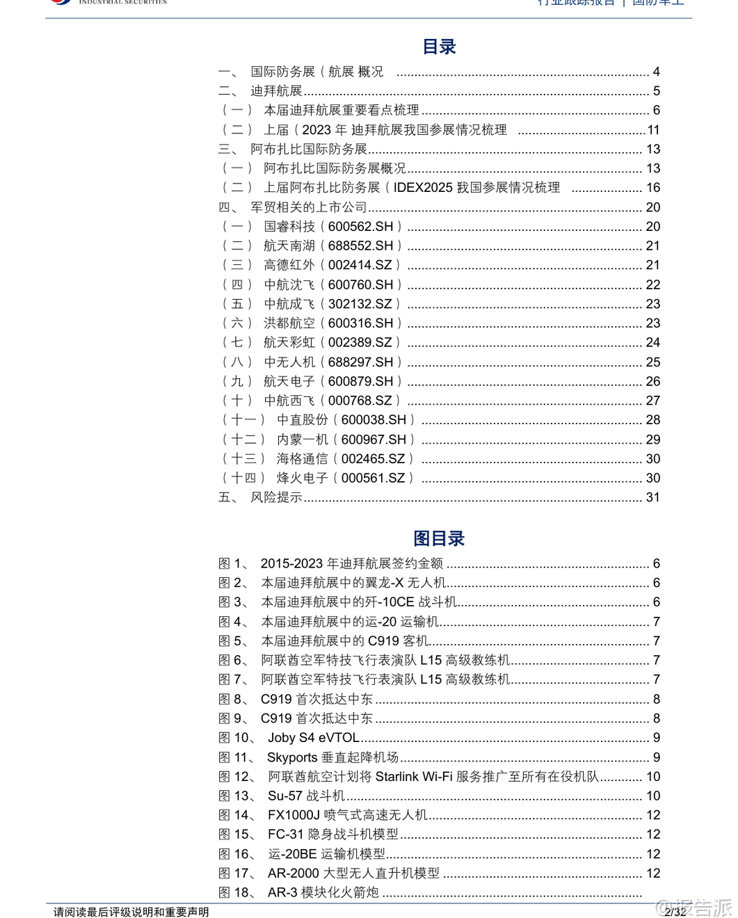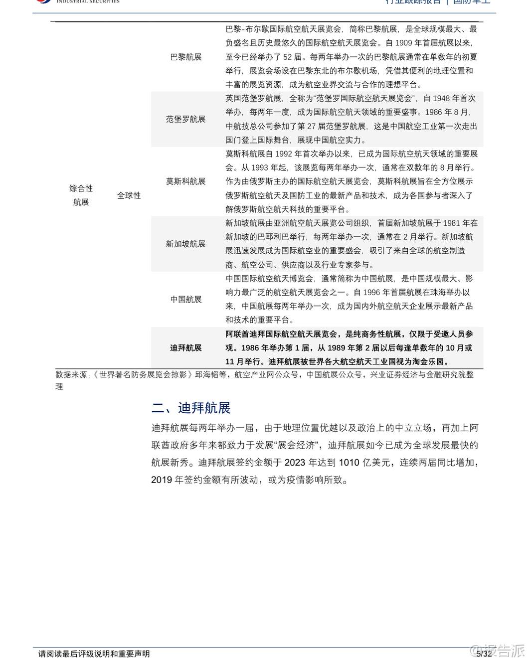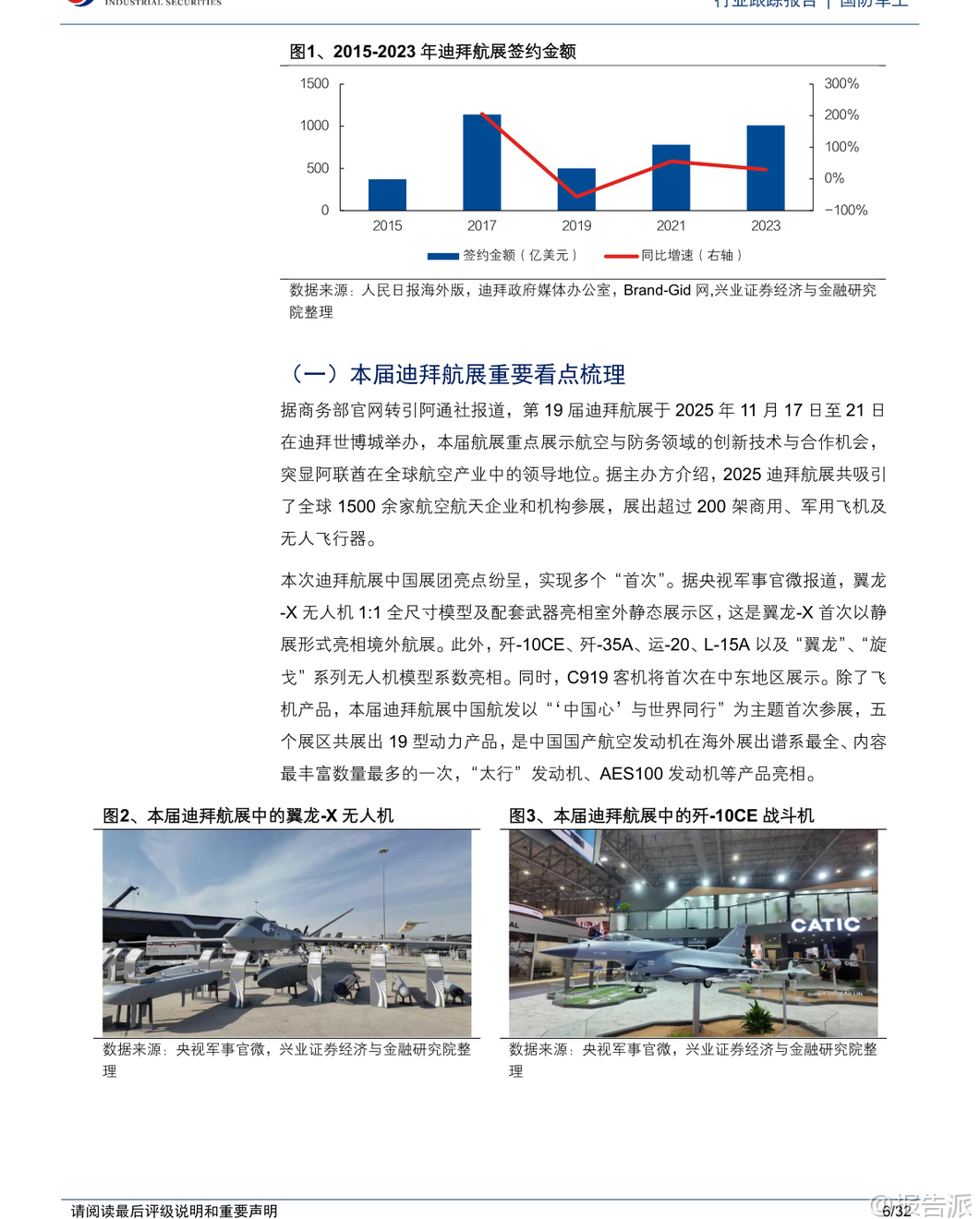 | 第19届迪拜航展于2025年11月17日至21日在迪拜世博城举行,作为全球发展最快的航空防务展会之一,本届航展吸引了来自全球1500余家航空航天企业与机构参展,展出超过200架商用、军用飞机及无人飞行器,成为国际防务合作与技术交流的重要平台。 中东地区凭借其独特的地理优势和中立的政治环境,已成为全球军贸市场最活跃的区域之一,阿布扎比国际防务展(IDEX)与迪拜航展共同构成了该地区两大核心防务展览体系。 本次迪拜航展亮点纷呈,中国展团实现多项“首次”突破。 洪都L-15高级喷气式教练机首次亮相并由阿联酋空军Fursan Al-Emarat特技飞行表演队进行展示,标志着我国高端教练机成功进入中东市场。 C919大型客机首次在中东地区公开展示,彰显国产民机国际化进程加速。 翼龙-X无人机首次以1:1全尺寸模型形式在境外静态展出,代表我国高端察打一体无人机技术水平获得国际关注。 此外,中国航发以“‘中国心’与世界同行”为主题首次独立参展,集中展示了“太行”发动机、AES100等19型动力产品,是我国国产航空发动机在海外展出谱系最全、内容最丰富的一次。 商业航空与低空经济成为本届航展重要看点。 阿联酋航空宣布将在未来几年内为其全部232架现役机队部署Starlink高速Wi-Fi服务,参观者可在波音777-300ER上亲身体验空中互联网。 美国Joby Aviation的S4 eVTOL电动垂直起降飞行器在航展期间进行静态与飞行演示,并计划于2026年在阿联酋获得认证投入使用。 Skyports公司已与阿布扎比合作开发商业垂直起降机场网络,首批两个站点预计2026年初建成,为未来城市空中交通商业化奠定基础。 回顾上届2023年迪拜航展,总签约额达1010亿美元,同比增长29.49%,创下历史新高。 中国参展企业主要为中航技和北方工业,中航技展出了运-20BE大型运输机、AR-2000大型无人直升机等多款主力机型,均为首次亮相;北方工业则重点展示了火箭炮、巡飞弹、制导弹药等地面装备体系。 中国空军八一飞行表演队换装歼-10C后首次海外亮相,同时枭龙Block3战斗机也完成国际首秀,展现我国多用途战机出口竞争力。 阿布扎比国际防务展(IDEX)同样是中东最具影响力的综合性防务展。 2025年2月举办的IDEX2025为历届规模最大,汇聚了来自65个国家的1565家企业,其中731家为首度参展。 阿联酋本土采购总额达251.5亿迪拉姆(约68.53亿美元),同比增长7.75%。 我国9家军贸公司以“中国军工”国家展团形式集体亮相,涵盖隐身战斗机、察打一体无人机、新型防空导弹、模块化装甲车及轻武器等多个领域,全面呈现智能化、无人化发展方向。 中航技在IDEX2025设立三大展区:“无人智战,精确打击”展出旋戈-2000无人直升机;“攻防一体,制胜空天”聚焦FC-31隐身战斗机、歼-10CE、运-20、L15等主战装备;“飞发一体,携手出海”联合中国航发展出“太行”、AEP-100B等五型发动机,体现动力系统自主化进程。 长征国际展出CH-9长航时无人机、HHQ-10E舰空导弹等明星产品。 中国船舶集团展出虎鲸号无人作战艇(JARI-USV-A),排水量约420吨,具备超视距火力打击、反潜攻潜能力,配置通用垂发系统可发射多种导弹。 北方工业推出SH16A型155毫米轮式无人炮塔火炮系统,配备智能火控与模块化装填装置,支持远程操控与协同作战,已完成研制可随时量产。 上市公司方面,报告建议关注中航沈飞、洪都航空、中航成飞、中航西飞、中直股份、国睿科技、航天南湖、航天电子、中无人机、航天彩虹、高德红外、内蒙一机等具备军贸潜力的企业。 需注意的是,军贸业务受进口国政治、经济、财政状况及第三方干预影响较大,谈判周期长、不确定性高,且订单存在被延期、取消或无法回款的风险。 国内军工企业利润模式与国际同行存在差异,主要通过军贸公司对接外方客户并管控风险。 总体来看,迪拜航展与阿布扎比防务展已成为观察全球防务格局演变的重要窗口。 中国军工企业正加快“走出去”步伐,在无人机、教练机、运输机、雷达、动力系统等领域取得实质性突破,逐步构建起覆盖海陆空天电的完整出口体系。 随着“一带一路”沿线国家装备升级需求上升,我国军贸市场前景广阔,但同时也面临地缘政治复杂性带来的挑战。 本文由【报告派】研读,输出观点仅作为行业分析! 原文标题:原文标题:2025-11-20-兴业证券-兴业证券-国防军工行业跟踪报告:迪拜航展盛大召开,防务观察迎新窗口 发布时间:2025年 报告出品方:兴业证券 文档页数:32页