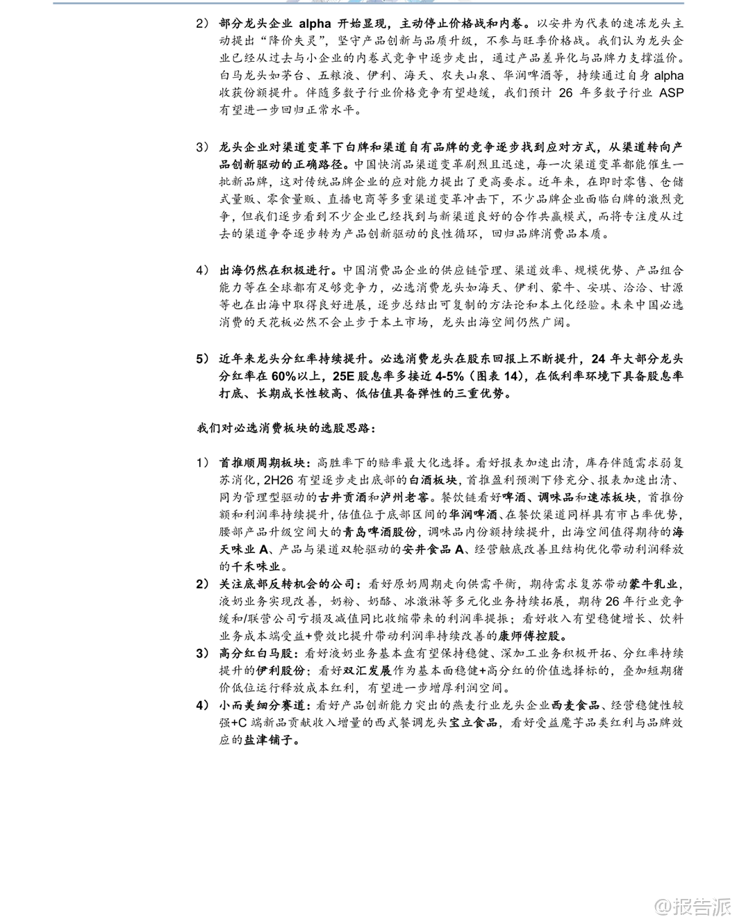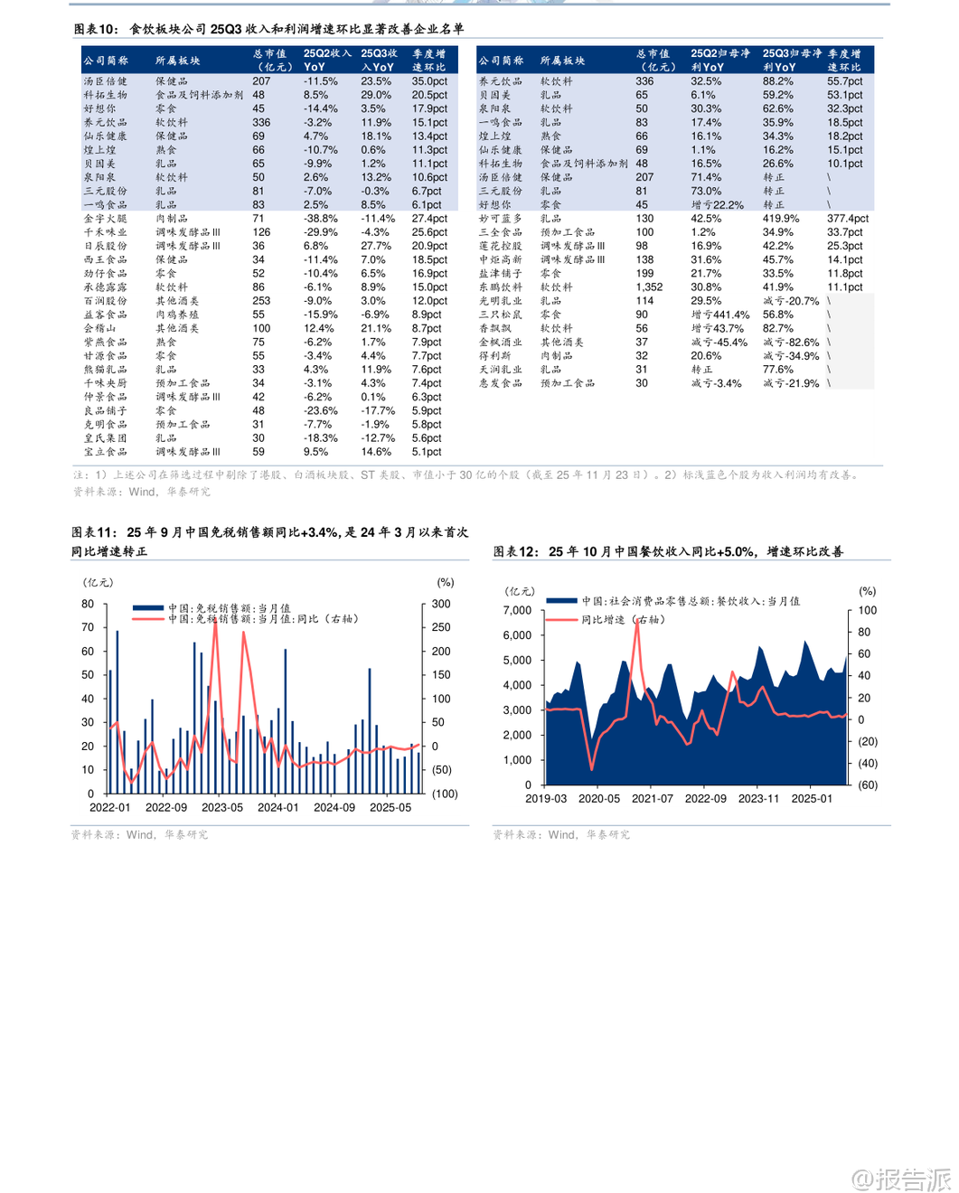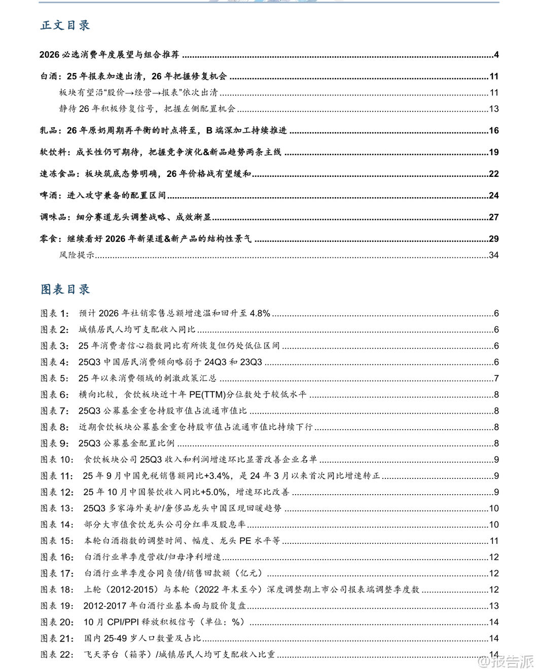 | 2025年,中国消费市场在曲折中实现温和复苏,社会消费品零售总额同比增长4.3%,但整体呈现“前高后低”走势,居民消费意愿偏弱导致复苏强度不及预期。 展望2026年,华泰证券认为必选消费有望迎来温和复苏,当前板块已步入胜率较高的左侧底部区间,建议积极布局。 核心观点指出,地产周期尤其是房价变化仍是判断2026年消费复苏力度的关键变量。 华泰宏观预测,人口流入城市的房价有望在2026年下半年企稳,将有效改善居民资产负债表,提升边际消费倾向。 同时,供给侧改革与需求端刺激政策双轮驱动,如“十五五”规划强调扩大优质供给、清理不合理消费限制,叠加可能的非国补类消费刺激延续,有望提振居民消费信心。 综合来看,2026年消费复苏预计将呈现“温和渐进”特征。 从自下而上视角看,部分必选消费子行业已现基本面触底改善的曙光。 2025年第三季度,白酒、乳品等板块报表加速出清,库存压力缓解;部分可选消费如免税、酒店、奢侈品龙头已率先回暖。 速冻食品因价格战缓和与新品驱动,收入出现改善迹象。 龙头企业正主动停止内卷式价格战,转向产品创新驱动,通过差异化与品牌力建立竞争壁垒。 同时,传统品牌企业逐步适应渠道变革,在即时零售、零食量贩等新渠道中找到合作模式,回归品牌本质。 此外,龙头企业分红率持续提升,2024年多数龙头分红率超60%,2025年预期股息率接近4-5%,在低利率环境下具备显著吸引力。 具体到各细分赛道:白酒行业处于深度调整磨底阶段,估值、筹码、配置比例均已至历史低位。 股价或先于经营与报表修复,2026年随着需求回补,行业有望逐步走出底部。 推荐关注管理能力突出、报表出清充分的古井贡酒、泸州老窖。 乳品方面,原奶周期预计在2026年再平衡。 上游奶牛存栏持续去化,下游乳企库存健康,静待终端需求复苏。 深加工业务(如奶酪、乳蛋白)国产替代逻辑加速演绎,为行业打开新增长空间。 推荐蒙牛乳业、伊利股份。 啤酒行业进入攻守兼备配置区间。 2026年需求缓慢复苏,成本红利边际减弱但企业理性竞争支撑利润韧性。 全国性龙头华润啤酒、青岛啤酒兼具顺周期弹性与高股息价值,区域龙头燕京啤酒、珠江啤酒凭借质价比大单品延续成长性。 调味品行业存量竞争加剧,龙头企业通过渠道深耕与费用投放巩固份额。 海天味业市占率提升,千禾味业经历短期舆情冲击后经营环比改善,监管趋严有利于零添加赛道长期健康发展。 推荐海天味业、千禾味业。 速冻食品板块筑底态势明确,2025年价格战未进一步加剧,主要企业控费保利,利润同比转正。 餐饮缓慢恢复托底B端需求,山姆、零食量贩等新渠道打开增量空间。 预计2026年价格战有望缓和,盈利能力修复可期。 重点推荐龙头安井食品。 软饮料行业成长性仍可期待,重点关注竞争演化与新品趋势。 瓶装水行业集中度提升,农夫山泉龙头地位稳固;无糖茶东方树叶领跑,下沉市场潜力大;功能饮料东鹏表现亮眼;NFC果汁、HPP果汁、养生水等新品类具备结构性机会。 推荐康师傅控股。 零食行业继续看好新渠道与新产品的结构性景气。 零食量贩店进入质量增长阶段,利润率加速释放;抖音渠道由放量转向品宣与利润平衡;会员制商超仍是高势能渠道。 品类上,魔芋零食凭借健康属性高速增长,麦片行业向功能化、高端化升级。 推荐盐津铺子、西麦食品、宝立食品。 投资主线方面,首推高赔率的顺周期板块,包括白酒、啤酒、调味品、速冻食品,个股推荐古井贡酒、泸州老窖、华润啤酒、青岛啤酒、海天味业、安井食品、千禾味业。 其次看好基本面拐点型低估值公司,推荐康师傅控股、蒙牛乳业。 同时推荐股息率打底、业绩稳健的白马龙头伊利股份、双汇发展。 关注小而美的细分成长龙头西麦食品、宝立食品、盐津铺子。 风险提示包括:宏观经济复苏不及预期、行业竞争加剧、食品安全问题及成本波动超预期。 本文由【报告派】研读,输出观点仅作为行业分析! 原文标题:原文标题:2025-11-26-华泰证券-华泰证券-食品饮料行业必选消费2026年度策略:冬藏伺机,春归可期 发布时间:2025年 报告出品方:华泰证券 文档页数:37页