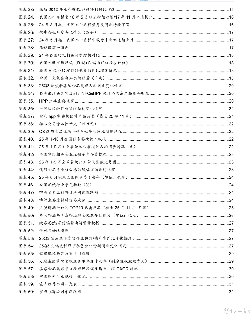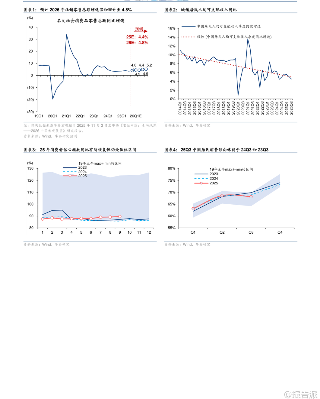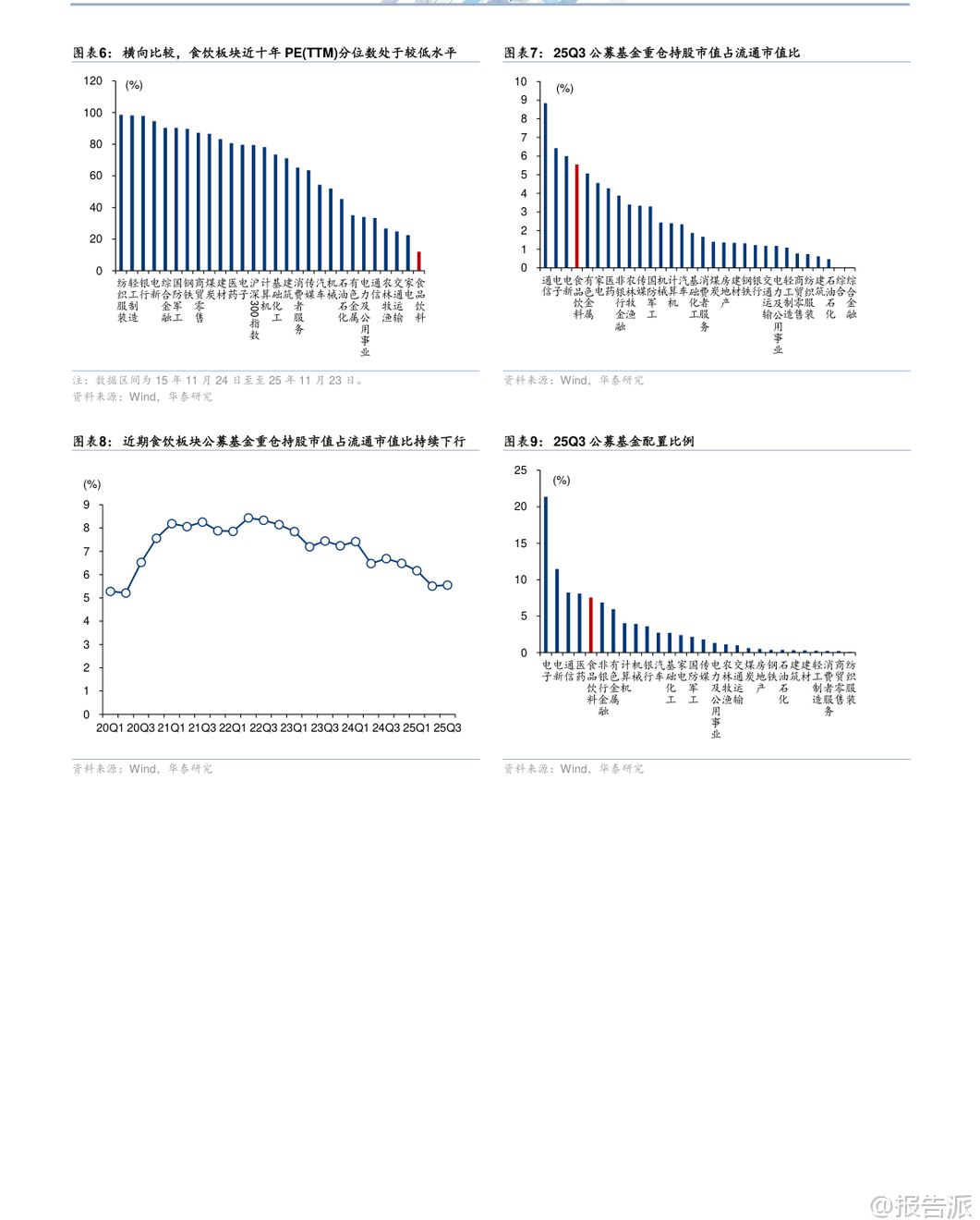 | 2025年,中国消费市场在曲折中实现温和复苏,社会消费品零售总额同比增长4.3%,但整体呈现“前高后低”走势,居民消费意愿偏弱导致复苏强度不及预期。 展望2026年,华泰证券认为必选消费有望迎来温和复苏,当前板块已步入胜率较高的左侧底部区间,建议积极布局。 核心观点指出,地产周期尤其是房价变化仍是判断2026年消费复苏力度的关键变量。 华泰宏观预测,人口流入城市的房价有望在2026年下半年企稳,将有效改善居民资产负债表,提升边际消费倾向。 同时,供给侧改革与需求端刺激政策双轮驱动,如“十五五”规划强调扩大优质供给、清理不合理消费限制,叠加可能的非国补类消费刺激延续,有望提振居民消费信心。 综合来看,2026年消费复苏预计将呈现“温和渐进”特征。 从自下而上视角看,部分必选消费子行业已现基本面触底改善的曙光。 2025年第三季度,白酒、乳品等板块报表加速出清,库存压力缓解;部分可选消费如免税、酒店、奢侈品龙头已率先回暖。 速冻食品因价格战缓和与新品驱动,收入出现改善迹象。 龙头企业正主动停止内卷式价格战,转向产品创新驱动,通过差异化与品牌力建立竞争壁垒。 同时,传统品牌企业逐步适应渠道变革,在即时零售、零食量贩等新渠道中找到合作模式,回归品牌本质。 此外,龙头企业分红率持续提升,2024年多数龙头分红率超60%,2025年预期股息率接近4-5%,在低利率环境下具备显著吸引力。 具体到各细分赛道:白酒行业处于深度调整磨底阶段,估值、筹码、配置比例均已至历史低位。 股价或先于经营与报表修复,2026年随着需求回补,行业有望逐步走出底部。 推荐关注管理能力突出、报表出清充分的古井贡酒、泸州老窖。 乳品方面,原奶周期预计在2026年再平衡。 上游奶牛存栏持续去化,下游乳企库存健康,静待终端需求复苏。 深加工业务(如奶酪、乳蛋白)国产替代逻辑加速演绎,为行业打开新增长空间。 推荐蒙牛乳业、伊利股份。 啤酒行业进入攻守兼备配置区间。 2026年需求缓慢复苏,成本红利边际减弱但企业理性竞争支撑利润韧性。 全国性龙头华润啤酒、青岛啤酒兼具顺周期弹性与高股息价值,区域龙头燕京啤酒、珠江啤酒凭借质价比大单品延续成长性。 调味品行业存量竞争加剧,龙头企业通过渠道深耕与费用投放巩固份额。 海天味业市占率提升,千禾味业经历短期舆情冲击后经营环比改善,监管趋严有利于零添加赛道长期健康发展。 推荐海天味业、千禾味业。 速冻食品板块筑底态势明确,2025年价格战未进一步加剧,主要企业控费保利,利润同比转正。 餐饮缓慢恢复托底B端需求,山姆、零食量贩等新渠道打开增量空间。 预计2026年价格战有望缓和,盈利能力修复可期。 重点推荐龙头安井食品。 软饮料行业成长性仍可期待,重点关注竞争演化与新品趋势。 瓶装水行业集中度提升,农夫山泉龙头地位稳固;无糖茶东方树叶领跑,下沉市场潜力大;功能饮料东鹏表现亮眼;NFC果汁、HPP果汁、养生水等新品类具备结构性机会。 推荐康师傅控股。 零食行业继续看好新渠道与新产品的结构性景气。 零食量贩店进入质量增长阶段,利润率加速释放;抖音渠道由放量转向品宣与利润平衡;会员制商超仍是高势能渠道。 品类上,魔芋零食凭借健康属性高速增长,麦片行业向功能化、高端化升级。 推荐盐津铺子、西麦食品、宝立食品。 投资主线方面,首推高赔率的顺周期板块,包括白酒、啤酒、调味品、速冻食品,个股推荐古井贡酒、泸州老窖、华润啤酒、青岛啤酒、海天味业、安井食品、千禾味业。 其次看好基本面拐点型低估值公司,推荐康师傅控股、蒙牛乳业。 同时推荐股息率打底、业绩稳健的白马龙头伊利股份、双汇发展。 关注小而美的细分成长龙头西麦食品、宝立食品、盐津铺子。 风险提示包括:宏观经济复苏不及预期、行业竞争加剧、食品安全问题及成本波动超预期。 本文由【报告派】研读,输出观点仅作为行业分析! 原文标题:原文标题:2025-11-26-华泰证券-华泰证券-食品饮料行业必选消费2026年度策略:冬藏伺机,春归可期 发布时间:2025年 报告出品方:华泰证券 文档页数:37页