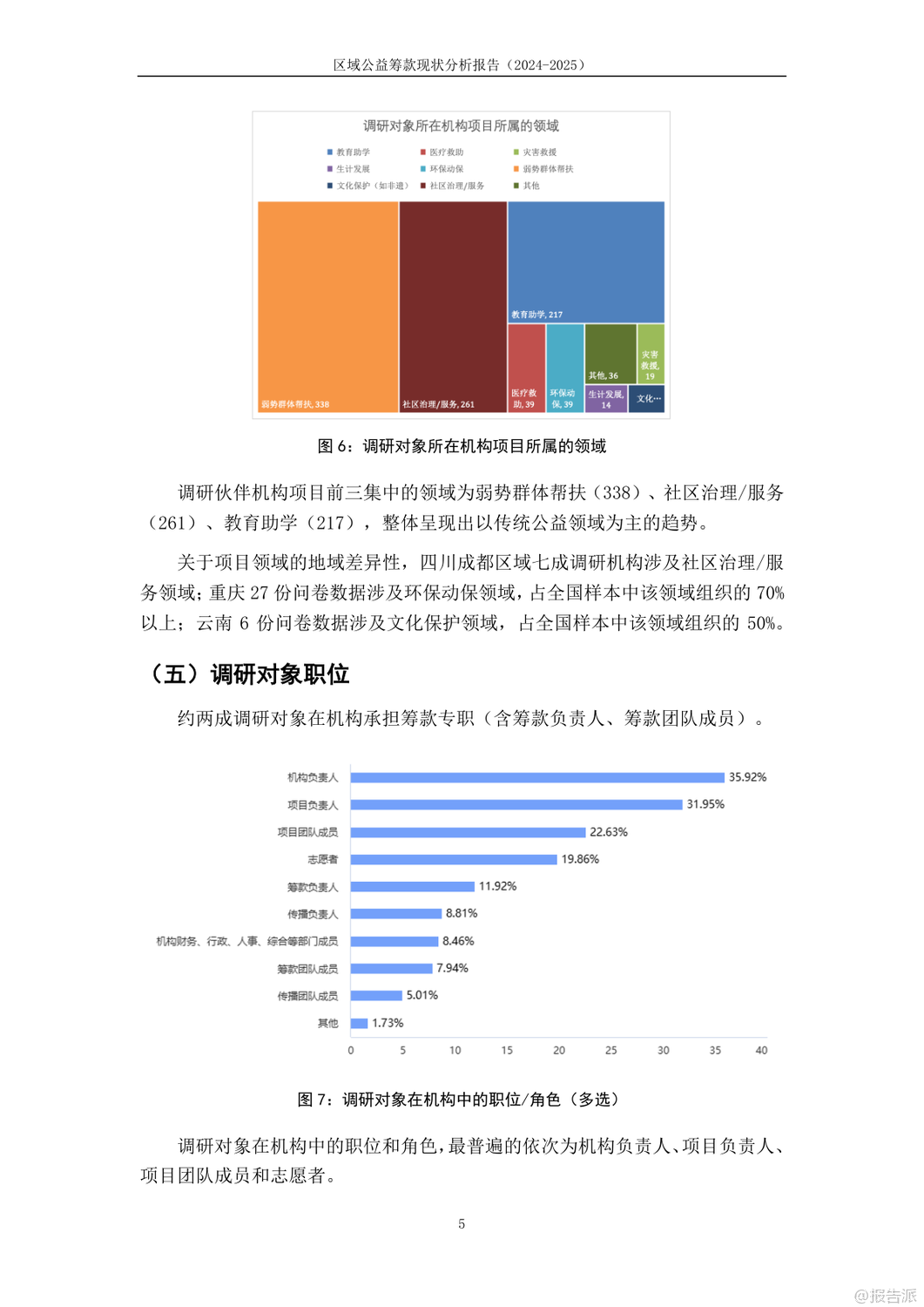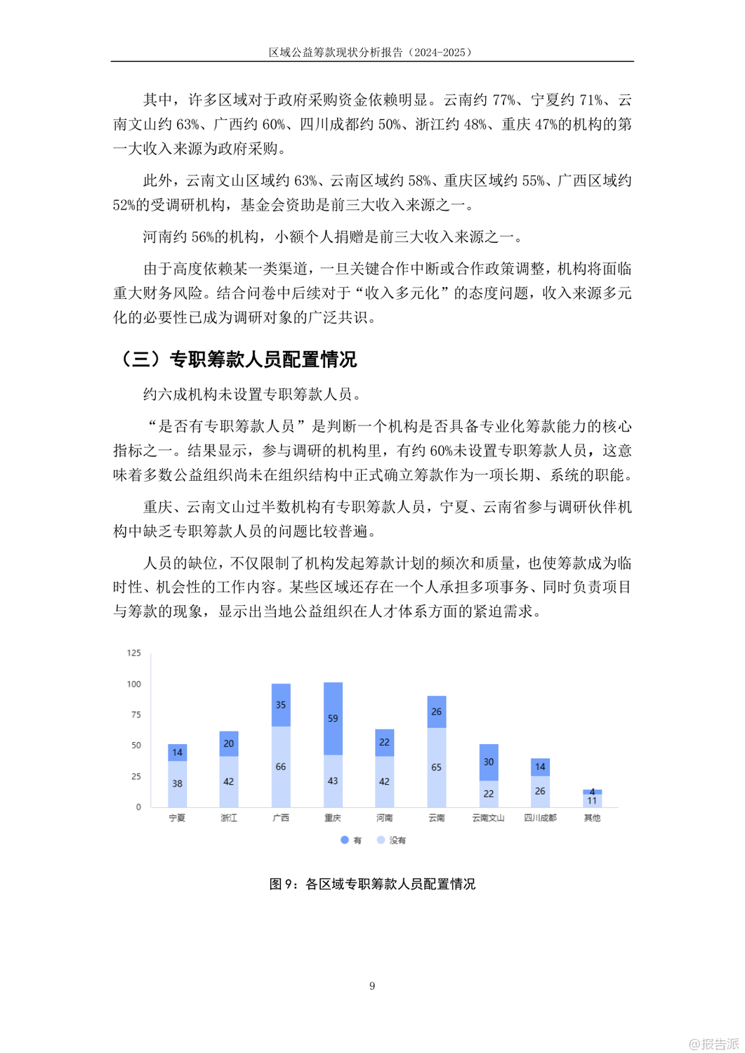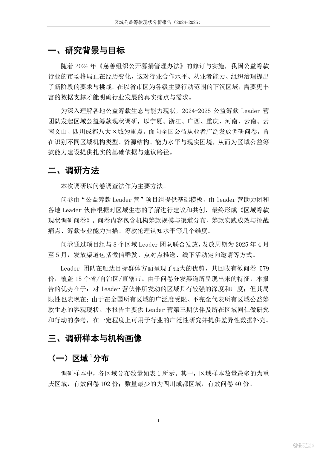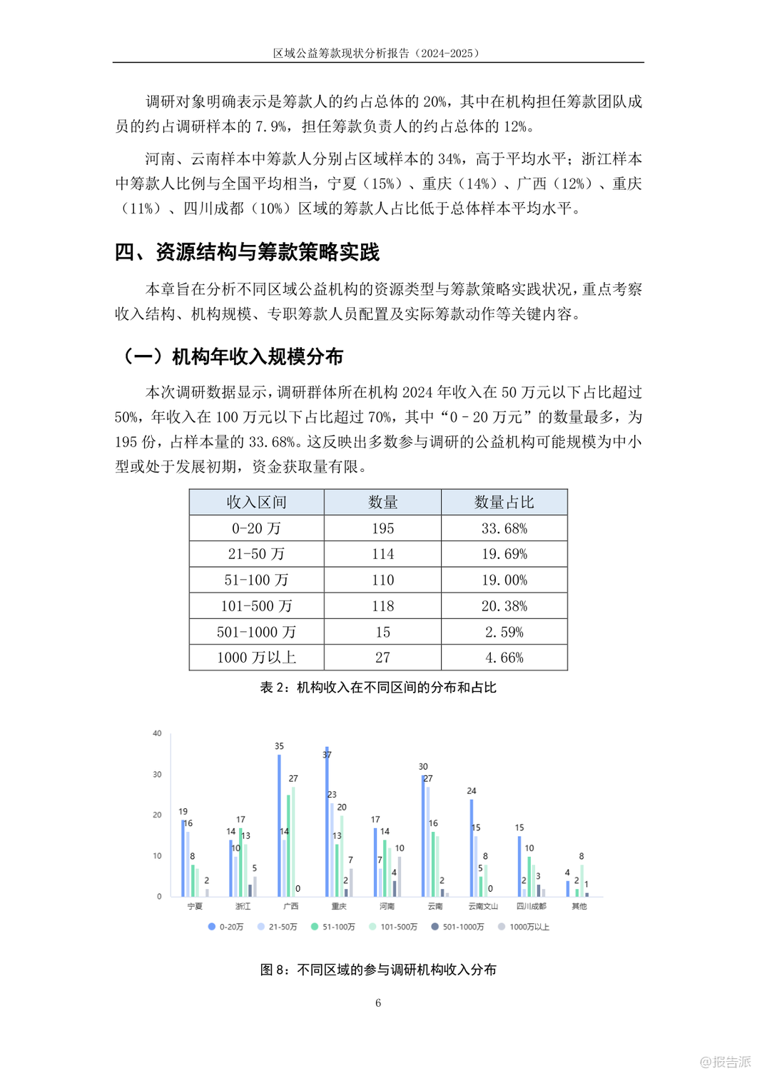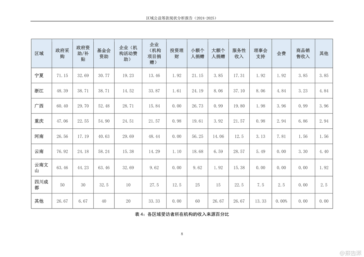 | 这份《2024-2025年区域公益筹款现状分析报告》由公益筹款Leader营第三期的八支区域团队联合共创,覆盖重庆、广西、河南、宁夏、四川成都、云南及文山等八大区域,共回收579份有效问卷,旨在深入剖析我国下沉区域公益筹款的真实生态。 报告不仅揭示了当前公益组织在资源结构、专业能力、培训成效等方面的普遍困境,也展现了不同地域间的显著差异。 调研显示,我国多数公益机构仍处于发展初期。 近半数机构年收入在50万元以下,超七成机构年收入不足百万元,资金规模普遍偏小。 收入来源高度依赖政府采购,云南、宁夏、广西等地超六成机构将政府采购列为第一大收入来源,反映出对政府资源的深度依赖,同时也潜藏较大的财务风险。 基金会资助和个人小额捐赠虽为重要补充,但整体筹款渠道仍显单一。 专业人才匮乏是制约发展的另一大瓶颈。 约六成机构未设置专职筹款人员,筹款工作常由项目人员兼任,导致筹款行为碎片化、机会化。 即便在设有专职人员的机构中,从业者能力自评普遍集中在5-6分(满分10分),尤其在筹款计划制定、资源整合拓展、捐赠人画像与分层维护等战略性能力上得分偏低,暴露出“重执行、轻规划”的行业通病。 在认知层面,尽管超过八成从业者认同筹款多元化的重要性,但对“筹款”与“销售”、“公众筹款”与“互联网筹款”、“筹款产品”与“公益项目”等核心概念的理解仍显模糊,行业语言尚未统一。 更值得关注的是伦理建设的滞后:超过五分之一的受访者从未听说过“筹款伦理”,而在“筹款提成”这一敏感问题上,业内意见分歧严重,反映出在效率与道德边界上的集体迷茫。 培训方面,99公益日相关的短期培训参与度最高,但效果多局限于活动本身,对日常筹款帮助有限。 线上培训普遍存在“理论难落地”问题,而线下培训参与率低,尤其在云南、广西等中西部地区,培训资源可及性差。 报告指出,当前能力建设过度依赖节点驱动,缺乏常态化、陪伴式的成长支持体系。 报告最后呼吁,未来应构建分层次的能力成长路径,推动筹款伦理共识的形成,并打造区域性支持网络,真正实现“以个人带协同、以社群促发展”,为区域公益筹款的专业化高质量发展注入可持续的动力。 出品方:Leader团队 发布时间:2025年 文档页数:35页