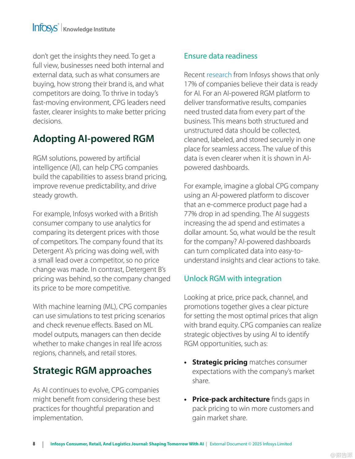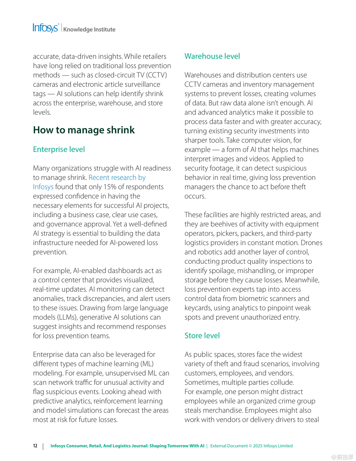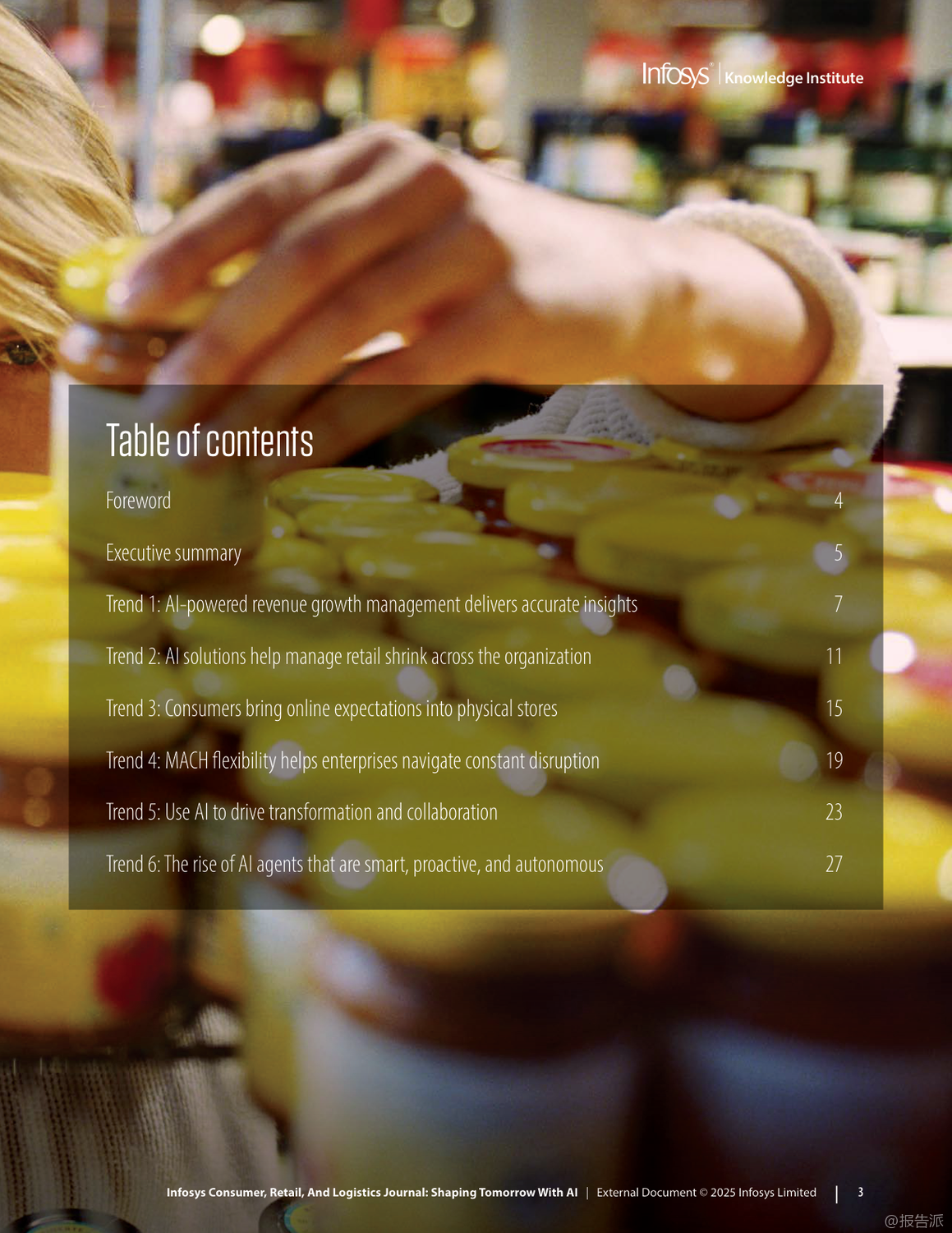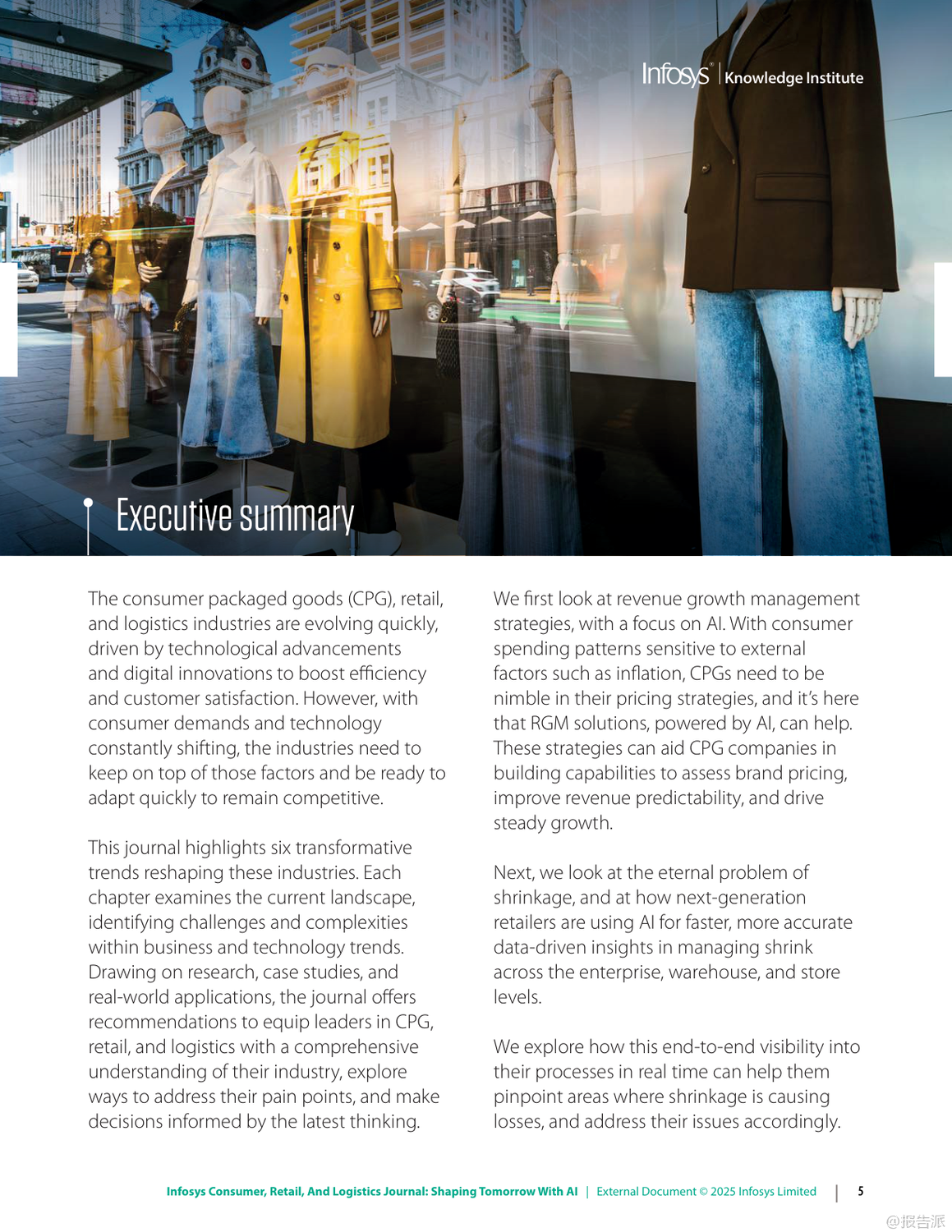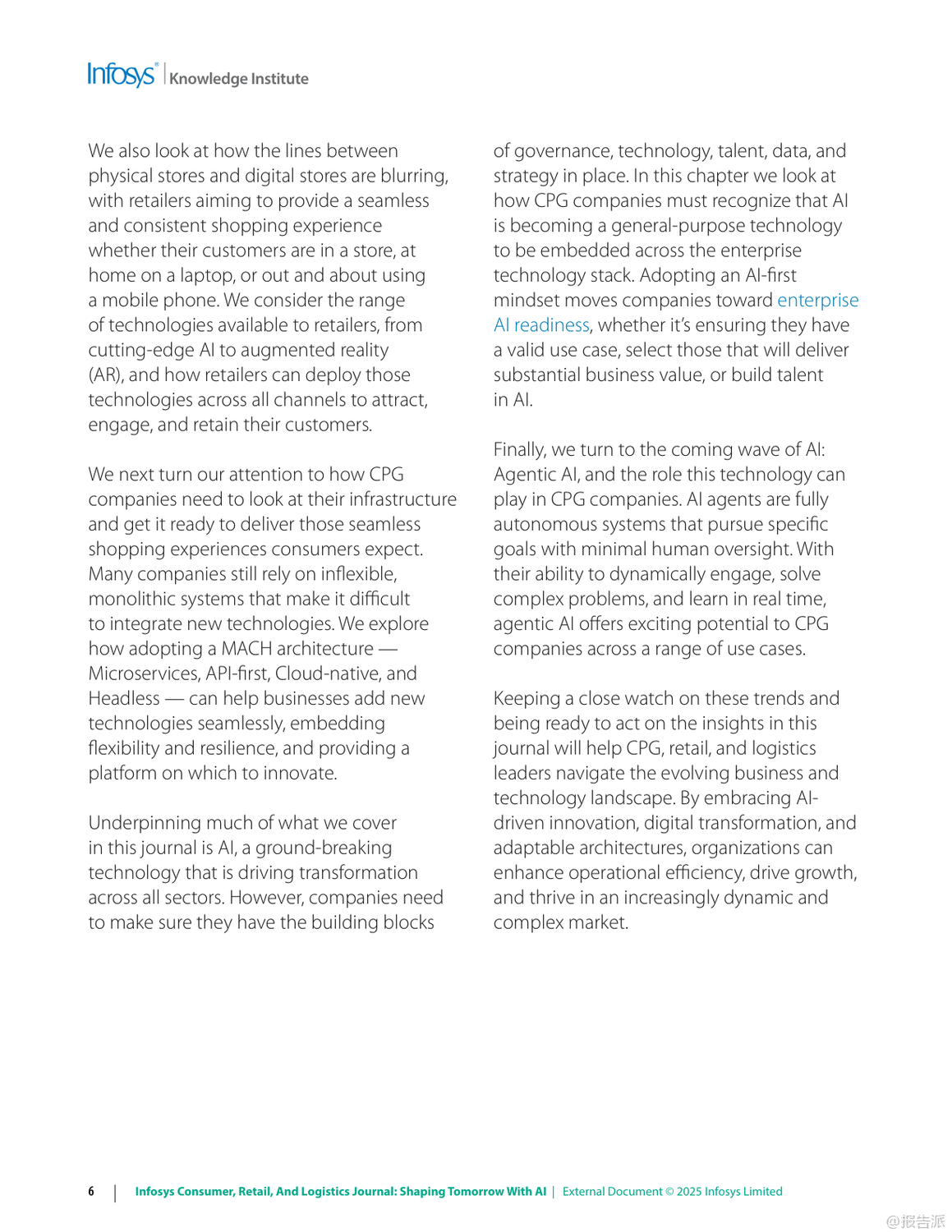 | 在数字化浪潮持续演进的背景下,人工智能(AI)正以前所未有的速度重塑信息、零售与物流行业的格局。 Infosys发布的《2025年信息、零售和物流杂志:用人工智能塑造未来》报告,深入剖析了六大关键趋势,揭示了企业如何借助AI实现效率跃升、客户体验优化与业务模式创新。 首先,AI驱动的收入增长管理(RGM)正在成为消费品公司应对复杂市场环境的核心工具。 面对通胀压力与消费者支出紧缩,传统碎片化的定价策略已难以为继。 AI通过整合内外部数据,实现对价格、包装、渠道和促销的协同优化,提升决策精准度。 例如,某英国消费品公司借助AI分析竞品定价动态调整策略;一家意大利食品企业通过RGM分析挖掘出每年70亿至100亿美元的增量现金流潜力。 这表明,AI不仅提升预测能力,更直接转化为可持续的收入增长。 其次,AI正在系统性解决零售业长期面临的“损耗”难题。 2023年全球零售盗窃损失高达数百亿美元,而除偷盗外,运营失误与库存误差也占相当比例。 AI通过计算机视觉、异常检测与行为分析,在企业、仓库与门店多层级构建实时监控体系。 Infosys案例显示,AI可识别POS端“人情交易”欺诈,帮助鞋服品牌减少20%潜在欺诈,挽回800万美元损失;亦能发现电商平台退货欺诈模式,拦截超50万美元风险交易。 这意味着AI正从被动防御转向主动智能风控。 第三,消费者将线上期待带入实体空间,推动“虚实融合”的购物体验升级。 尽管线下仍贡献近八成零售额,但顾客期望个性化、无缝化服务。 零售商正部署AI购物车、虚拟试妆镜、地理围栏与信标技术,结合区块链确保奢侈品溯源真实性。 同时,“无尽通道”、数字货架与自助结账等技术缩小线上线下鸿沟,提升转化率与客单价。 未来的实体店不再是单纯交易场所,而是集体验、社交与服务于一体的沉浸式空间。 第四,MACH架构(微服务、API优先、云原生、无头)成为企业应对不确定性的技术底座。 传统单体系统僵化难改,阻碍创新速度。 MACH通过模块化设计,使企业能快速集成新功能。 案例显示,某服饰零售商迁移至MACH后成本降低30%,上市周期缩短;汽车制造商利用该架构12周内上线定制预售平台,并迅速扩展至八国市场。 这证明灵活架构是支撑敏捷商业的关键基础设施。 第五,企业需构建“AI就绪”能力,涵盖数据治理、人才培训与伦理框架。 仅有12%企业确信其AI商业论证有效,凸显战略落地挑战。 成功路径包括:夯实高质量数据基础、从价值链全局评估AI价值、加强员工AI技能培训,并确保算法公平透明。 最终目标是从“AI辅助”迈向“AI优先”,实现人机协同的范式转变。 最后,代理型AI(Agentic AI)代表下一代智能化方向。 这类自主系统能理解目标、分解任务、调用工具并自我优化,如自动完成订餐、报税或生成合规报告。 Gartner将其列为2025年首要战略技术。 随着多智能体协作发展,AI将真正扮演“数字员工”角色,释放人类创造力,驱动组织深层变革。 总体而言,2025年的竞争已不仅是产品或渠道之争,更是智能化水平与技术适应力的较量。 拥抱AI、重构架构、以人为本的企业,将在动荡时代赢得先机。 出品方:Infosys 发布时间:2025年 文档页数:49页