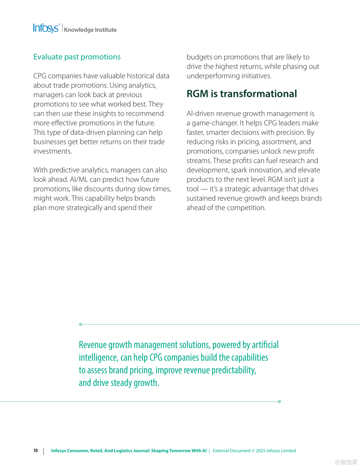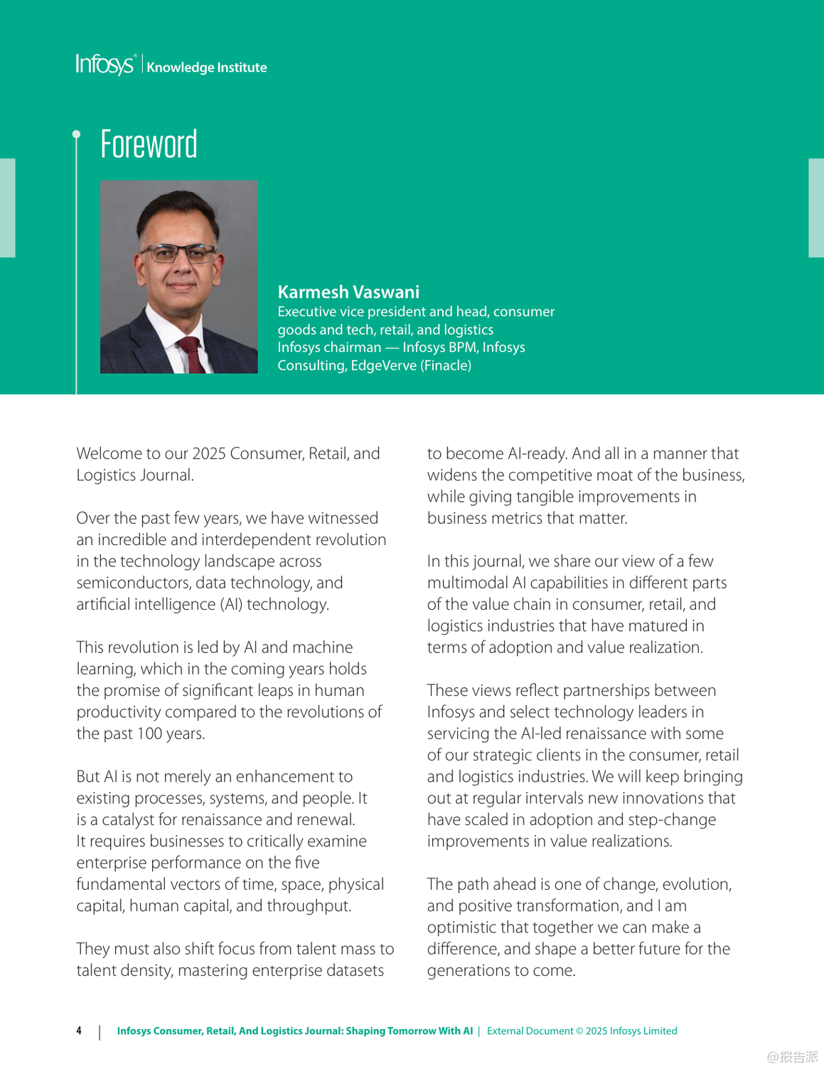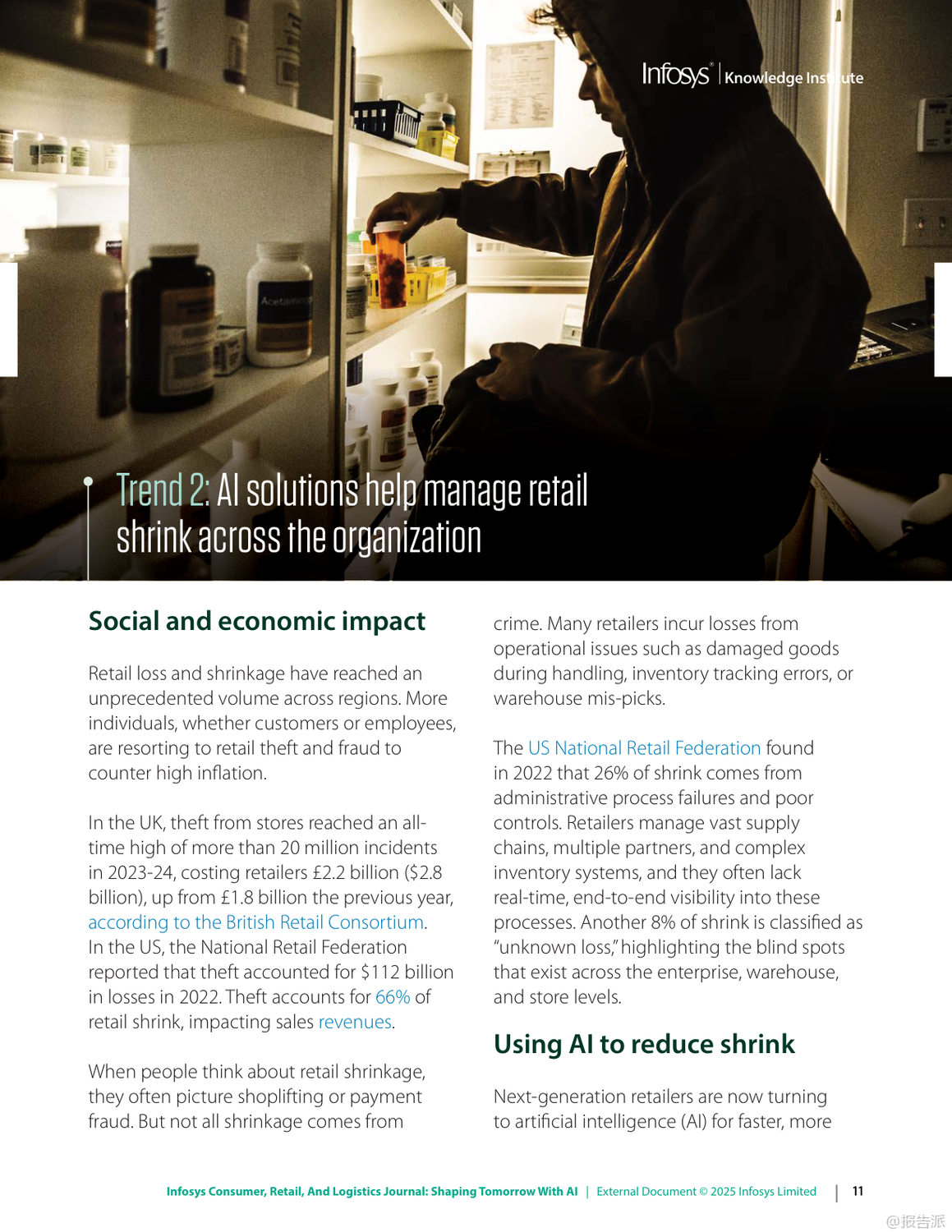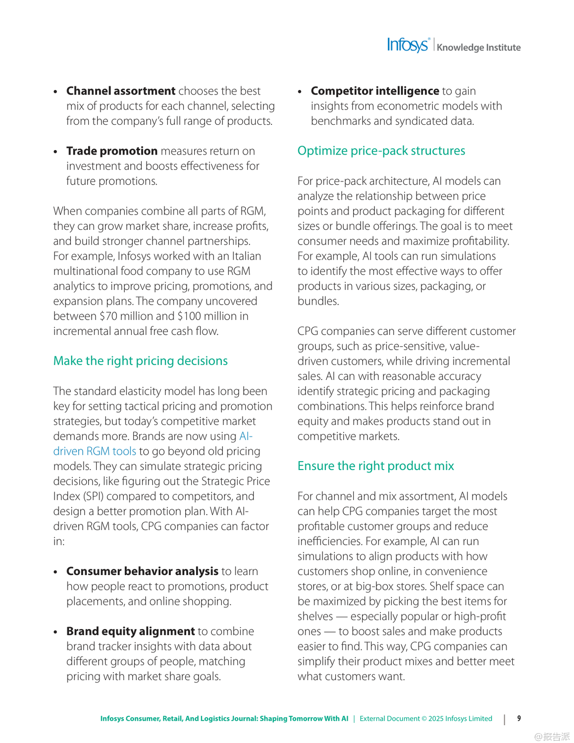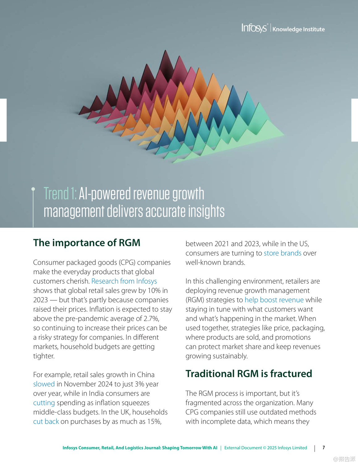 | 在数字化浪潮持续演进的背景下,人工智能(AI)正以前所未有的速度重塑信息、零售与物流行业的格局。 Infosys发布的《2025年信息、零售和物流杂志:用人工智能塑造未来》报告,深入剖析了六大关键趋势,揭示了企业如何借助AI实现效率跃升、客户体验优化与业务模式创新。 首先,AI驱动的收入增长管理(RGM)正在成为消费品公司应对复杂市场环境的核心工具。 面对通胀压力与消费者支出紧缩,传统碎片化的定价策略已难以为继。 AI通过整合内外部数据,实现对价格、包装、渠道和促销的协同优化,提升决策精准度。 例如,某英国消费品公司借助AI分析竞品定价动态调整策略;一家意大利食品企业通过RGM分析挖掘出每年70亿至100亿美元的增量现金流潜力。 这表明,AI不仅提升预测能力,更直接转化为可持续的收入增长。 其次,AI正在系统性解决零售业长期面临的“损耗”难题。 2023年全球零售盗窃损失高达数百亿美元,而除偷盗外,运营失误与库存误差也占相当比例。 AI通过计算机视觉、异常检测与行为分析,在企业、仓库与门店多层级构建实时监控体系。 Infosys案例显示,AI可识别POS端“人情交易”欺诈,帮助鞋服品牌减少20%潜在欺诈,挽回800万美元损失;亦能发现电商平台退货欺诈模式,拦截超50万美元风险交易。 这意味着AI正从被动防御转向主动智能风控。 第三,消费者将线上期待带入实体空间,推动“虚实融合”的购物体验升级。 尽管线下仍贡献近八成零售额,但顾客期望个性化、无缝化服务。 零售商正部署AI购物车、虚拟试妆镜、地理围栏与信标技术,结合区块链确保奢侈品溯源真实性。 同时,“无尽通道”、数字货架与自助结账等技术缩小线上线下鸿沟,提升转化率与客单价。 未来的实体店不再是单纯交易场所,而是集体验、社交与服务于一体的沉浸式空间。 第四,MACH架构(微服务、API优先、云原生、无头)成为企业应对不确定性的技术底座。 传统单体系统僵化难改,阻碍创新速度。 MACH通过模块化设计,使企业能快速集成新功能。 案例显示,某服饰零售商迁移至MACH后成本降低30%,上市周期缩短;汽车制造商利用该架构12周内上线定制预售平台,并迅速扩展至八国市场。 这证明灵活架构是支撑敏捷商业的关键基础设施。 第五,企业需构建“AI就绪”能力,涵盖数据治理、人才培训与伦理框架。 仅有12%企业确信其AI商业论证有效,凸显战略落地挑战。 成功路径包括:夯实高质量数据基础、从价值链全局评估AI价值、加强员工AI技能培训,并确保算法公平透明。 最终目标是从“AI辅助”迈向“AI优先”,实现人机协同的范式转变。 最后,代理型AI(Agentic AI)代表下一代智能化方向。 这类自主系统能理解目标、分解任务、调用工具并自我优化,如自动完成订餐、报税或生成合规报告。 Gartner将其列为2025年首要战略技术。 随着多智能体协作发展,AI将真正扮演“数字员工”角色,释放人类创造力,驱动组织深层变革。 总体而言,2025年的竞争已不仅是产品或渠道之争,更是智能化水平与技术适应力的较量。 拥抱AI、重构架构、以人为本的企业,将在动荡时代赢得先机。 出品方:Infosys 发布时间:2025年 文档页数:49页