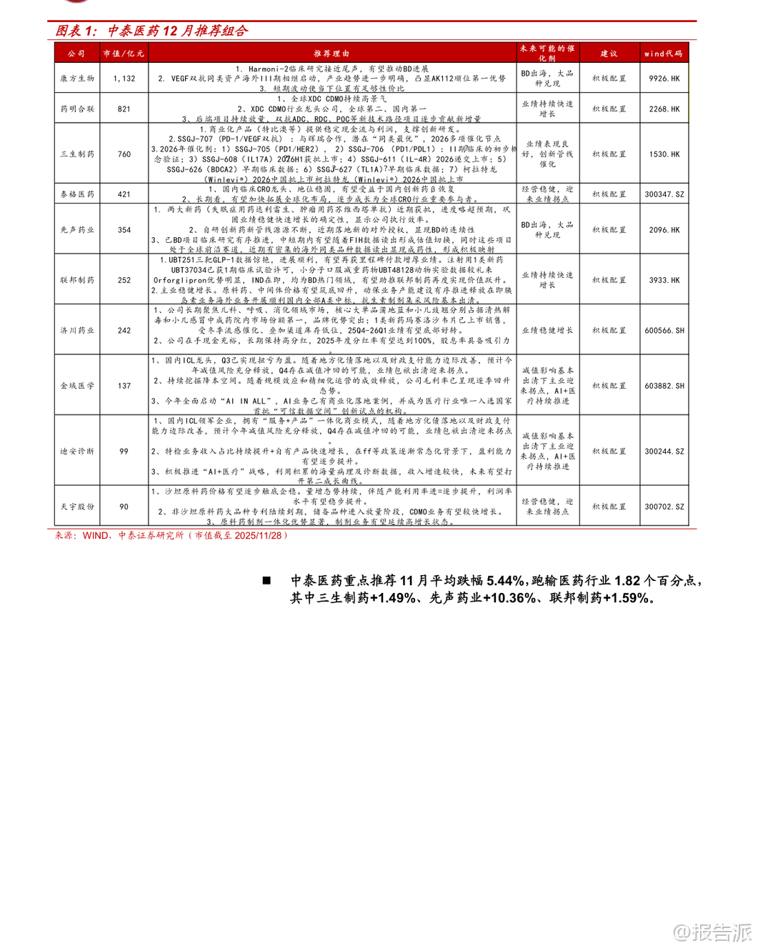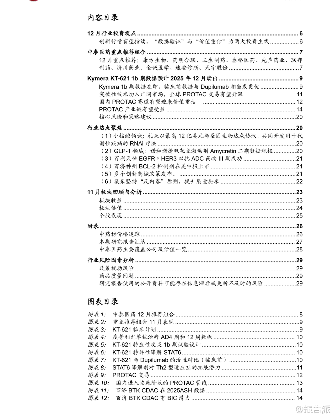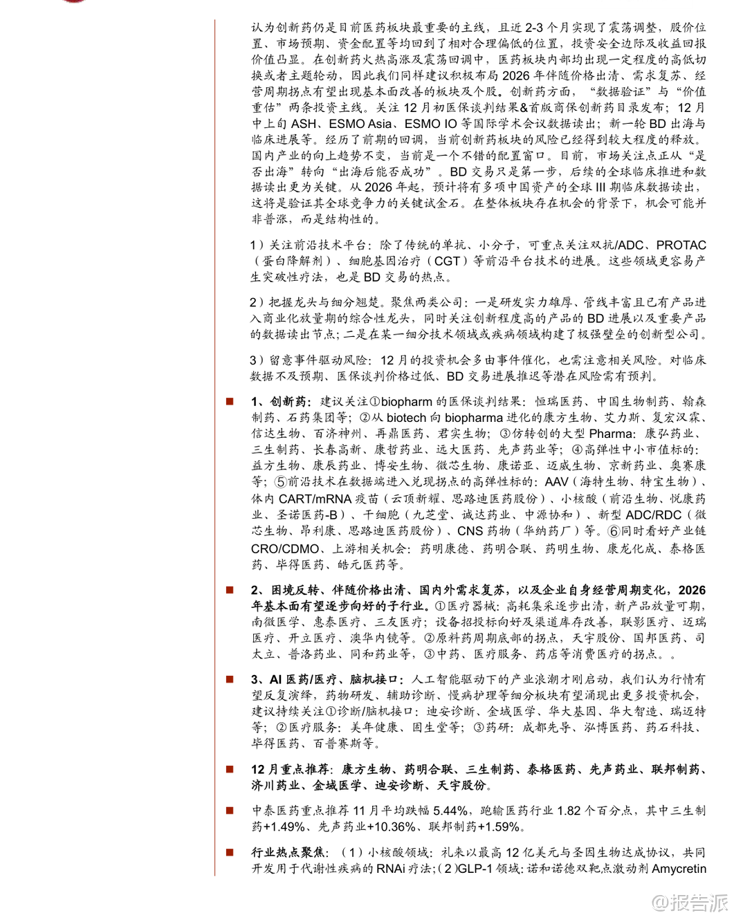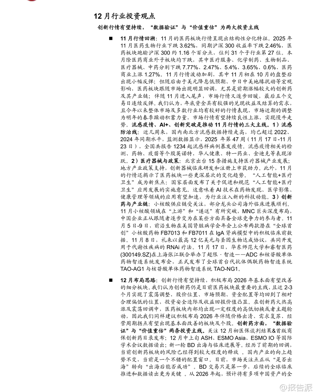 | 2025年11月,医药板块整体表现承压,下跌3.62%,跑输沪深300约1.16个百分点,在31个子行业中排名第27位。 除医药商业微涨1.27%外,其余子板块均出现不同程度回调,其中医疗服务、生物制品、医疗器械、化学制药、中药分别下跌7.77%、5.4%、3.65%、2.47%、0.6%。 市场波动加剧,主要受美元降息预期走弱及地缘政治扰动影响,前期涨幅较大的创新药及其产业链在11月中下旬经历明显回调,但月末最后五个交易日迎来连续反弹,显示市场情绪逐步回暖。 从驱动主线看,11月医药行情呈现三大热点:一是流感疫情高发带动相关检测、药物和疫苗企业活跃,如英诺特、华人健康、特一药业、金迪克等;二是“人工智能+医疗卫生”政策落地,国家发布实施意见推动AI在药物发现、医学影像、健康管理等领域的应用加速;三是创新药领域取得突破,小核酸技术进展显著,礼来以最高12亿美元与圣因生物达成RNAi疗法合作,前沿生物公布IgA肾病模型积极数据,华东师范大学与睿智医药联合发布全球首台ADC和核苷酸单体药物智造系统,标志着中国企业在该领域正从跟随者向具备全球竞争力的参与者转变。 展望12月,中泰证券认为创新药仍是医药板块最重要的主线。 经过近2-3个月的震荡调整,当前股价位置、市场预期和资金配置已回归相对合理区间,具备较高的安全边际和投资价值。 投资逻辑聚焦“数据验证”与“价值重估”两大主线:一方面关注医保谈判结果、商保创新药目录发布,以及ASH、ESMO Asia等国际会议上的临床数据读出;另一方面,市场关注点正从“是否出海”转向“出海后能否成功”,BD交易后的全球临床推进和数据兑现成为关键。 预计2026年起将有多项中国创新药的全球III期临床数据出炉,这将是验证其全球竞争力的重要节点。 具体布局方向上,建议重点关注三类机会:一是前沿技术平台,如双抗/ADC、PROTAC(蛋白降解剂)、细胞基因治疗(CGT)等,这些领域易诞生突破性疗法且是BD交易热点;二是龙头与细分翘楚,包括研发实力强、管线丰富的综合性Biopharma,以及在特定技术或疾病领域构建壁垒的创新型公司;三是事件驱动型机会,需警惕临床数据不及预期、医保谈判价格过低等潜在风险。 重点推荐领域包括:1)创新药,关注biopharm医保谈判、Biotech向Biopharma转型企业(如康方生物、百济神州)、仿转创药企(如先声药业、三生制药),以及AAV、mRNA疫苗、小核酸、干细胞等前沿技术标的;2)困境反转板块,如高值耗材集采出清后新产品放量的医疗器械企业(南微医学、迈瑞医疗),原料药周期底部拐点企业(天宇股份、司太立),以及中药、消费医疗等需求复苏板块;3)AI+医疗与脑机接口,建议关注诊断、医疗服务及药研领域的领先企业。 特别值得关注的是PROTAC(蛋白降解靶向嵌合体)技术的突破性进展。 美国Kymera公司开发的STAT6降解剂KT-621预计于2025年12月公布1b期临床数据,若结果积极,将首次验证PROTAC技术在自身免疫疾病领域的可行性,极大提振全球蛋白降解赛道信心。 KT-621作为口服药物,其临床前活性与已上市重磅药度普利尤单抗相当或更优,且具备口服便利性优势,潜在市场空间广阔。 若KT-621成功,不仅将推动全球PROTAC交易升温,也将直接利好国内布局该技术的企业,如百济神州(BTK PROTAC进展最快)、恒瑞医药、海思科、海创药业等,并带动上游产业链发展,如拥有E3连接酶配体库和分子砌块的药石科技、毕得医药、键凯科技等。 此外,11月行业热点还包括:诺和诺德GLP-1双靶点激动剂Amycretin二期数据积极;百利天恒EGFR×HER3双抗ADC在食管癌III期研究中取得PFS和OS双阳性结果,实现历史性突破;百济神州新一代BCL-2抑制剂在美国申报上市;多地出台支持创新药械发展的政策,上海提出审评审批时限缩短至30个工作日,重庆要求医疗机构快速挂网创新药;集采坚持“反内卷”原则,提升质量要求,预示行业高质量发展方向。 综上,尽管短期市场有所回调,但国内医药产业向上趋势不变。 创新药仍是核心主线,随着关键临床数据陆续读出,行业有望迎来新一轮价值重估。 投资者应把握结构性机会,重点关注技术平台领先、临床进展明确、具备国际化潜力的优质企业。 本文由【报告派】研读,输出观点仅作为行业分析! 原文标题:泰证券-中泰证券-医药生物行业KT-621的1b期临床数据前瞻与国内投资机会分析:创新药行情有望持续,PROTAC专题,蛋白降解东风起,国内产业链迎新机 发布时间:2025年 报告出品方:中泰证券 文档页数:49页