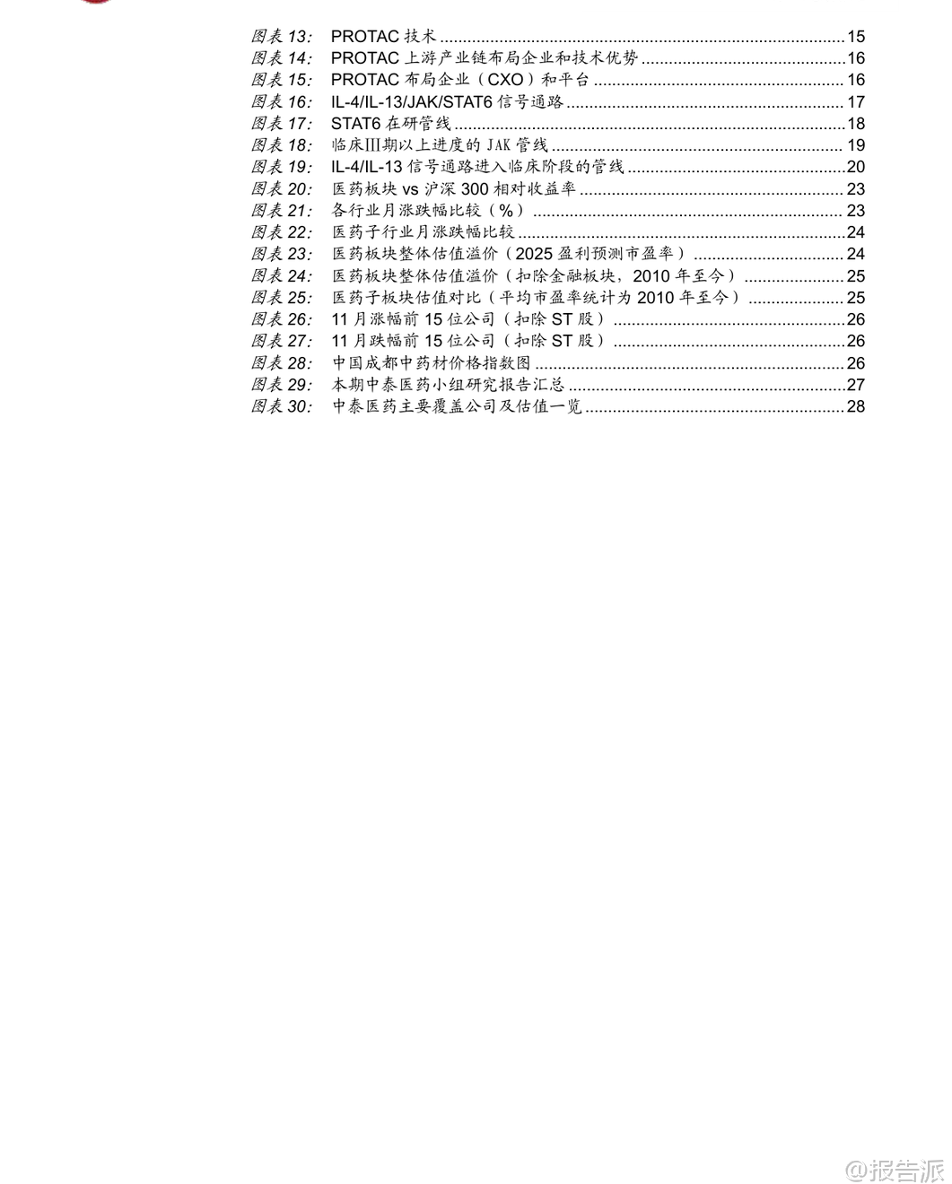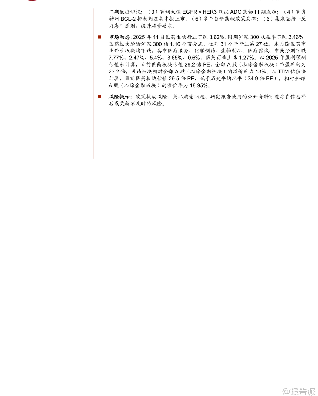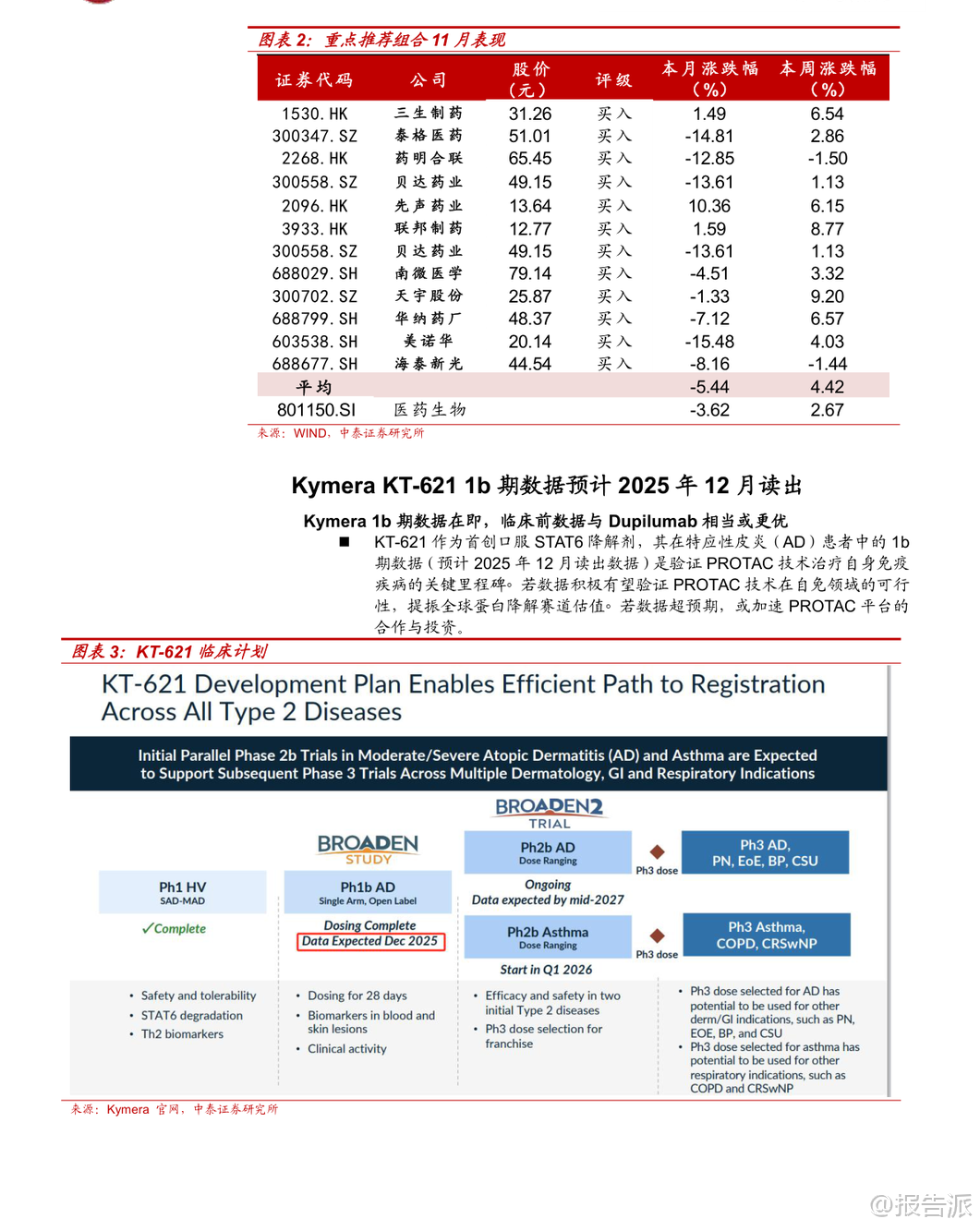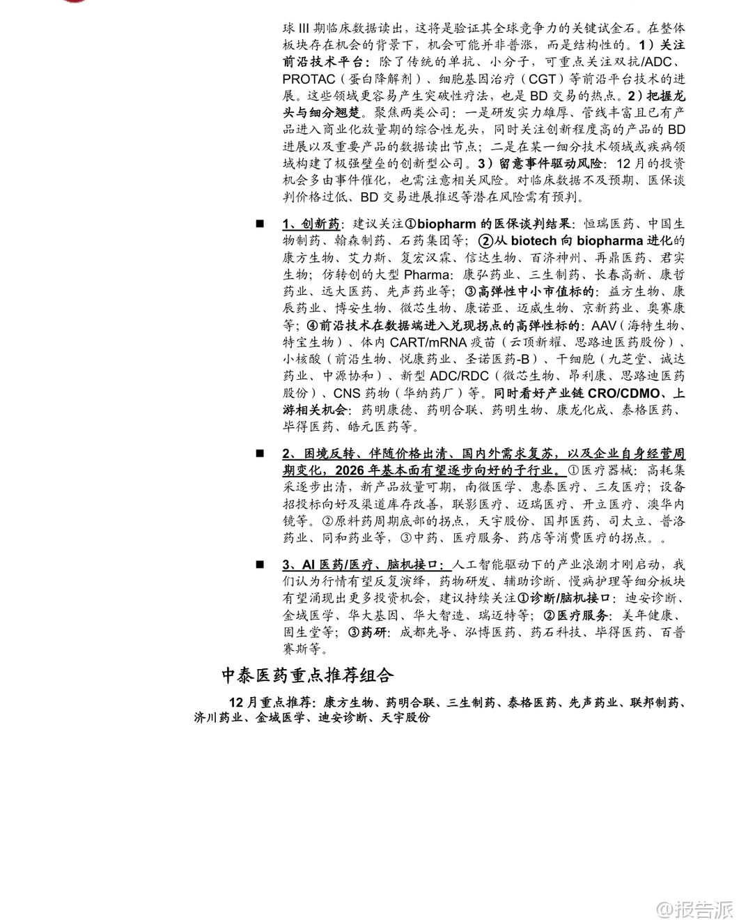 | 2025年11月,医药板块整体表现承压,下跌3.62%,跑输沪深300约1.16个百分点,在31个子行业中排名第27位。 除医药商业微涨1.27%外,其余子板块均出现不同程度回调,其中医疗服务、生物制品、医疗器械、化学制药、中药分别下跌7.77%、5.4%、3.65%、2.47%、0.6%。 市场波动加剧,主要受美元降息预期走弱及地缘政治扰动影响,前期涨幅较大的创新药及其产业链在11月中下旬经历明显回调,但月末最后五个交易日迎来连续反弹,显示市场情绪逐步回暖。 从驱动主线看,11月医药行情呈现三大热点:一是流感疫情高发带动相关检测、药物和疫苗企业活跃,如英诺特、华人健康、特一药业、金迪克等;二是“人工智能+医疗卫生”政策落地,国家发布实施意见推动AI在药物发现、医学影像、健康管理等领域的应用加速;三是创新药领域取得突破,小核酸技术进展显著,礼来以最高12亿美元与圣因生物达成RNAi疗法合作,前沿生物公布IgA肾病模型积极数据,华东师范大学与睿智医药联合发布全球首台ADC和核苷酸单体药物智造系统,标志着中国企业在该领域正从跟随者向具备全球竞争力的参与者转变。 展望12月,中泰证券认为创新药仍是医药板块最重要的主线。 经过近2-3个月的震荡调整,当前股价位置、市场预期和资金配置已回归相对合理区间,具备较高的安全边际和投资价值。 投资逻辑聚焦“数据验证”与“价值重估”两大主线:一方面关注医保谈判结果、商保创新药目录发布,以及ASH、ESMO Asia等国际会议上的临床数据读出;另一方面,市场关注点正从“是否出海”转向“出海后能否成功”,BD交易后的全球临床推进和数据兑现成为关键。 预计2026年起将有多项中国创新药的全球III期临床数据出炉,这将是验证其全球竞争力的重要节点。 具体布局方向上,建议重点关注三类机会:一是前沿技术平台,如双抗/ADC、PROTAC(蛋白降解剂)、细胞基因治疗(CGT)等,这些领域易诞生突破性疗法且是BD交易热点;二是龙头与细分翘楚,包括研发实力强、管线丰富的综合性Biopharma,以及在特定技术或疾病领域构建壁垒的创新型公司;三是事件驱动型机会,需警惕临床数据不及预期、医保谈判价格过低等潜在风险。 重点推荐领域包括:1)创新药,关注biopharm医保谈判、Biotech向Biopharma转型企业(如康方生物、百济神州)、仿转创药企(如先声药业、三生制药),以及AAV、mRNA疫苗、小核酸、干细胞等前沿技术标的;2)困境反转板块,如高值耗材集采出清后新产品放量的医疗器械企业(南微医学、迈瑞医疗),原料药周期底部拐点企业(天宇股份、司太立),以及中药、消费医疗等需求复苏板块;3)AI+医疗与脑机接口,建议关注诊断、医疗服务及药研领域的领先企业。 特别值得关注的是PROTAC(蛋白降解靶向嵌合体)技术的突破性进展。 美国Kymera公司开发的STAT6降解剂KT-621预计于2025年12月公布1b期临床数据,若结果积极,将首次验证PROTAC技术在自身免疫疾病领域的可行性,极大提振全球蛋白降解赛道信心。 KT-621作为口服药物,其临床前活性与已上市重磅药度普利尤单抗相当或更优,且具备口服便利性优势,潜在市场空间广阔。 若KT-621成功,不仅将推动全球PROTAC交易升温,也将直接利好国内布局该技术的企业,如百济神州(BTK PROTAC进展最快)、恒瑞医药、海思科、海创药业等,并带动上游产业链发展,如拥有E3连接酶配体库和分子砌块的药石科技、毕得医药、键凯科技等。 此外,11月行业热点还包括:诺和诺德GLP-1双靶点激动剂Amycretin二期数据积极;百利天恒EGFR×HER3双抗ADC在食管癌III期研究中取得PFS和OS双阳性结果,实现历史性突破;百济神州新一代BCL-2抑制剂在美国申报上市;多地出台支持创新药械发展的政策,上海提出审评审批时限缩短至30个工作日,重庆要求医疗机构快速挂网创新药;集采坚持“反内卷”原则,提升质量要求,预示行业高质量发展方向。 综上,尽管短期市场有所回调,但国内医药产业向上趋势不变。 创新药仍是核心主线,随着关键临床数据陆续读出,行业有望迎来新一轮价值重估。 投资者应把握结构性机会,重点关注技术平台领先、临床进展明确、具备国际化潜力的优质企业。 本文由【报告派】研读,输出观点仅作为行业分析! 原文标题:泰证券-中泰证券-医药生物行业KT-621的1b期临床数据前瞻与国内投资机会分析:创新药行情有望持续,PROTAC专题,蛋白降解东风起,国内产业链迎新机 发布时间:2025年 报告出品方:中泰证券 文档页数:49页