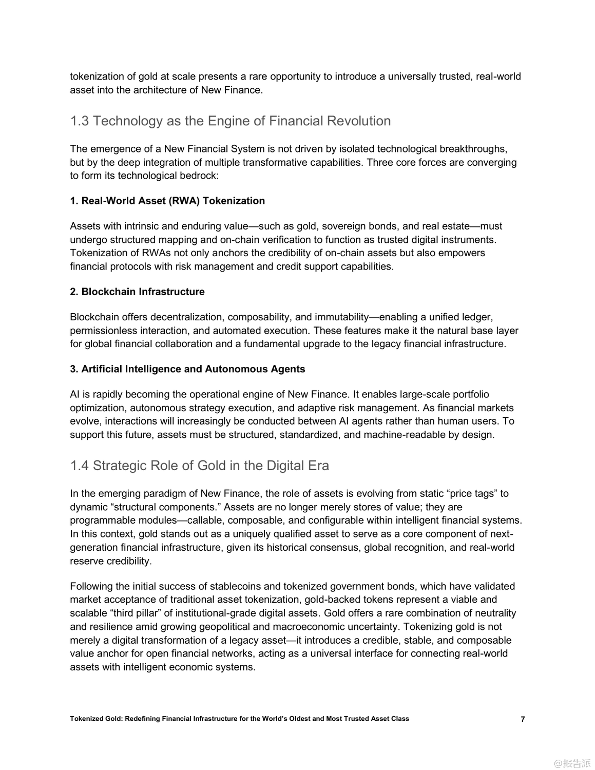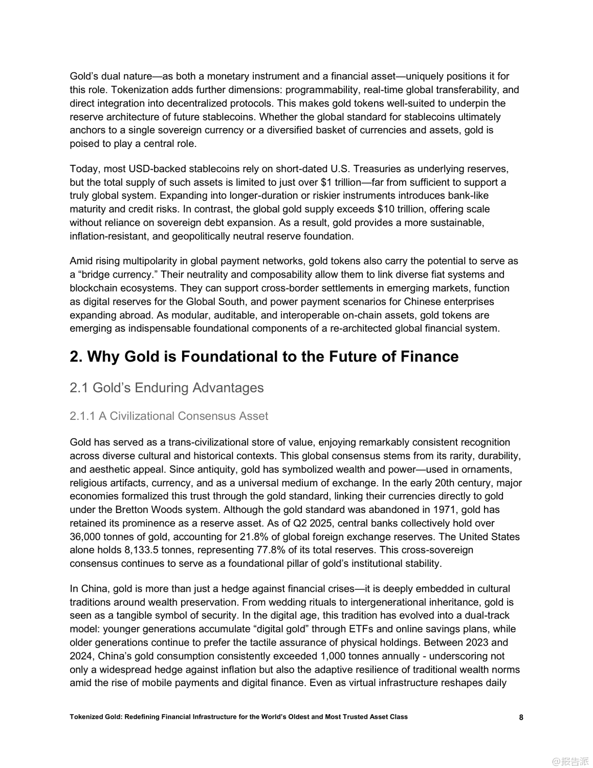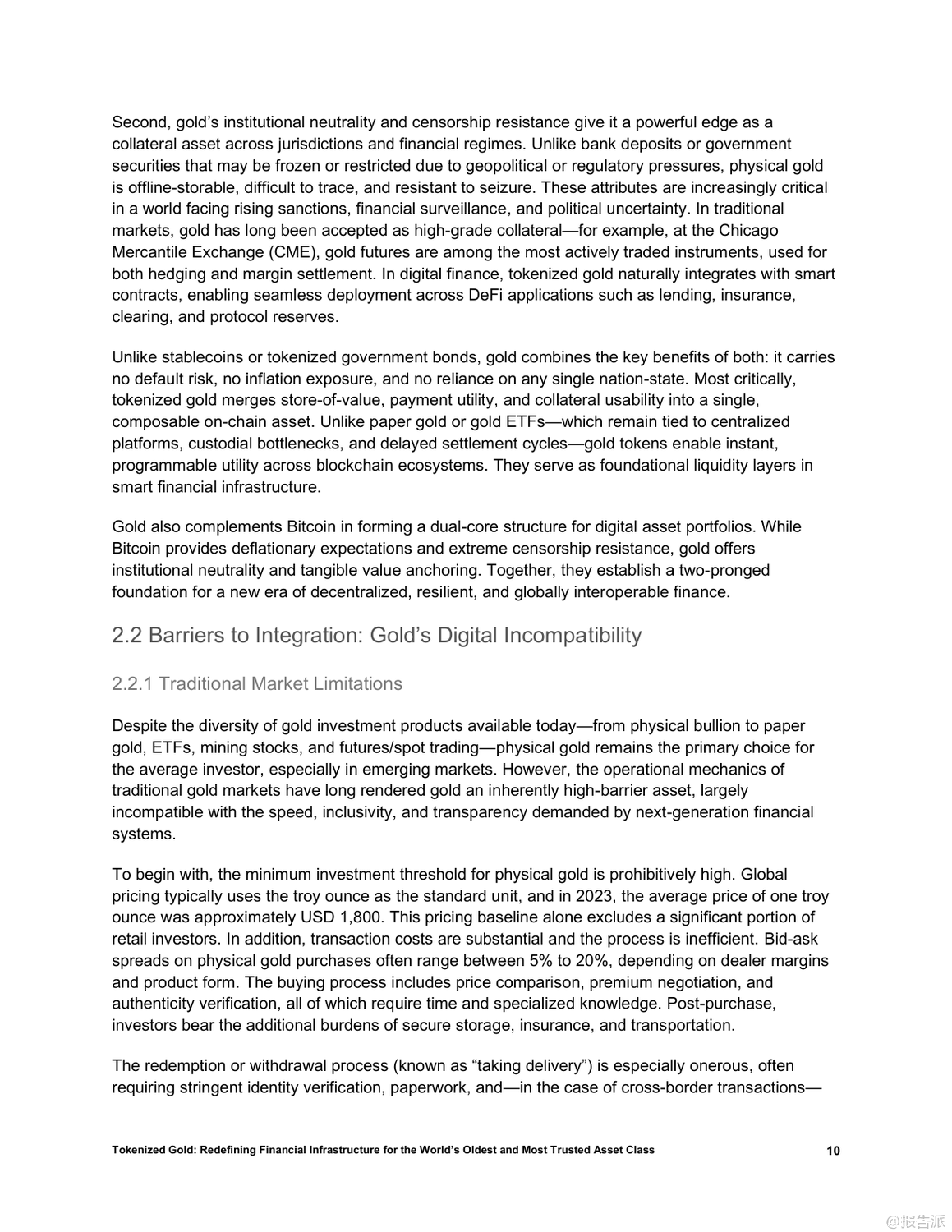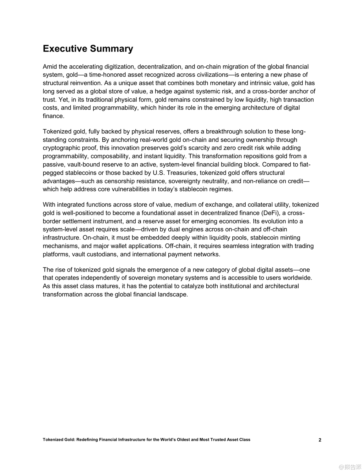 | 在全球金融体系加速数字化、去中心化和链上迁移的大背景下,黄金这一跨越文明的古老资产正迎来结构性重塑的新阶段。 传统物理形态的黄金虽具备储值、抗系统性风险和跨境信任锚定等核心优势,却受限于流动性低、交易成本高及缺乏可编程性等问题,难以融入现代数字金融架构。 而黄金代币的出现,正是破解这些瓶颈的关键创新。 黄金代币通过将实物黄金1:1映射至区块链,实现所有权的加密确权,在保留黄金稀缺性和零信用风险的同时,赋予其即时流动性、可编程性和跨协议组合能力。 相比美元稳定币或美债支持型代币,黄金代币更具结构性优势:它不依赖主权信用、具备审查抗性和国家中立性,能有效弥补当前稳定币体系的脆弱性。 因此,黄金代币有望成为去中心化金融(DeFi)的基础资产、跨境结算工具以及新兴经济体的储备选择。 目前,稳定币和国债代币已验证了现实资产通证化的可行性,而黄金凭借其全球共识、非主权属性和长期价值稳定性,被视为继二者之后的“第三大类”优质RWA(现实世界资产)。 以Matrixdock推出的XAUm为代表的黄金代币产品,已在亚洲市场落地实践。 XAUm每枚由一盎司LBMA认证的纯金背书,存储于新加坡和香港的Brink’s等顶级金库,并通过半年度第三方审计与链上条码查询机制构建“中心化托管+去中心化验证”的可信体系。 黄金代币的价值不仅在于保值,更在于其作为“超级资产”的多功能性。 它可以作为DeFi中的高质量抵押品,支持高达89%的贷款价值比;可用于跨链支付、智能合约执行和自动化策略部署;还能与AI经济深度融合,成为算法代理间可识别、可调用的价值单元。 此外,通过碎片化发行,用户可低至10美元起购,极大提升了普通民众尤其是新兴市场用户的金融包容性。 然而,黄金代币的发展仍面临多重挑战:包括托管集中化带来的机构风险、各国监管分类不明导致的合规不确定性、早期市场深度不足引发的价格操纵可能,以及技术层面的智能合约与跨链安全风险。 要真正成为全球金融基础设施的核心组件,黄金代币必须实现规模化流通,深化流动性池建设,并推动区域试点向全球统一标准演进。 总体而言,黄金代币不仅是传统资产的数字化升级,更是构建下一代开放、高效、包容金融体系的战略支点。 随着技术成熟、监管明晰和生态扩展,它有望重构全球价值网络,成为连接现实财富与链上经济的关键桥梁。 出品方:Matrixdock 发布时间:2025年 文档页数:32页
