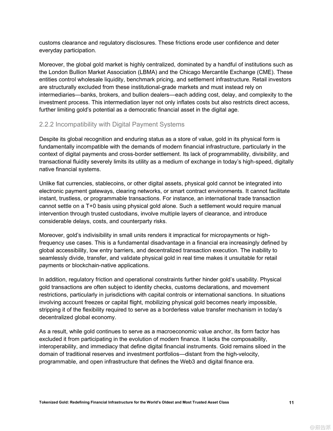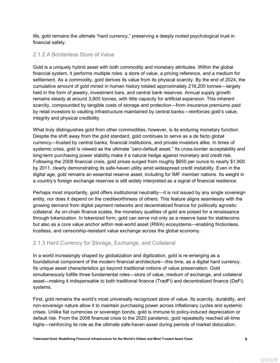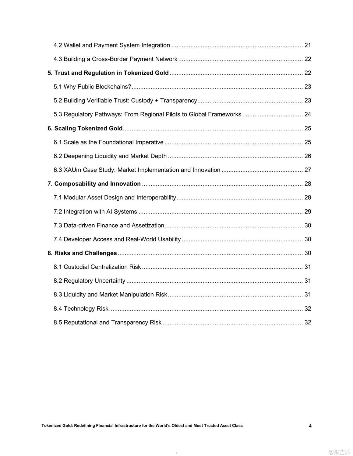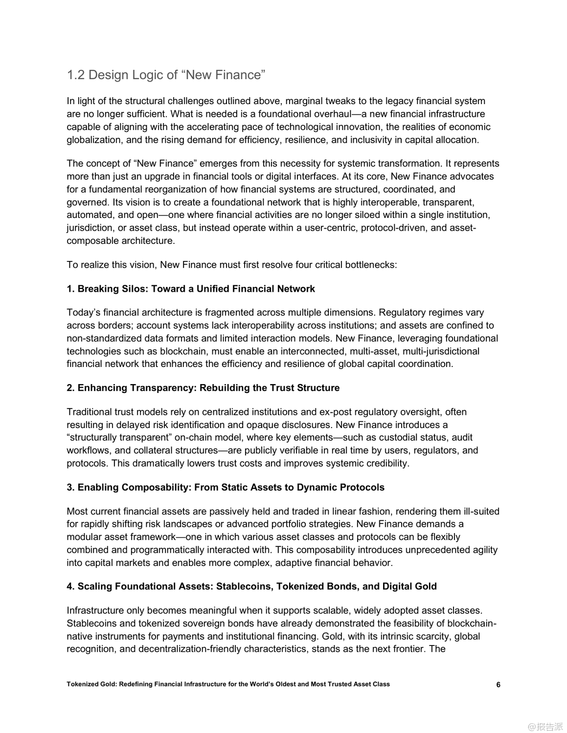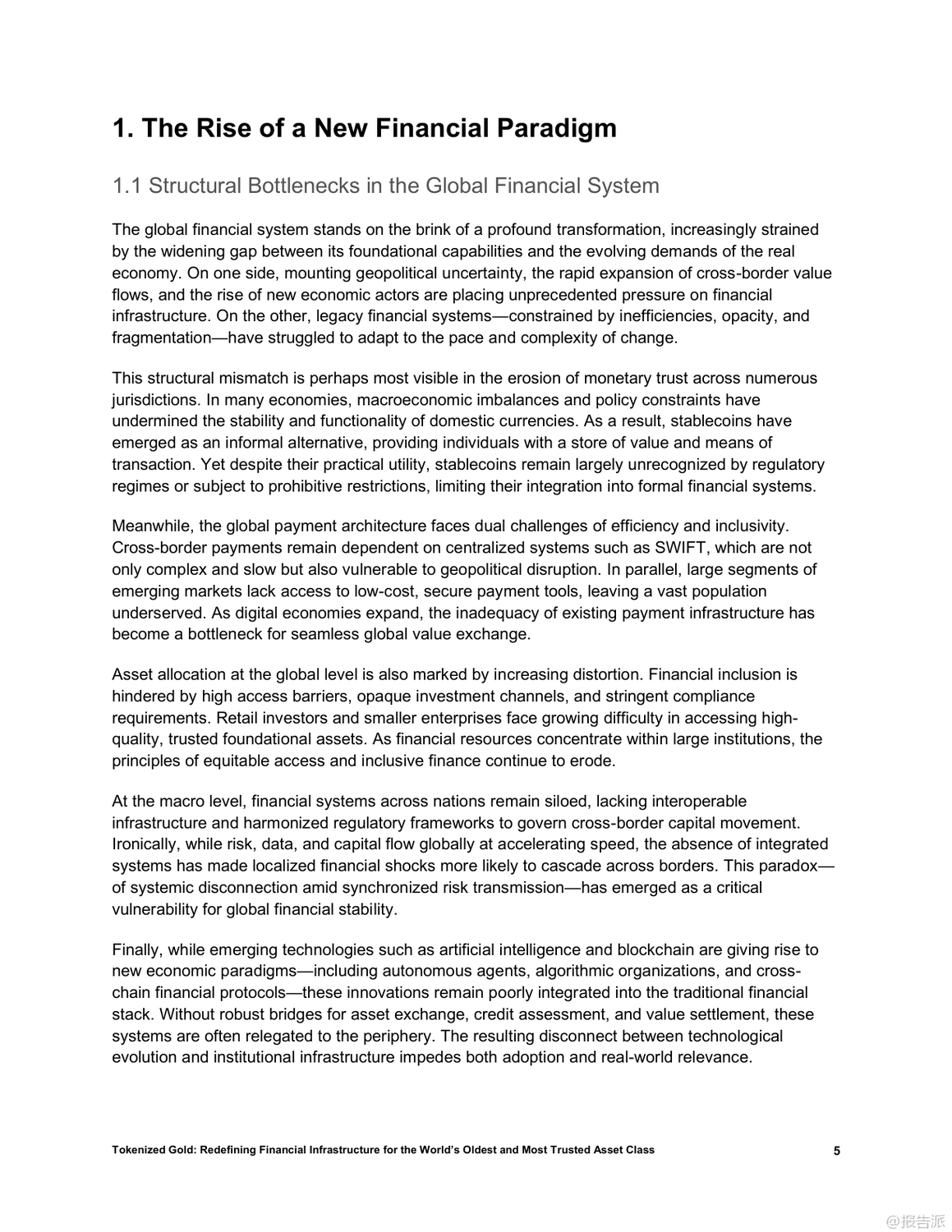 | 在全球金融体系加速数字化、去中心化和链上迁移的大背景下,黄金这一跨越文明的古老资产正迎来结构性重塑的新阶段。 传统物理形态的黄金虽具备储值、抗系统性风险和跨境信任锚定等核心优势,却受限于流动性低、交易成本高及缺乏可编程性等问题,难以融入现代数字金融架构。 而黄金代币的出现,正是破解这些瓶颈的关键创新。 黄金代币通过将实物黄金1:1映射至区块链,实现所有权的加密确权,在保留黄金稀缺性和零信用风险的同时,赋予其即时流动性、可编程性和跨协议组合能力。 相比美元稳定币或美债支持型代币,黄金代币更具结构性优势:它不依赖主权信用、具备审查抗性和国家中立性,能有效弥补当前稳定币体系的脆弱性。 因此,黄金代币有望成为去中心化金融(DeFi)的基础资产、跨境结算工具以及新兴经济体的储备选择。 目前,稳定币和国债代币已验证了现实资产通证化的可行性,而黄金凭借其全球共识、非主权属性和长期价值稳定性,被视为继二者之后的“第三大类”优质RWA(现实世界资产)。 以Matrixdock推出的XAUm为代表的黄金代币产品,已在亚洲市场落地实践。 XAUm每枚由一盎司LBMA认证的纯金背书,存储于新加坡和香港的Brink’s等顶级金库,并通过半年度第三方审计与链上条码查询机制构建“中心化托管+去中心化验证”的可信体系。 黄金代币的价值不仅在于保值,更在于其作为“超级资产”的多功能性。 它可以作为DeFi中的高质量抵押品,支持高达89%的贷款价值比;可用于跨链支付、智能合约执行和自动化策略部署;还能与AI经济深度融合,成为算法代理间可识别、可调用的价值单元。 此外,通过碎片化发行,用户可低至10美元起购,极大提升了普通民众尤其是新兴市场用户的金融包容性。 然而,黄金代币的发展仍面临多重挑战:包括托管集中化带来的机构风险、各国监管分类不明导致的合规不确定性、早期市场深度不足引发的价格操纵可能,以及技术层面的智能合约与跨链安全风险。 要真正成为全球金融基础设施的核心组件,黄金代币必须实现规模化流通,深化流动性池建设,并推动区域试点向全球统一标准演进。 总体而言,黄金代币不仅是传统资产的数字化升级,更是构建下一代开放、高效、包容金融体系的战略支点。 随着技术成熟、监管明晰和生态扩展,它有望重构全球价值网络,成为连接现实财富与链上经济的关键桥梁。 出品方:Matrixdock 发布时间:2025年 文档页数:32页